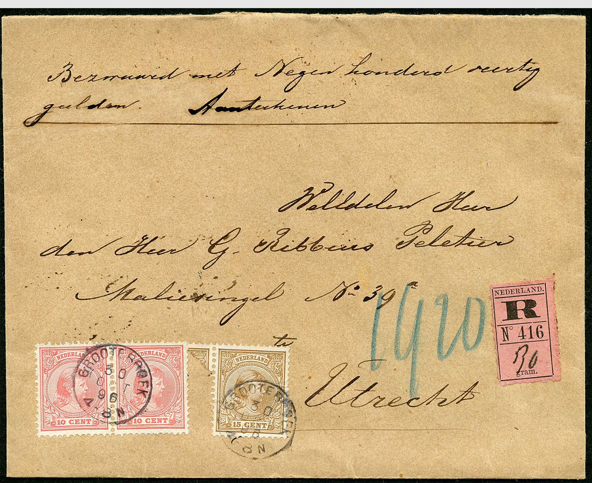 Kleinrond GROOTEBROEK op 2x 10 en 15 cent Hangend Haar op env. van 30 gram op 30-10-1896 aangetekend met aangegeven waarde van 940 gulden naar Utrecht 31-10-1896. Prachtige brief met op az. twee mooie lakzegels