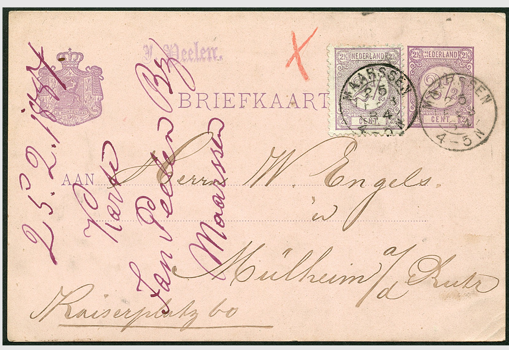 Kleinrond MAARSSEN met dubbele S op met 2½ cent bijgefr. bk. op 25-2-1884 naar Mülheim (D)