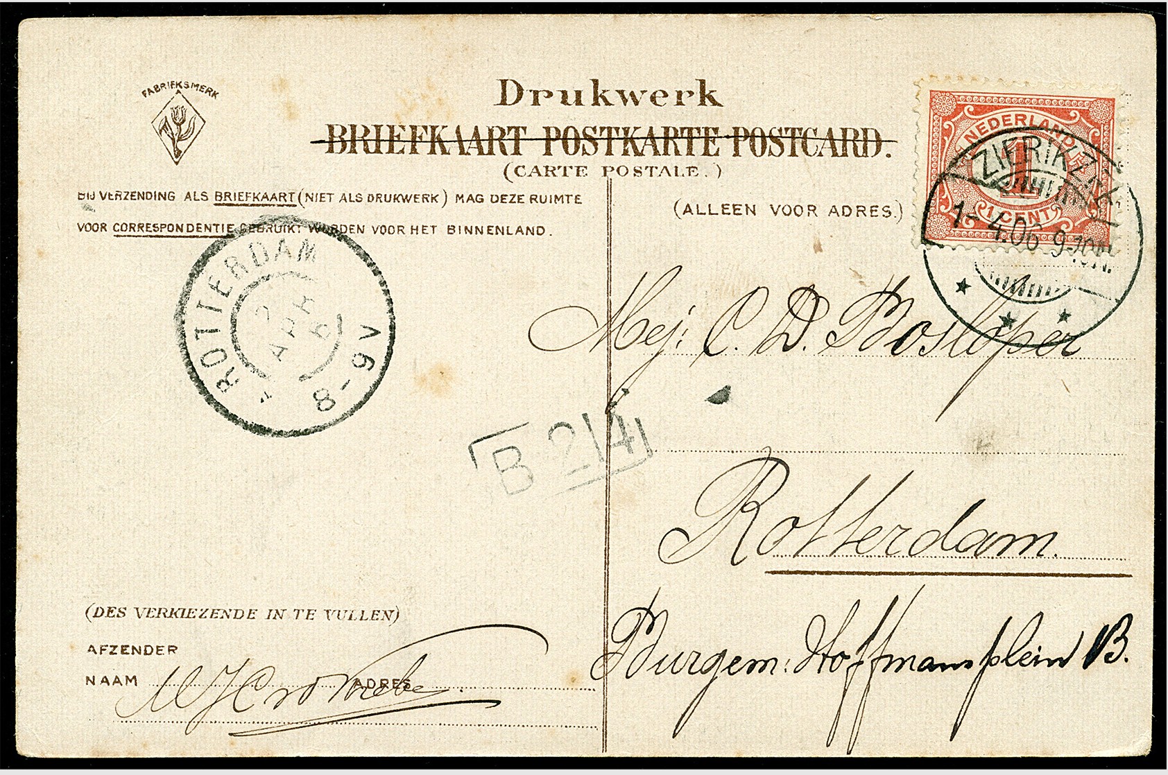 Martin-proefstempel ZIERIKZEE op 1 cent Vürtheim op prentbk. van 1-4-1906 naar Rotterdam 2-4-1906. Uiterst zeldzaam stempel, en zeker op poststuk, dat van 13-3 t/m 1-4-1906 is gebruikt. Op deze kaart de laatste dag van gebruik. Zie: Vos e.a. (Phil. club Rotterdam 100 jaar, IV, p. 134, 197)