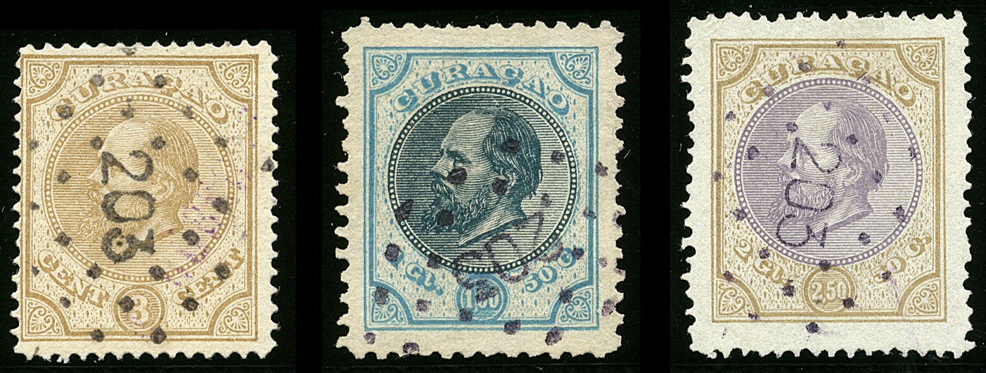 Puntstempel 203 = Curaçao op 3 cent lichtbruin nr.2B, 1½ gulden nr.11F en 2½ gulden nr.12B, prachtex.
