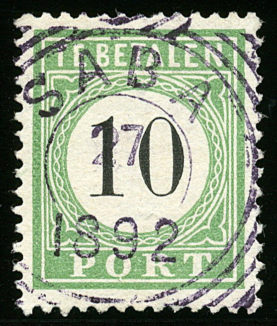 Vierkantstempel Saba 27/-/1892 op Port 10 cent nr.P3 type I, prachtex. met stempelvariëteit: zonder maandaanduiding