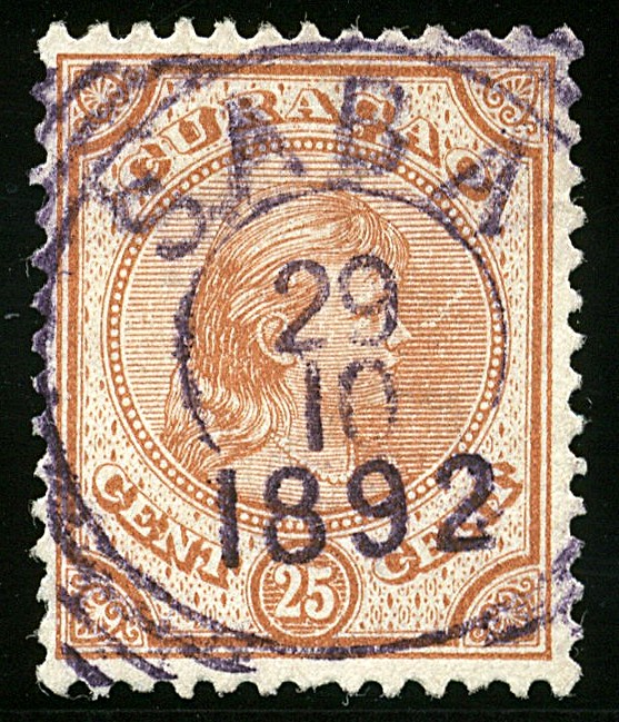 Vierkantstempel Saba 29/10/1892 in violet op 25 cent nr.22, prachtex.