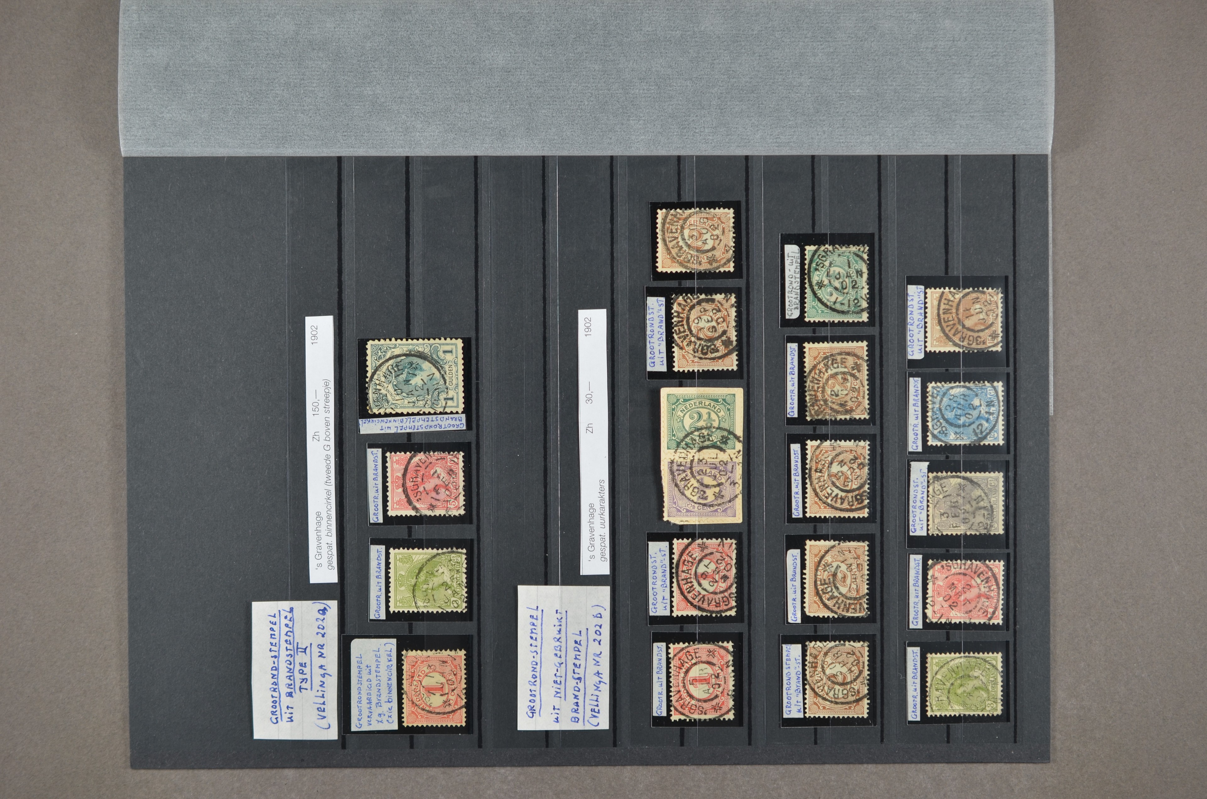 BRANDSTEMPELS ´sGravenhage type I en II (samen 14 zegels), grootrond uit brandstempel type I (V.201a, 3x) en II (V.202a, 4x) en uit niet gebruikt brandstempel (V.202b, 15x)