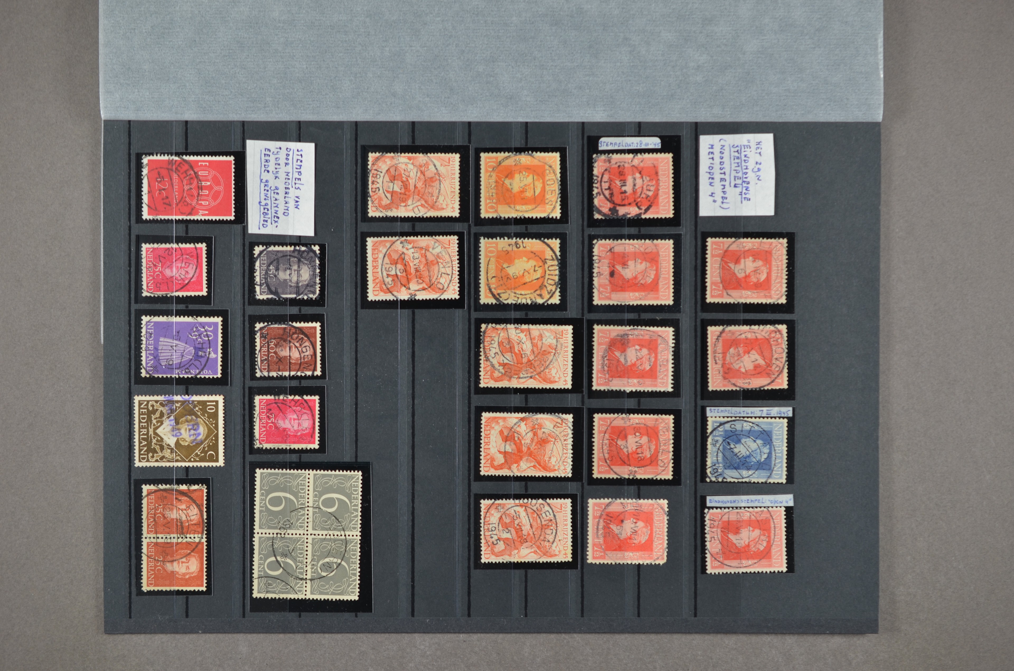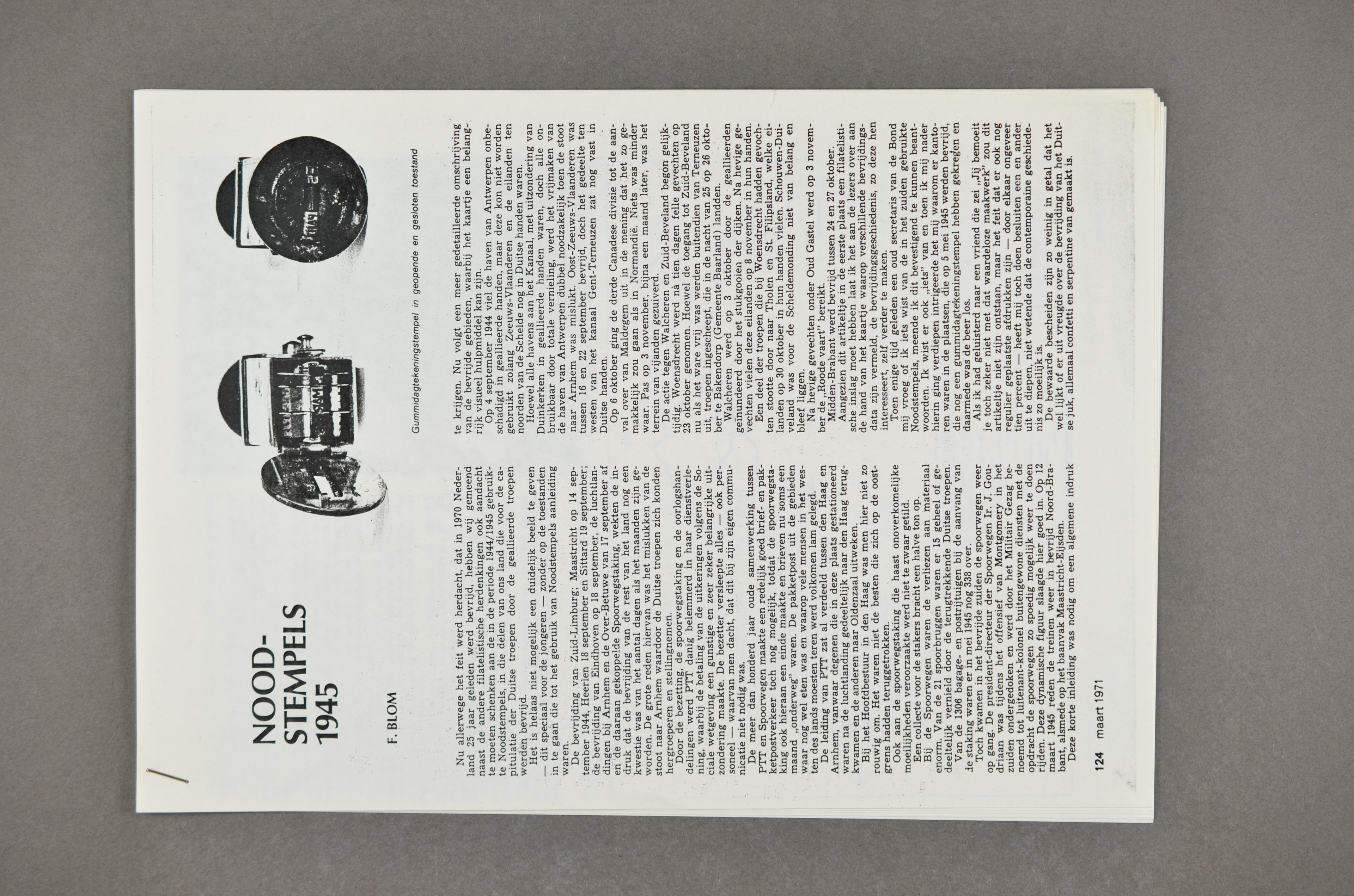 NOODSTEMPELS 1945, verzameling afstempelingen van gummidagtekeningstempels van de verschillende plaatsen op losse zegels los/op knipsel, metalen stempels met open 4 van 1945 en stempels van de Selfkant