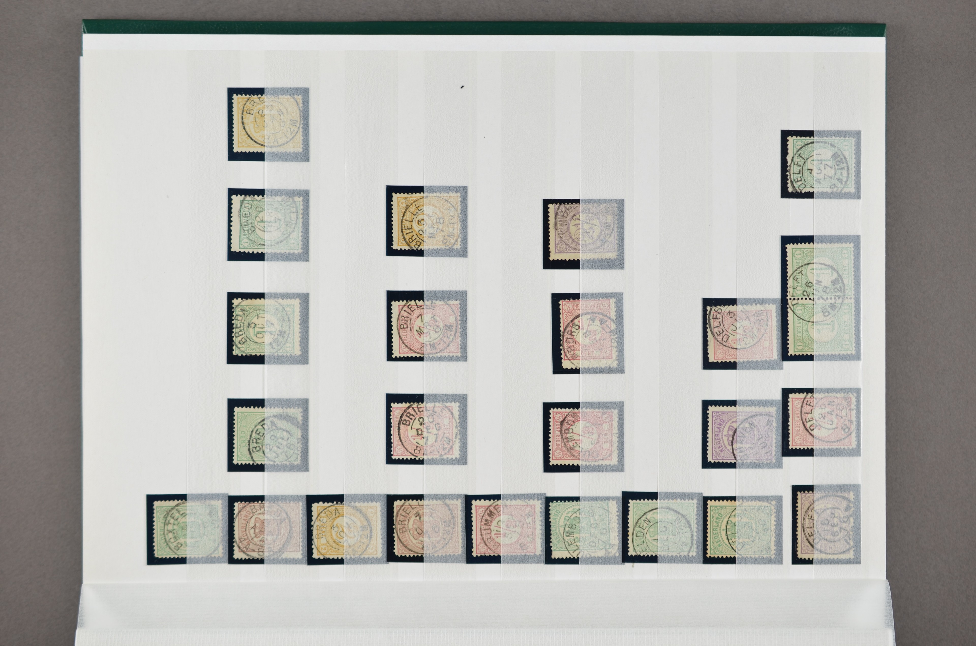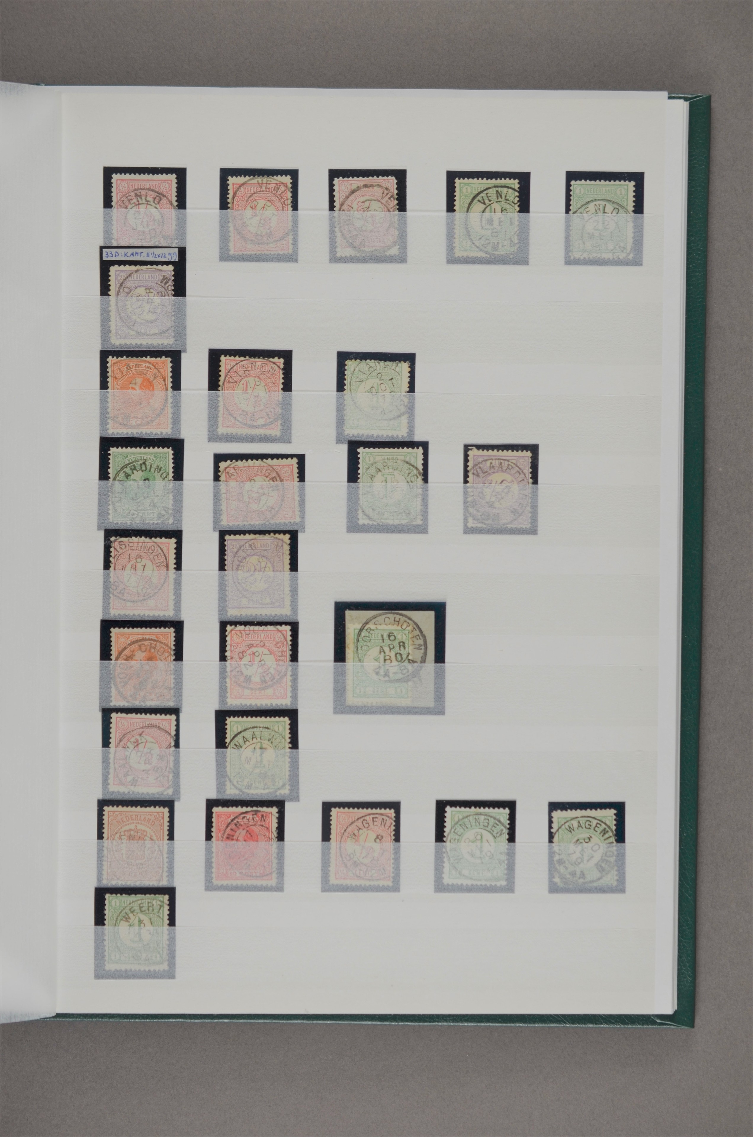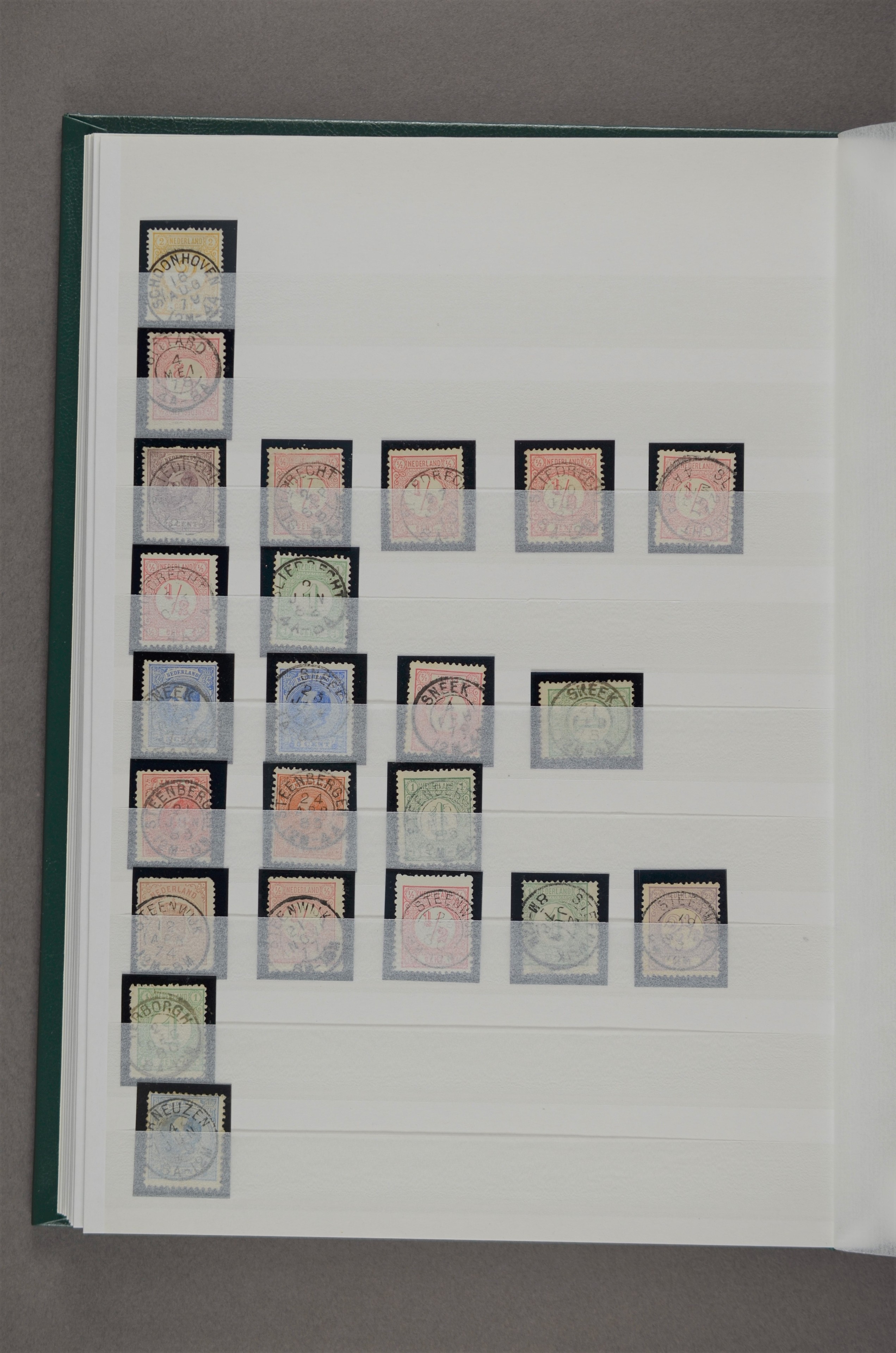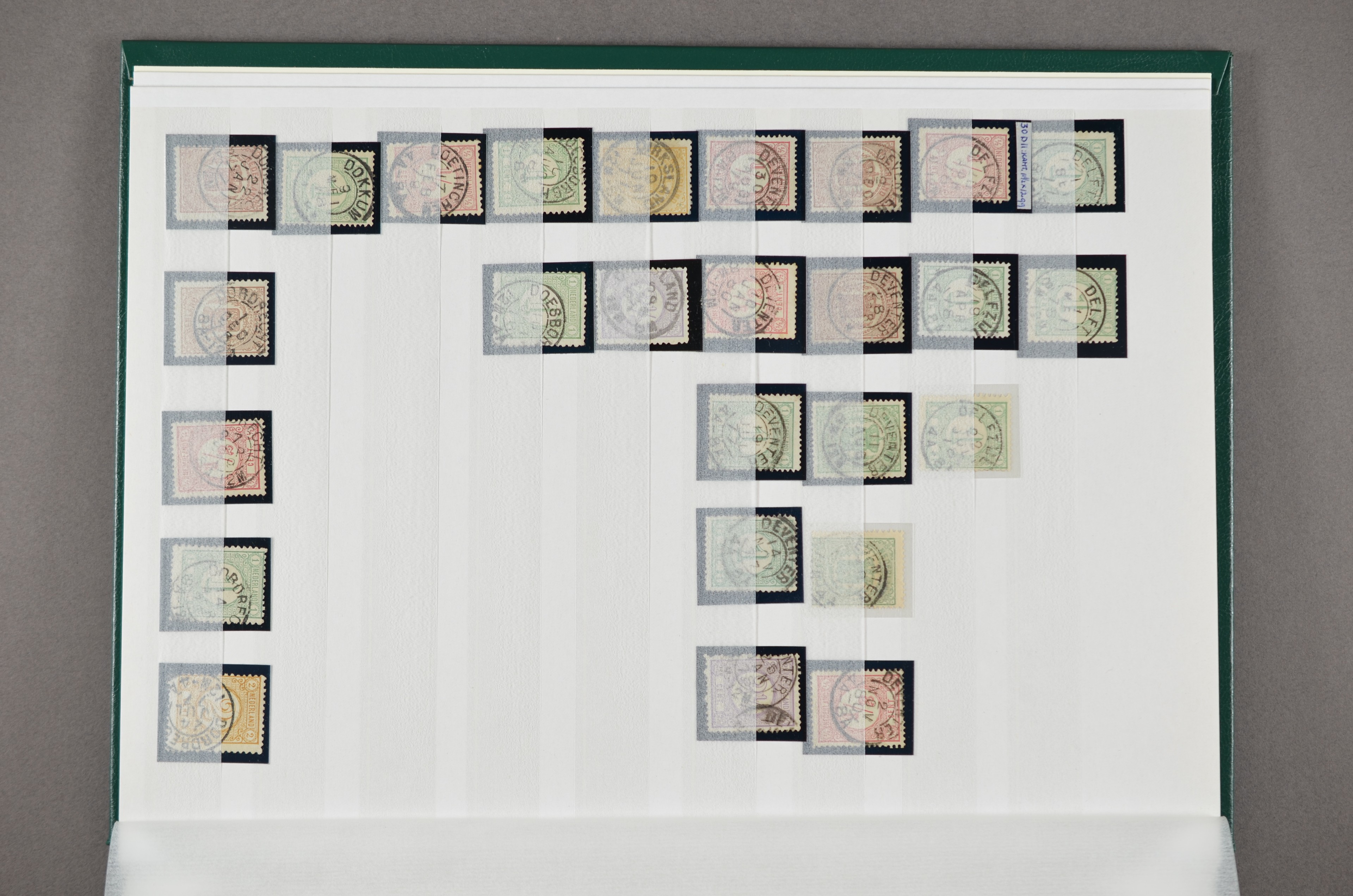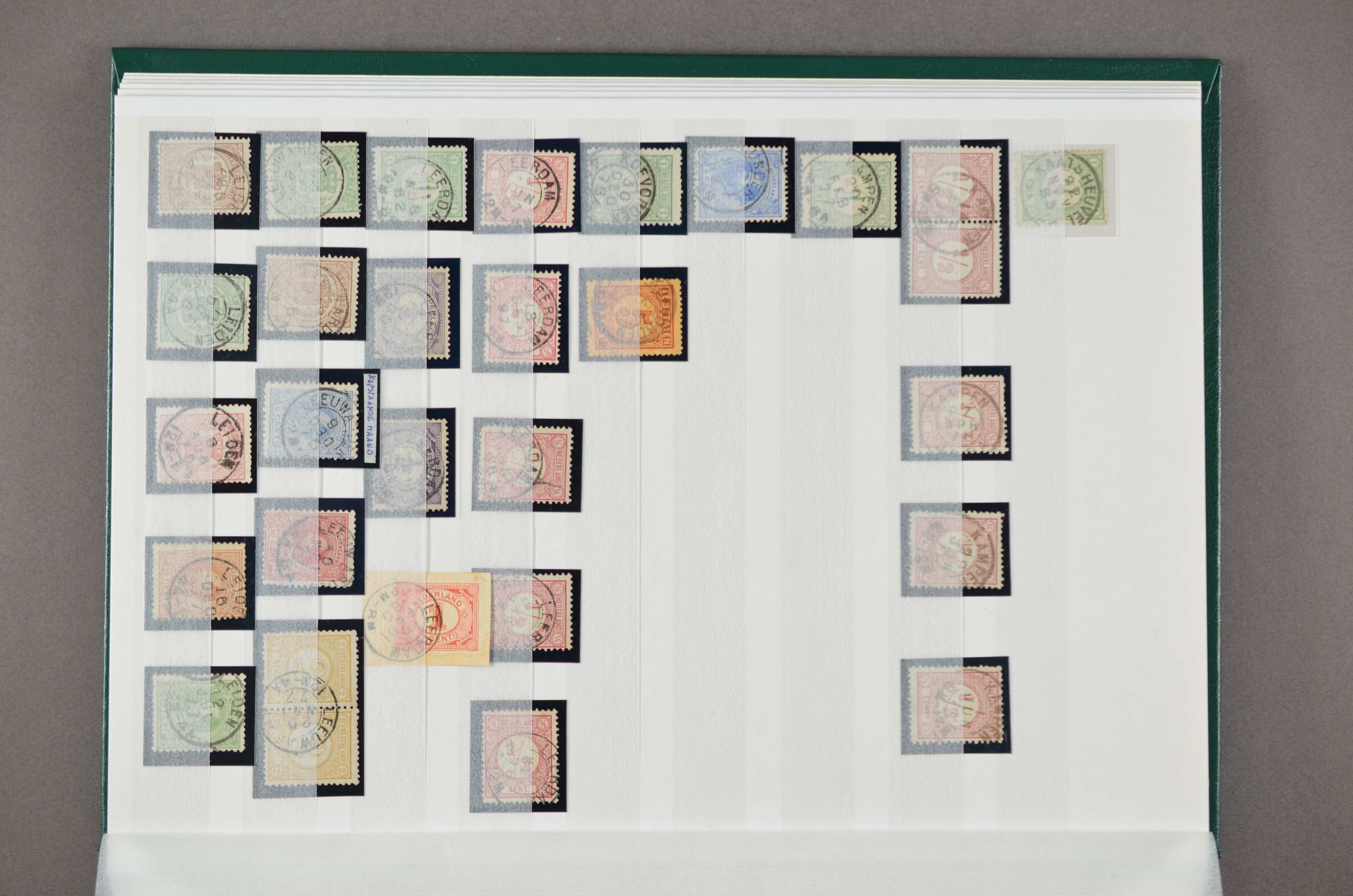 TWEELETTERSTEMPELS, verzameling op losse zegels, enkele zegels op knipsels, wat paren en strippen van diverse emissies en waarden, alfabetisch geordend in insteekboek, en vrijwel uitsluitend volledige afstempelingen. Prachtobject om op te zetten en te vervolmaken