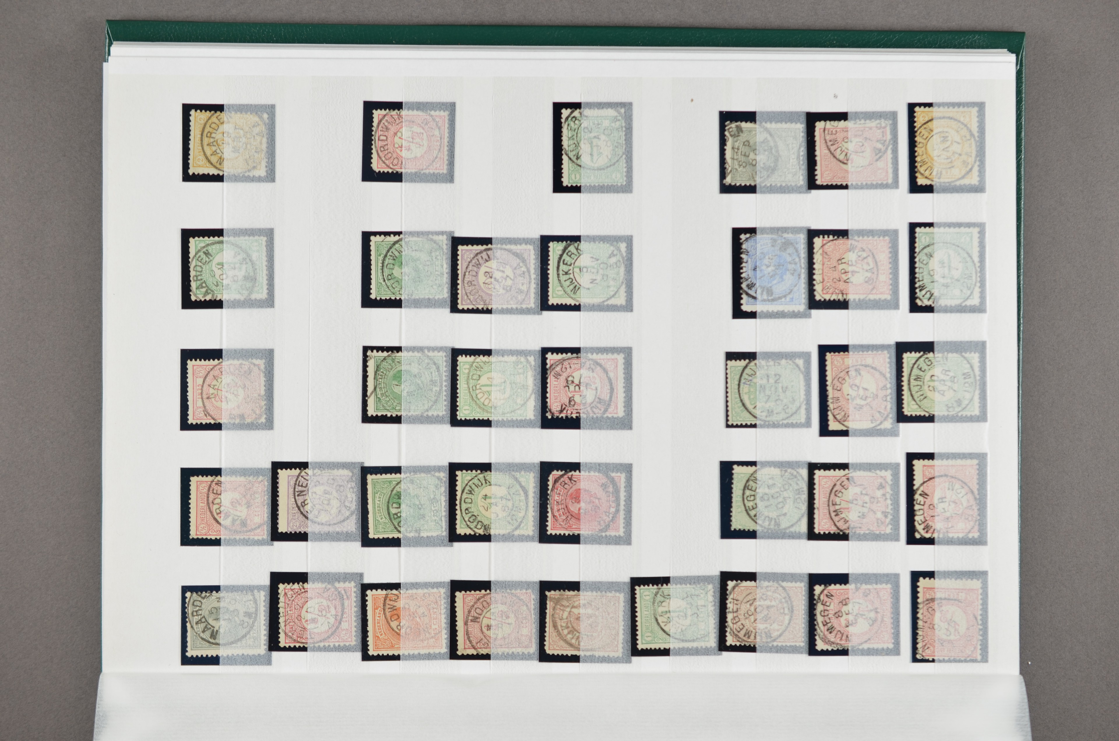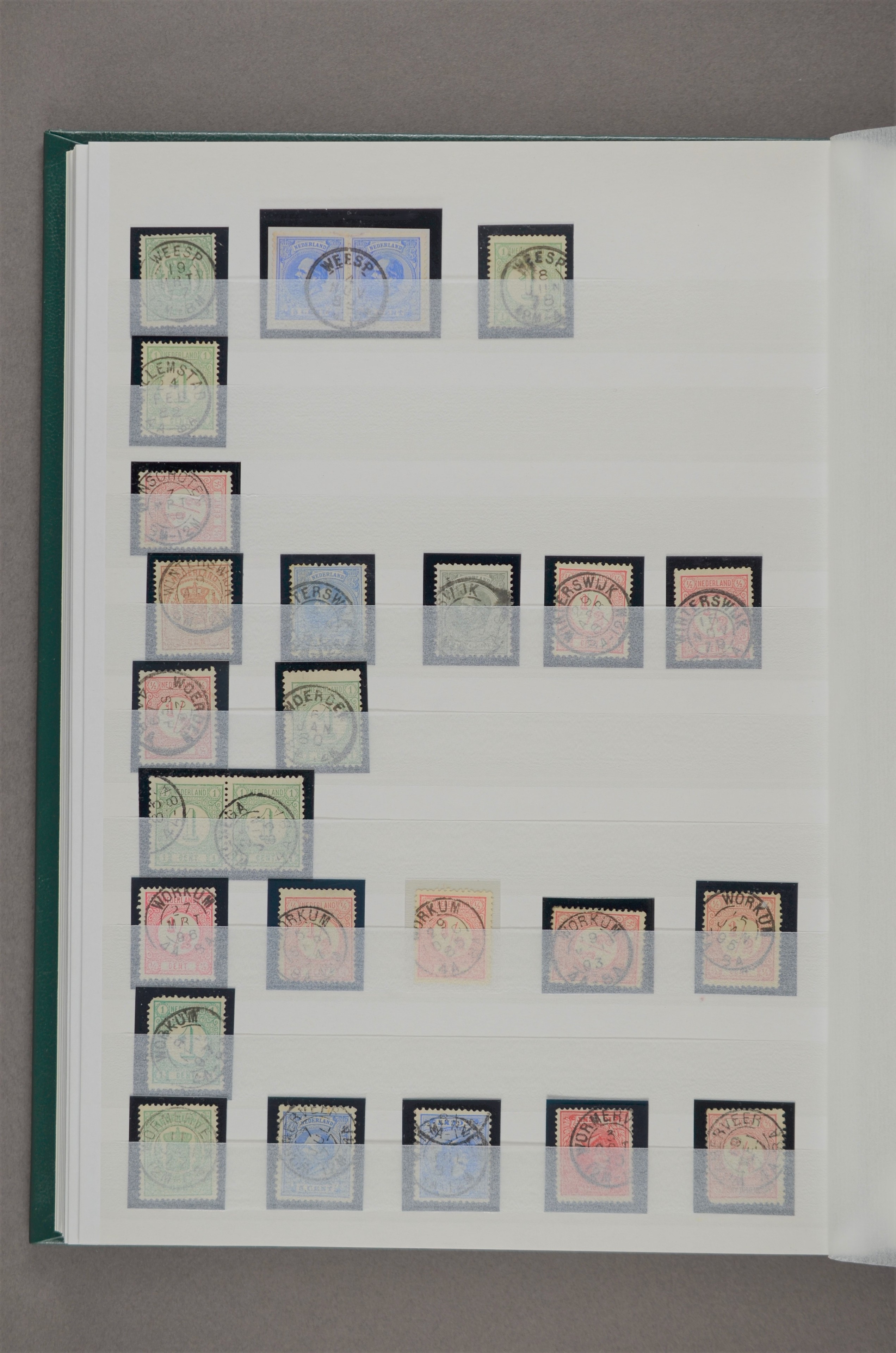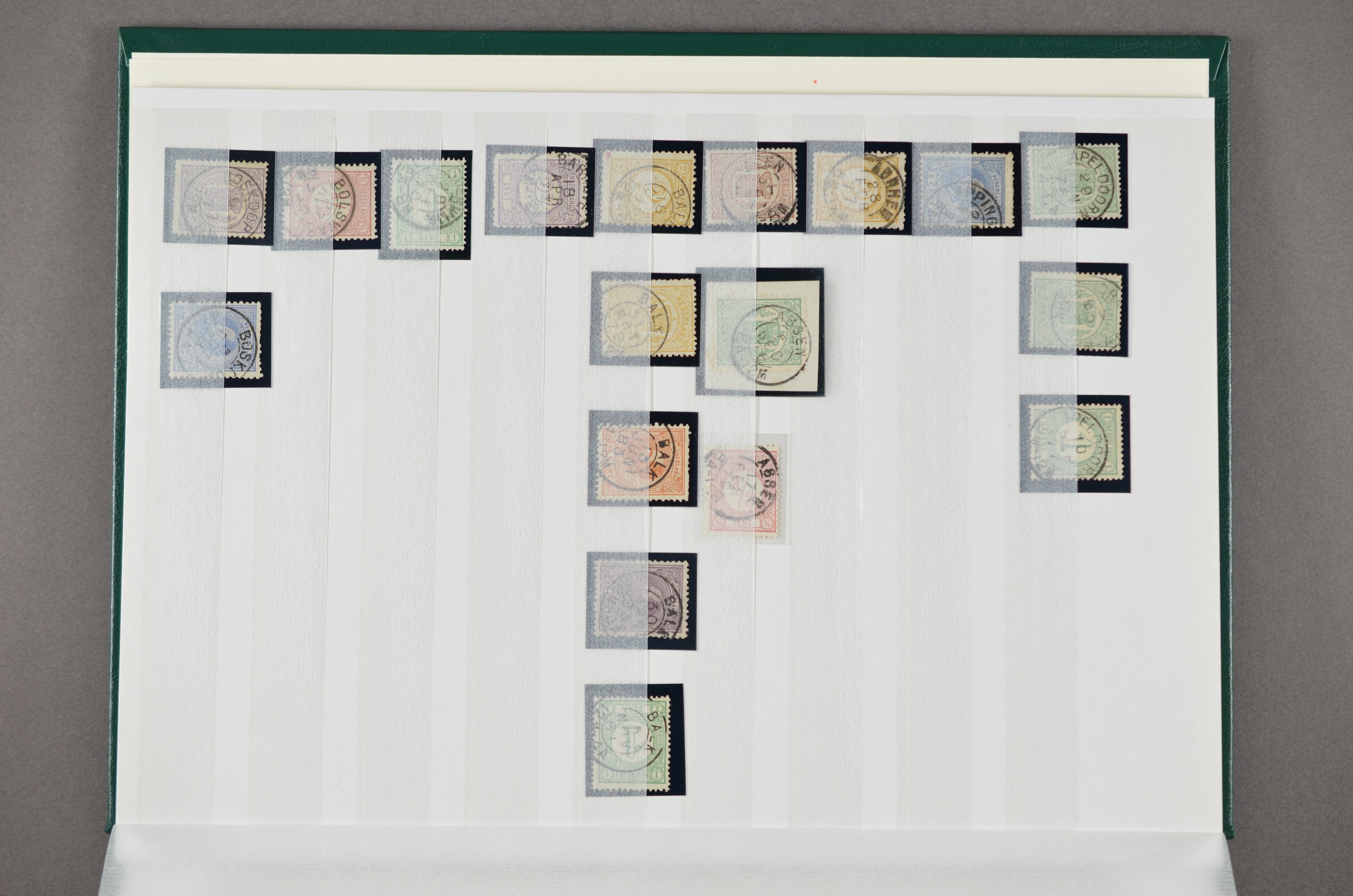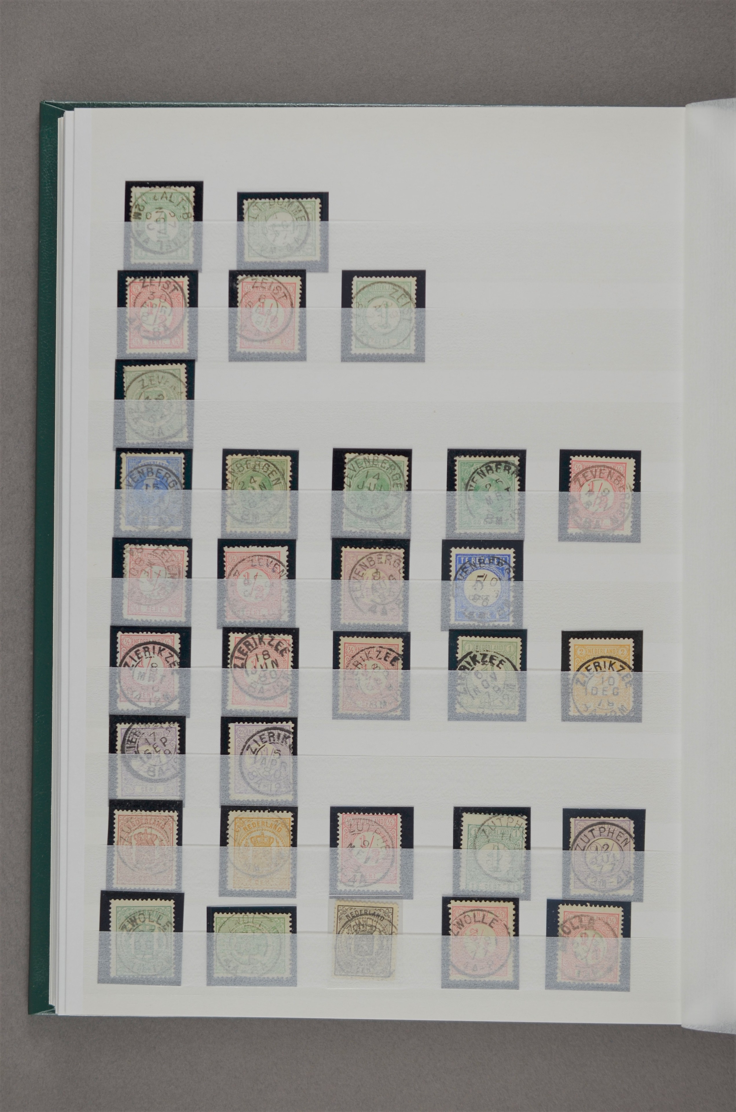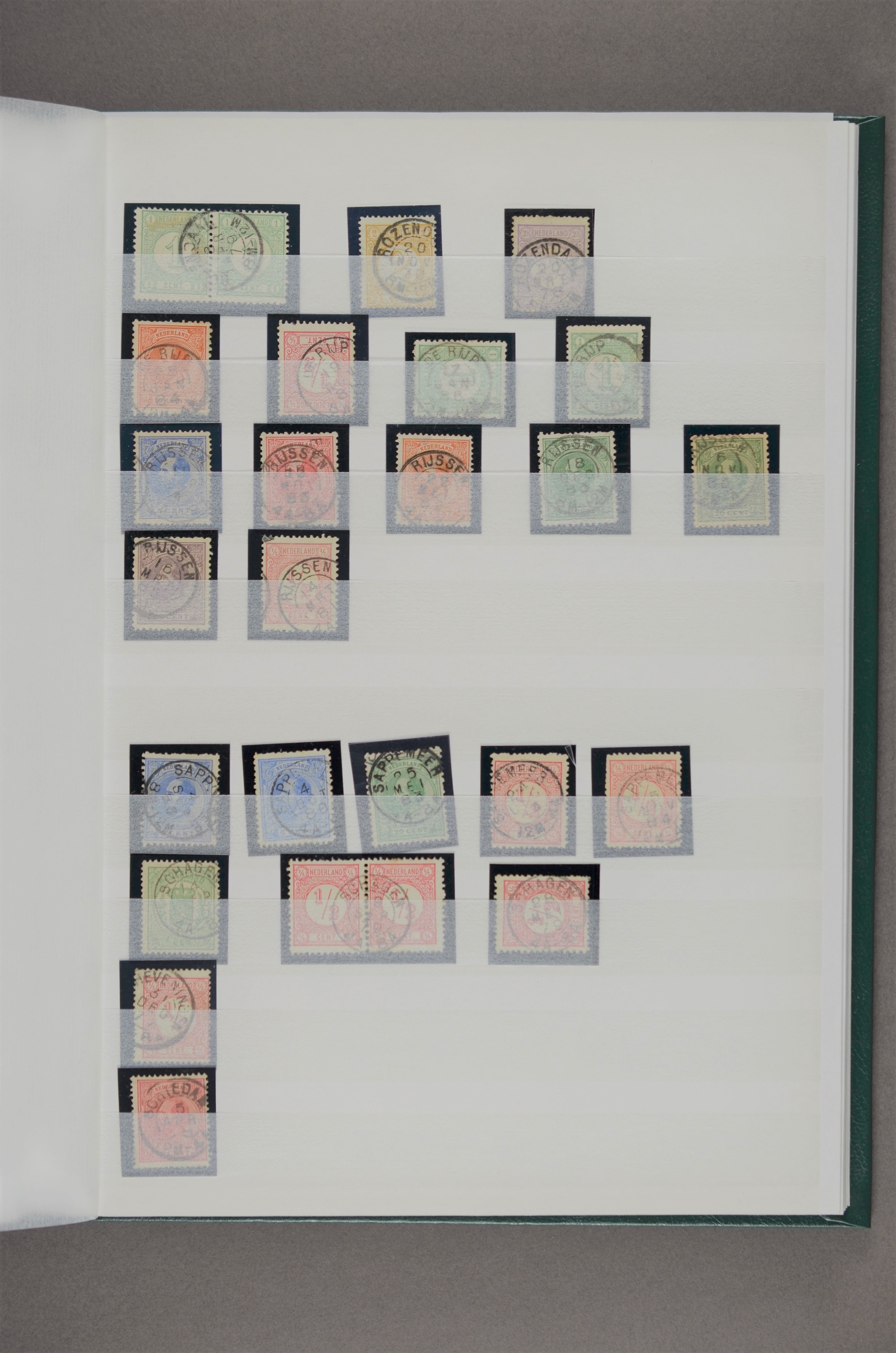 TWEELETTERSTEMPELS, verzameling op losse zegels, enkele zegels op knipsels, wat paren en strippen van diverse emissies en waarden, alfabetisch geordend in insteekboek, en vrijwel uitsluitend volledige afstempelingen. Prachtobject om op te zetten en te vervolmaken