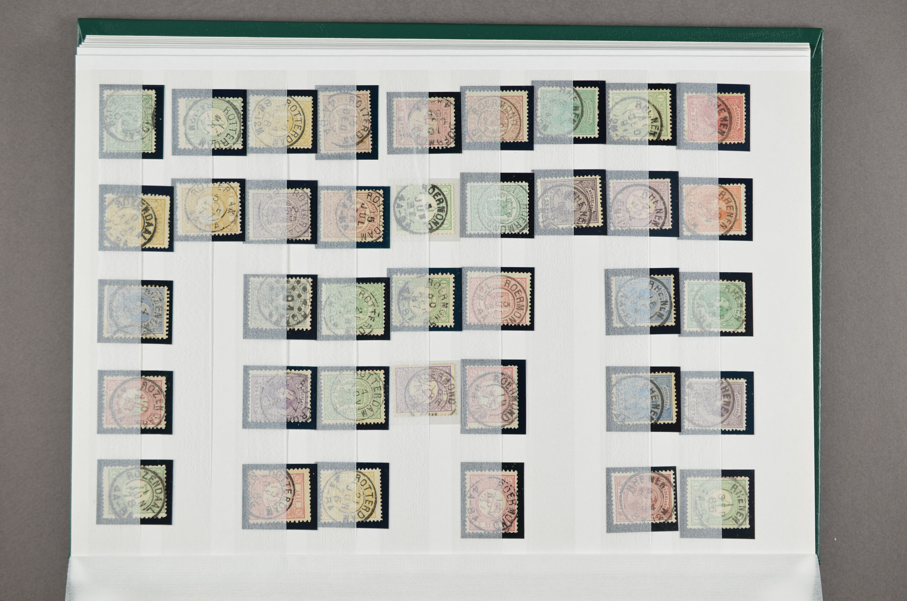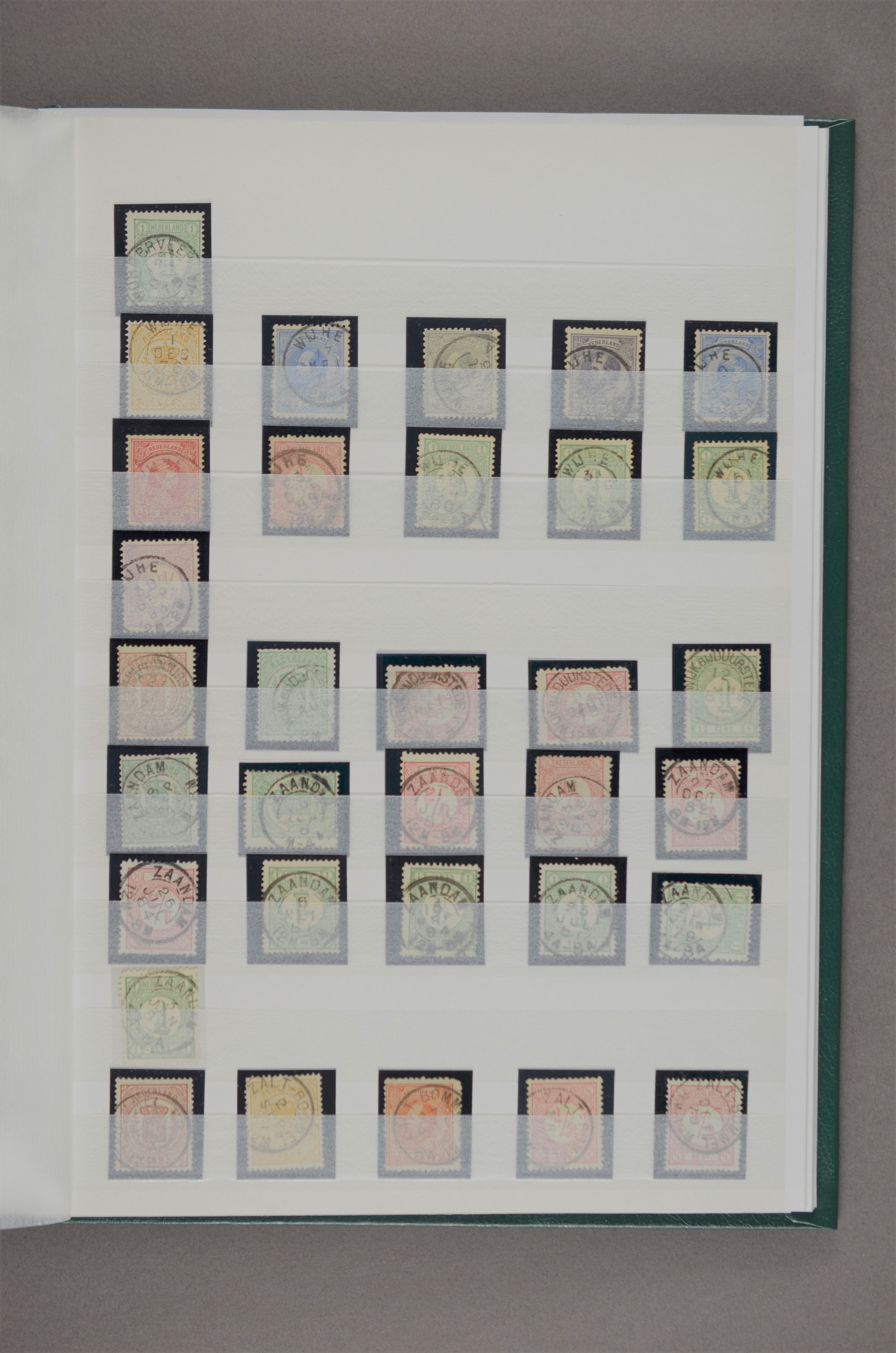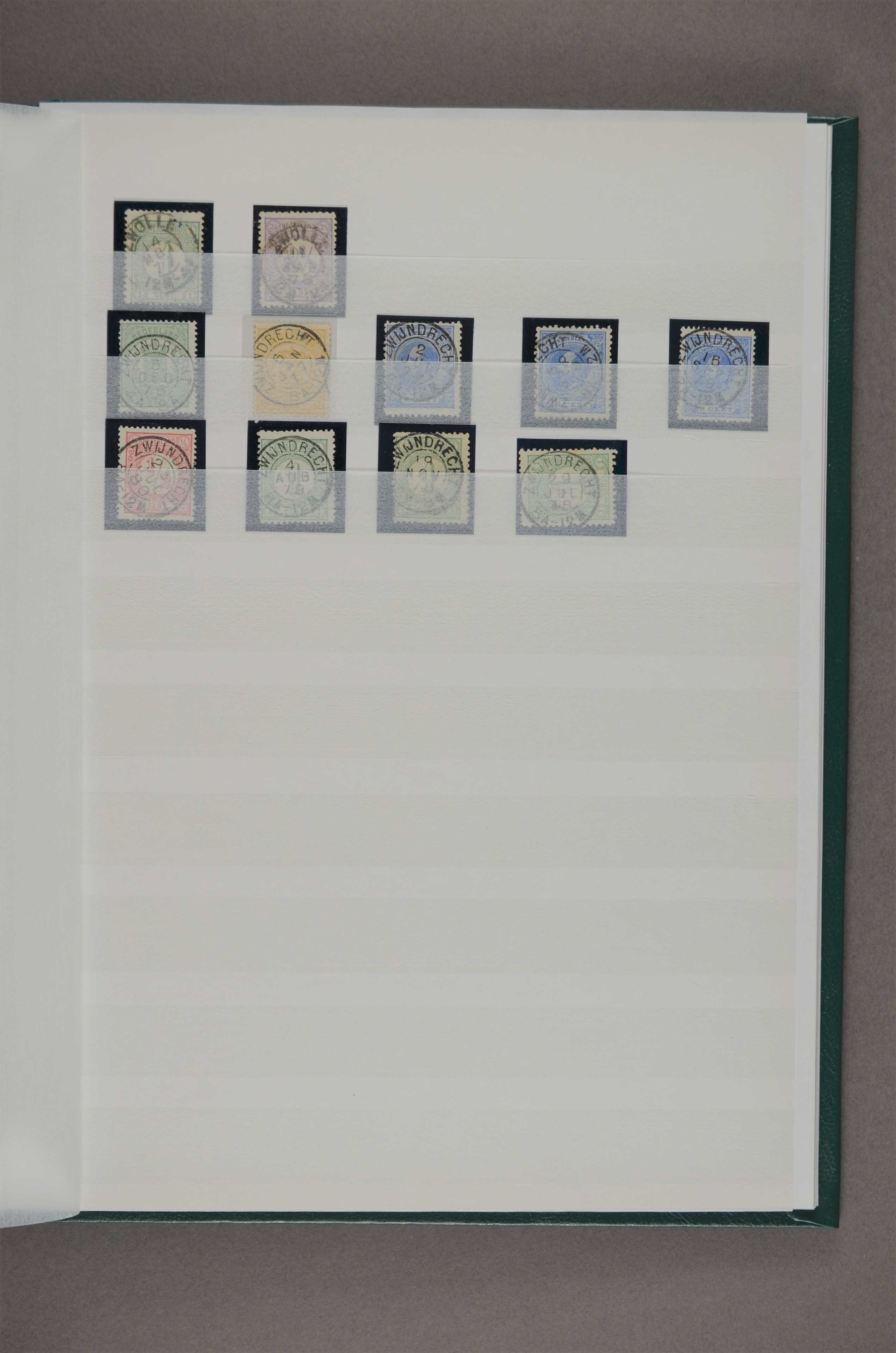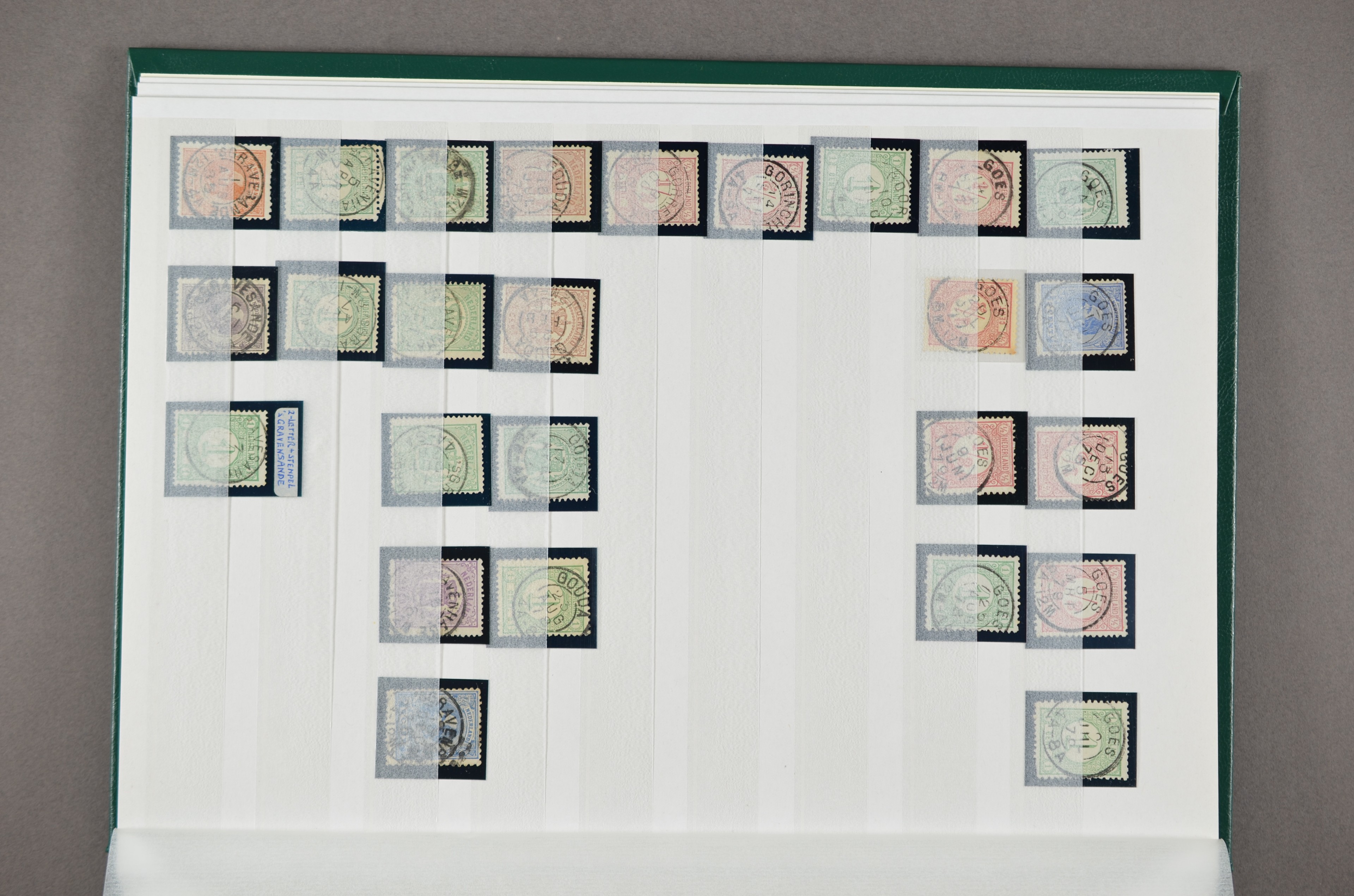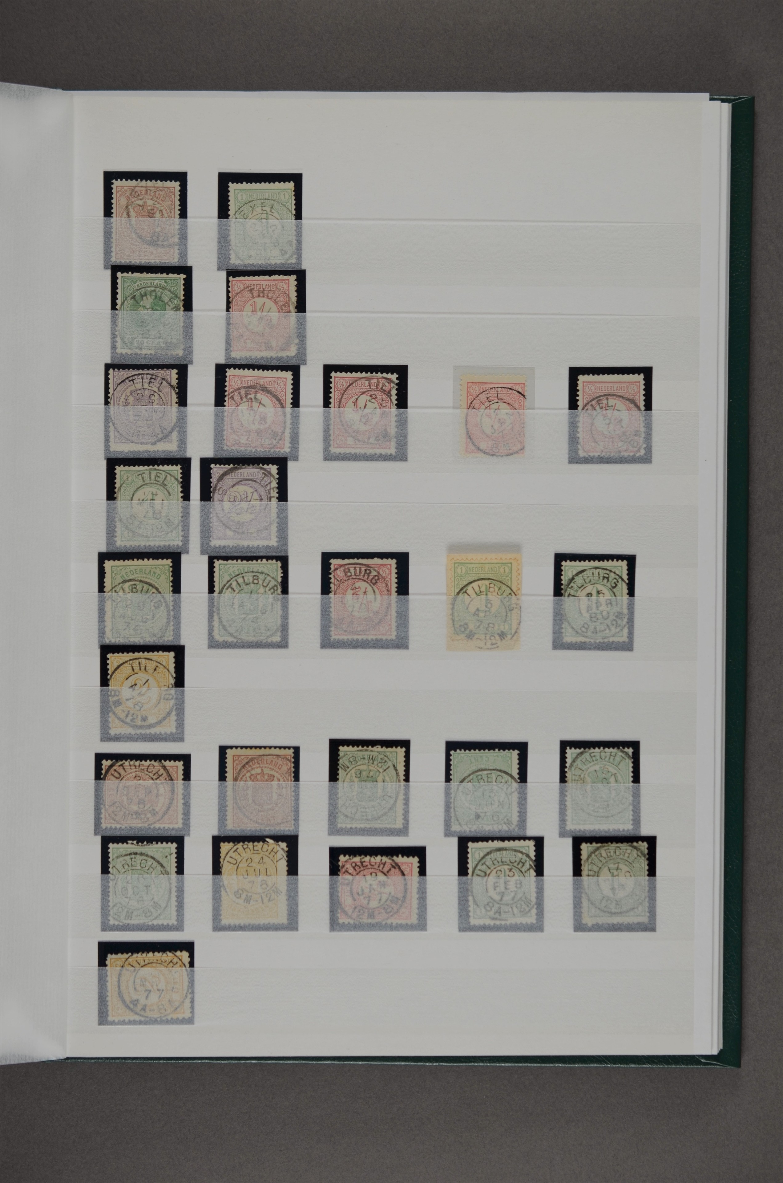 TWEELETTERSTEMPELS, verzameling op losse zegels, enkele zegels op knipsels, wat paren en strippen van diverse emissies en waarden, alfabetisch geordend in insteekboek, en vrijwel uitsluitend volledige afstempelingen. Prachtobject om op te zetten en te vervolmaken
