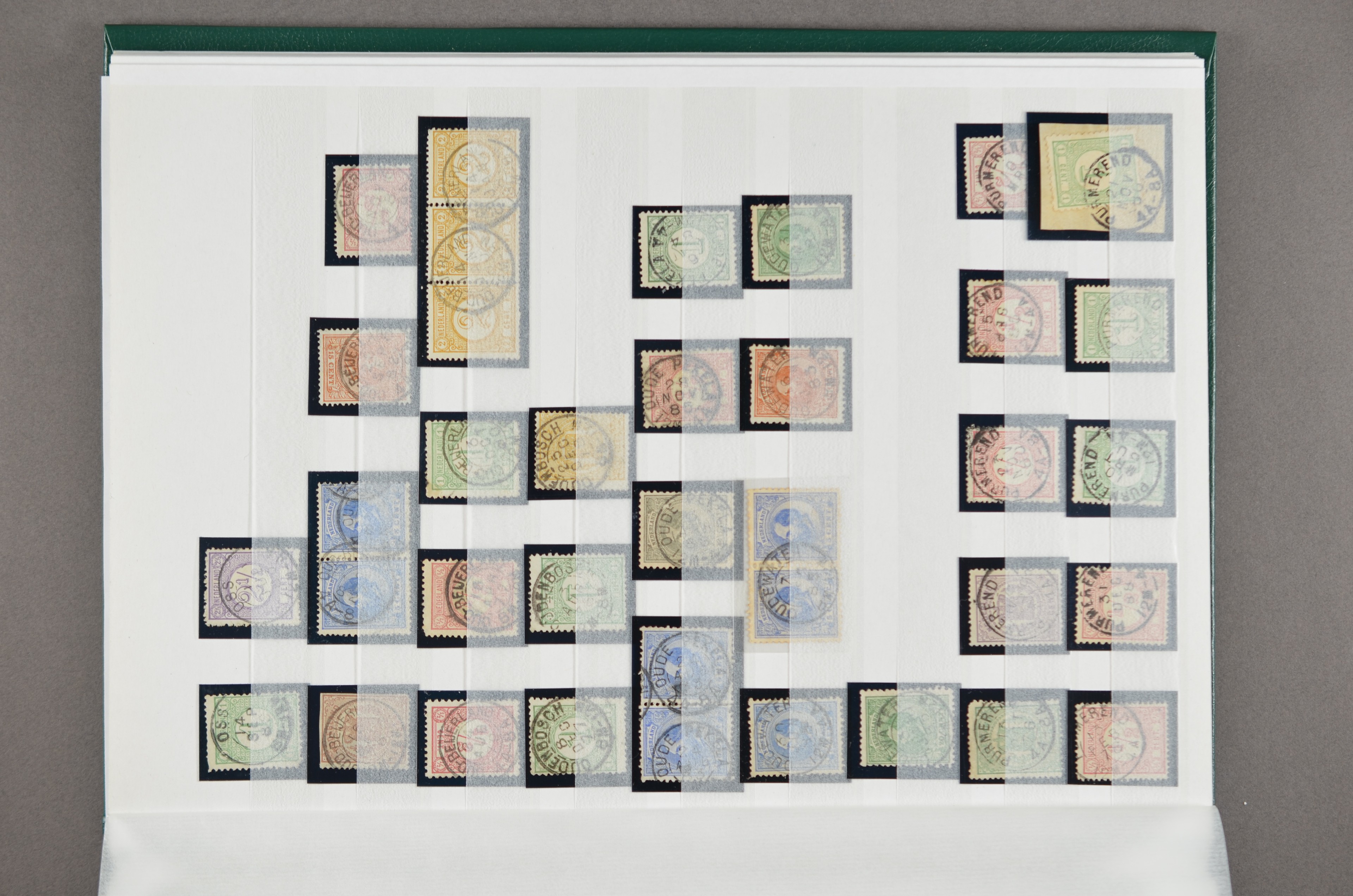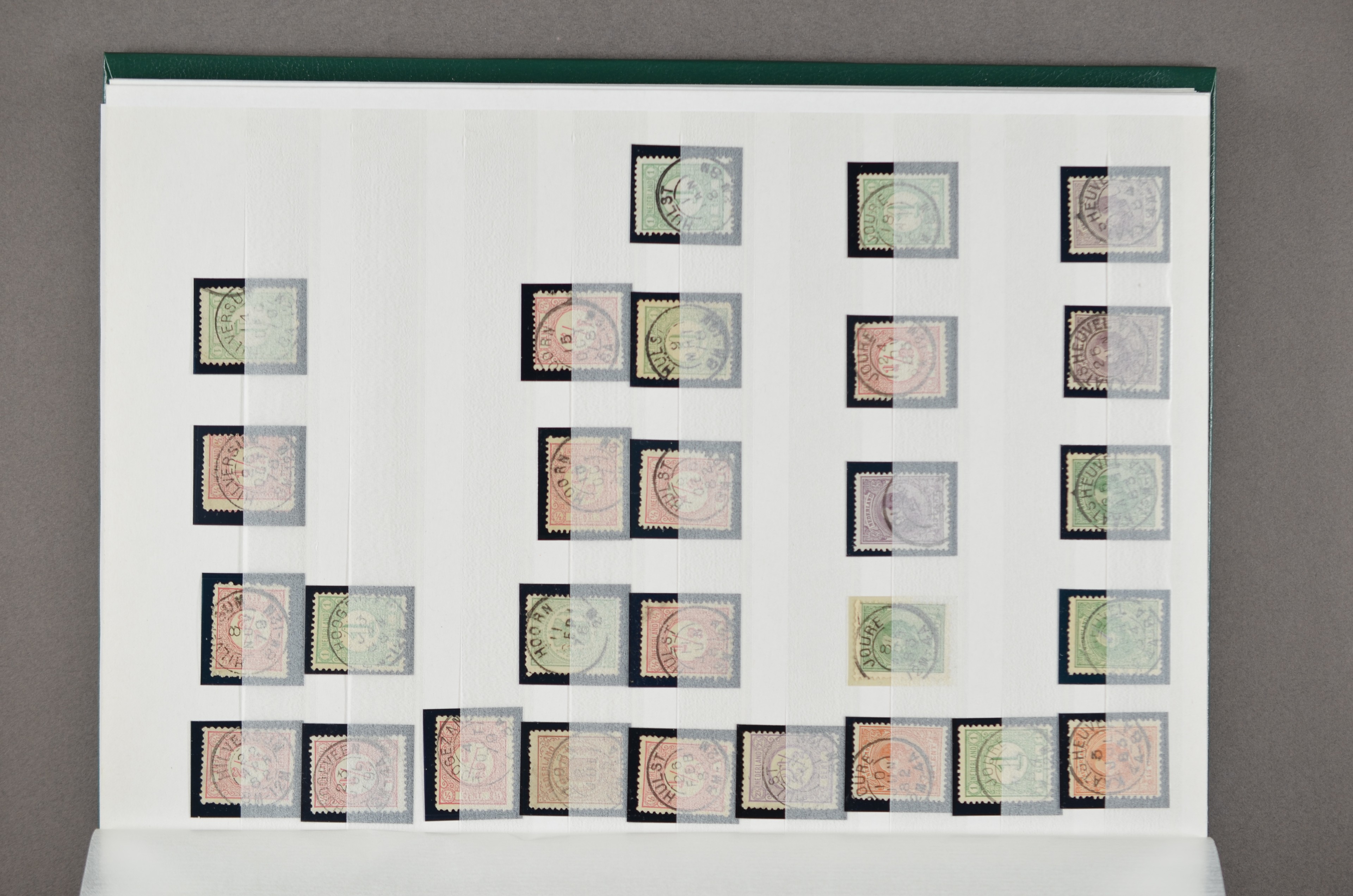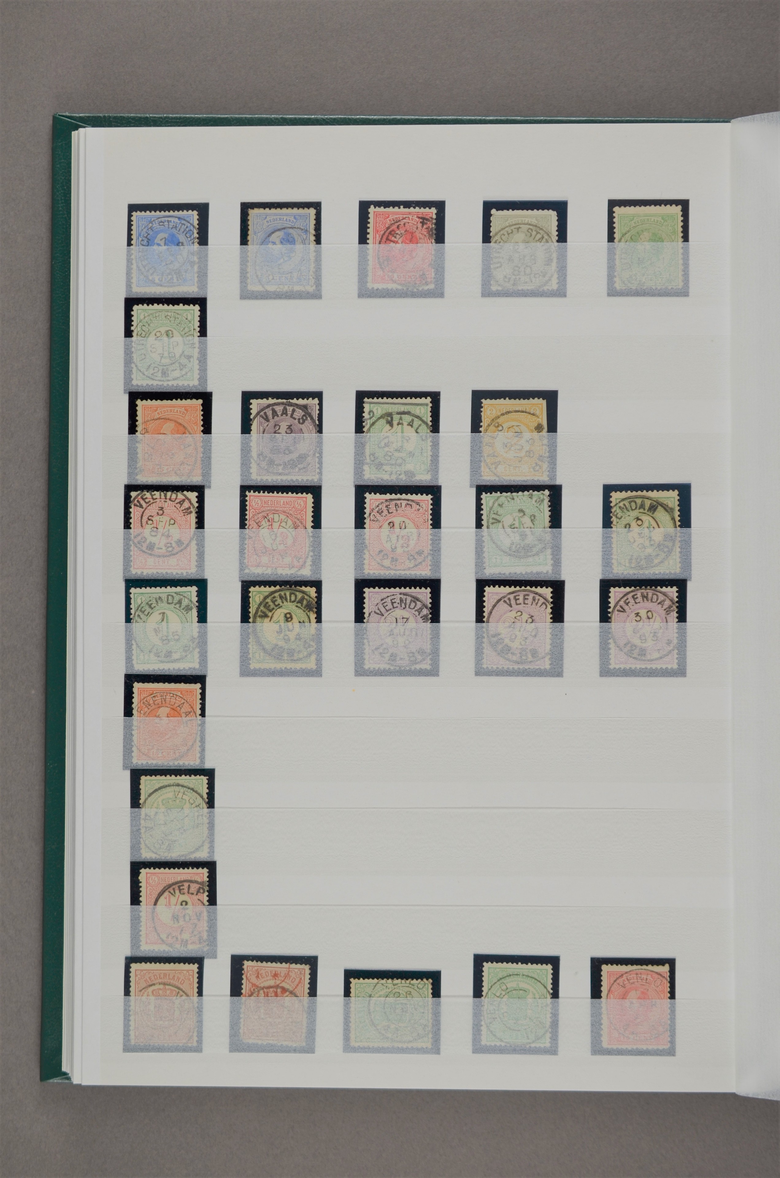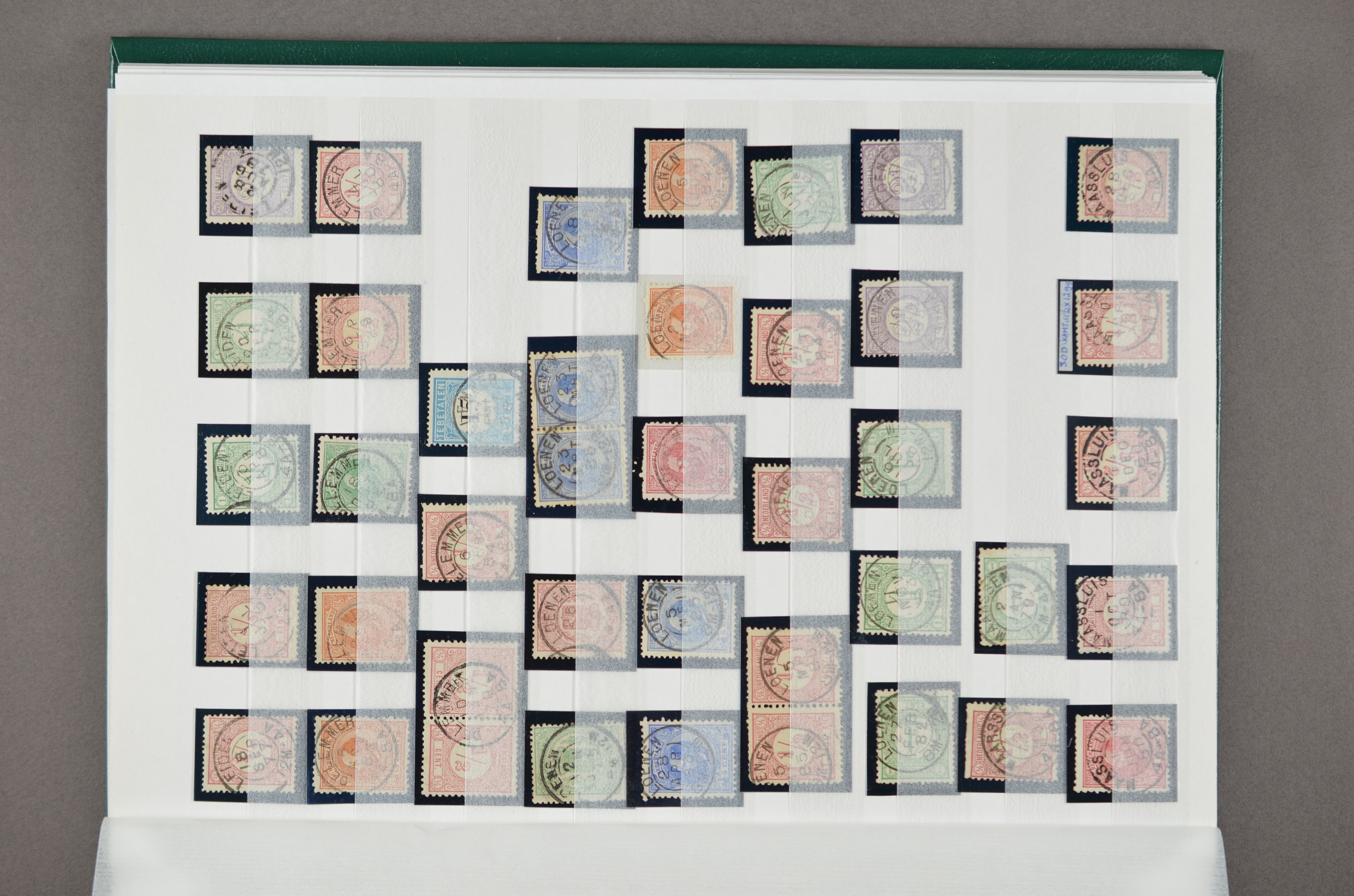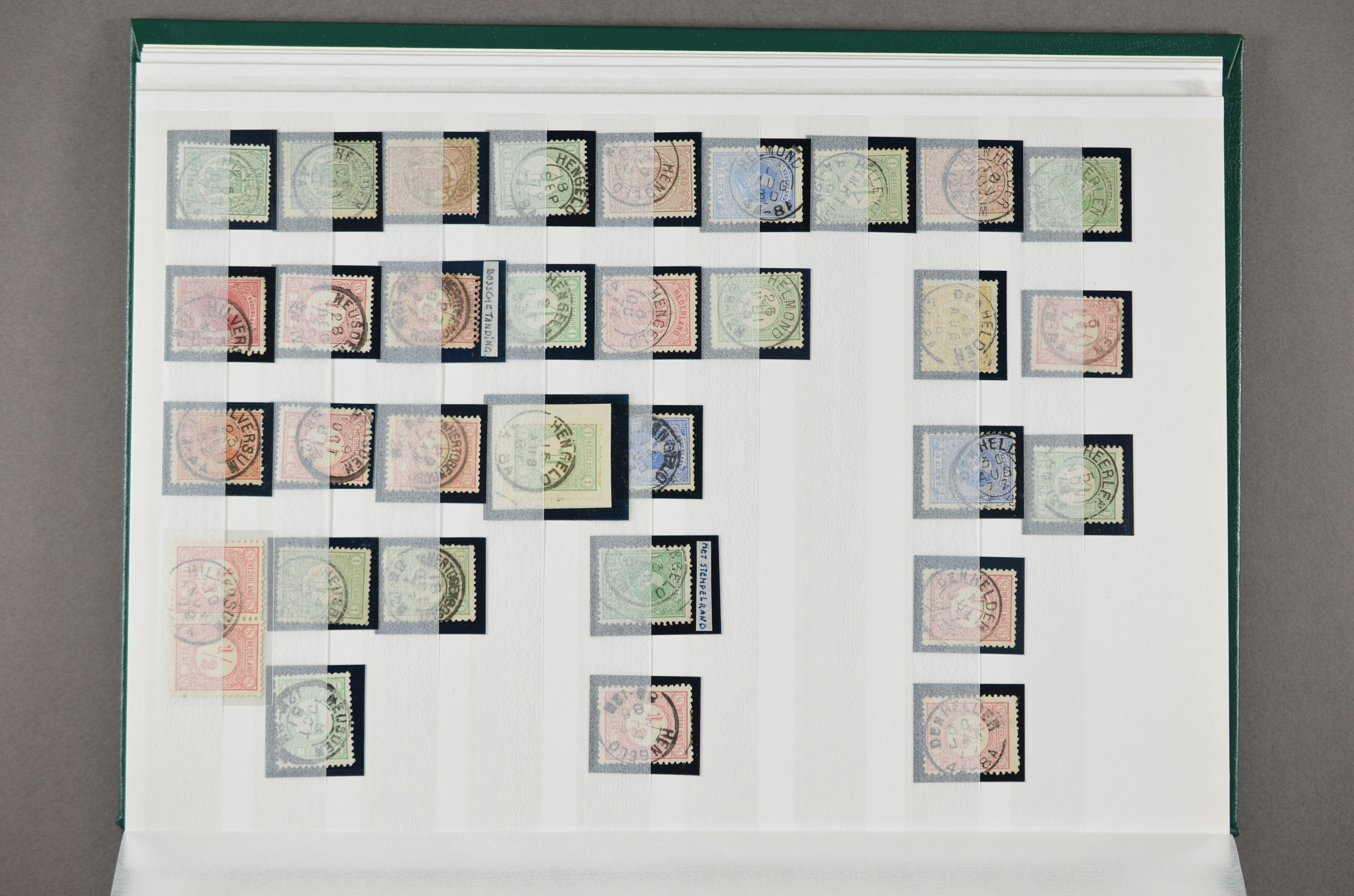 TWEELETTERSTEMPELS, verzameling op losse zegels, enkele zegels op knipsels, wat paren en strippen van diverse emissies en waarden, alfabetisch geordend in insteekboek, en vrijwel uitsluitend volledige afstempelingen. Prachtobject om op te zetten en te vervolmaken
