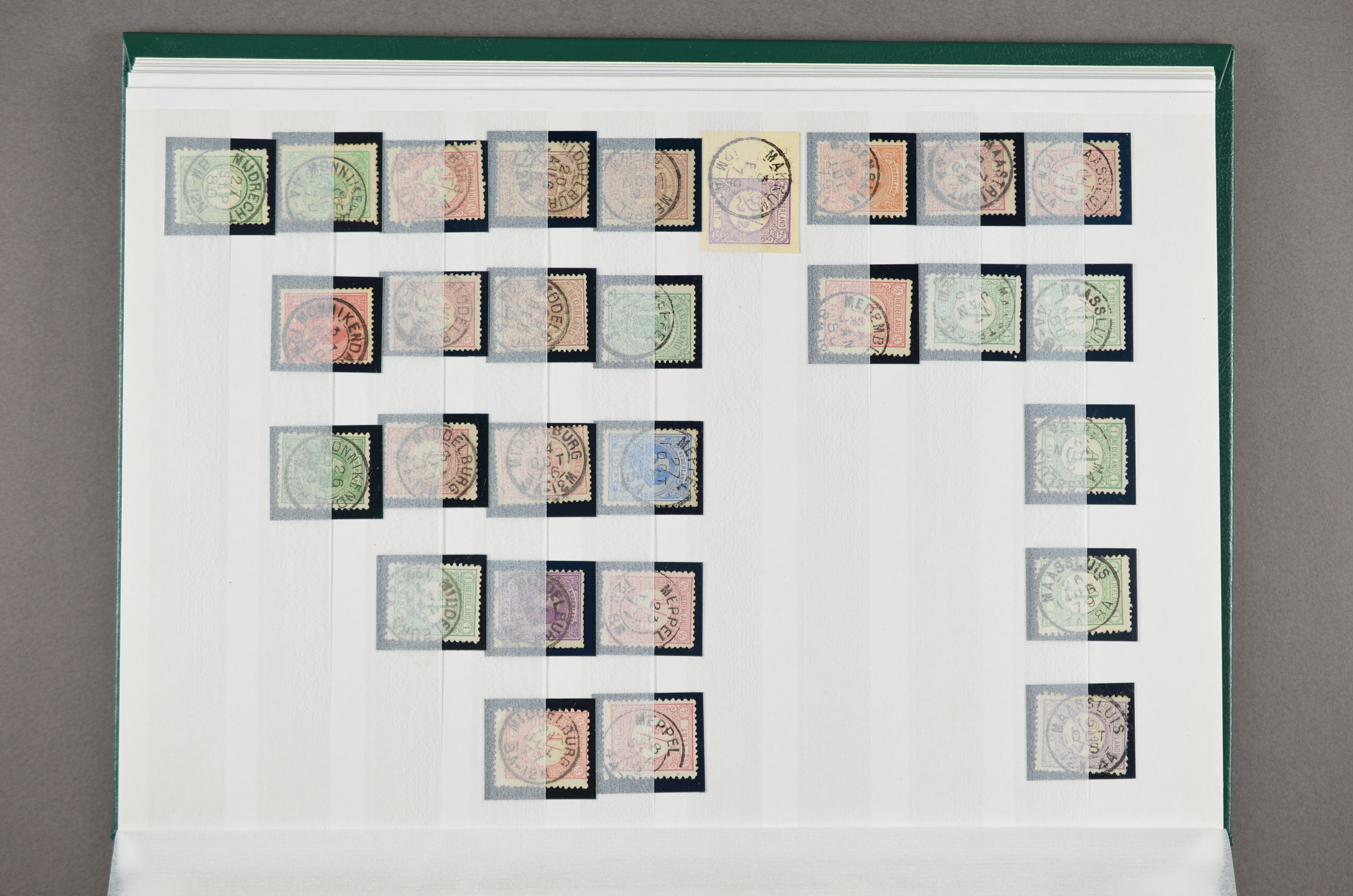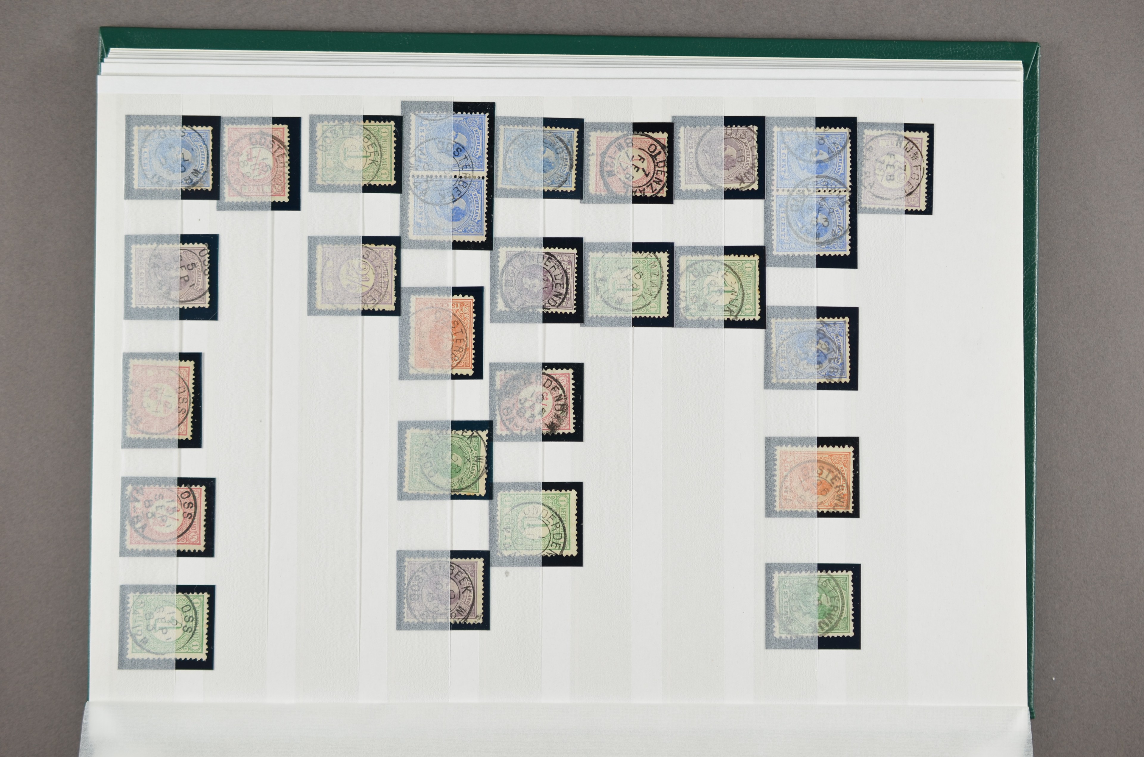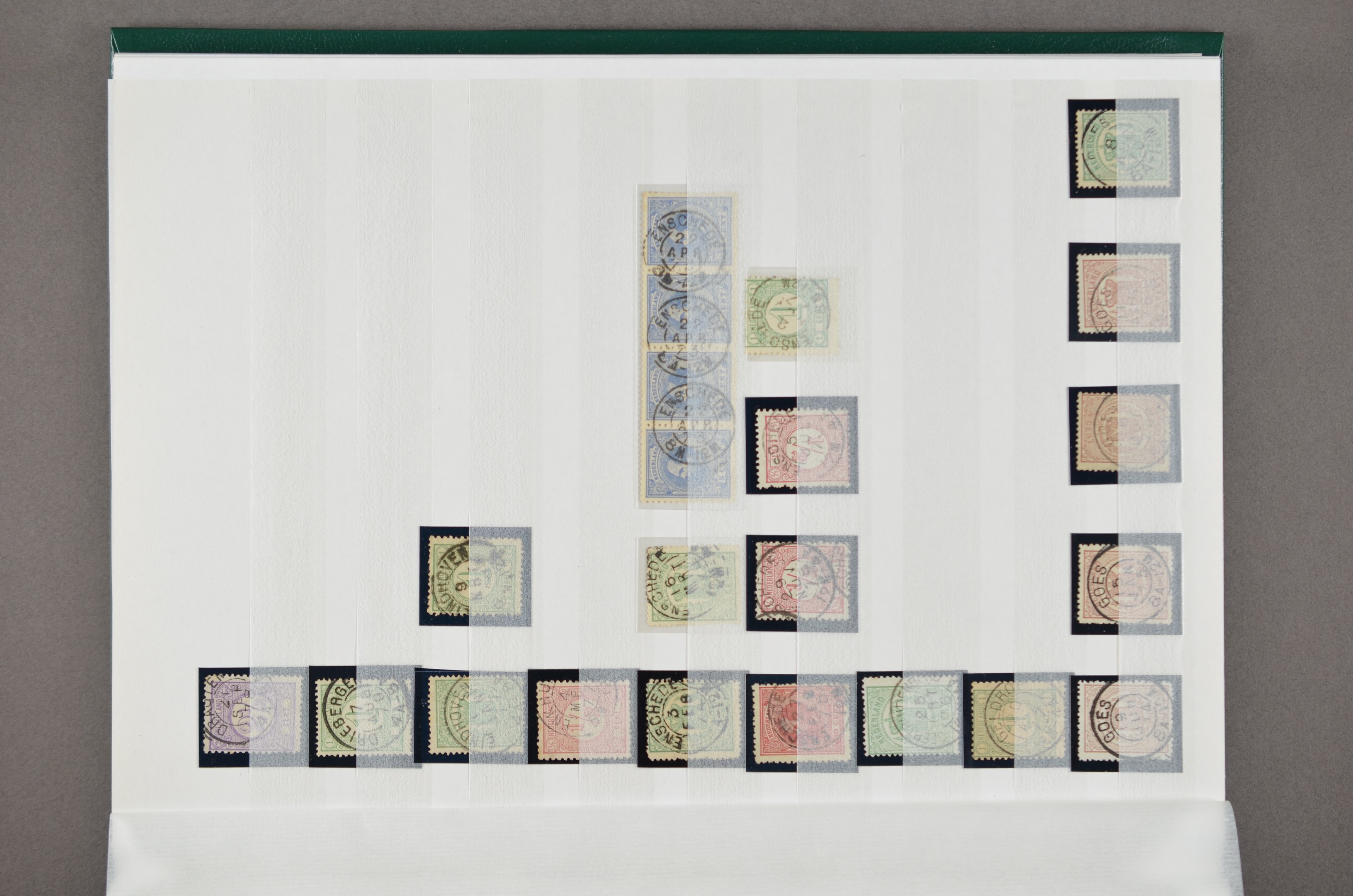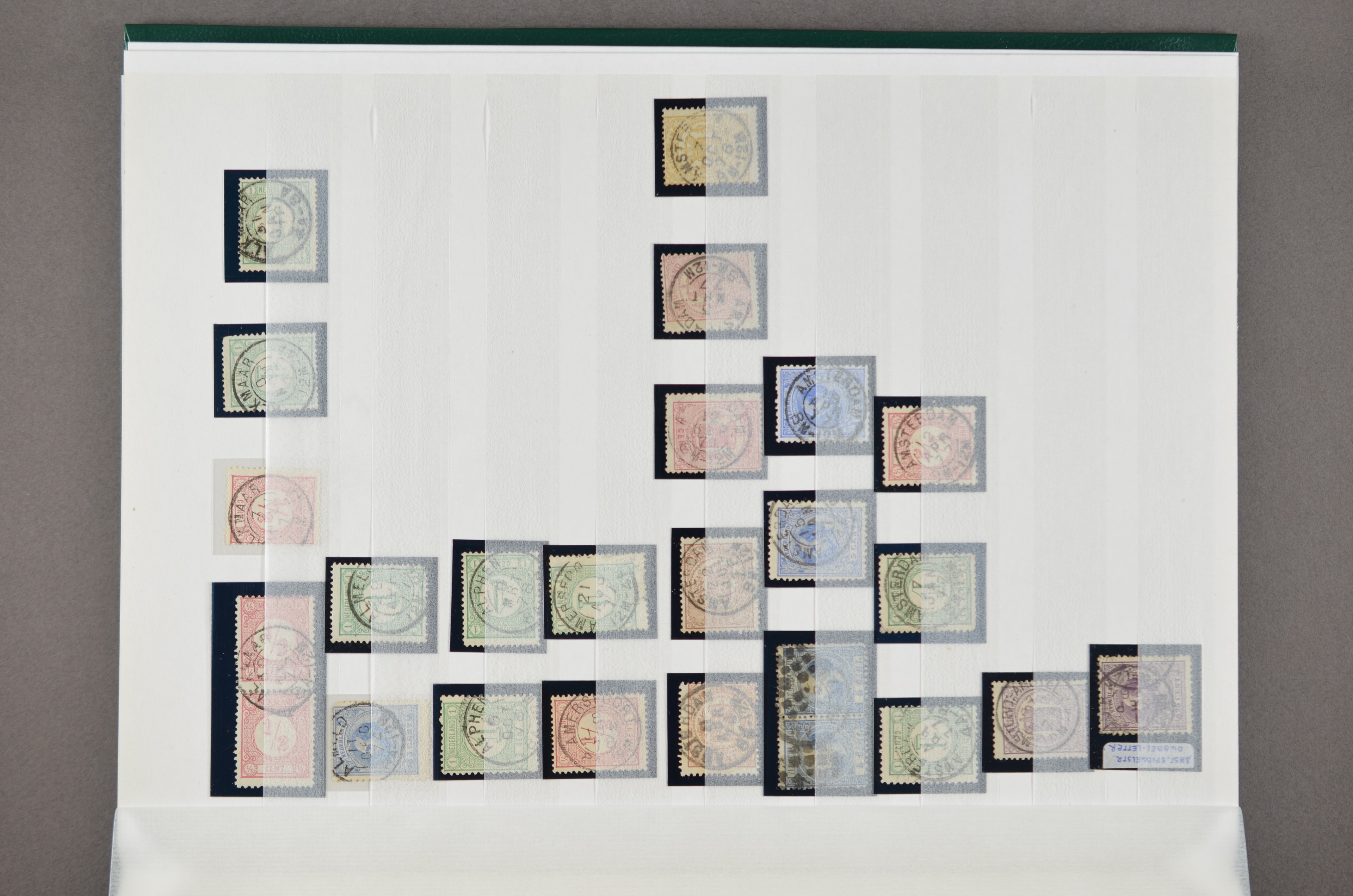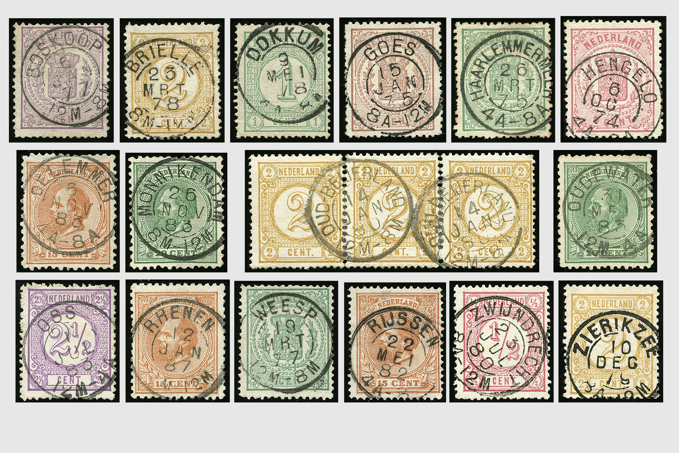TWEELETTERSTEMPELS, verzameling op losse zegels, enkele zegels op knipsels, wat paren en strippen van diverse emissies en waarden, alfabetisch geordend in insteekboek, en vrijwel uitsluitend volledige afstempelingen. Prachtobject om op te zetten en te vervolmaken