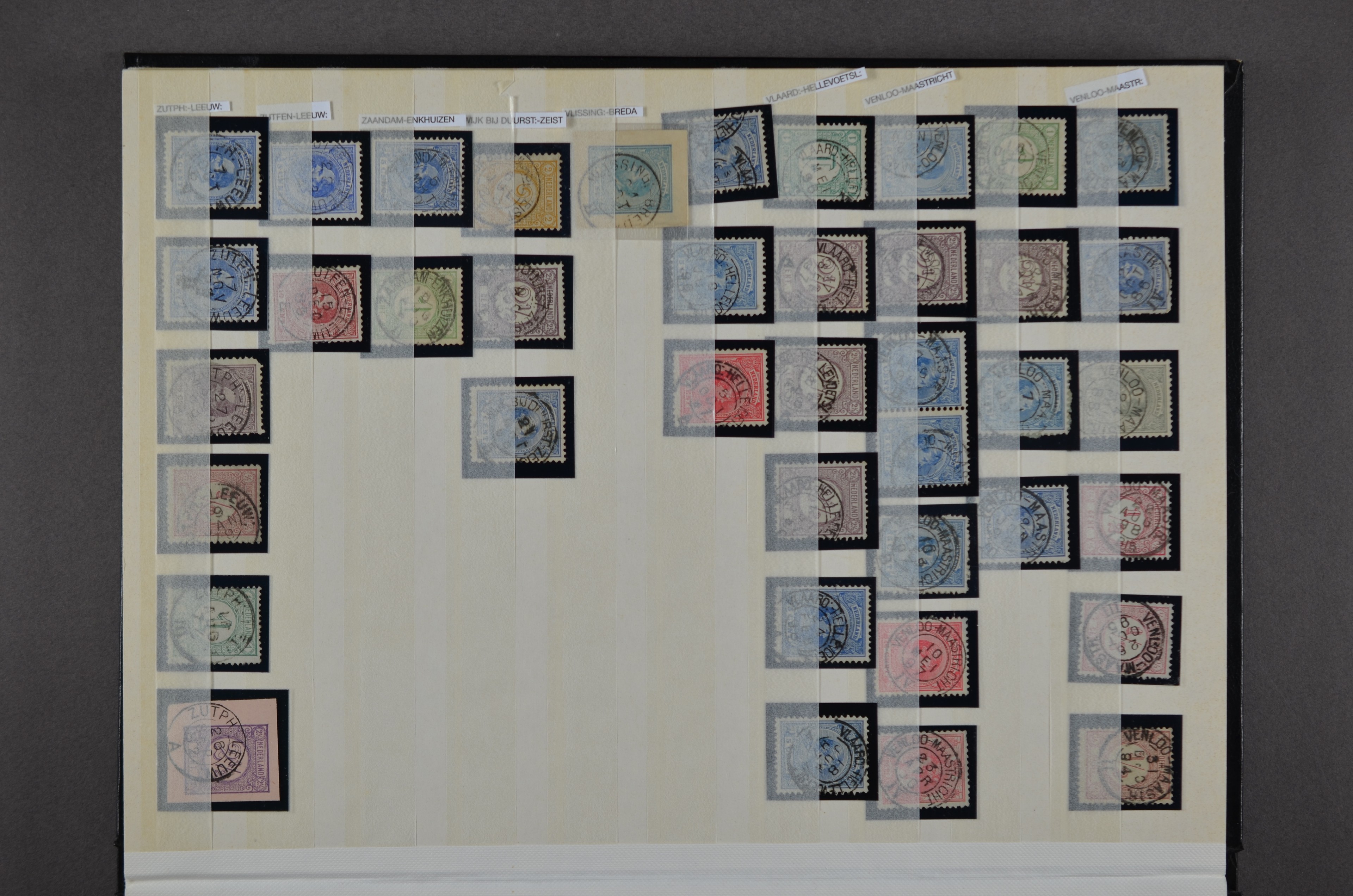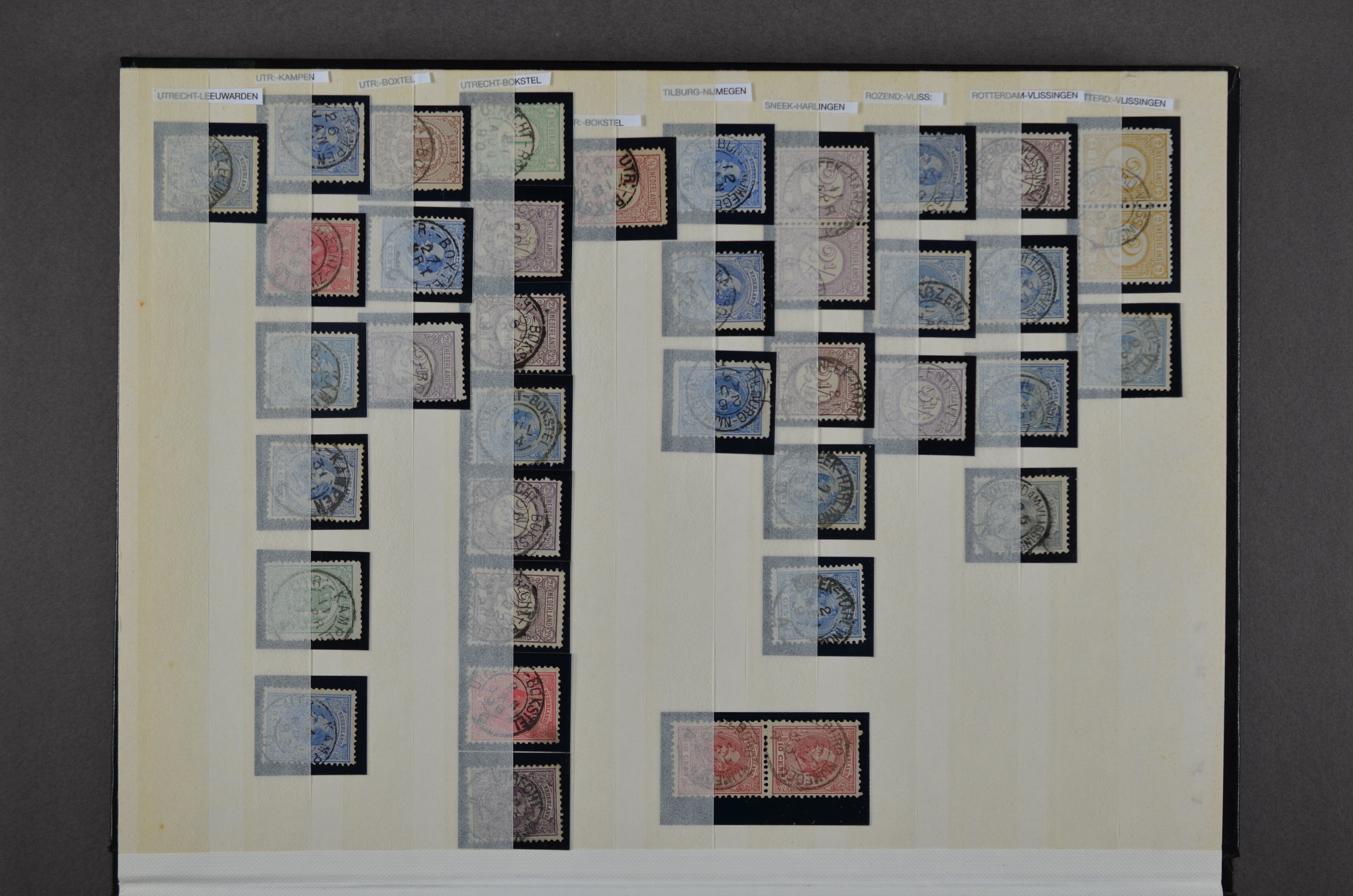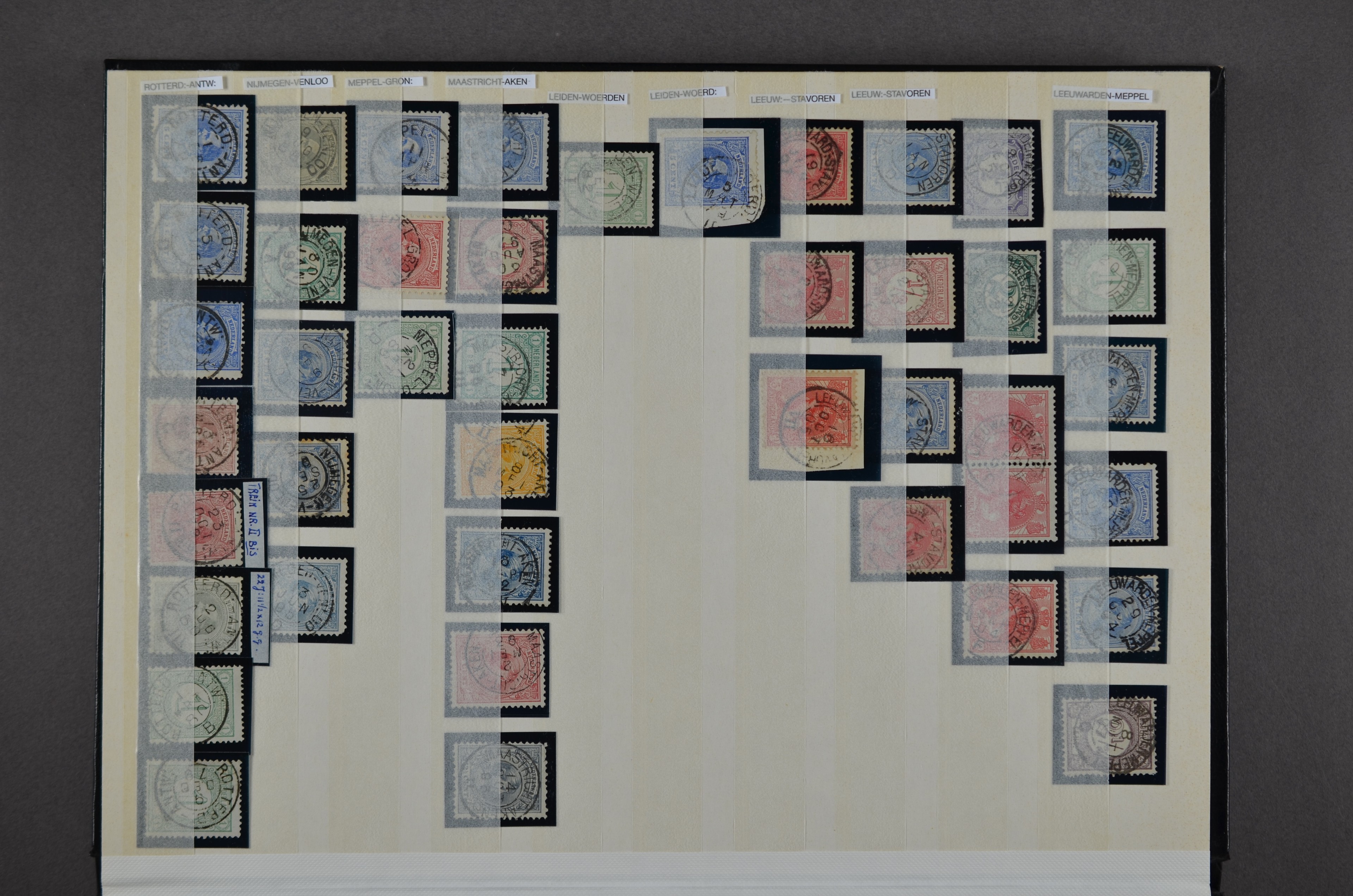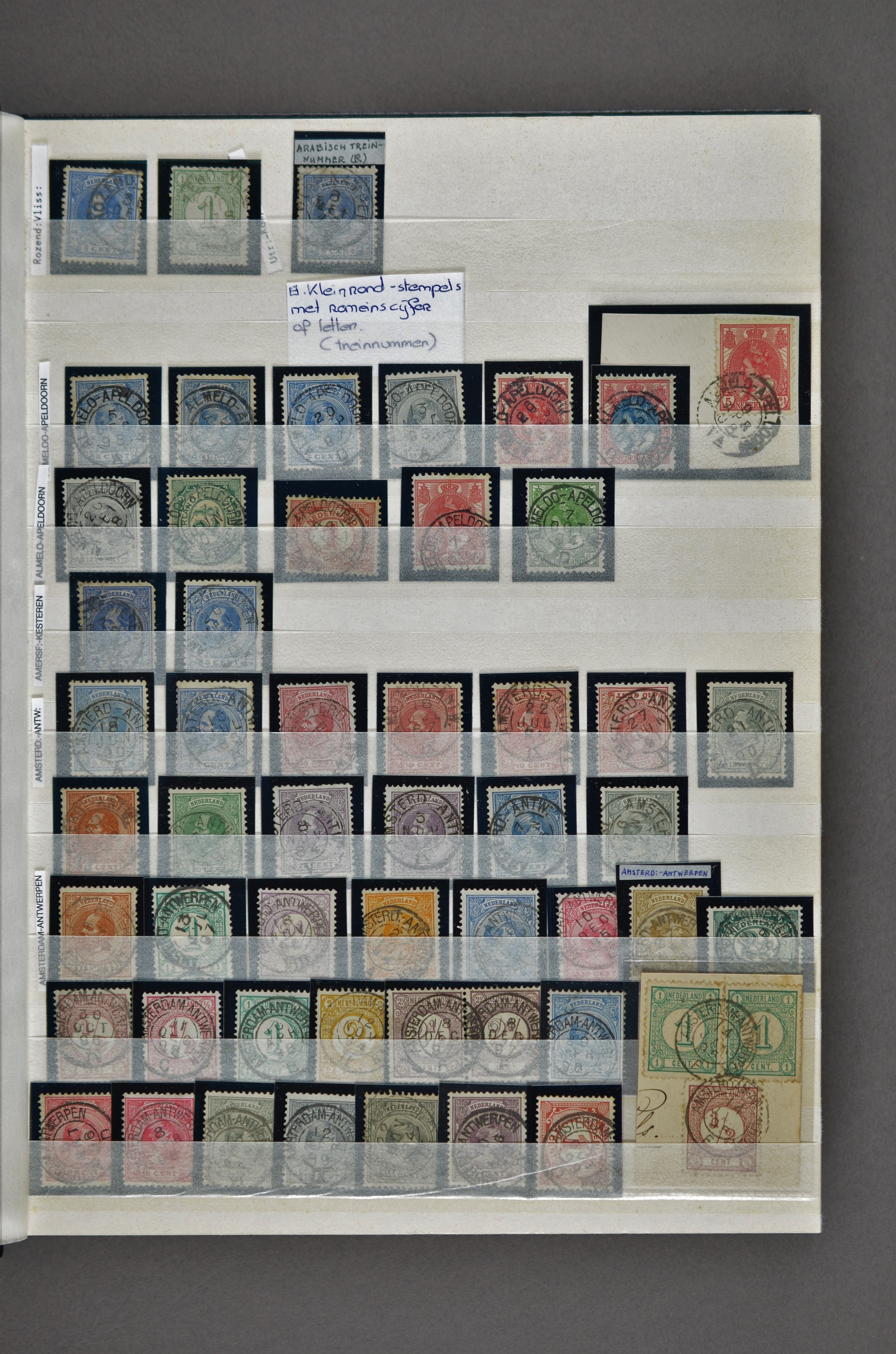 KLEINRONDSTEMPELS van spoorwegtrajecten, verzameling van honderden stempels op verschillende emissies en waarden, w.o. schaarse ex., in insteekboek gesorteerd van A t/m Z (daarbij tevens 3 ex. met Arabisch cijfer), alsmede Amsterdam/E (5x), Rotterd:-Hellev: (1x), Vlissingen-Queenborough (2x) en Queenborough-Vlissingen (3x). Zeer veel afstempelingen in uitgezochte en niet te verbeteren kwaliteit!