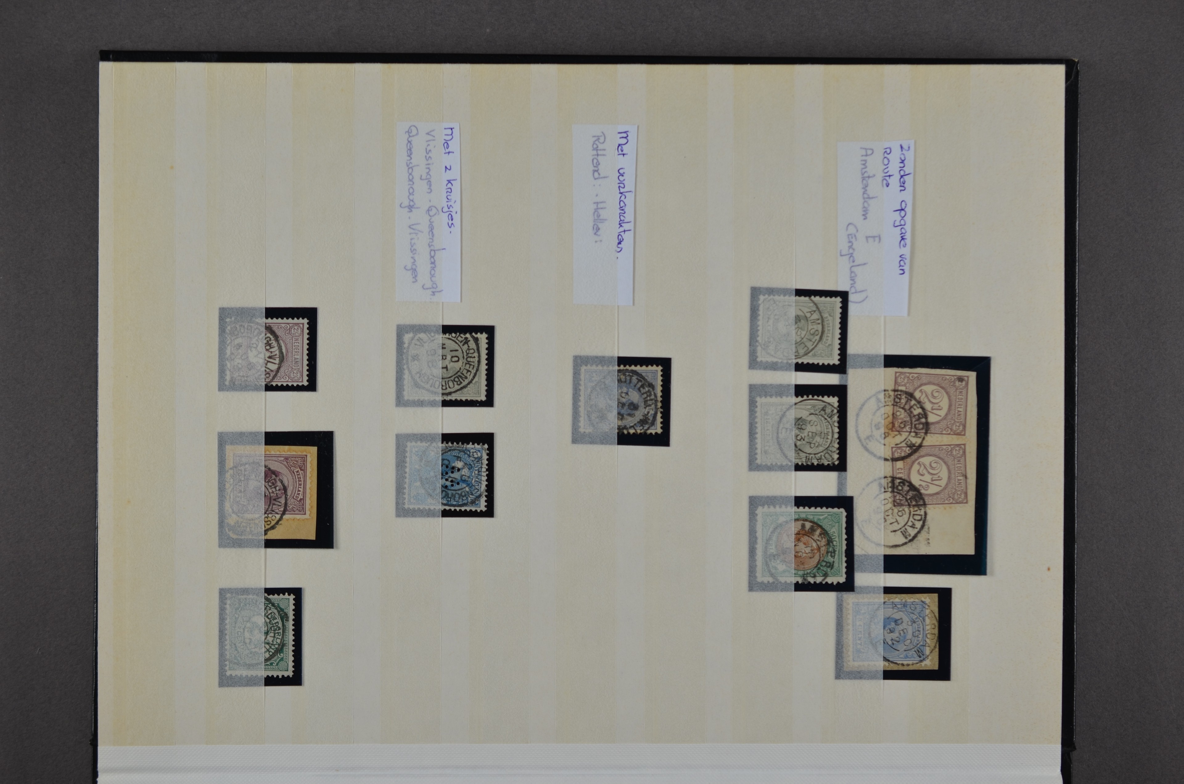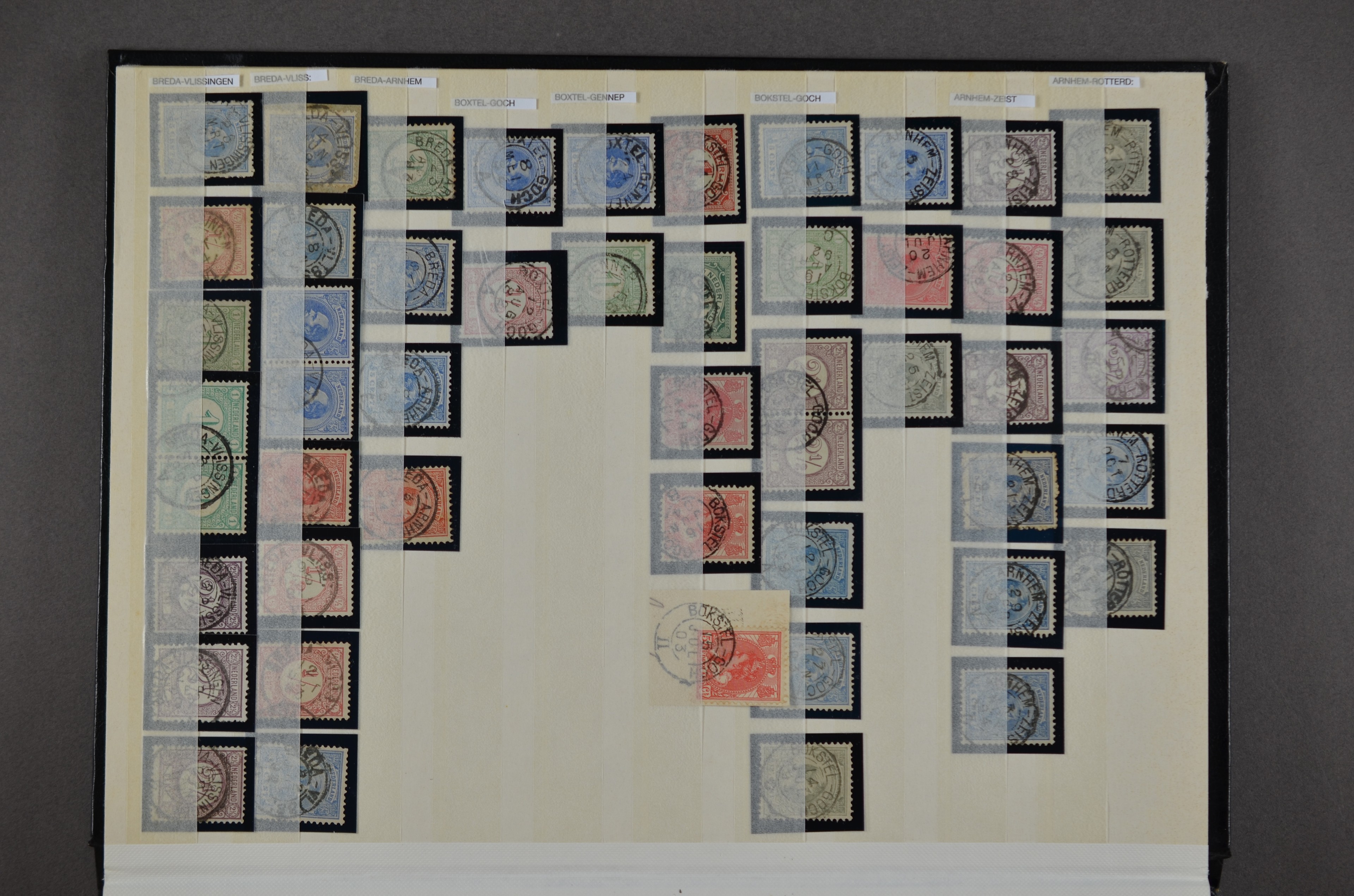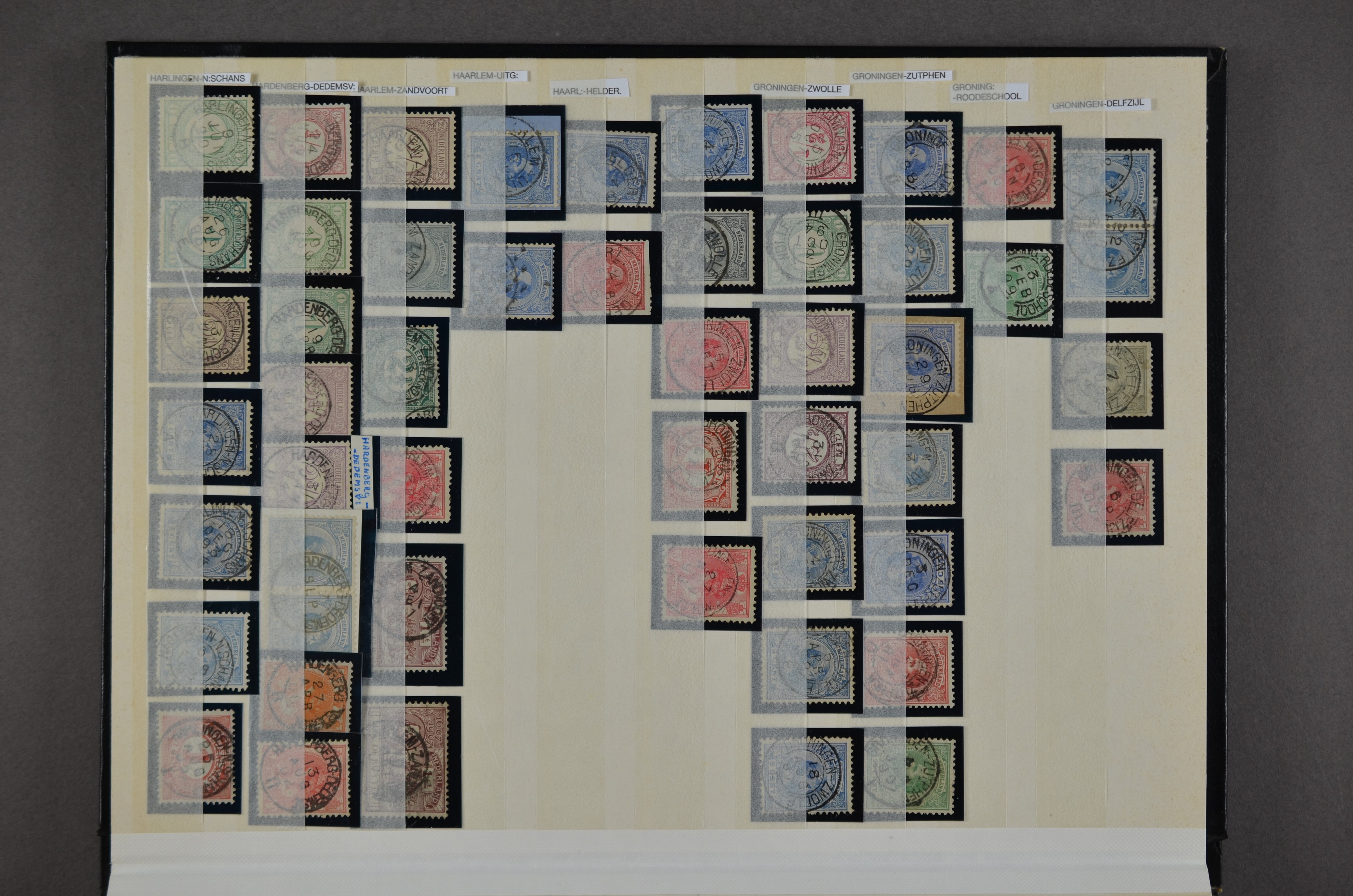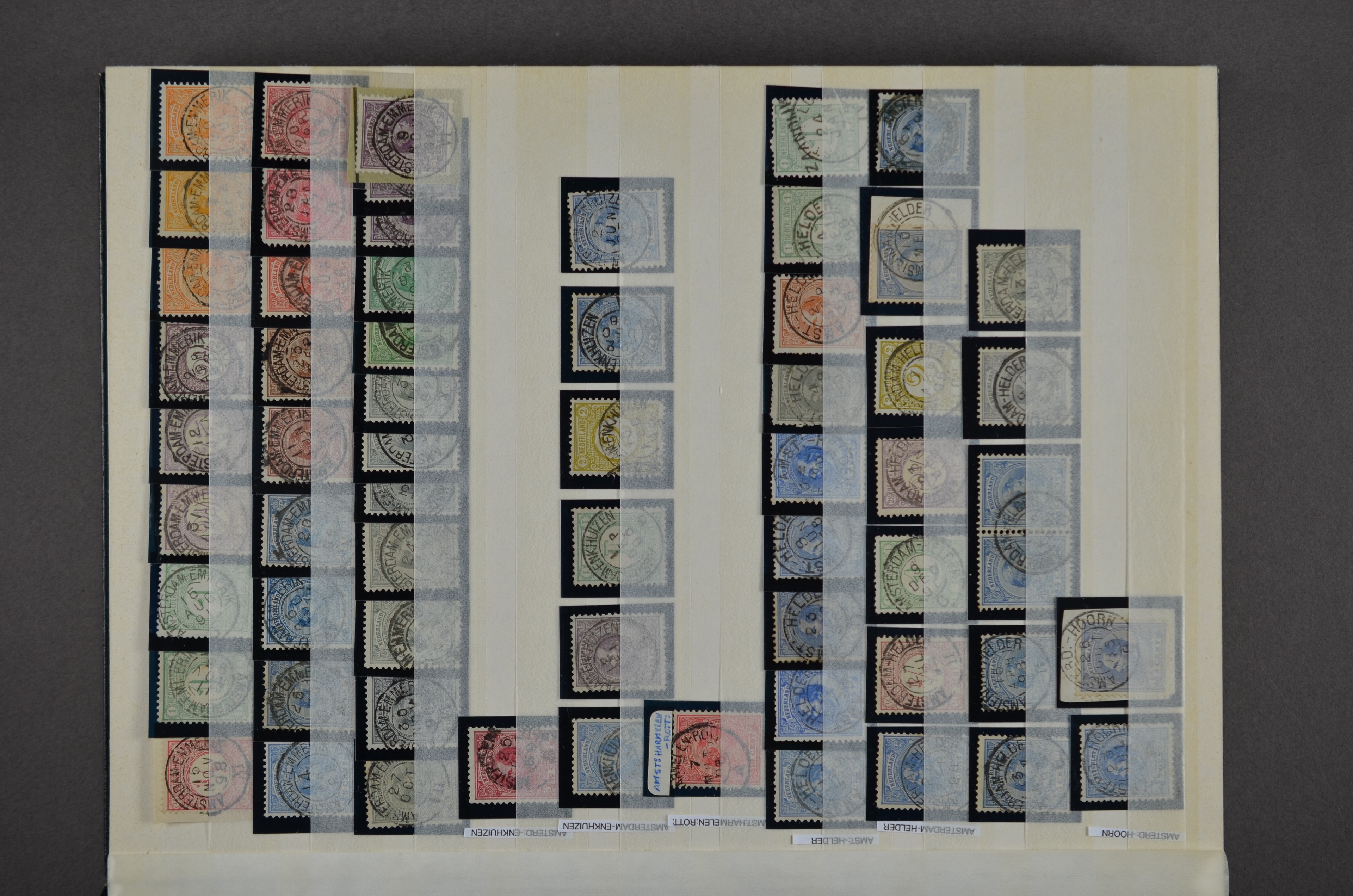 KLEINRONDSTEMPELS van spoorwegtrajecten, verzameling van honderden stempels op verschillende emissies en waarden, w.o. schaarse ex., in insteekboek gesorteerd van A t/m Z (daarbij tevens 3 ex. met Arabisch cijfer), alsmede Amsterdam/E (5x), Rotterd:-Hellev: (1x), Vlissingen-Queenborough (2x) en Queenborough-Vlissingen (3x). Zeer veel afstempelingen in uitgezochte en niet te verbeteren kwaliteit!