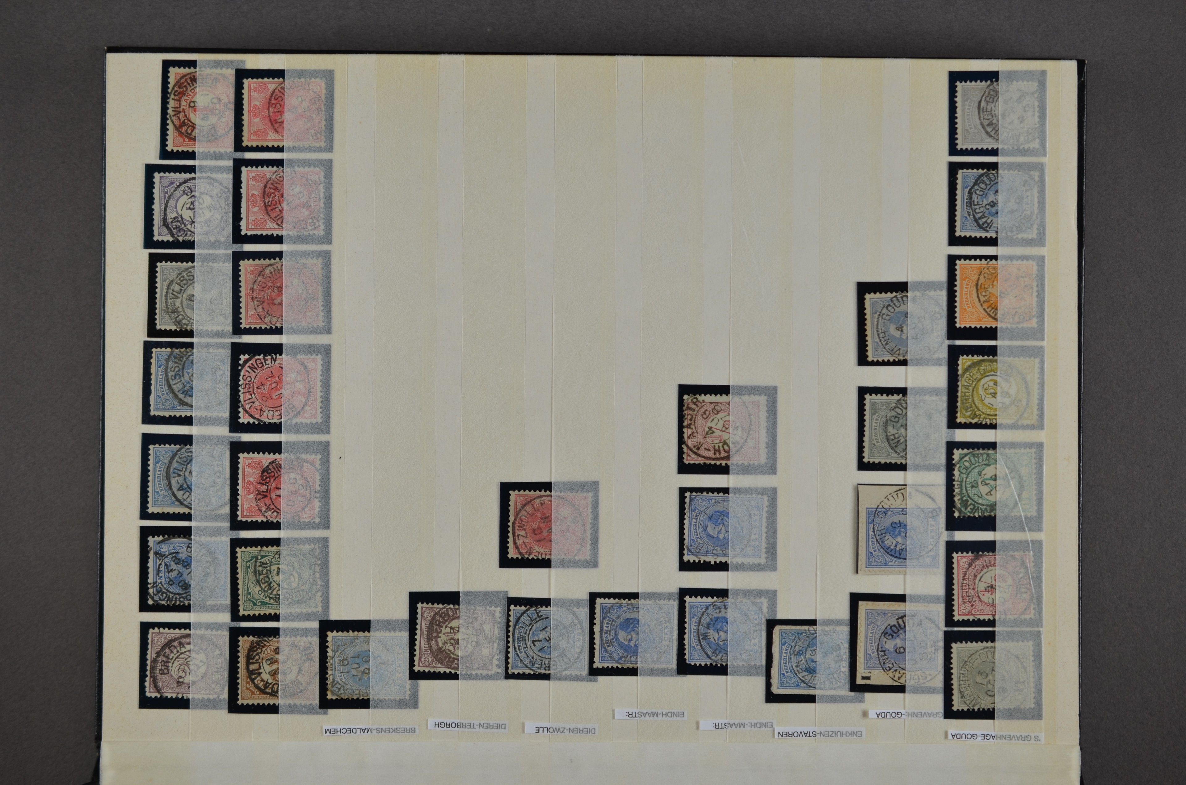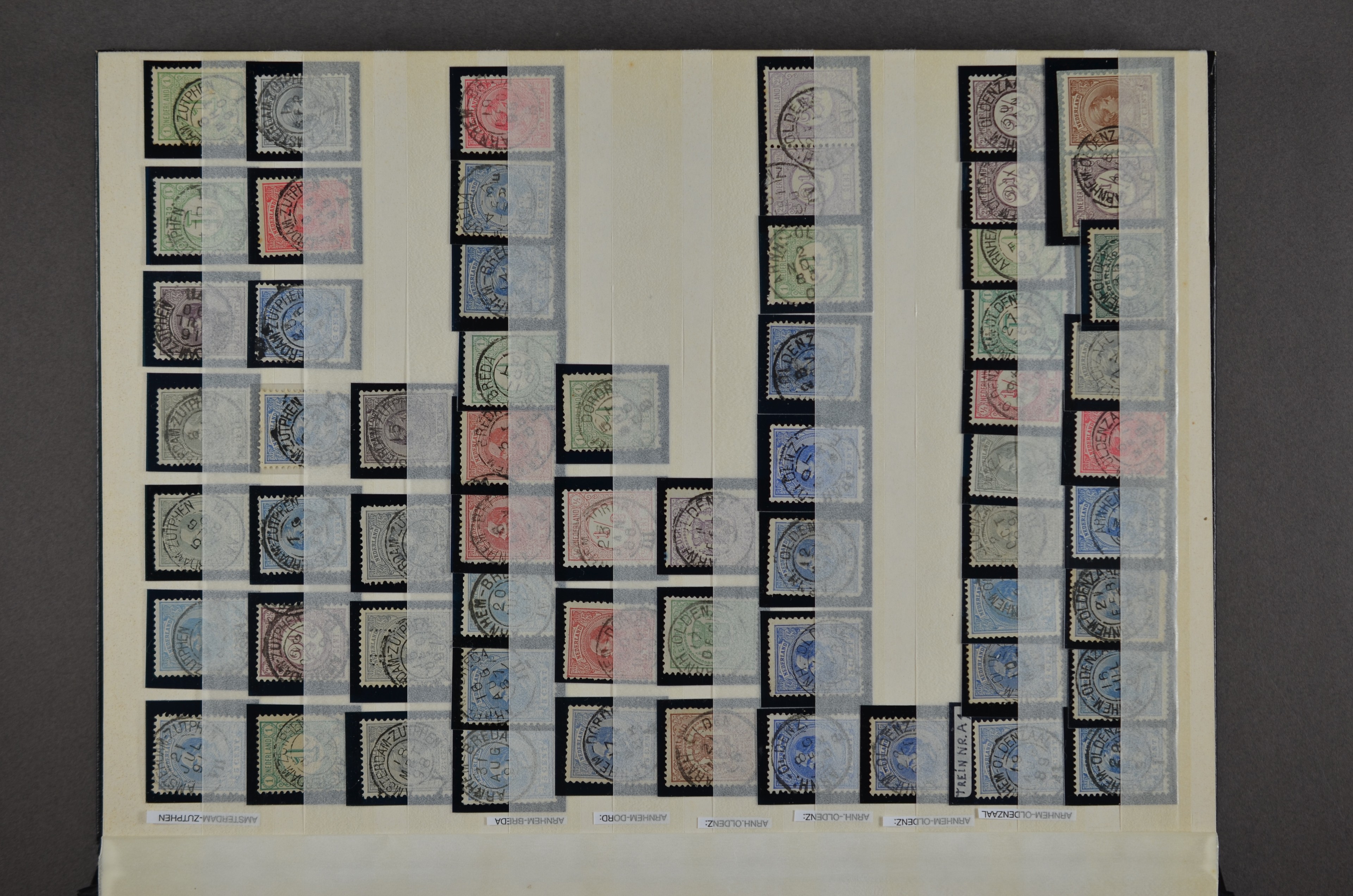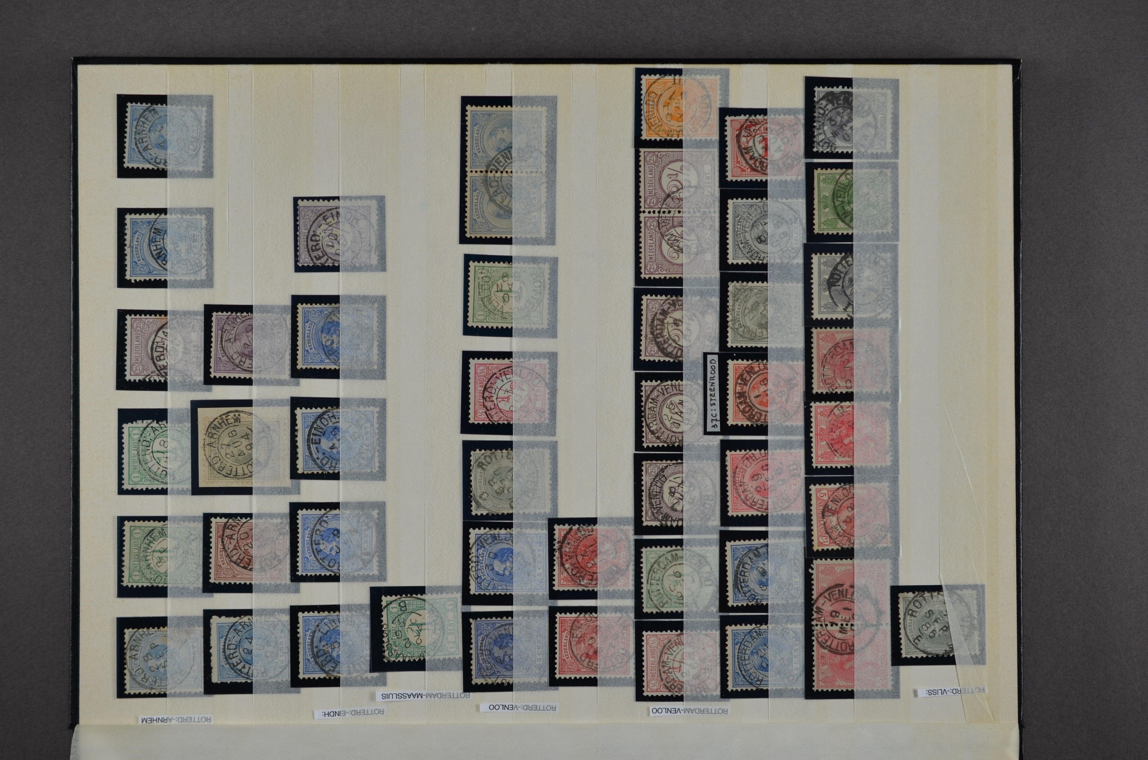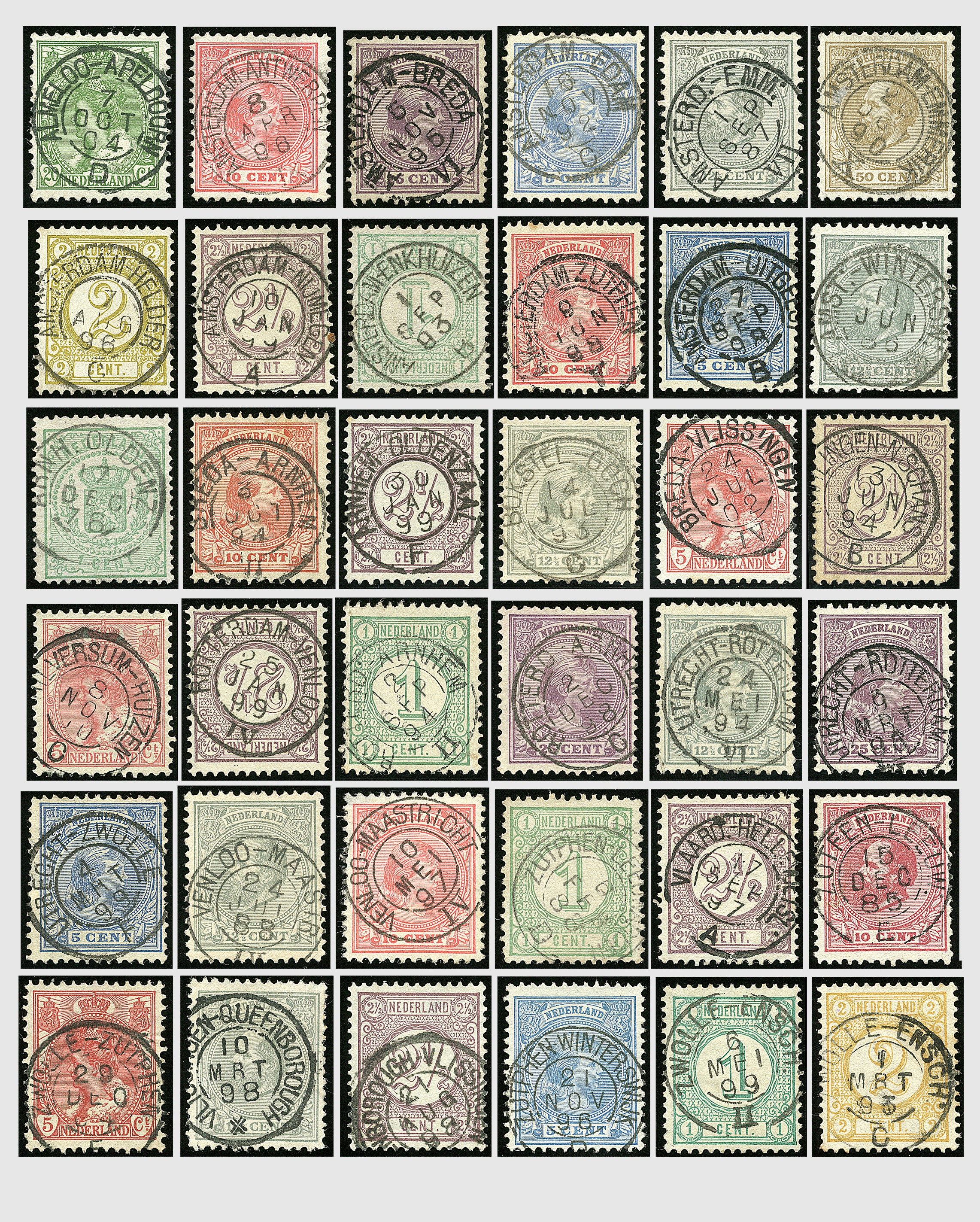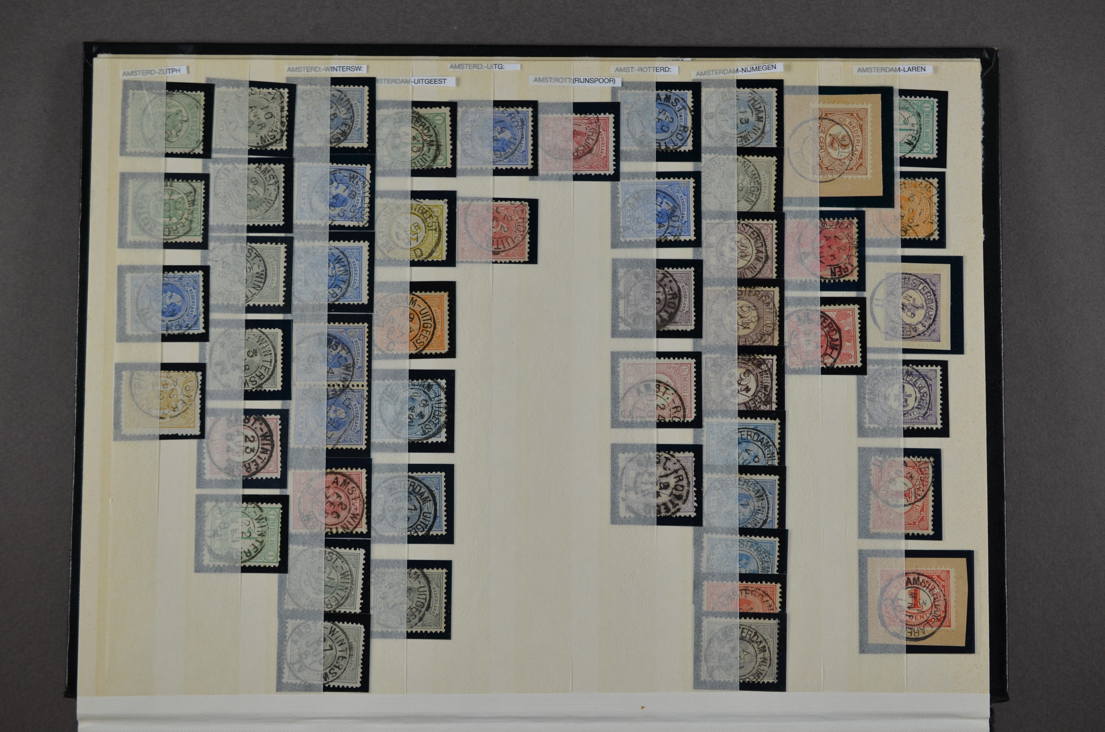 KLEINRONDSTEMPELS van spoorwegtrajecten, verzameling van honderden stempels op verschillende emissies en waarden, w.o. schaarse ex., in insteekboek gesorteerd van A t/m Z (daarbij tevens 3 ex. met Arabisch cijfer), alsmede Amsterdam/E (5x), Rotterd:-Hellev: (1x), Vlissingen-Queenborough (2x) en Queenborough-Vlissingen (3x). Zeer veel afstempelingen in uitgezochte en niet te verbeteren kwaliteit!