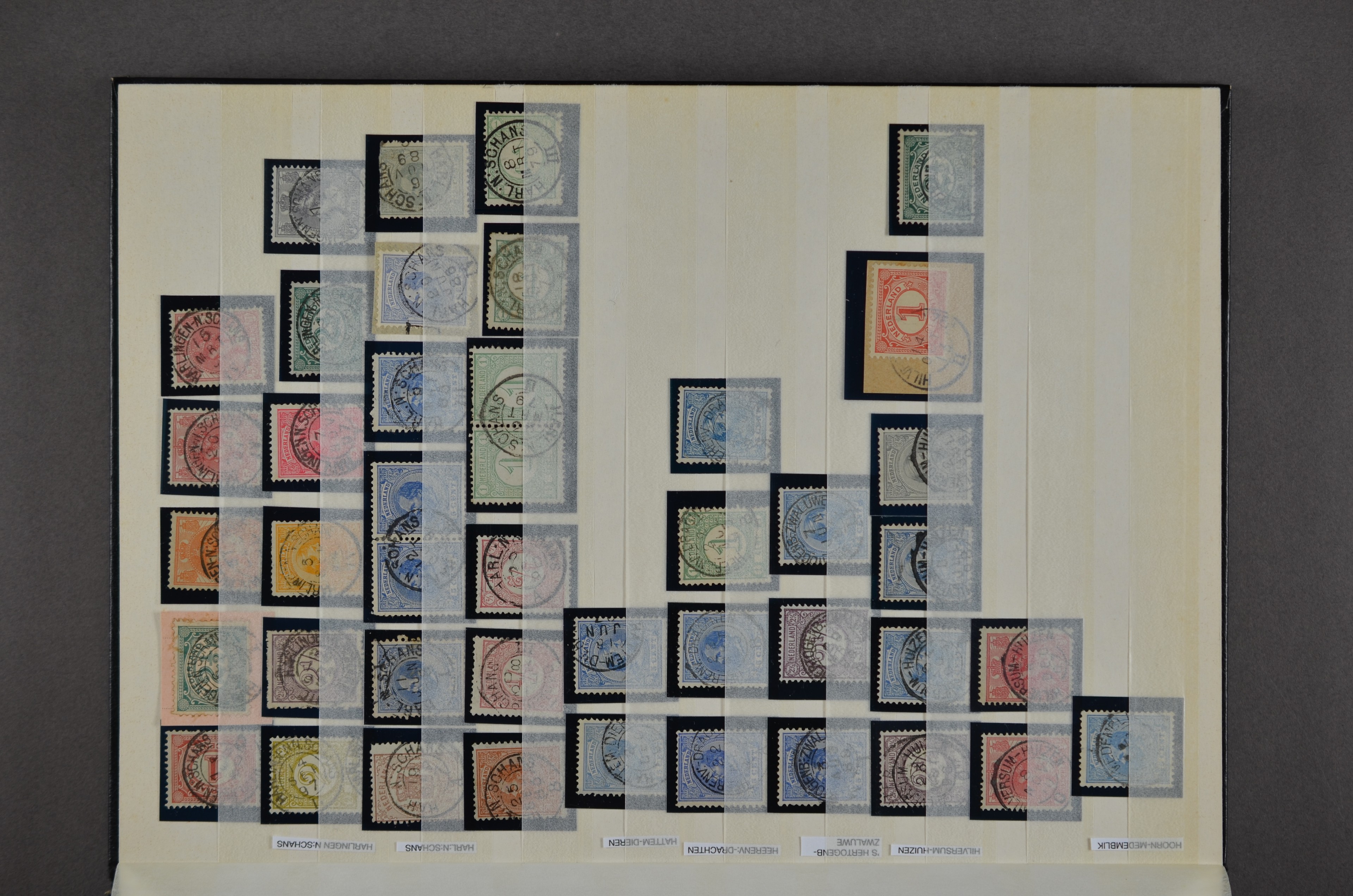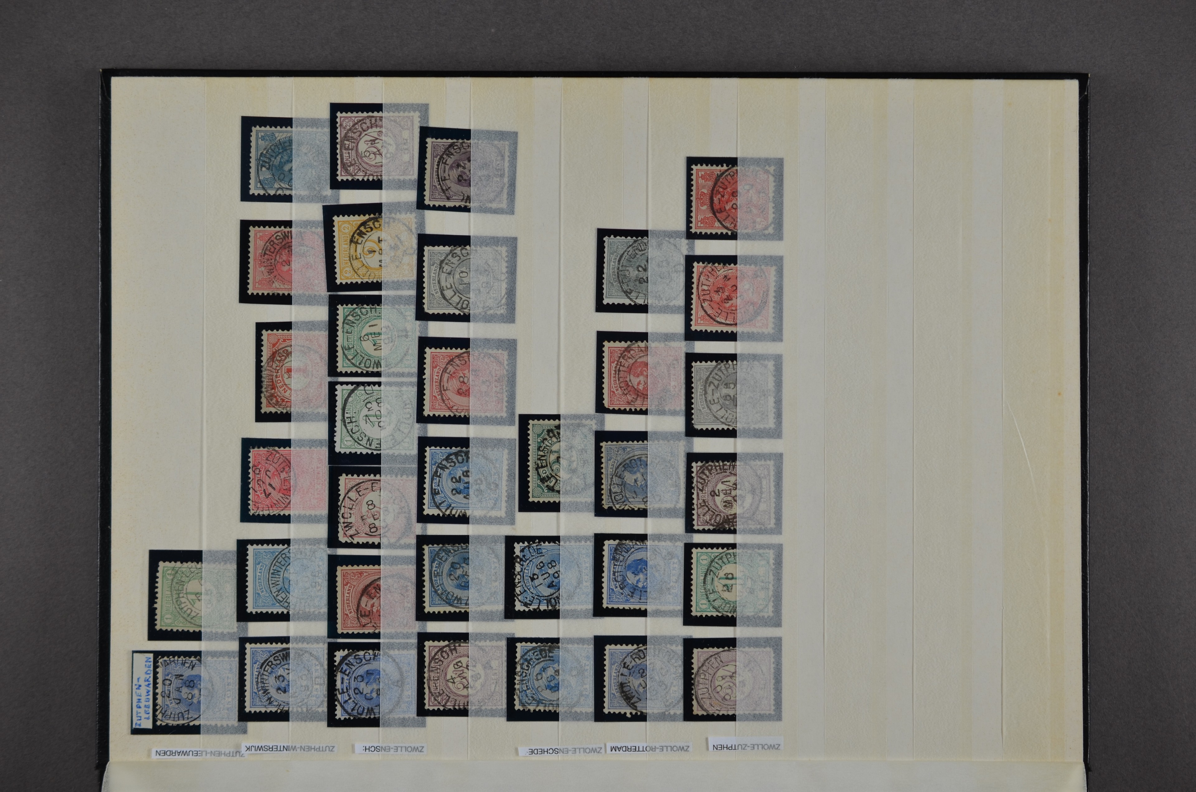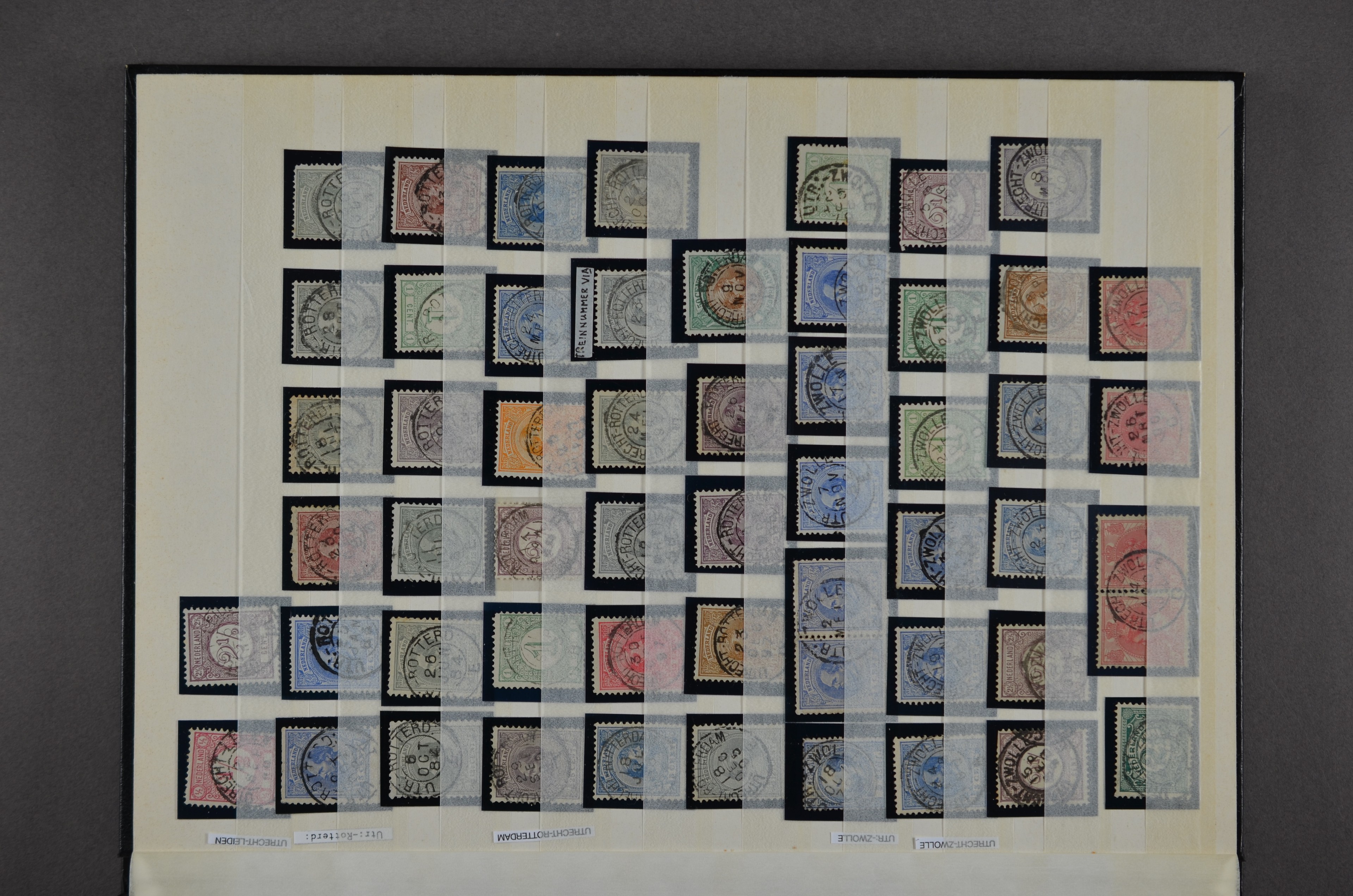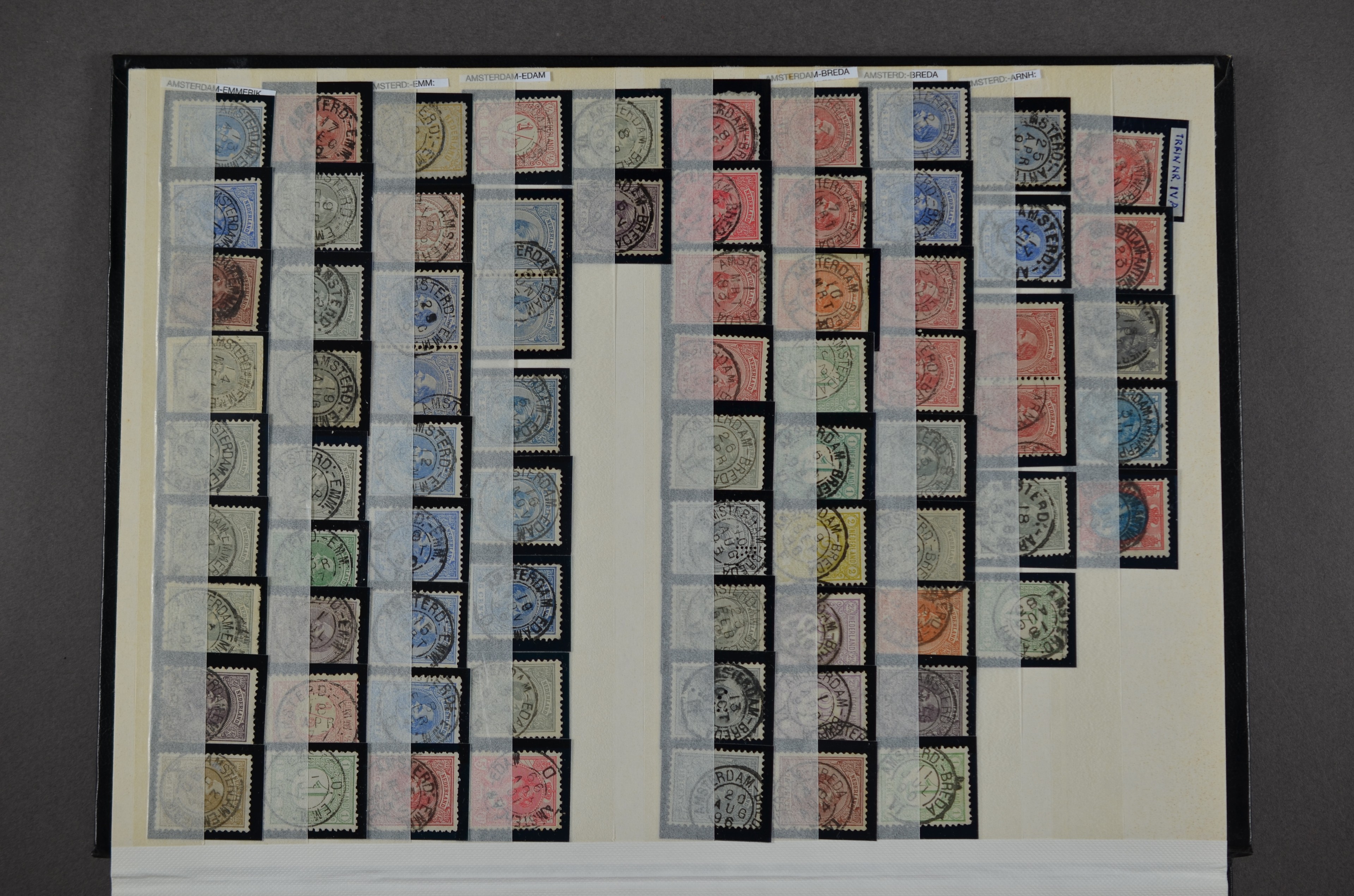 KLEINRONDSTEMPELS van spoorwegtrajecten, verzameling van honderden stempels op verschillende emissies en waarden, w.o. schaarse ex., in insteekboek gesorteerd van A t/m Z (daarbij tevens 3 ex. met Arabisch cijfer), alsmede Amsterdam/E (5x), Rotterd:-Hellev: (1x), Vlissingen-Queenborough (2x) en Queenborough-Vlissingen (3x). Zeer veel afstempelingen in uitgezochte en niet te verbeteren kwaliteit!