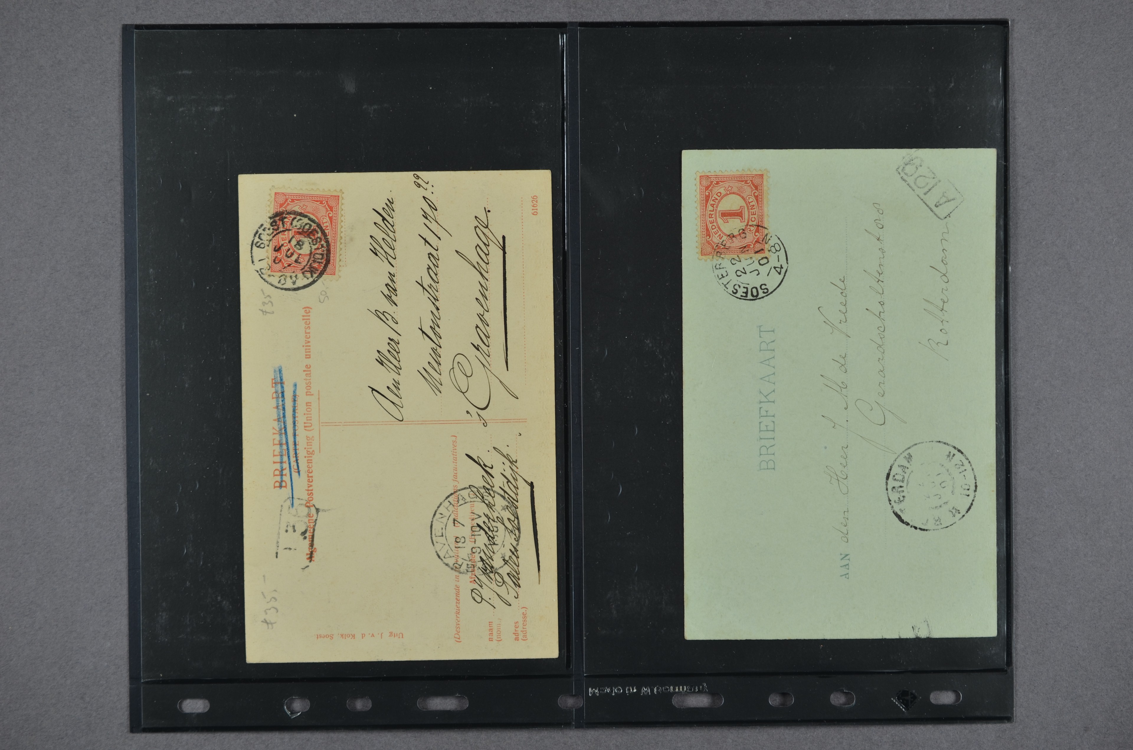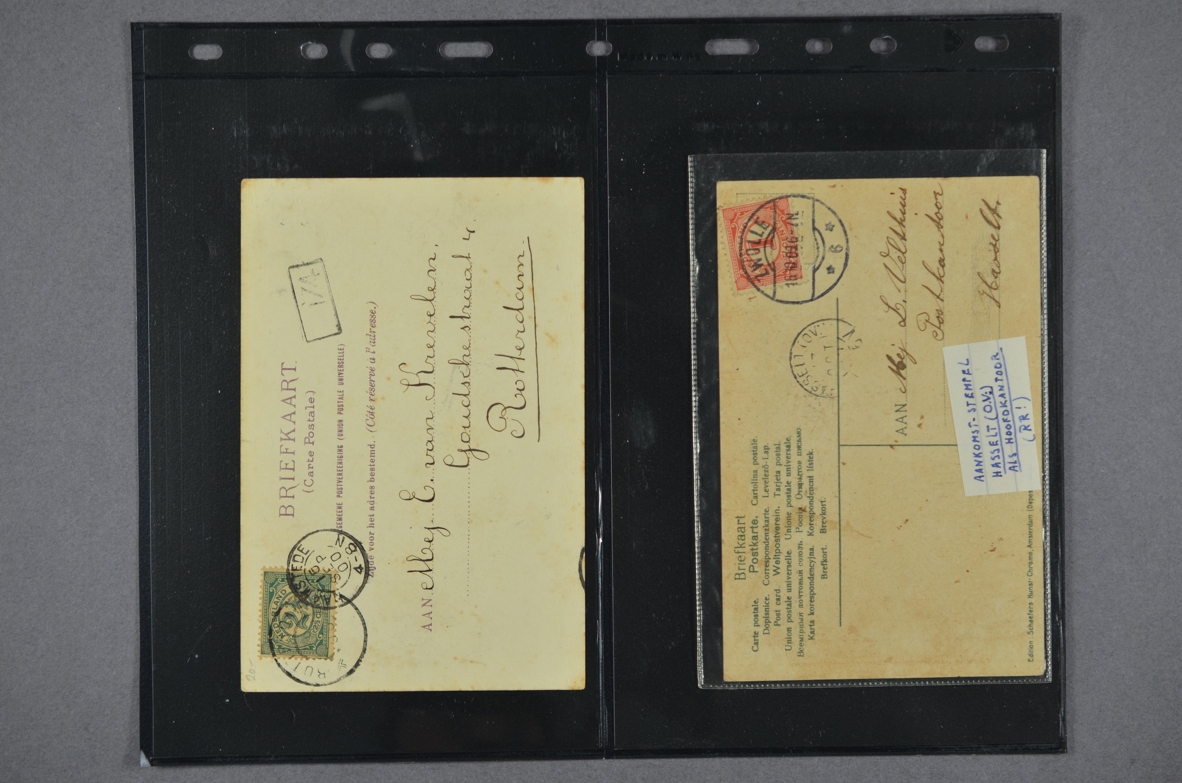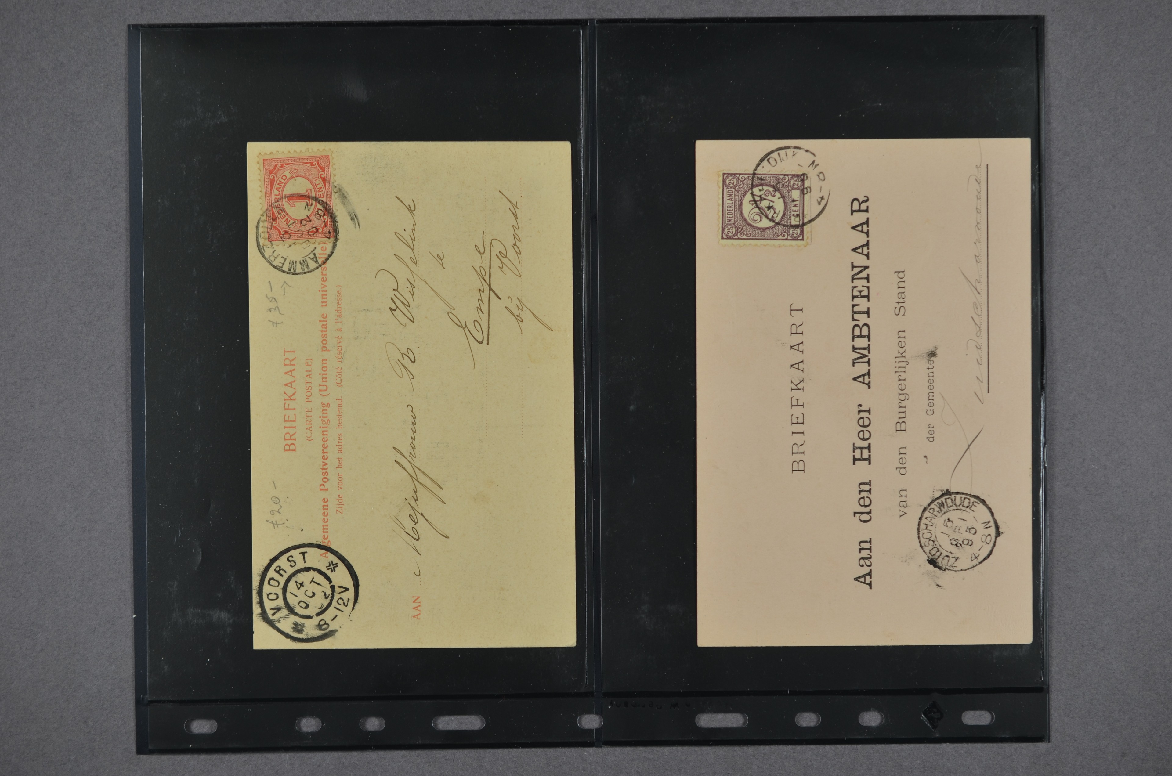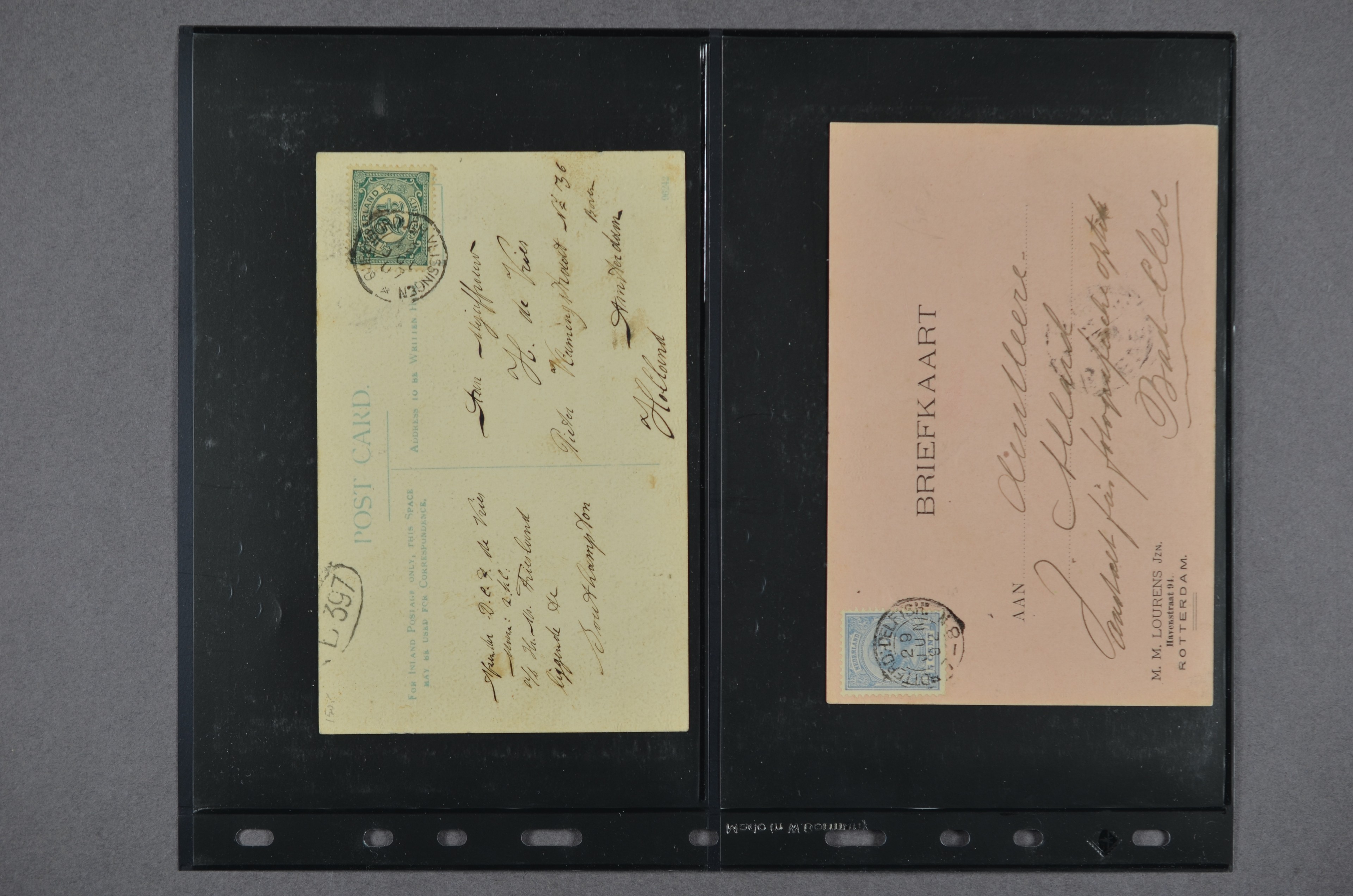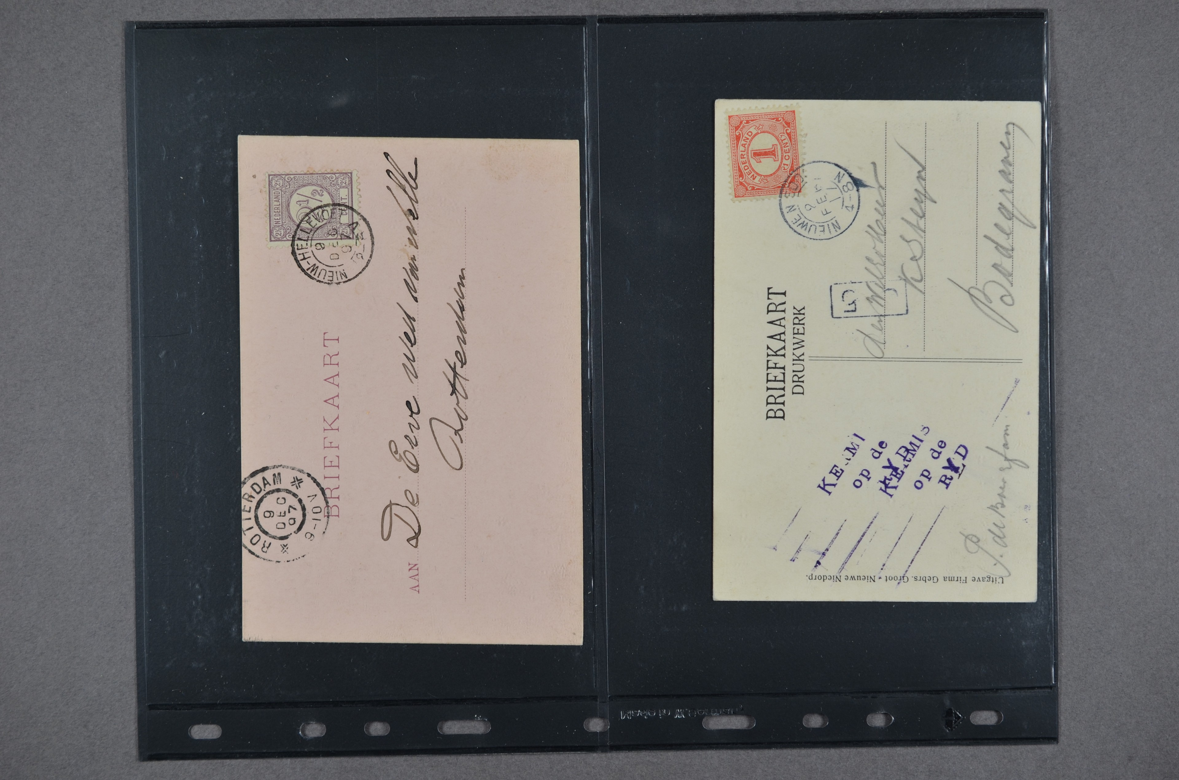 KLEINROND OP POSTSTUK, collectie van ruim 450 poststukken w.o. veel prentbriefkaarten, allemaal met kleinrondstempels van post-, hulppost- (merendeels) en bijpostkantoren, ook van spoorwegtrajecten, stations, Kamp bij Rijen (meerdere ex.), Amsterdam E, diverse schaarse stempels, enige doubletten, veel prachtige afstempelingen, enkele in blauw of violet, in 2 Leuchtturm-ringbanden. Prachtobject voor de handel of verzamelaar om op te zetten