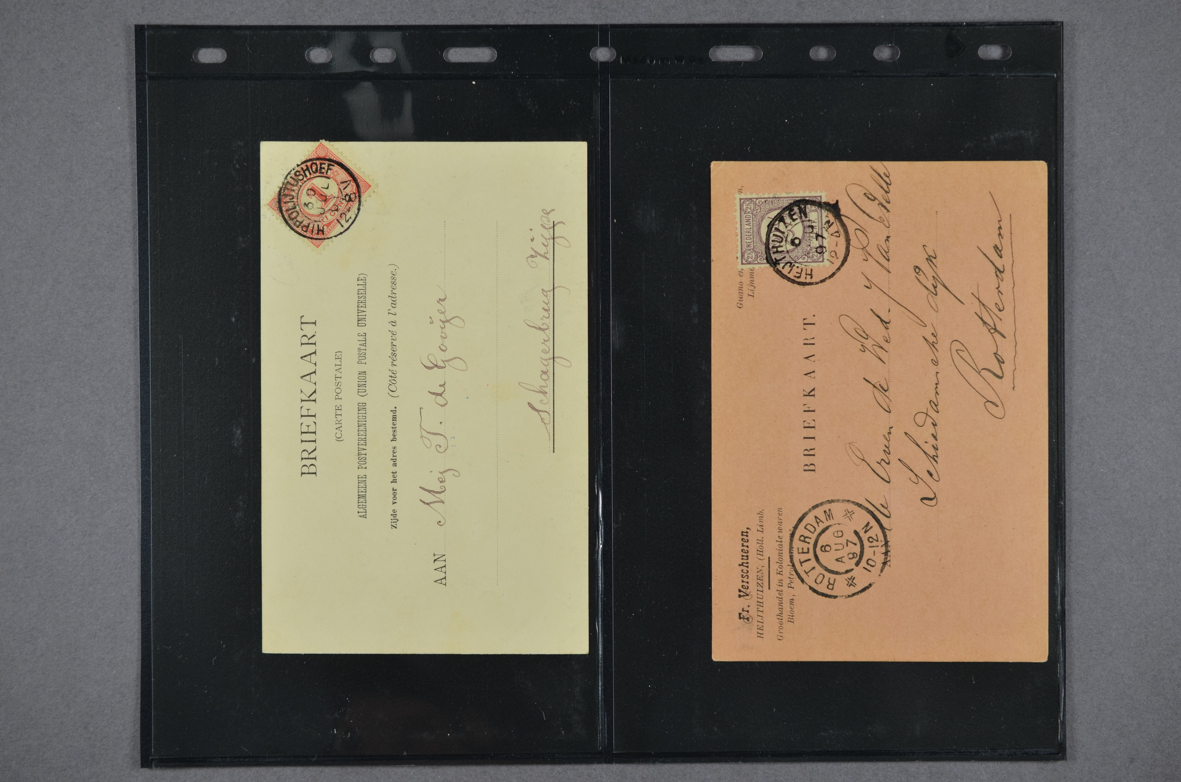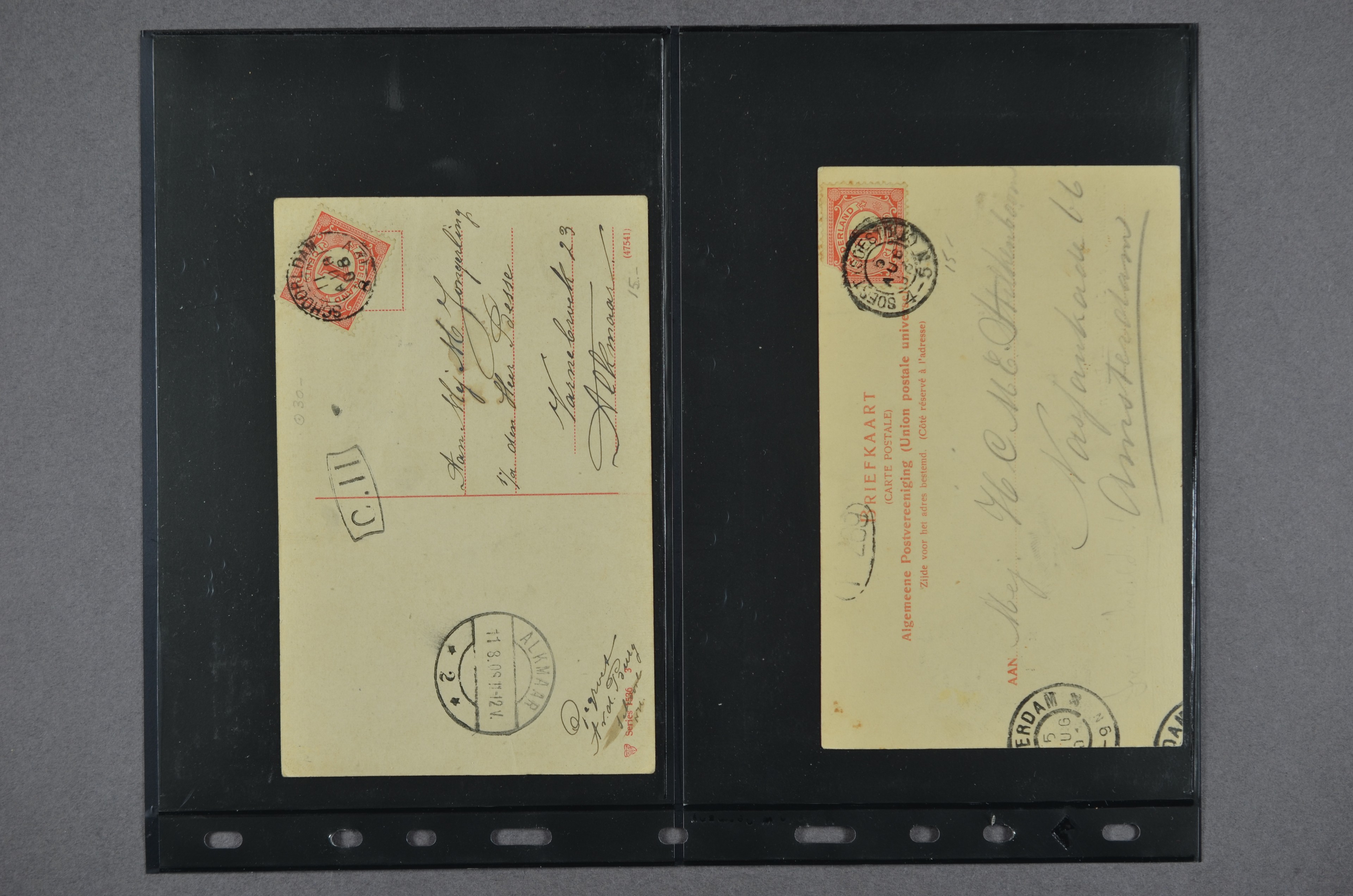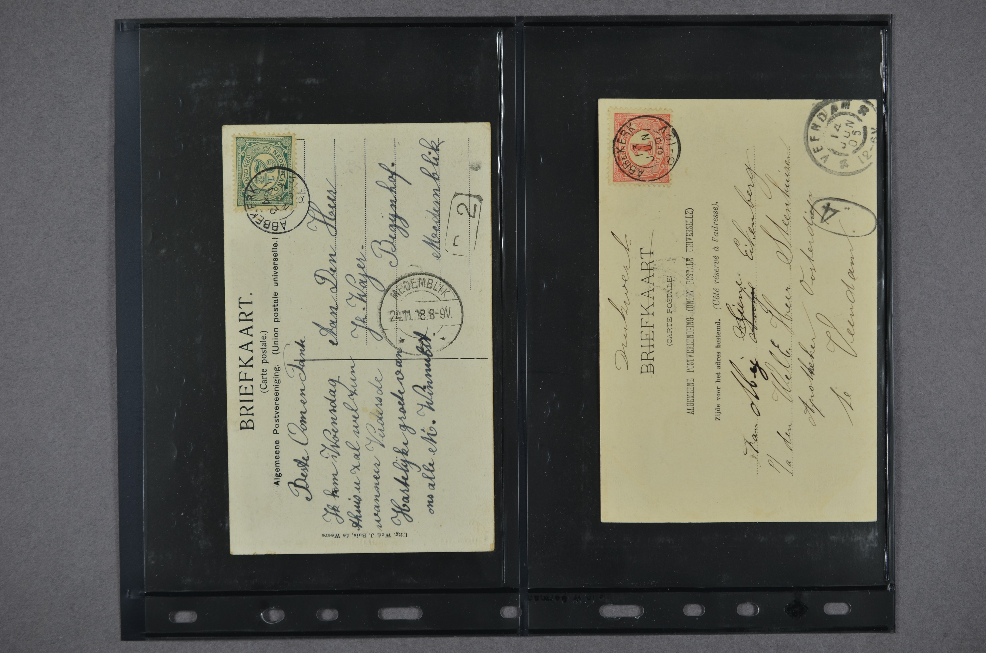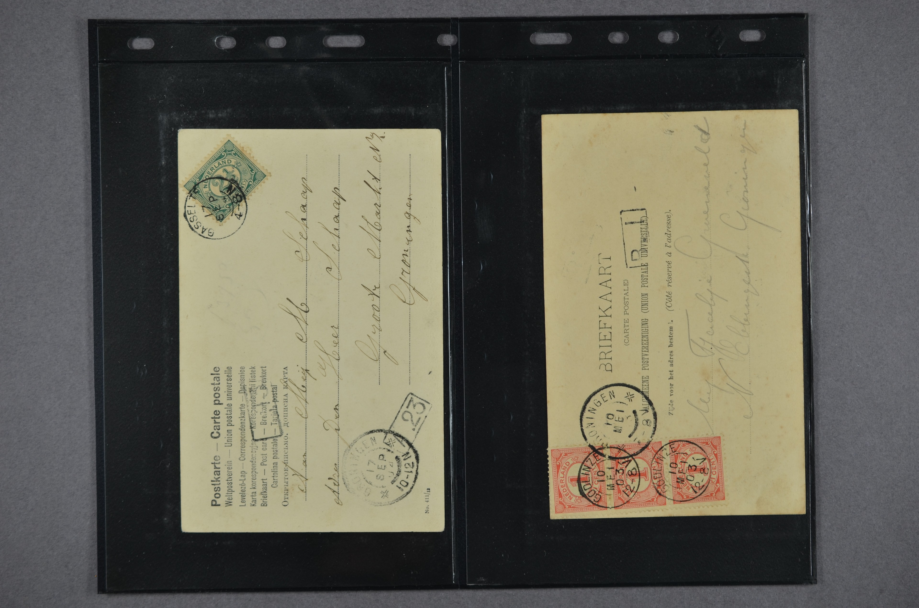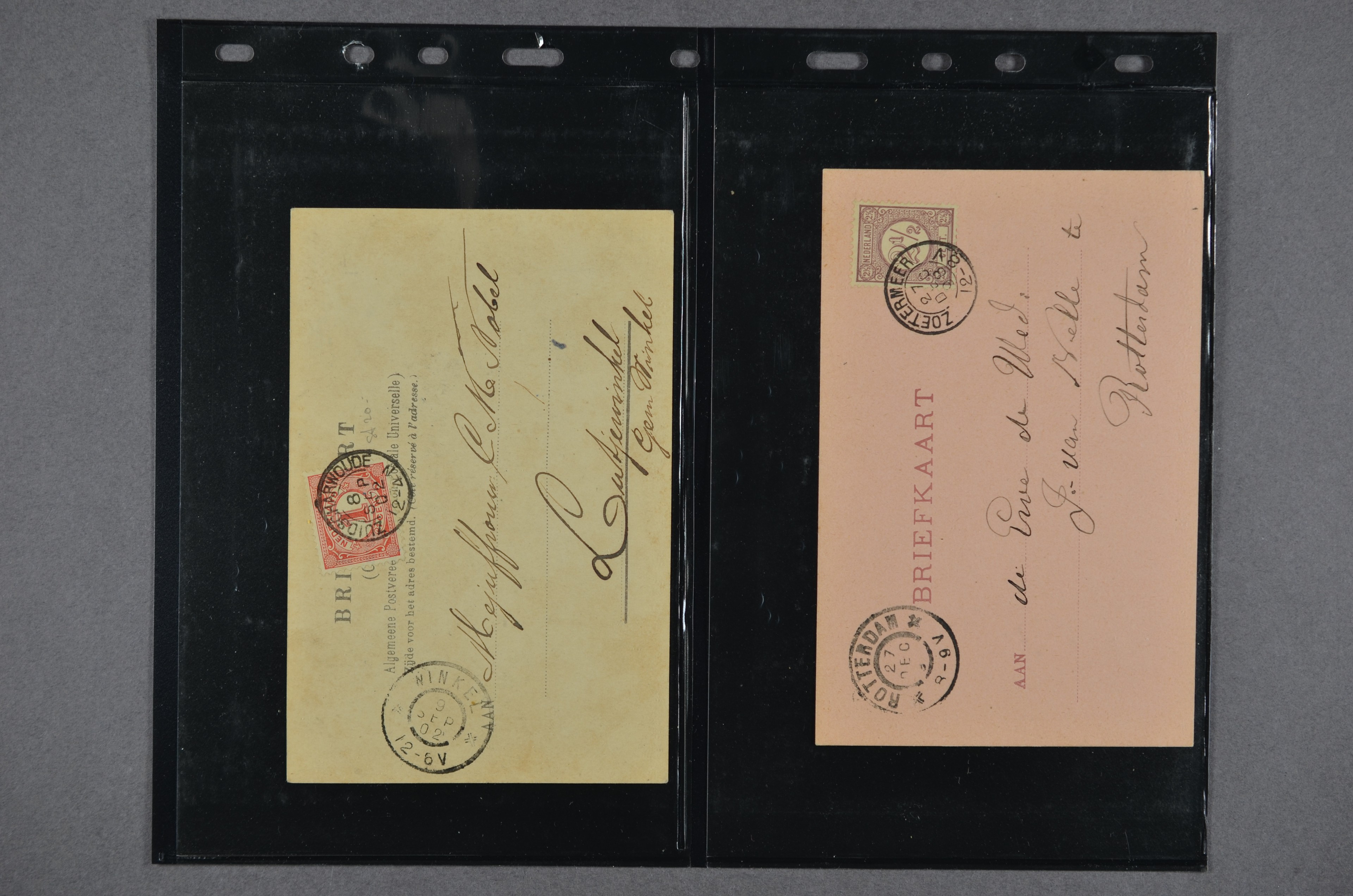 KLEINROND OP POSTSTUK, collectie van ruim 450 poststukken w.o. veel prentbriefkaarten, allemaal met kleinrondstempels van post-, hulppost- (merendeels) en bijpostkantoren, ook van spoorwegtrajecten, stations, Kamp bij Rijen (meerdere ex.), Amsterdam E, diverse schaarse stempels, enige doubletten, veel prachtige afstempelingen, enkele in blauw of violet, in 2 Leuchtturm-ringbanden. Prachtobject voor de handel of verzamelaar om op te zetten
