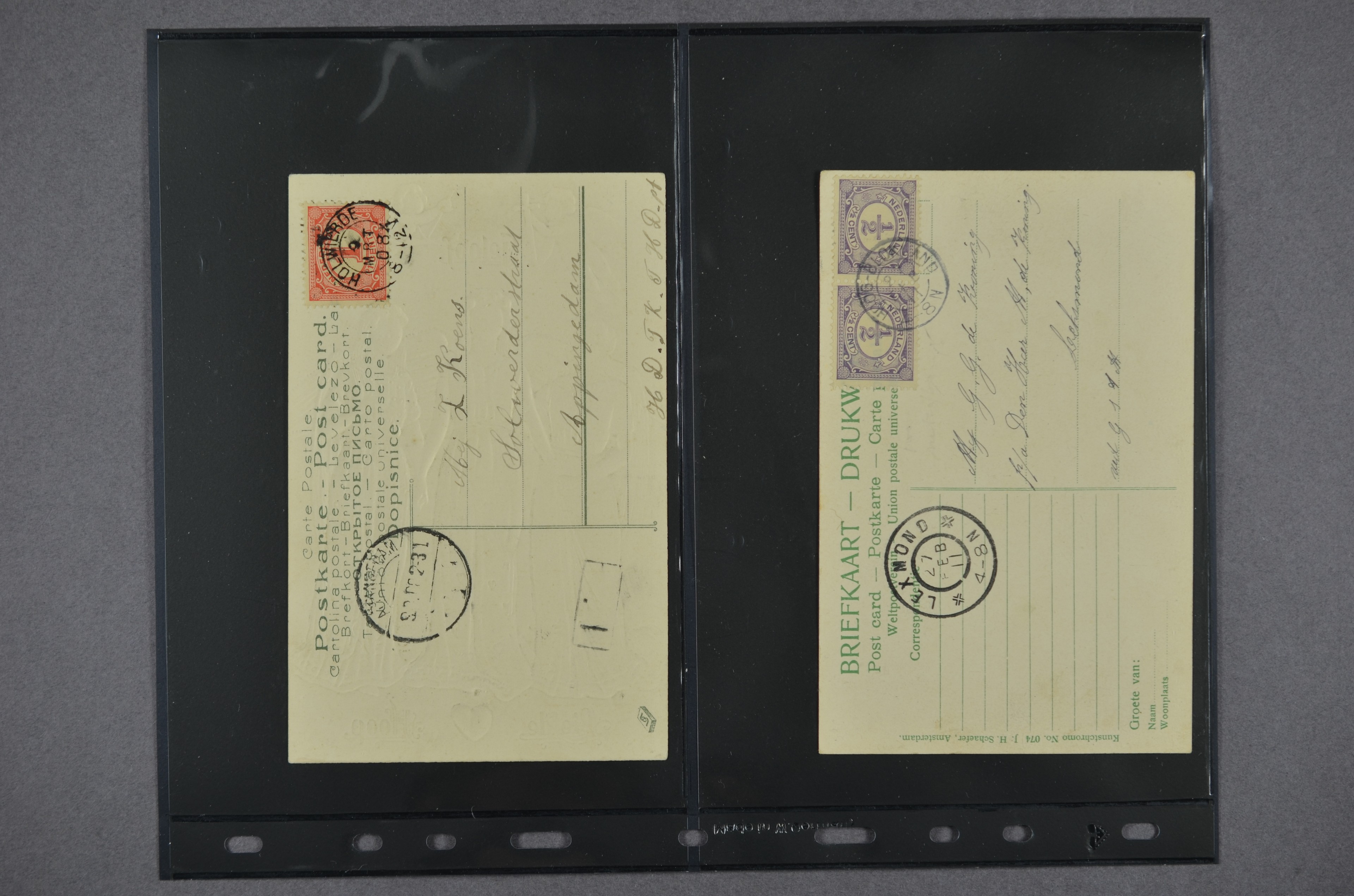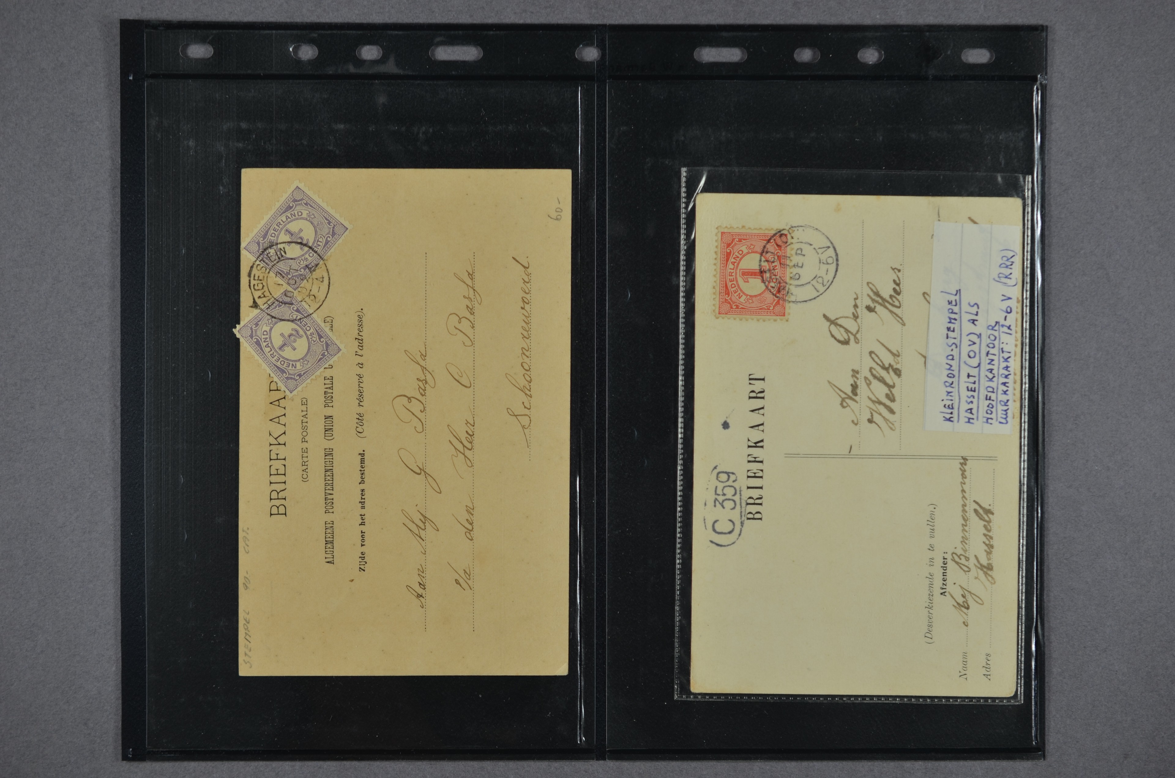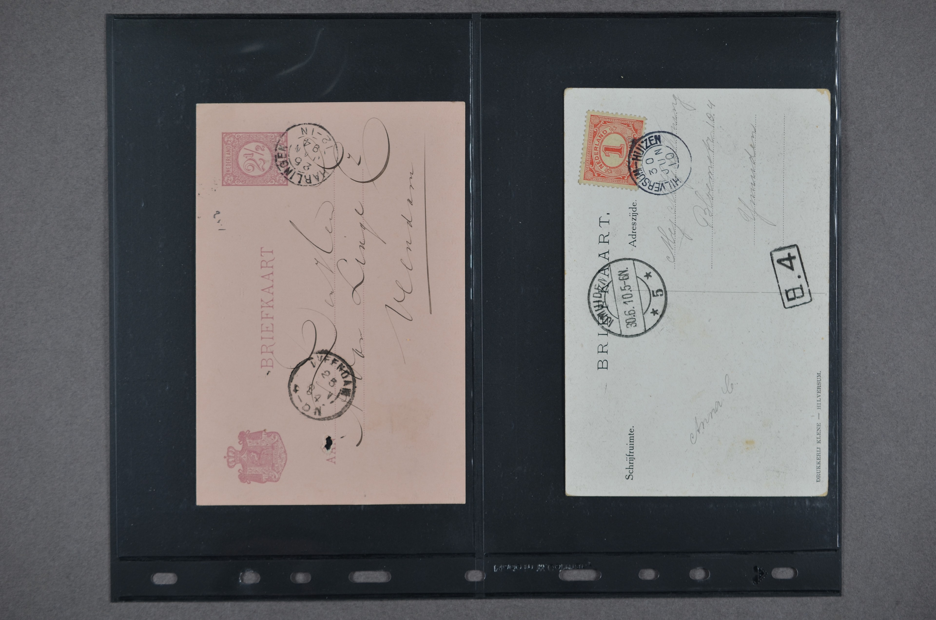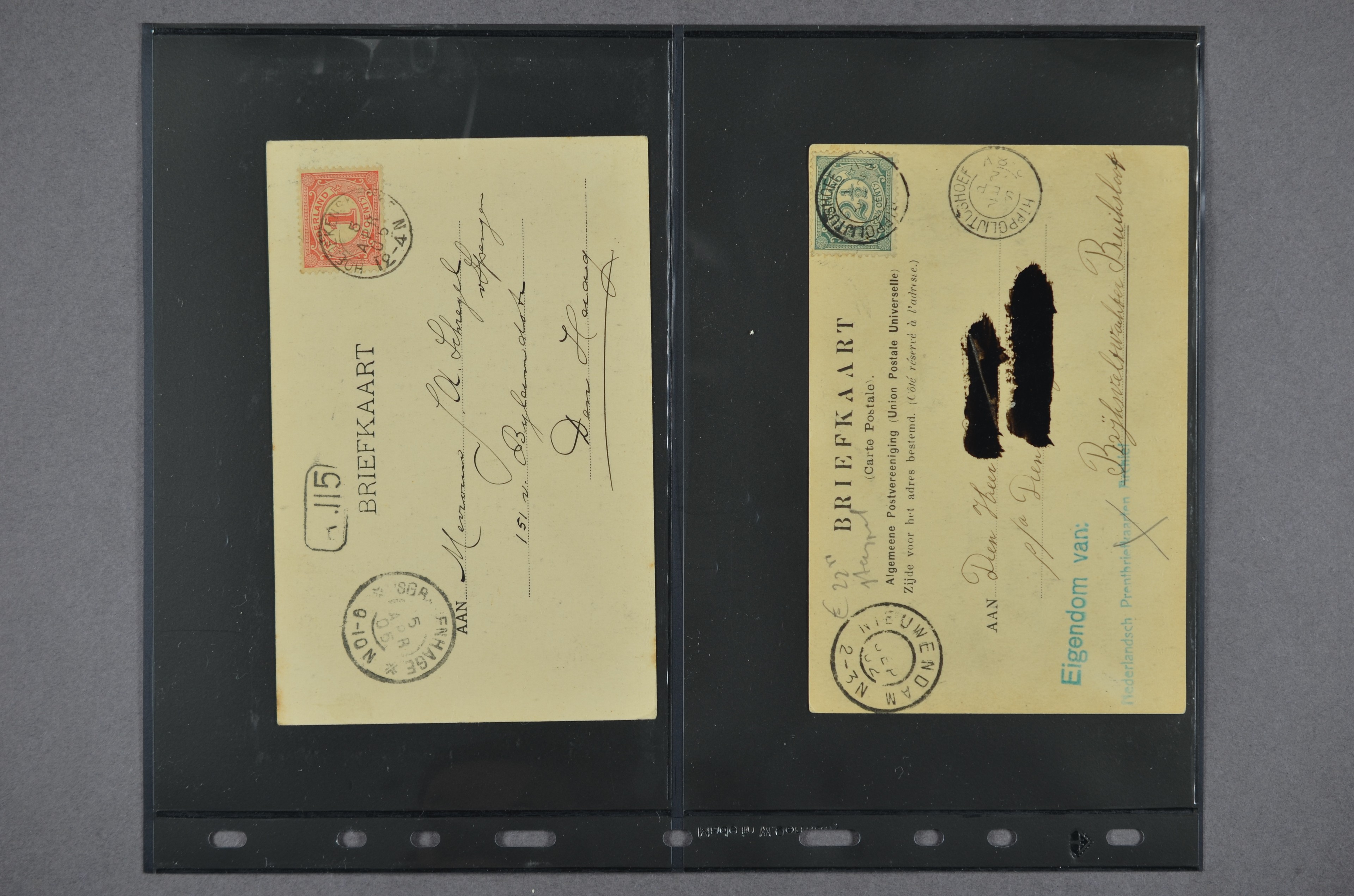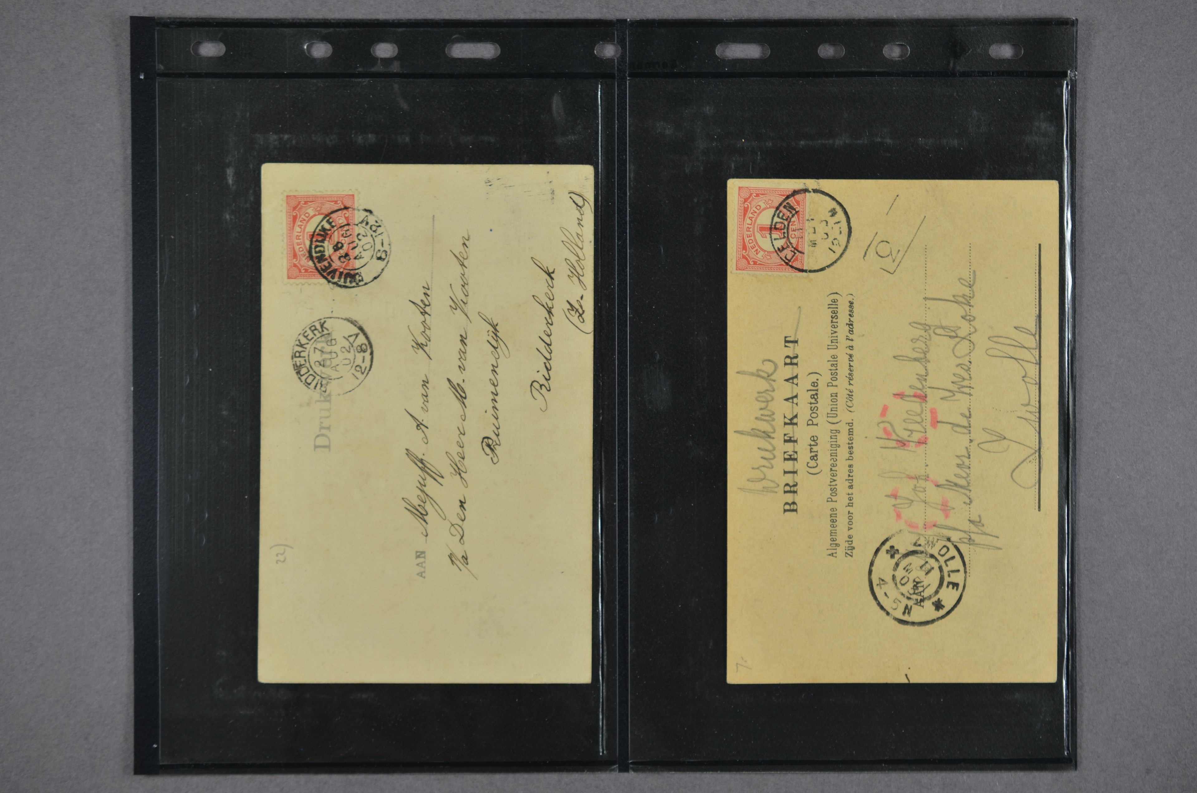 KLEINROND OP POSTSTUK, collectie van ruim 450 poststukken w.o. veel prentbriefkaarten, allemaal met kleinrondstempels van post-, hulppost- (merendeels) en bijpostkantoren, ook van spoorwegtrajecten, stations, Kamp bij Rijen (meerdere ex.), Amsterdam E, diverse schaarse stempels, enige doubletten, veel prachtige afstempelingen, enkele in blauw of violet, in 2 Leuchtturm-ringbanden. Prachtobject voor de handel of verzamelaar om op te zetten