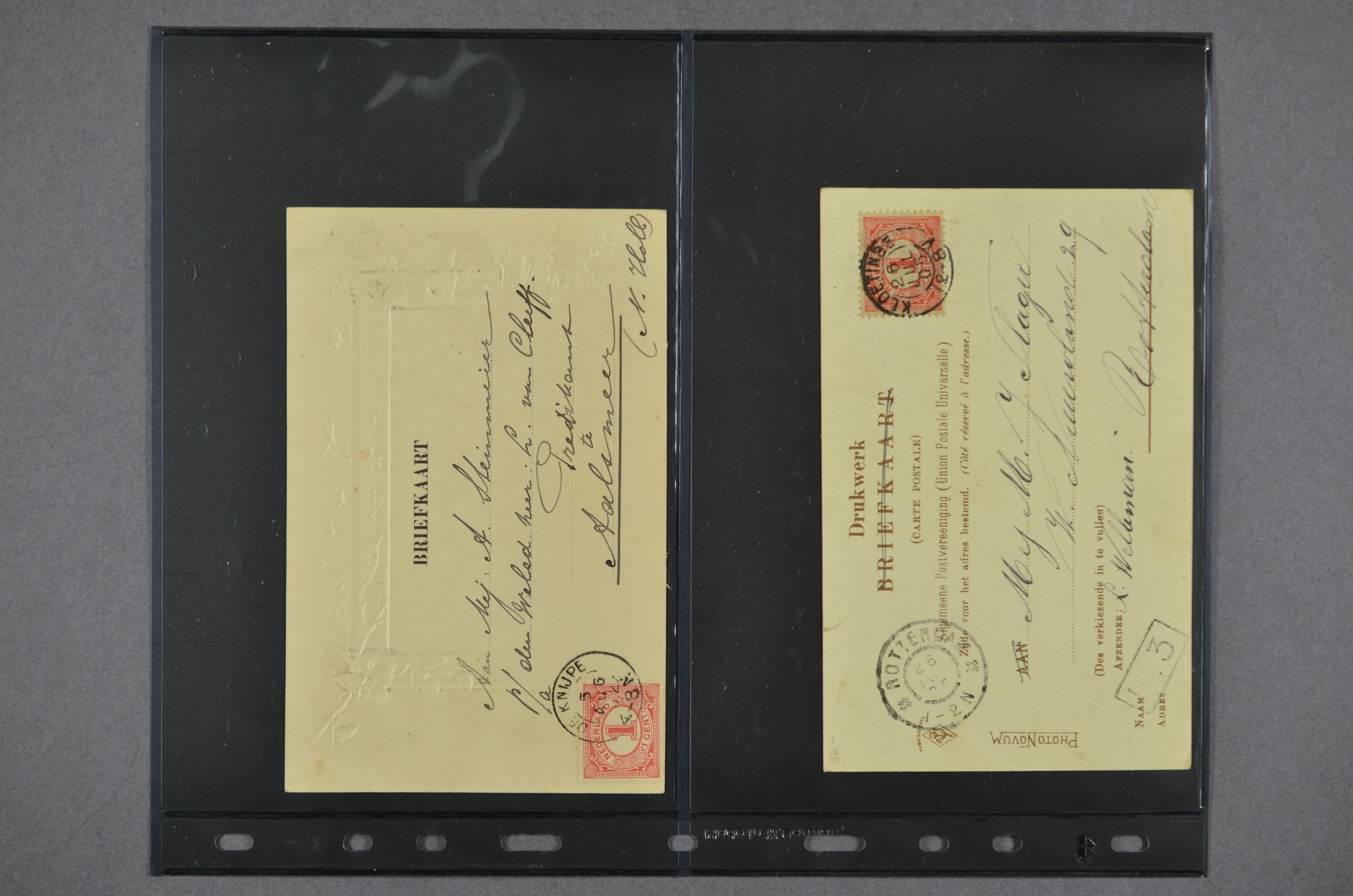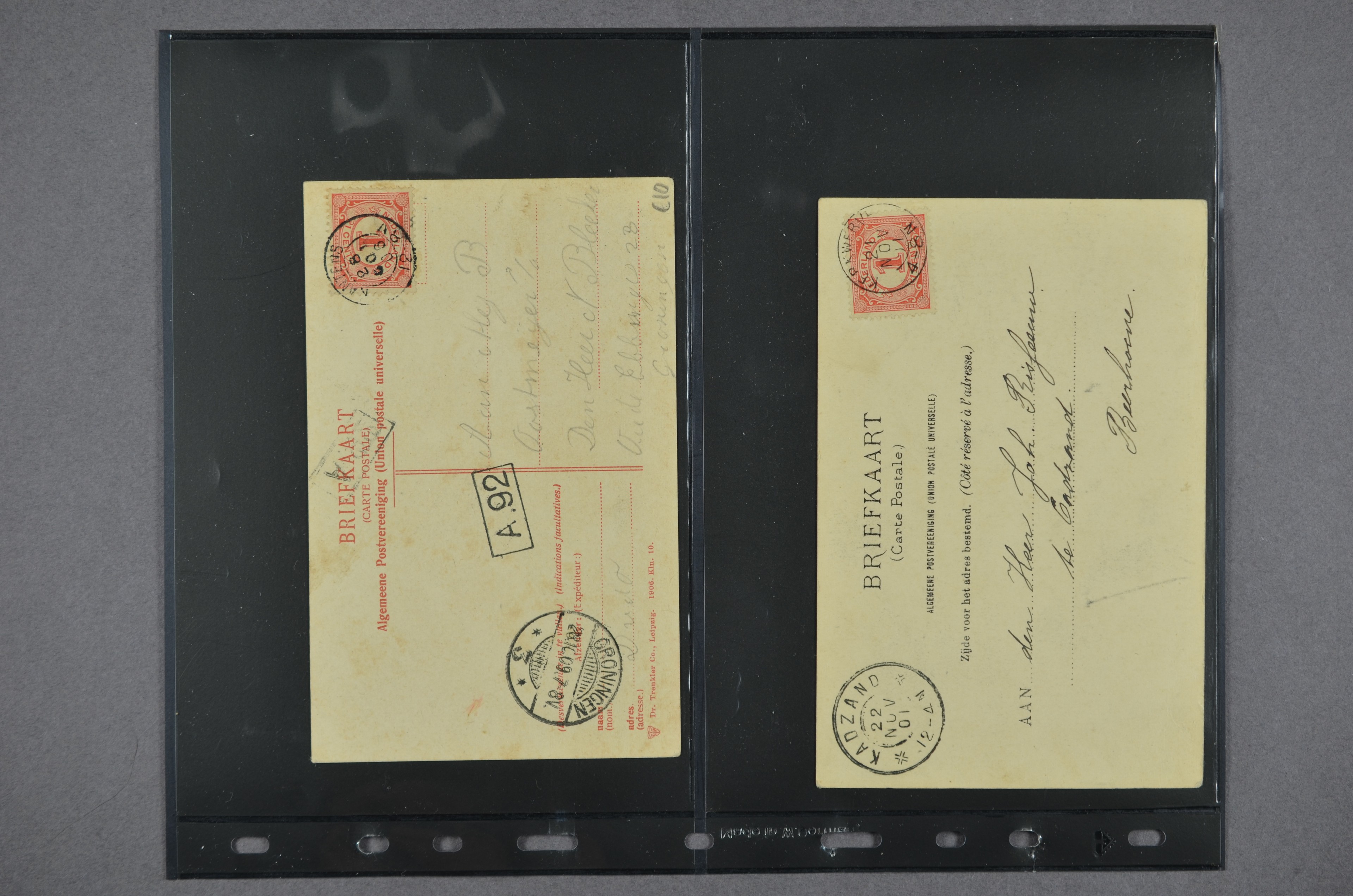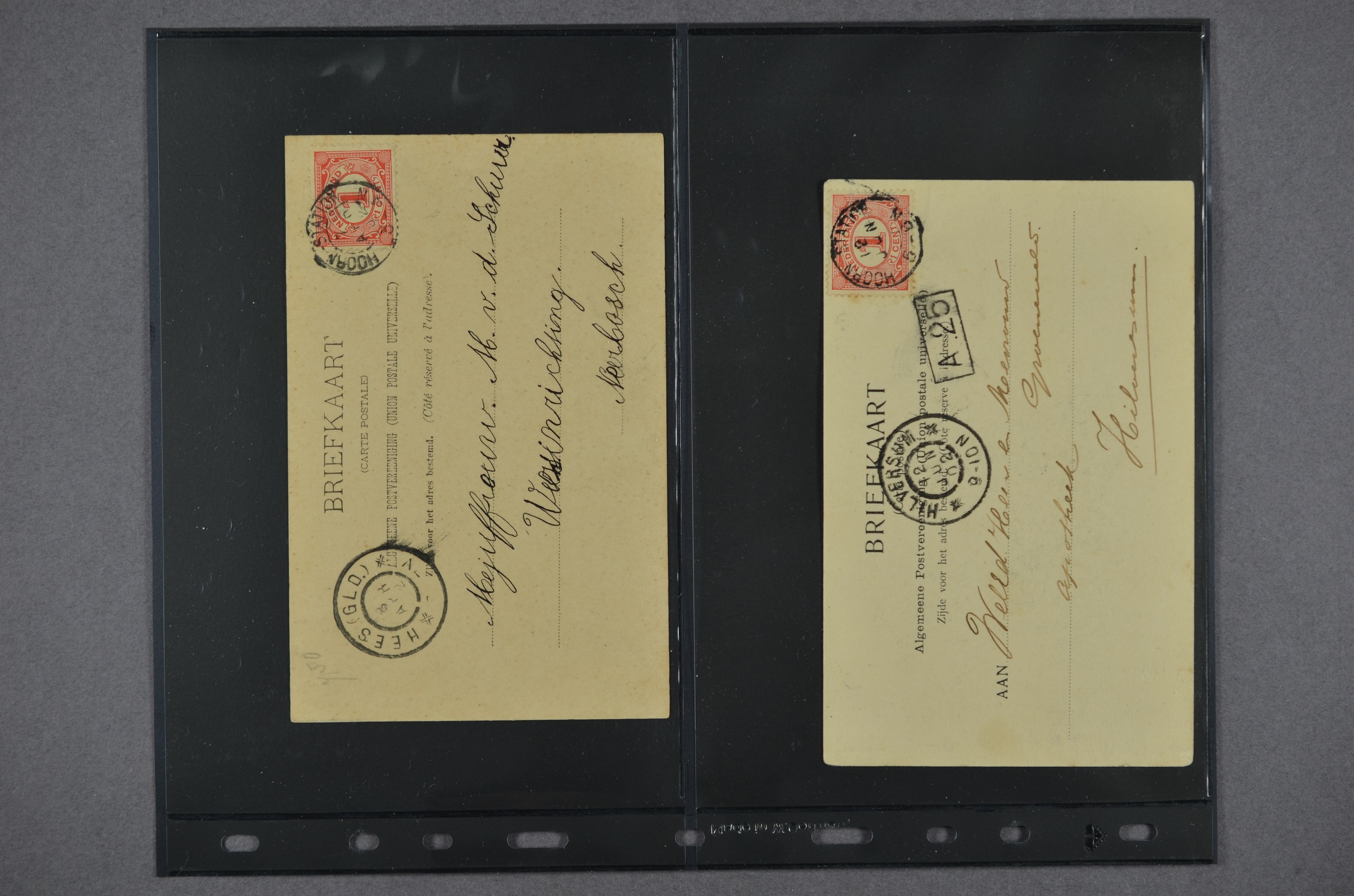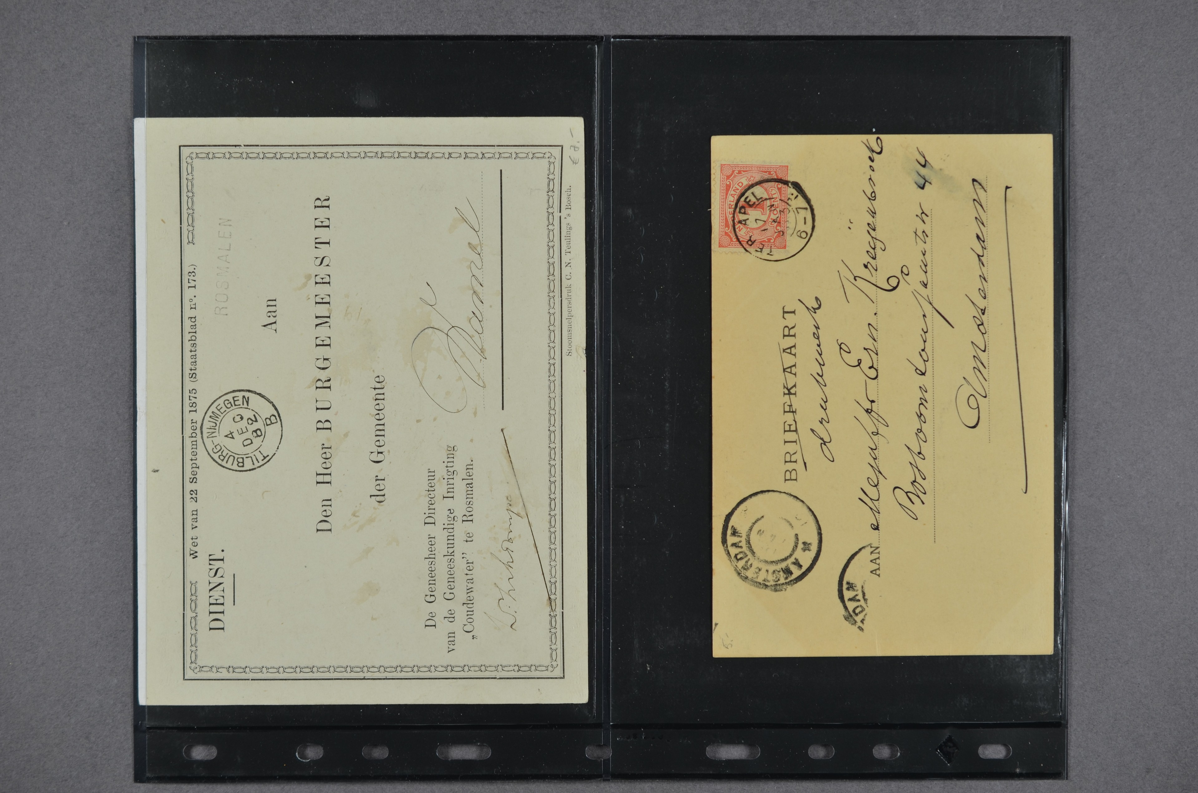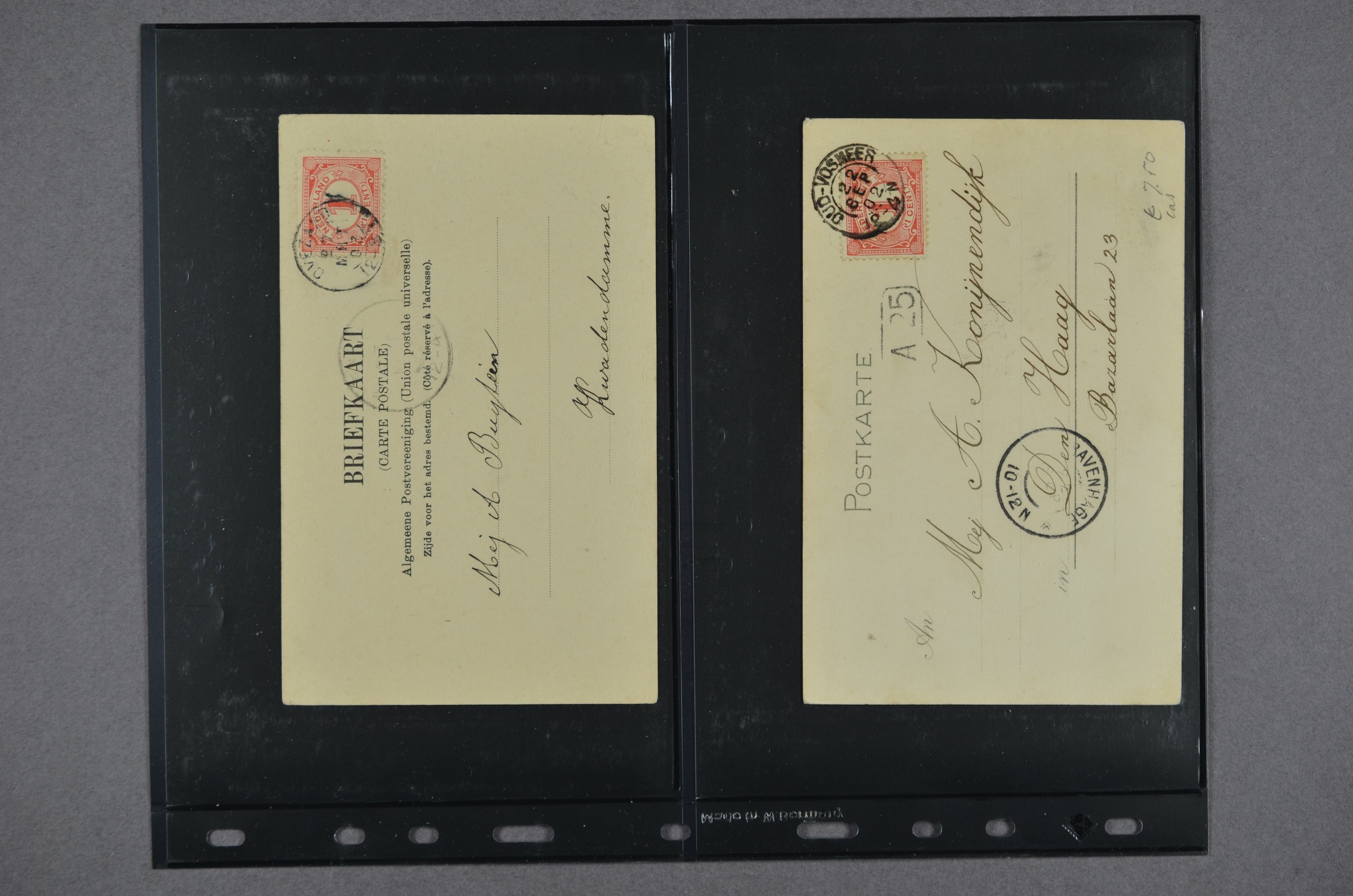 KLEINROND OP POSTSTUK, collectie van ruim 450 poststukken w.o. veel prentbriefkaarten, allemaal met kleinrondstempels van post-, hulppost- (merendeels) en bijpostkantoren, ook van spoorwegtrajecten, stations, Kamp bij Rijen (meerdere ex.), Amsterdam E, diverse schaarse stempels, enige doubletten, veel prachtige afstempelingen, enkele in blauw of violet, in 2 Leuchtturm-ringbanden. Prachtobject voor de handel of verzamelaar om op te zetten