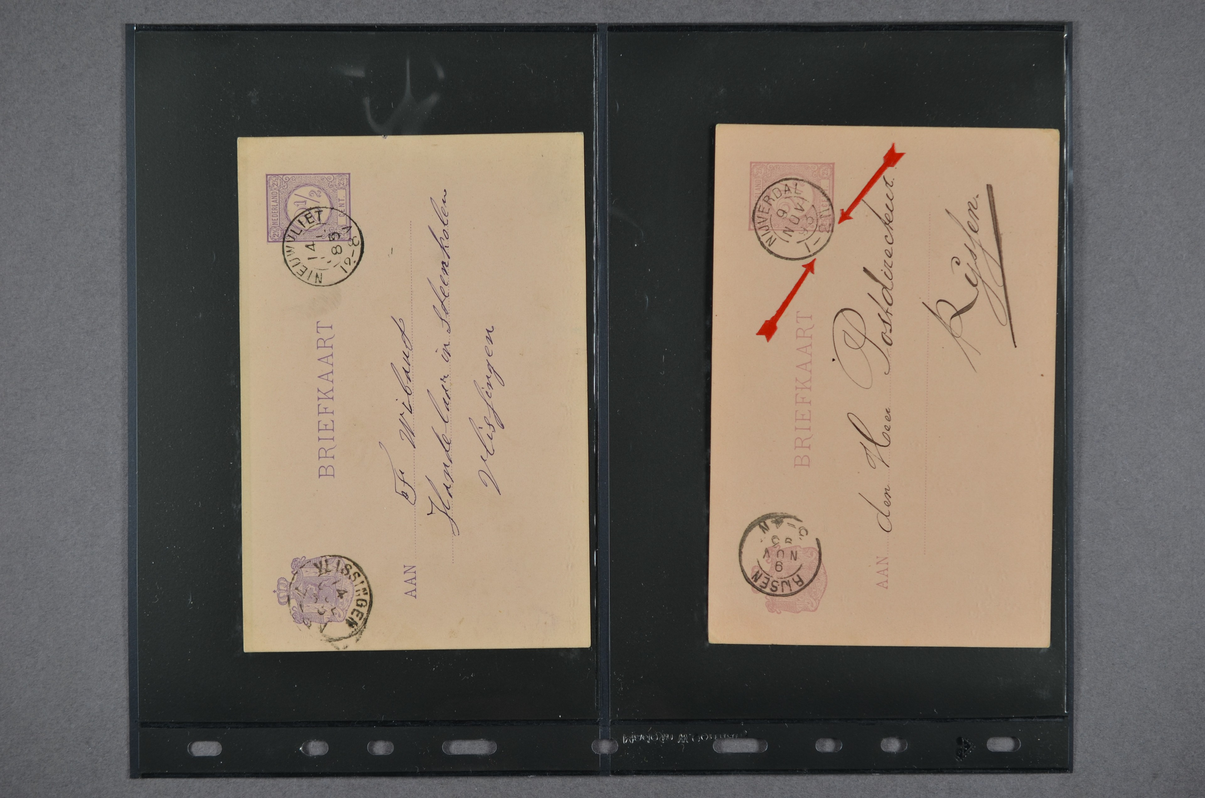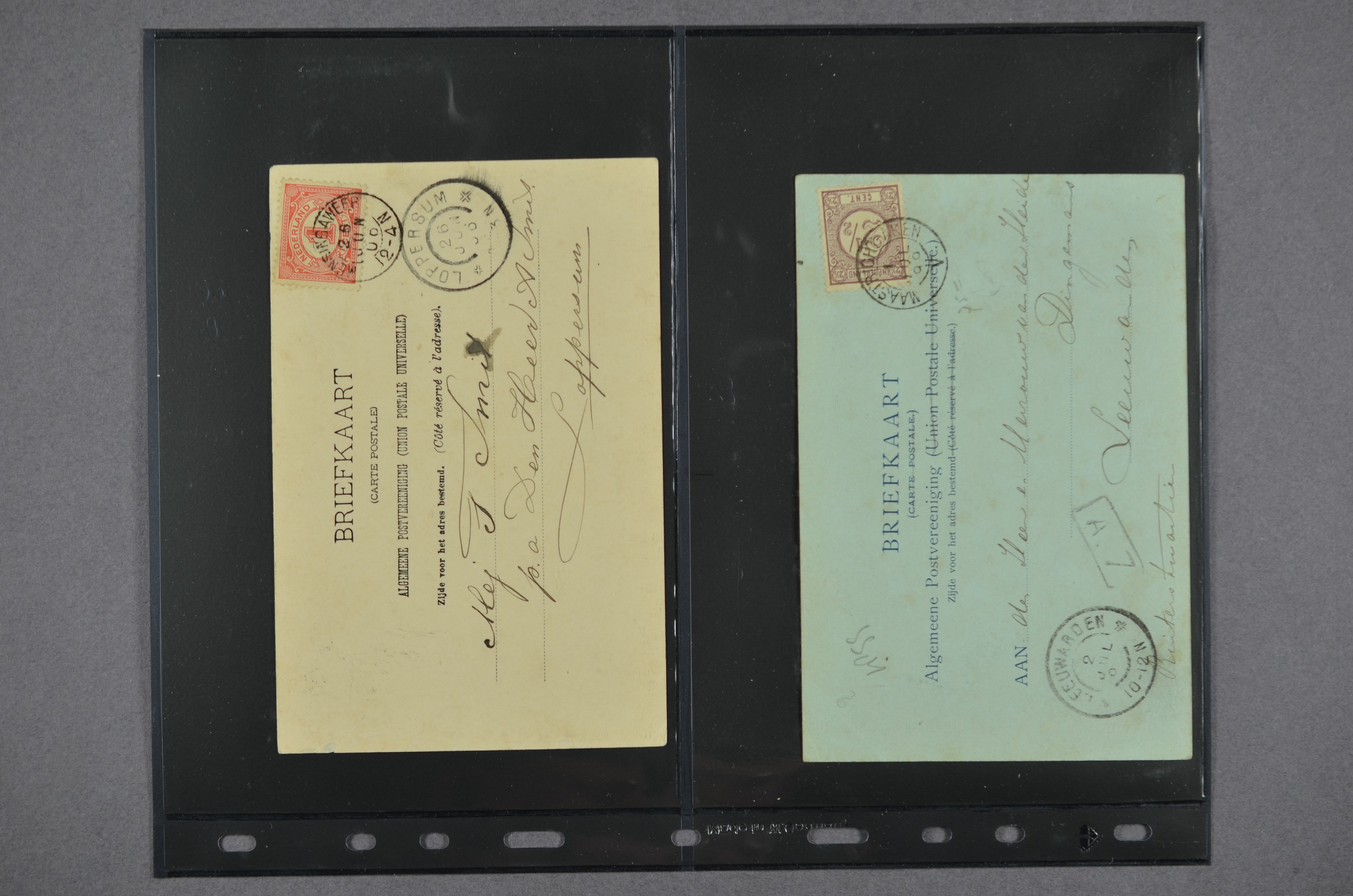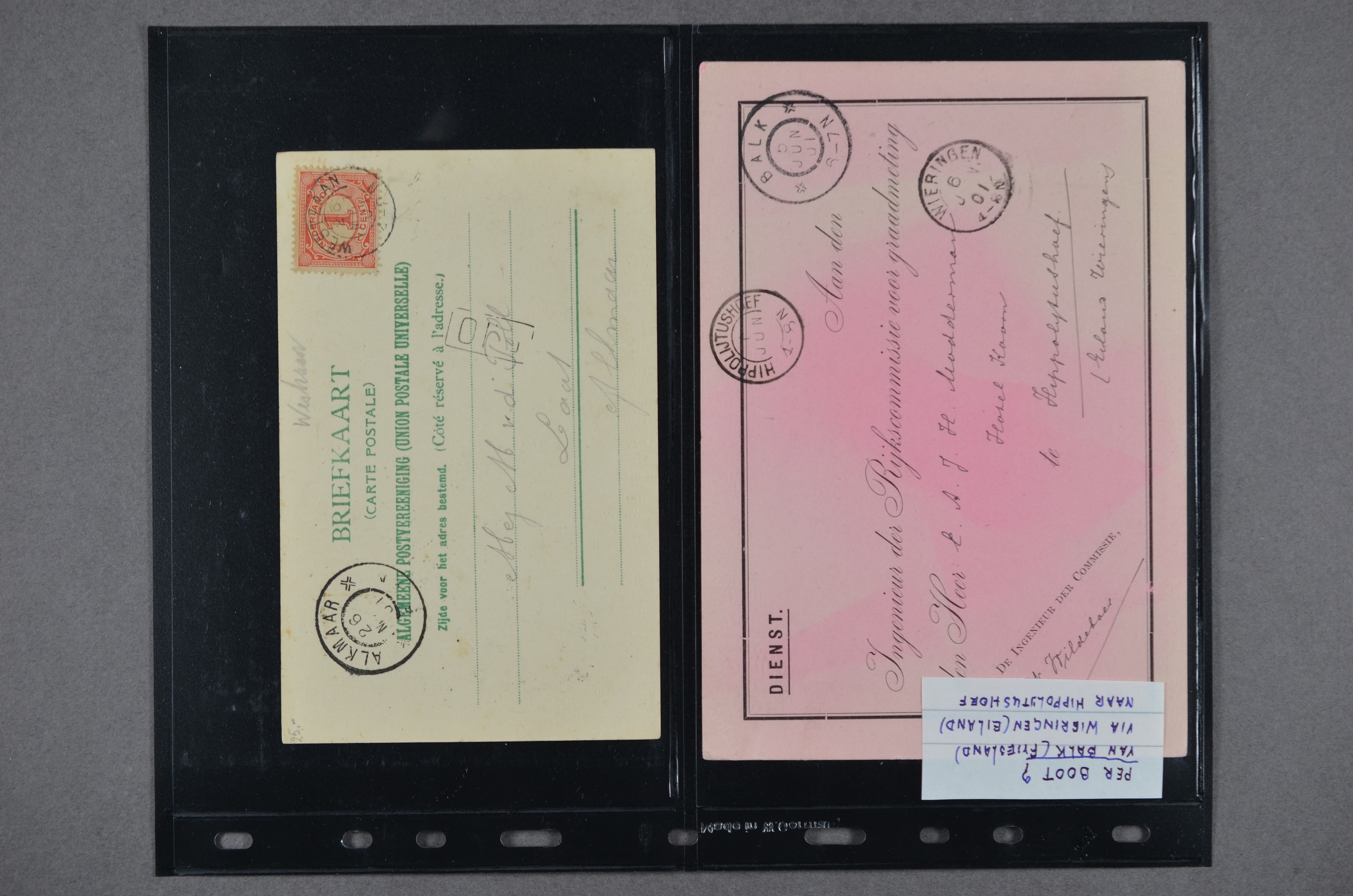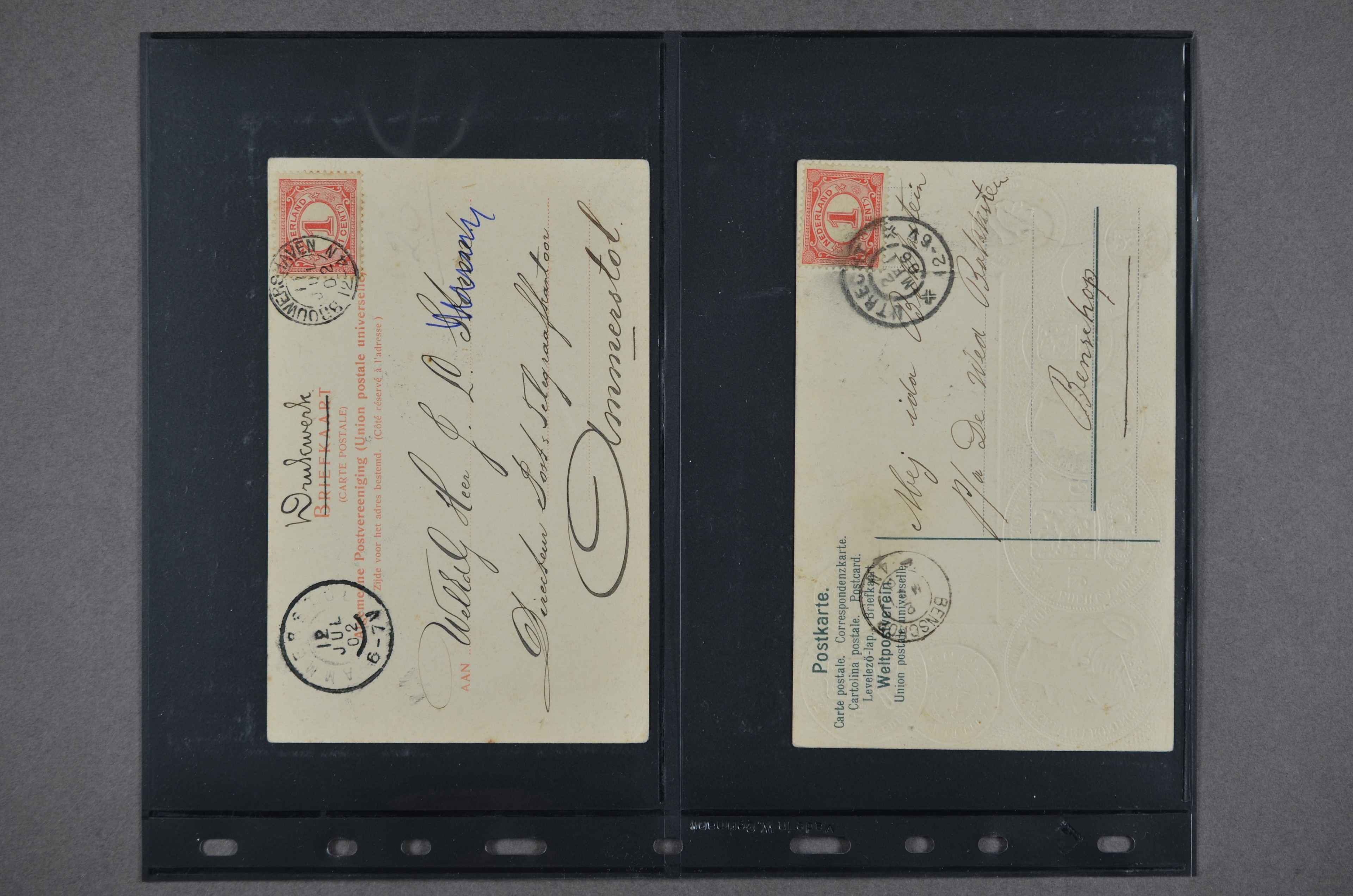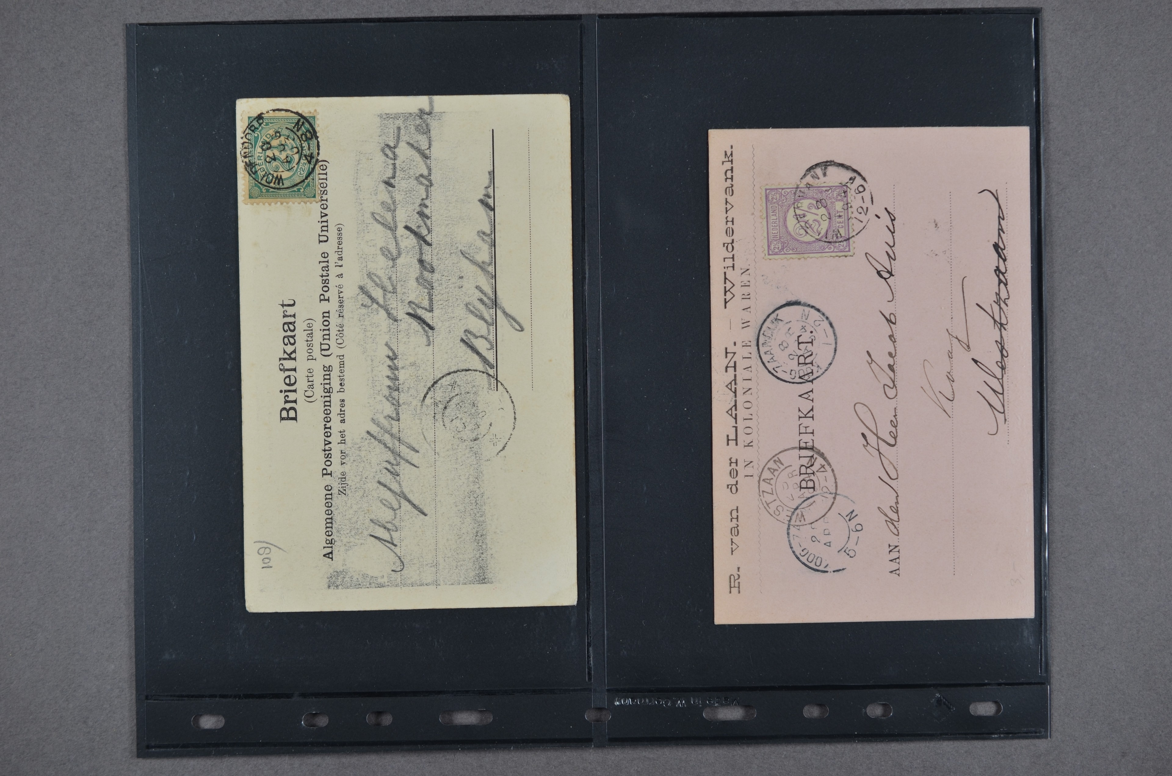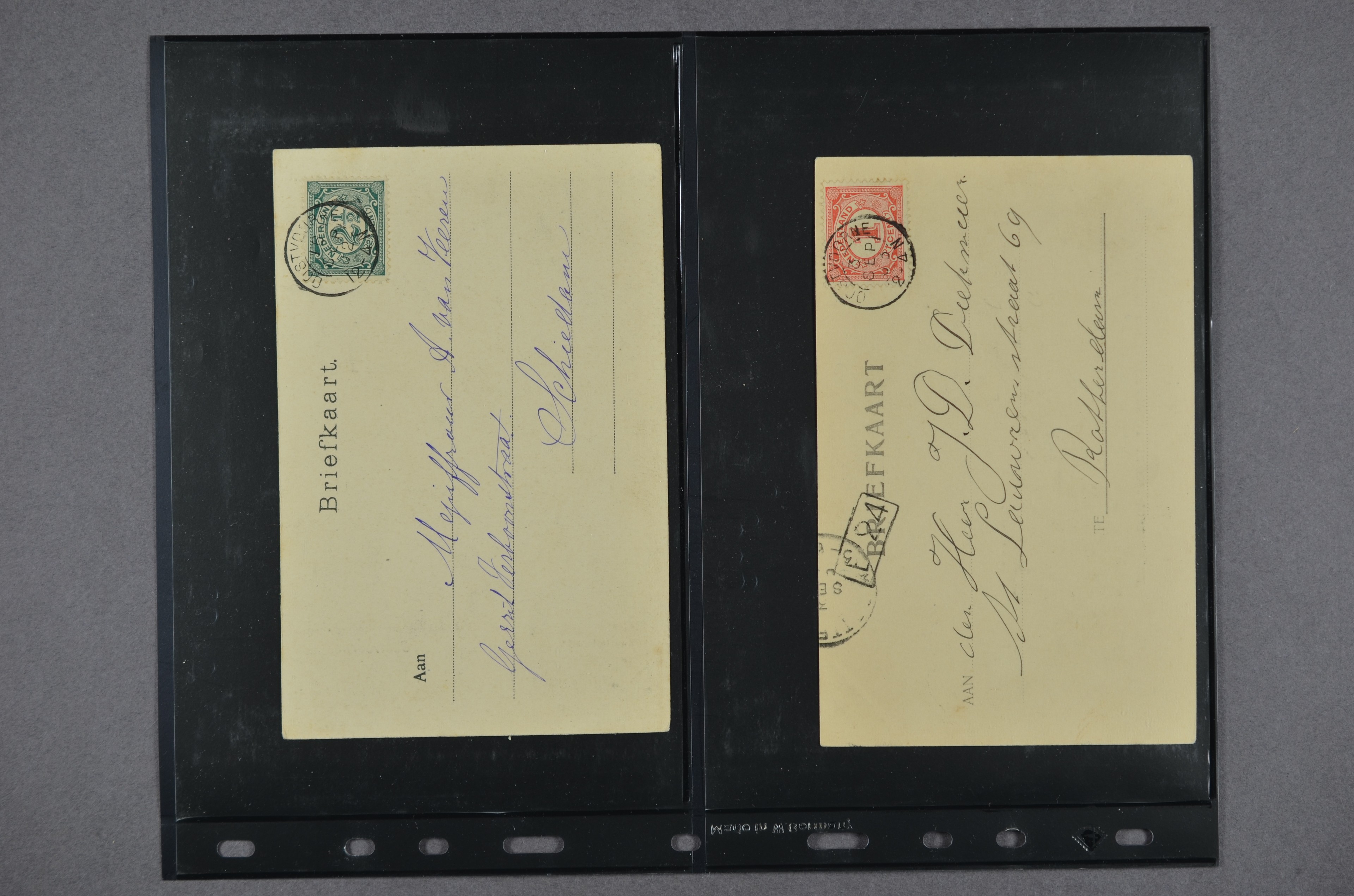 KLEINROND OP POSTSTUK, collectie van ruim 450 poststukken w.o. veel prentbriefkaarten, allemaal met kleinrondstempels van post-, hulppost- (merendeels) en bijpostkantoren, ook van spoorwegtrajecten, stations, Kamp bij Rijen (meerdere ex.), Amsterdam E, diverse schaarse stempels, enige doubletten, veel prachtige afstempelingen, enkele in blauw of violet, in 2 Leuchtturm-ringbanden. Prachtobject voor de handel of verzamelaar om op te zetten