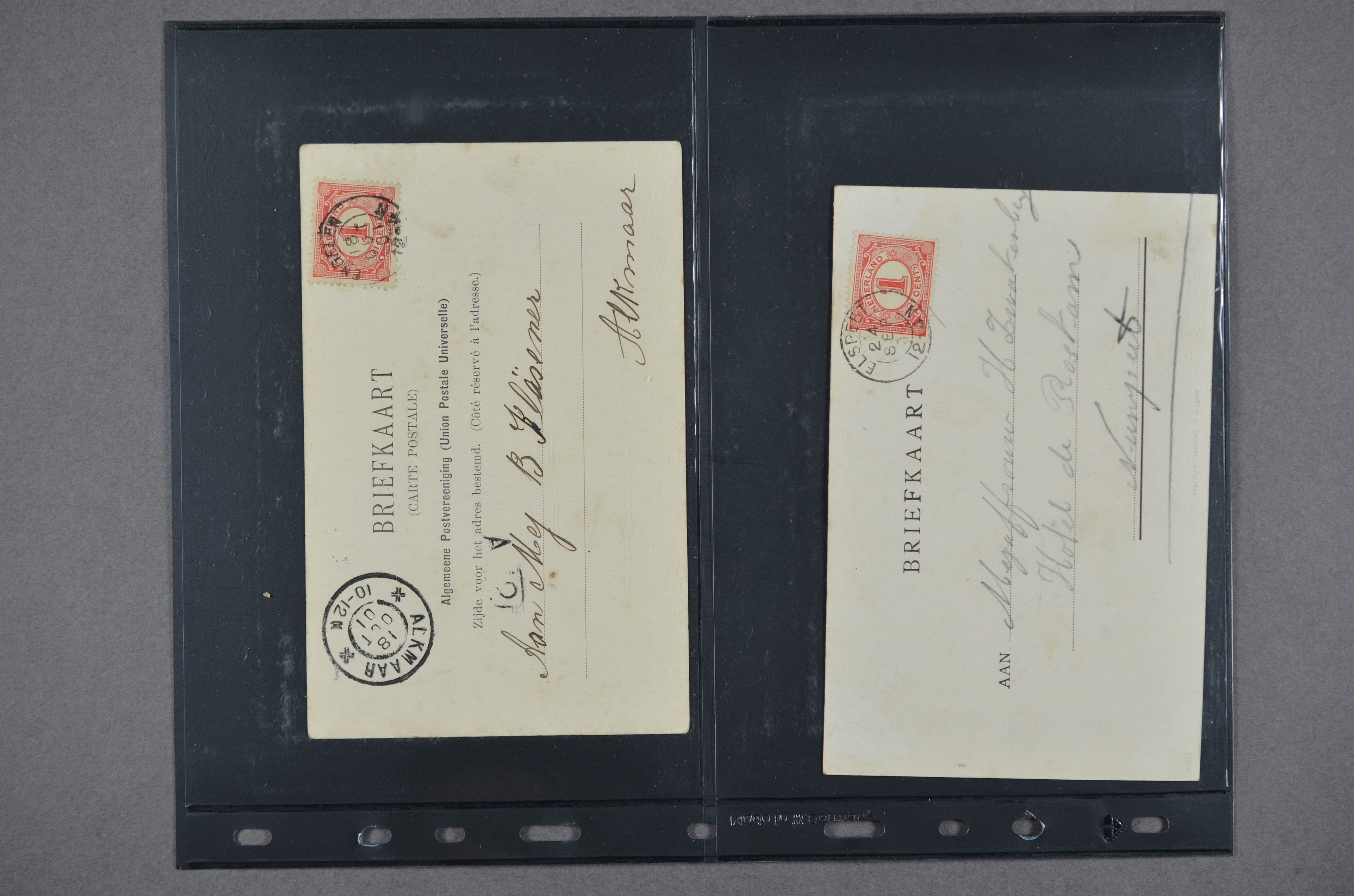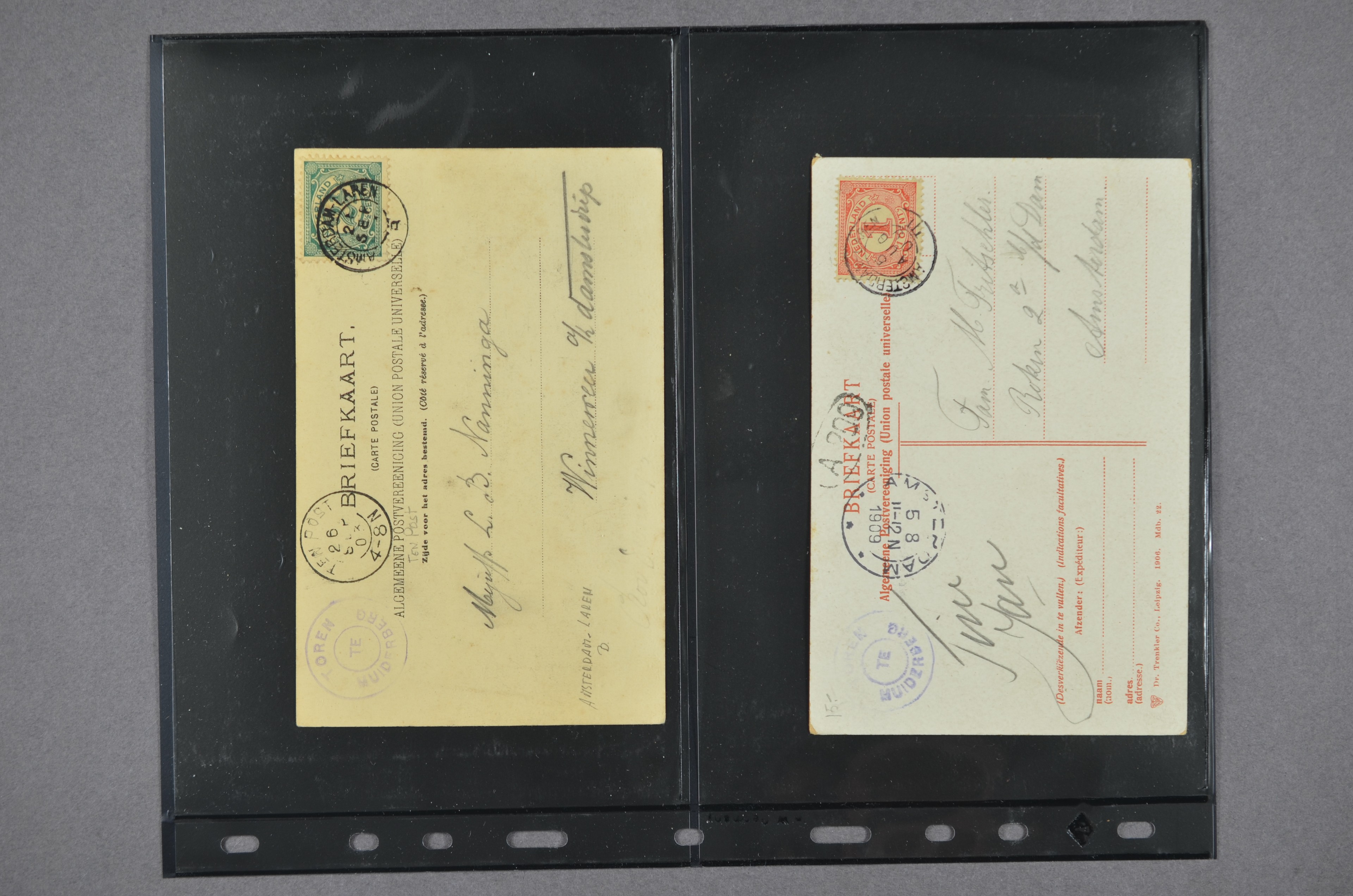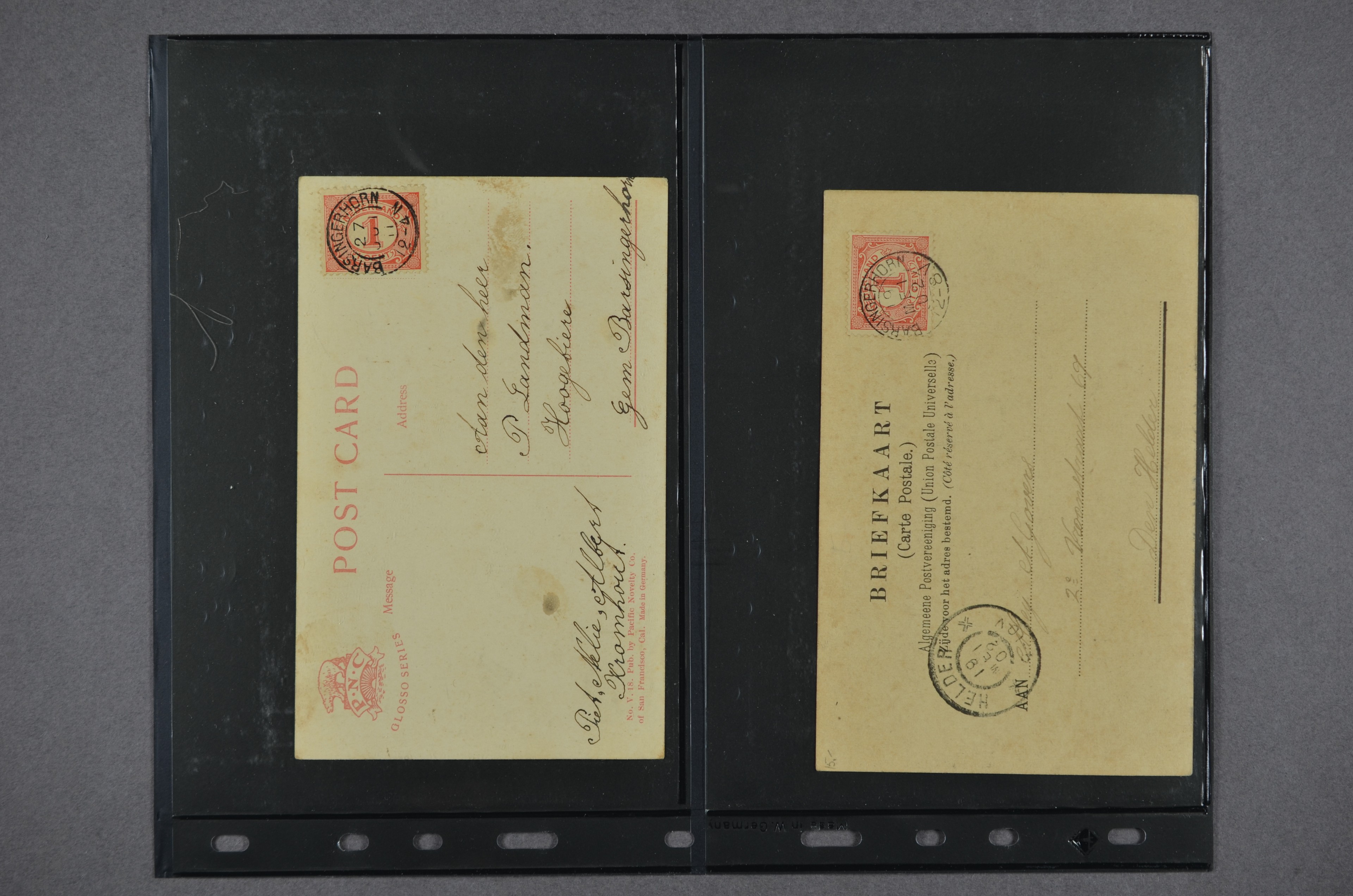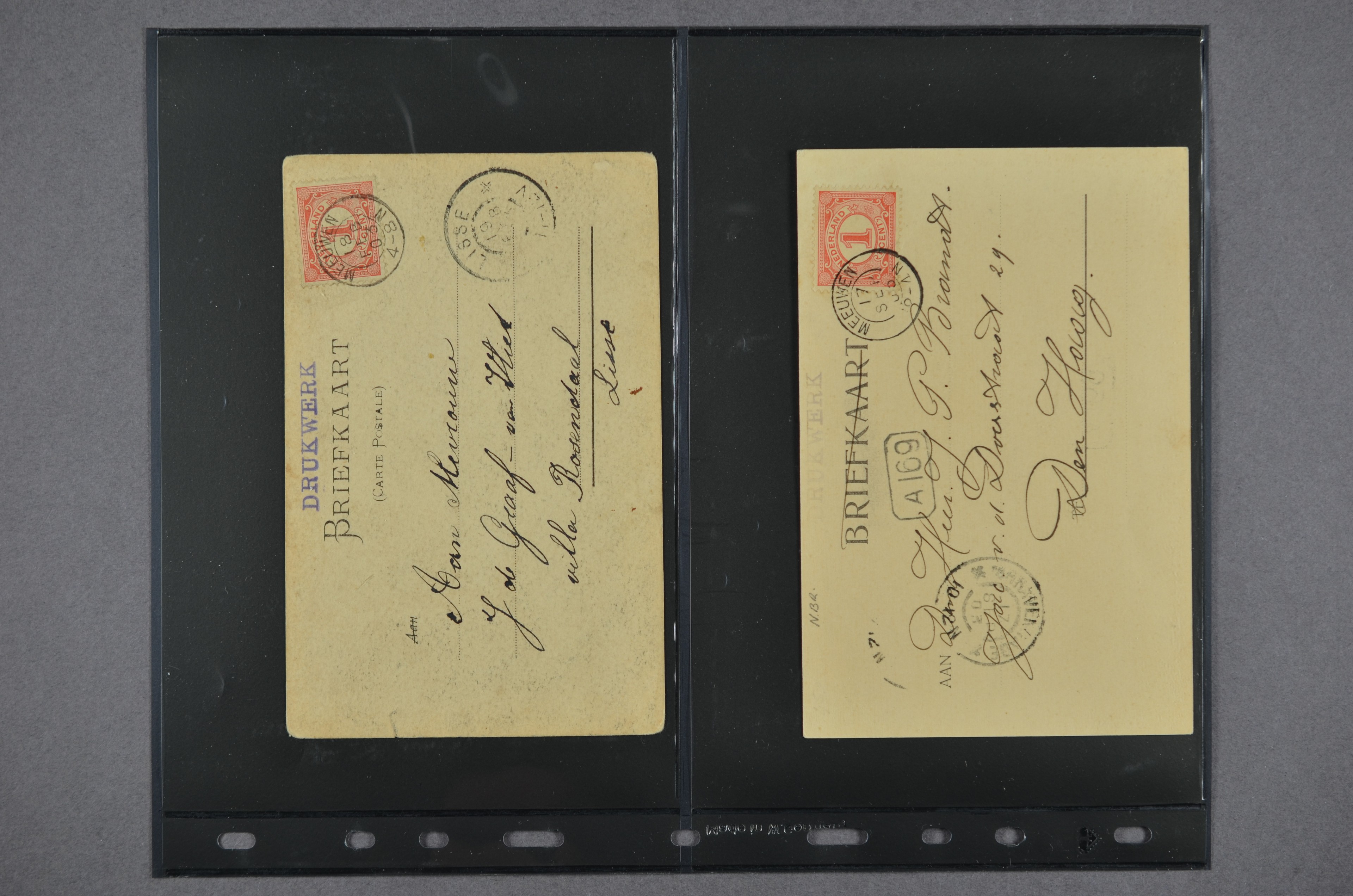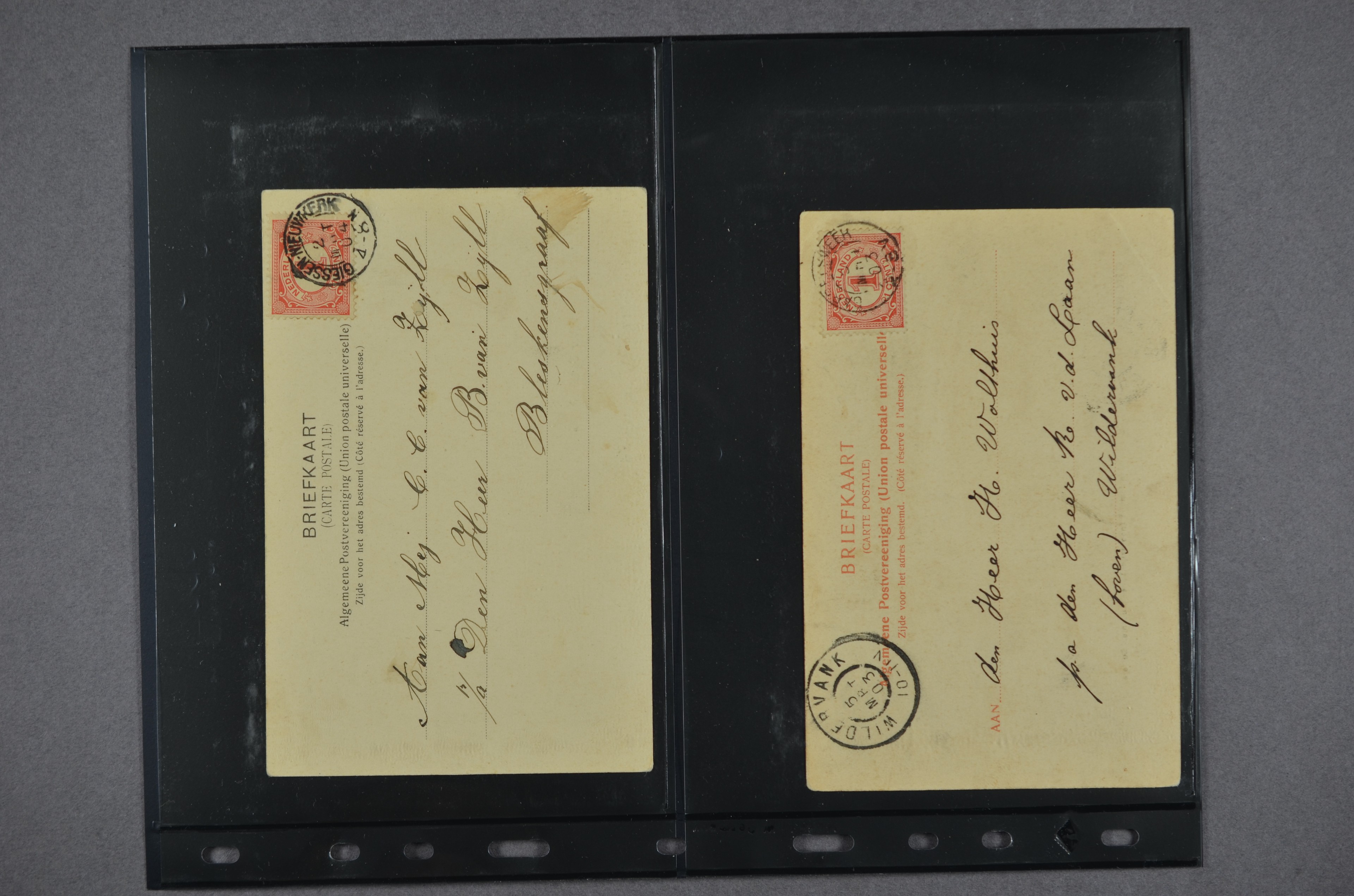 KLEINROND OP POSTSTUK, collectie van ruim 450 poststukken w.o. veel prentbriefkaarten, allemaal met kleinrondstempels van post-, hulppost- (merendeels) en bijpostkantoren, ook van spoorwegtrajecten, stations, Kamp bij Rijen (meerdere ex.), Amsterdam E, diverse schaarse stempels, enige doubletten, veel prachtige afstempelingen, enkele in blauw of violet, in 2 Leuchtturm-ringbanden. Prachtobject voor de handel of verzamelaar om op te zetten