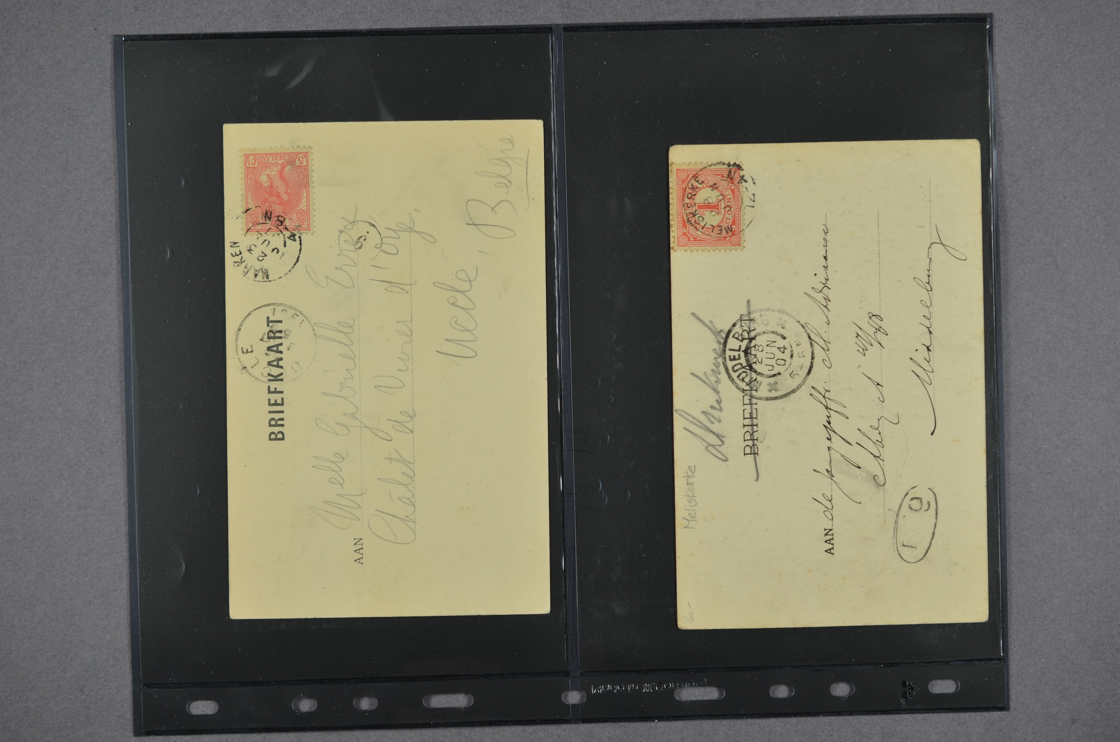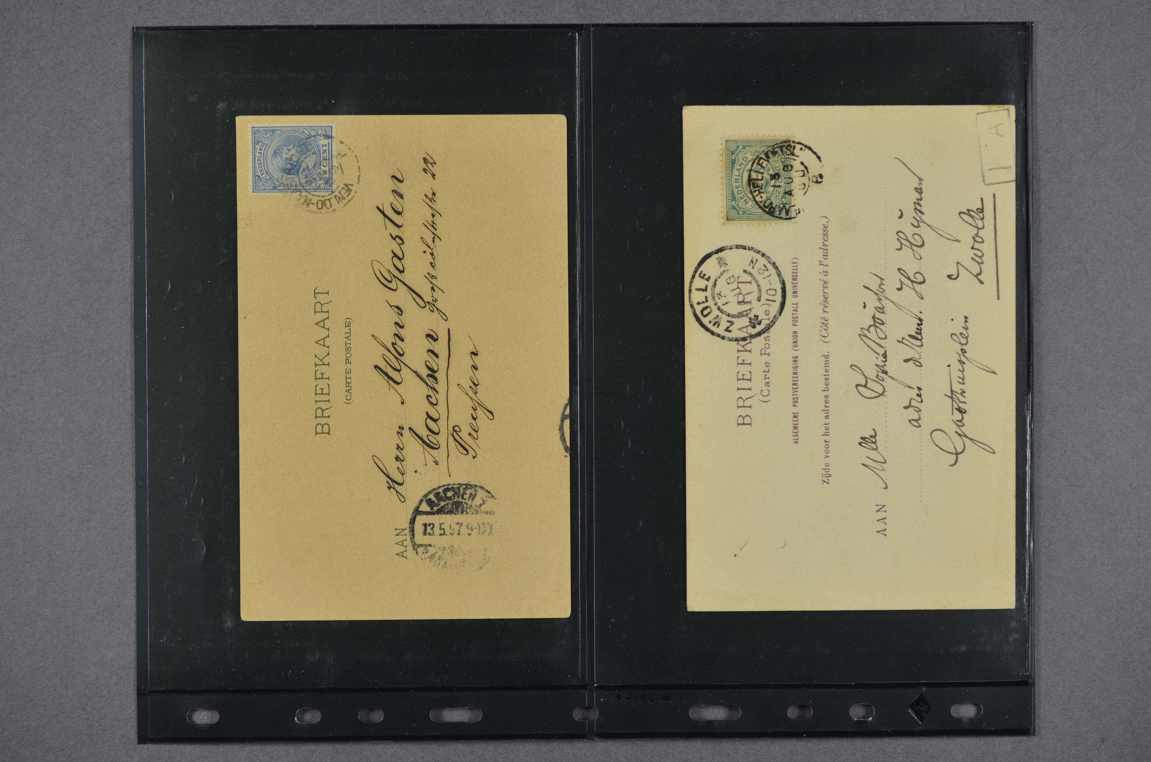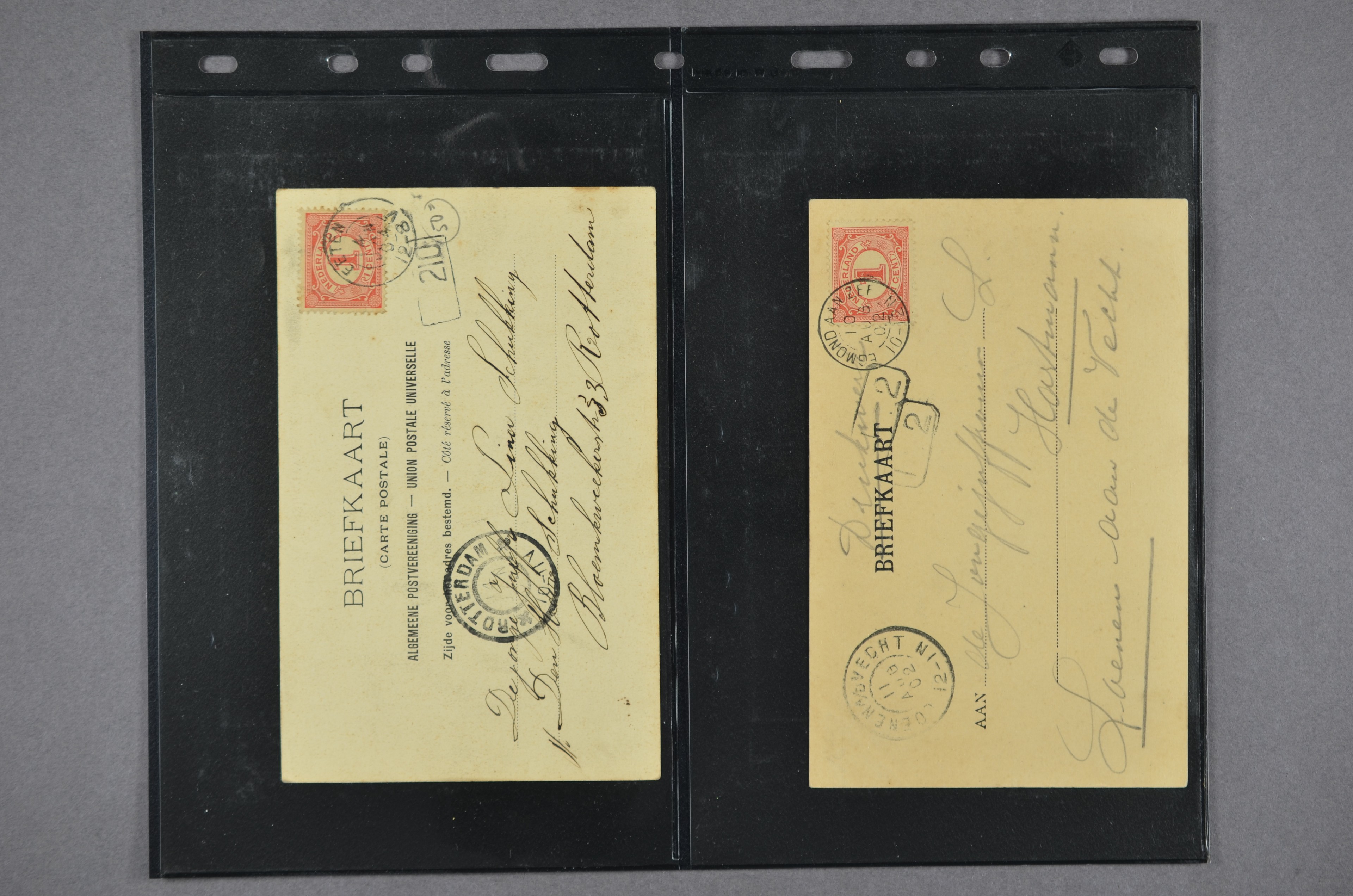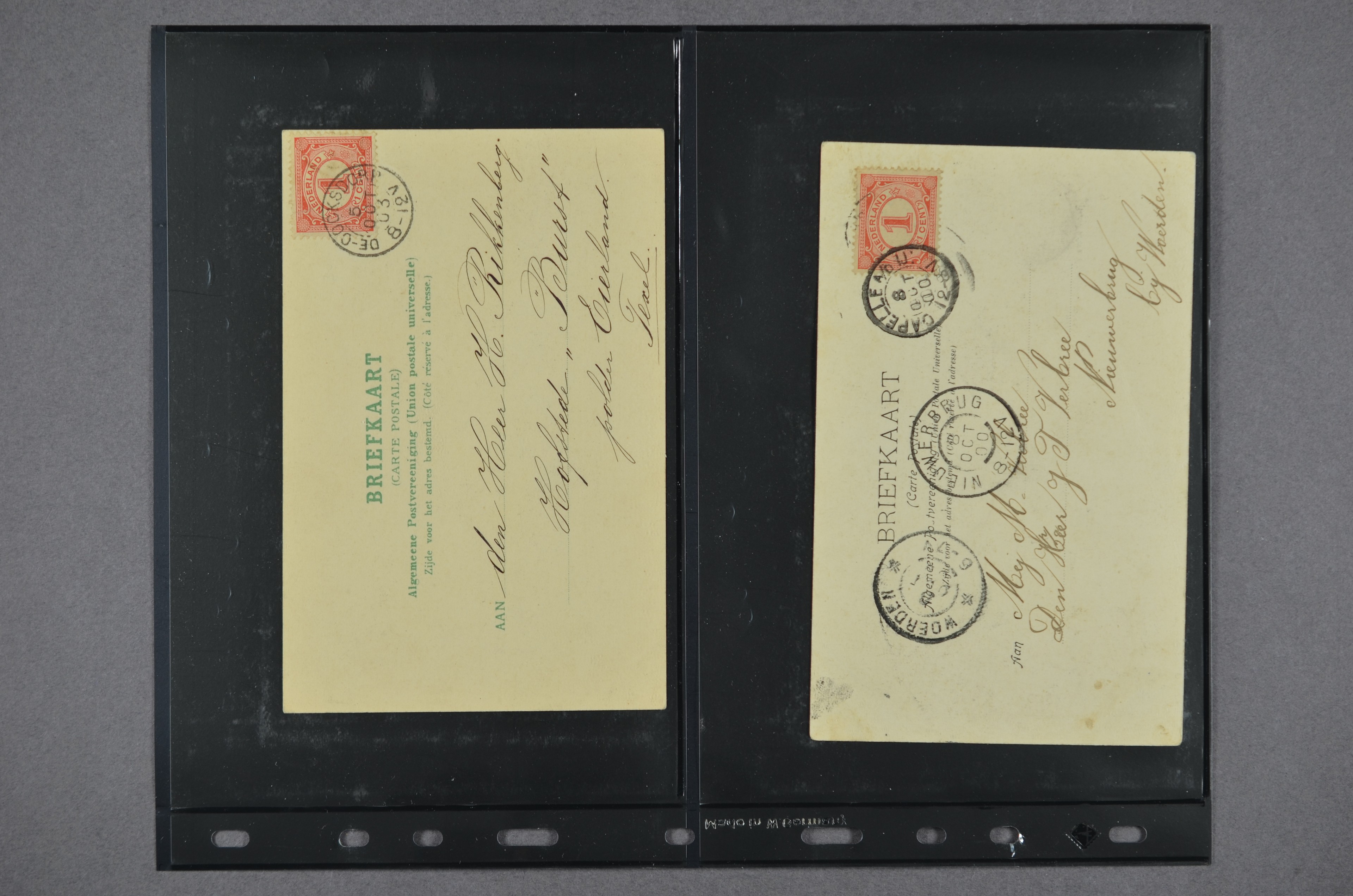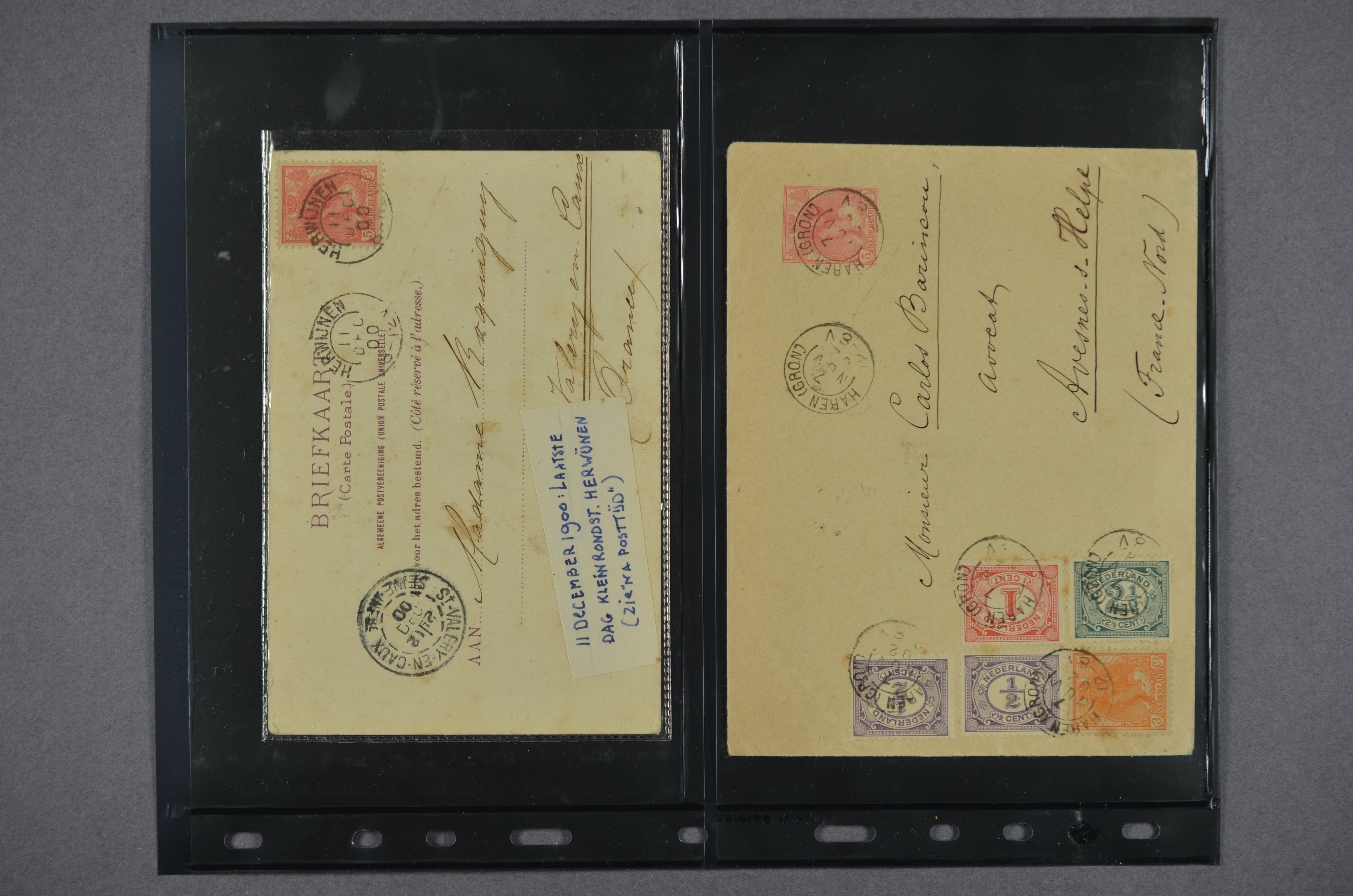 KLEINROND OP POSTSTUK, collectie van ruim 450 poststukken w.o. veel prentbriefkaarten, allemaal met kleinrondstempels van post-, hulppost- (merendeels) en bijpostkantoren, ook van spoorwegtrajecten, stations, Kamp bij Rijen (meerdere ex.), Amsterdam E, diverse schaarse stempels, enige doubletten, veel prachtige afstempelingen, enkele in blauw of violet, in 2 Leuchtturm-ringbanden. Prachtobject voor de handel of verzamelaar om op te zetten