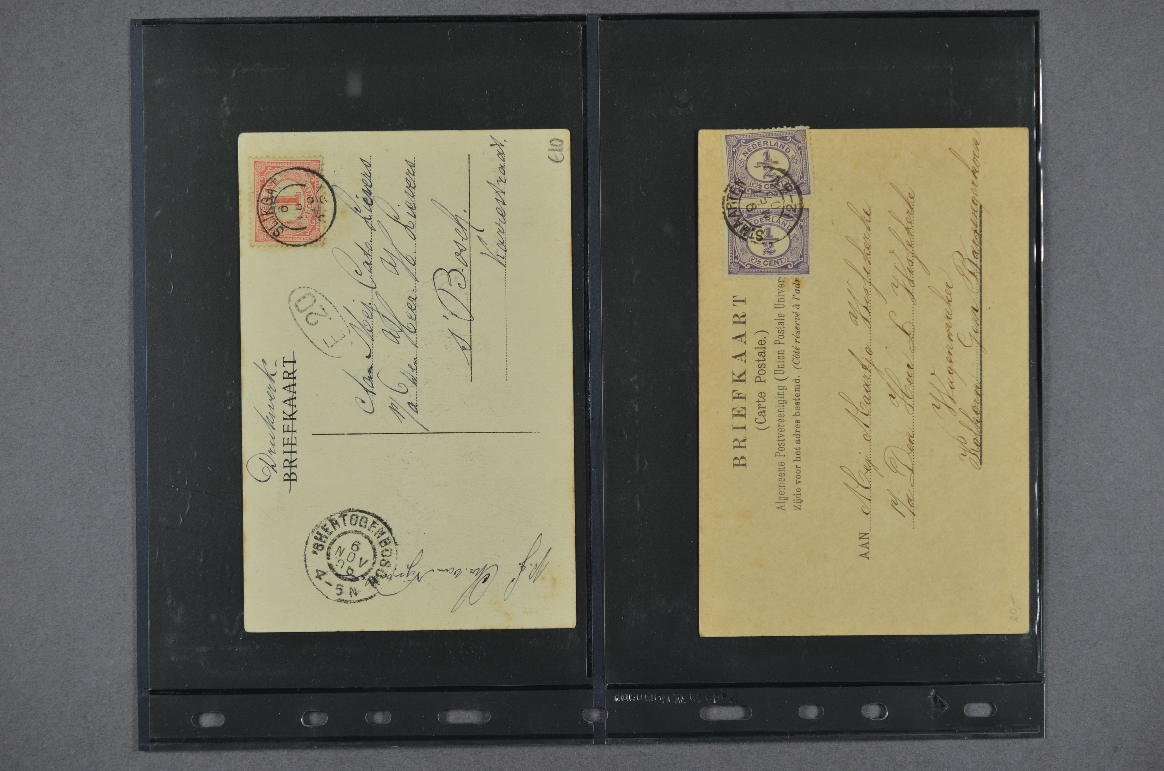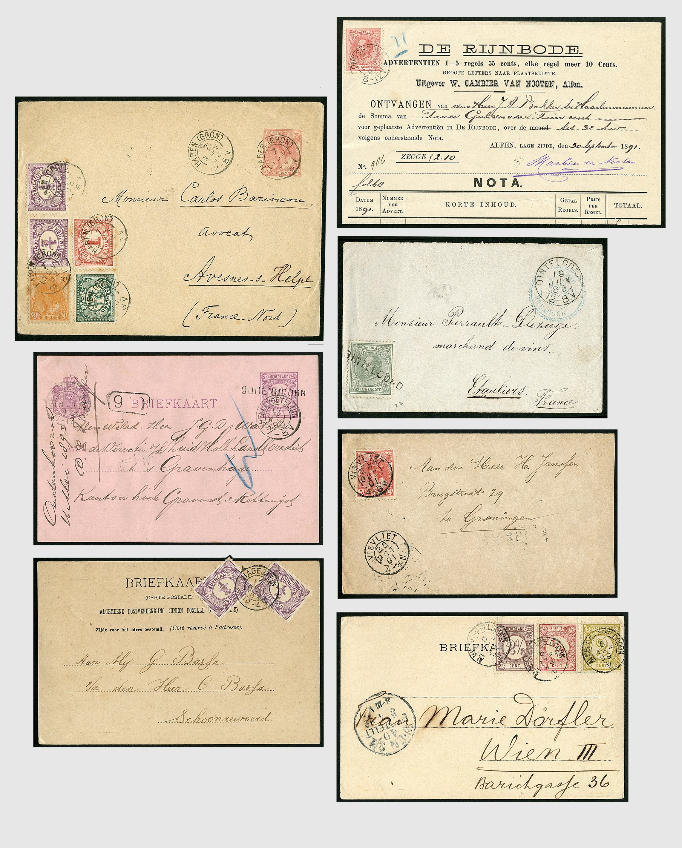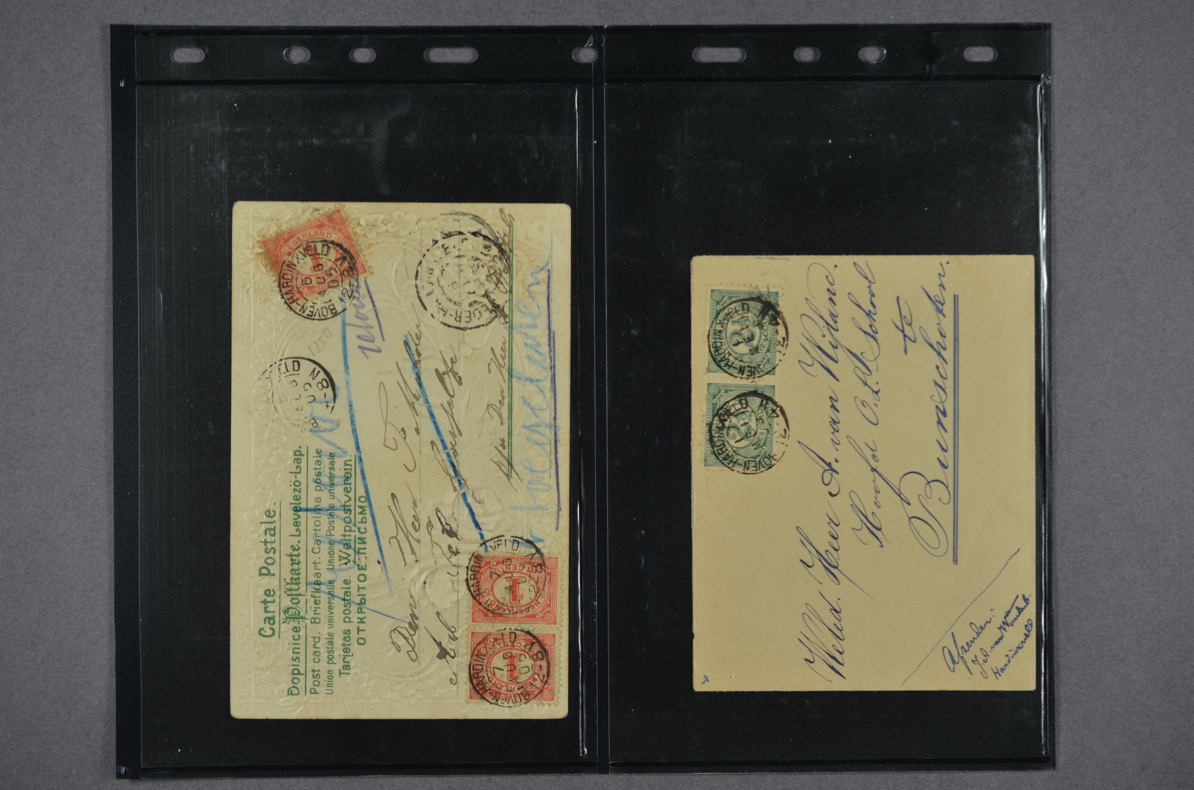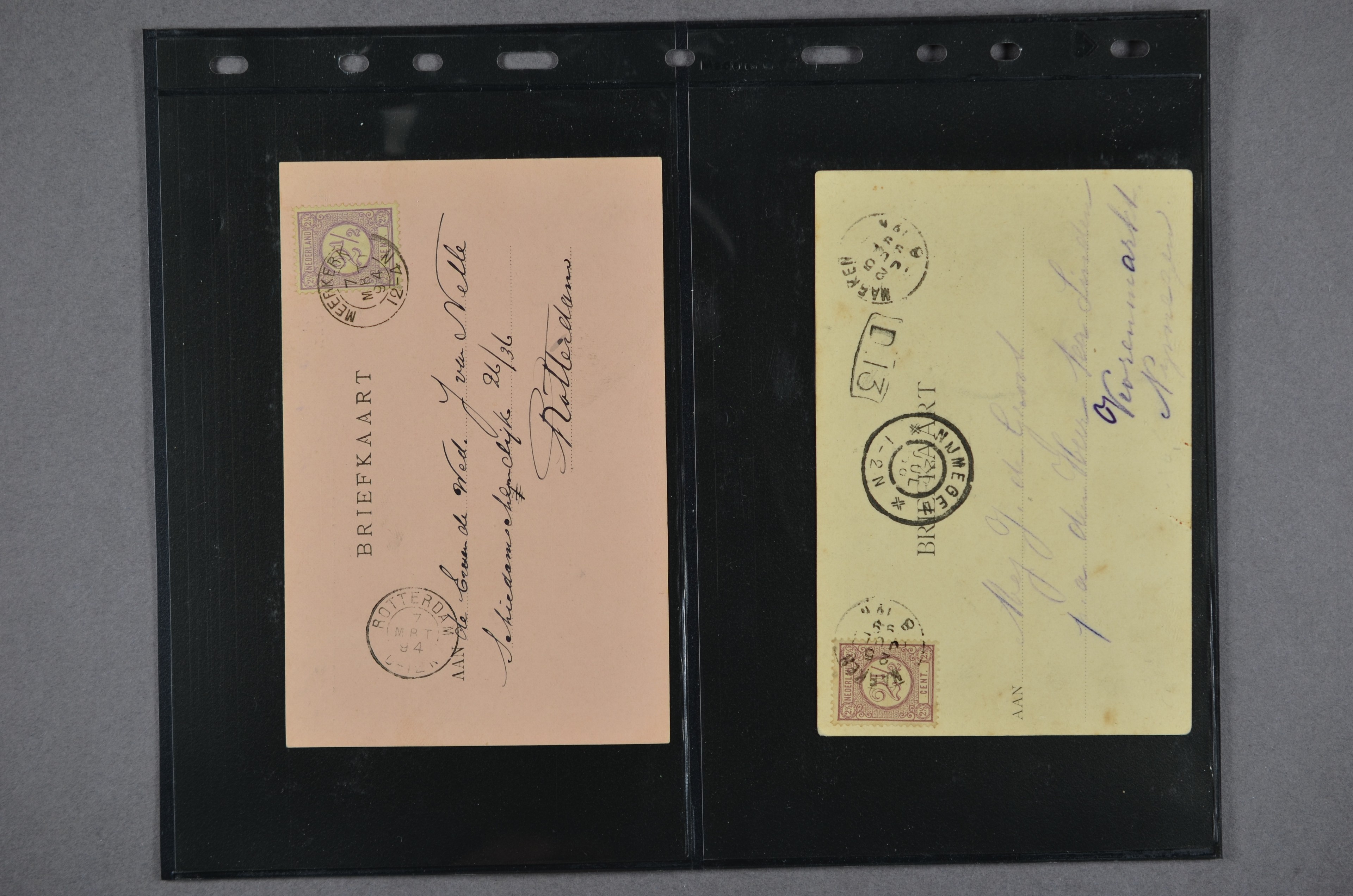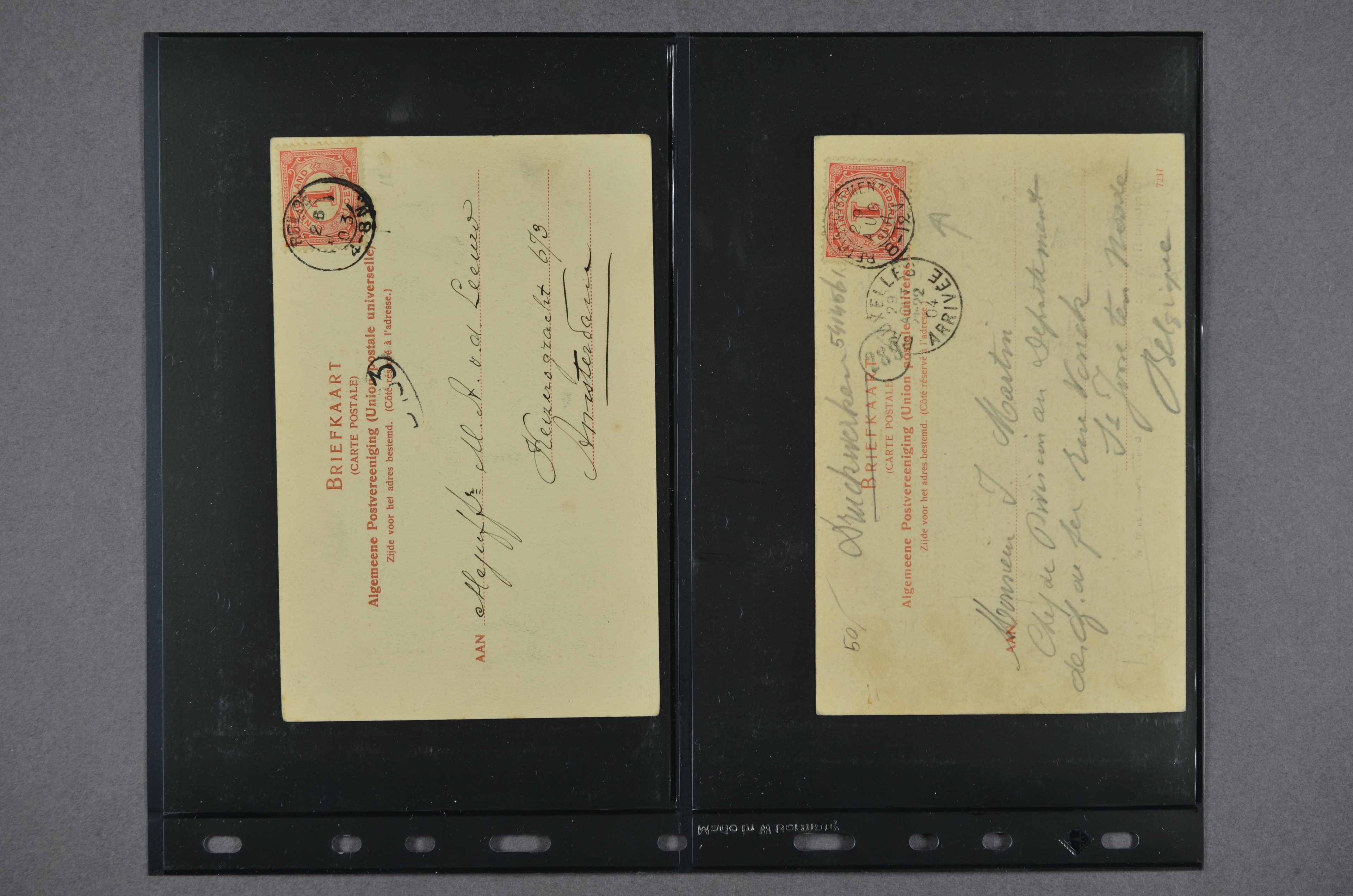 KLEINROND OP POSTSTUK, collectie van ruim 450 poststukken w.o. veel prentbriefkaarten, allemaal met kleinrondstempels van post-, hulppost- (merendeels) en bijpostkantoren, ook van spoorwegtrajecten, stations, Kamp bij Rijen (meerdere ex.), Amsterdam E, diverse schaarse stempels, enige doubletten, veel prachtige afstempelingen, enkele in blauw of violet, in 2 Leuchtturm-ringbanden. Prachtobject voor de handel of verzamelaar om op te zetten