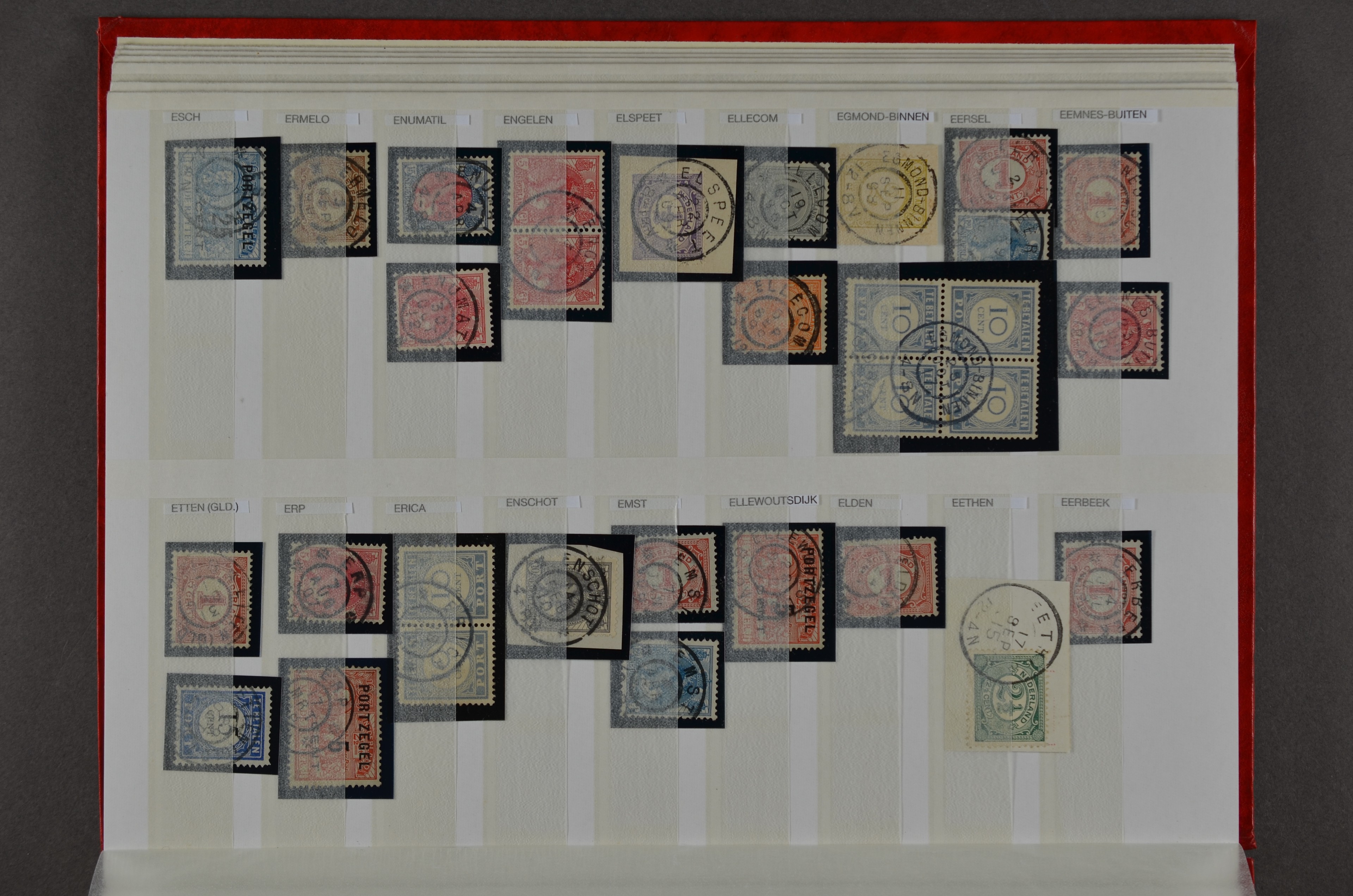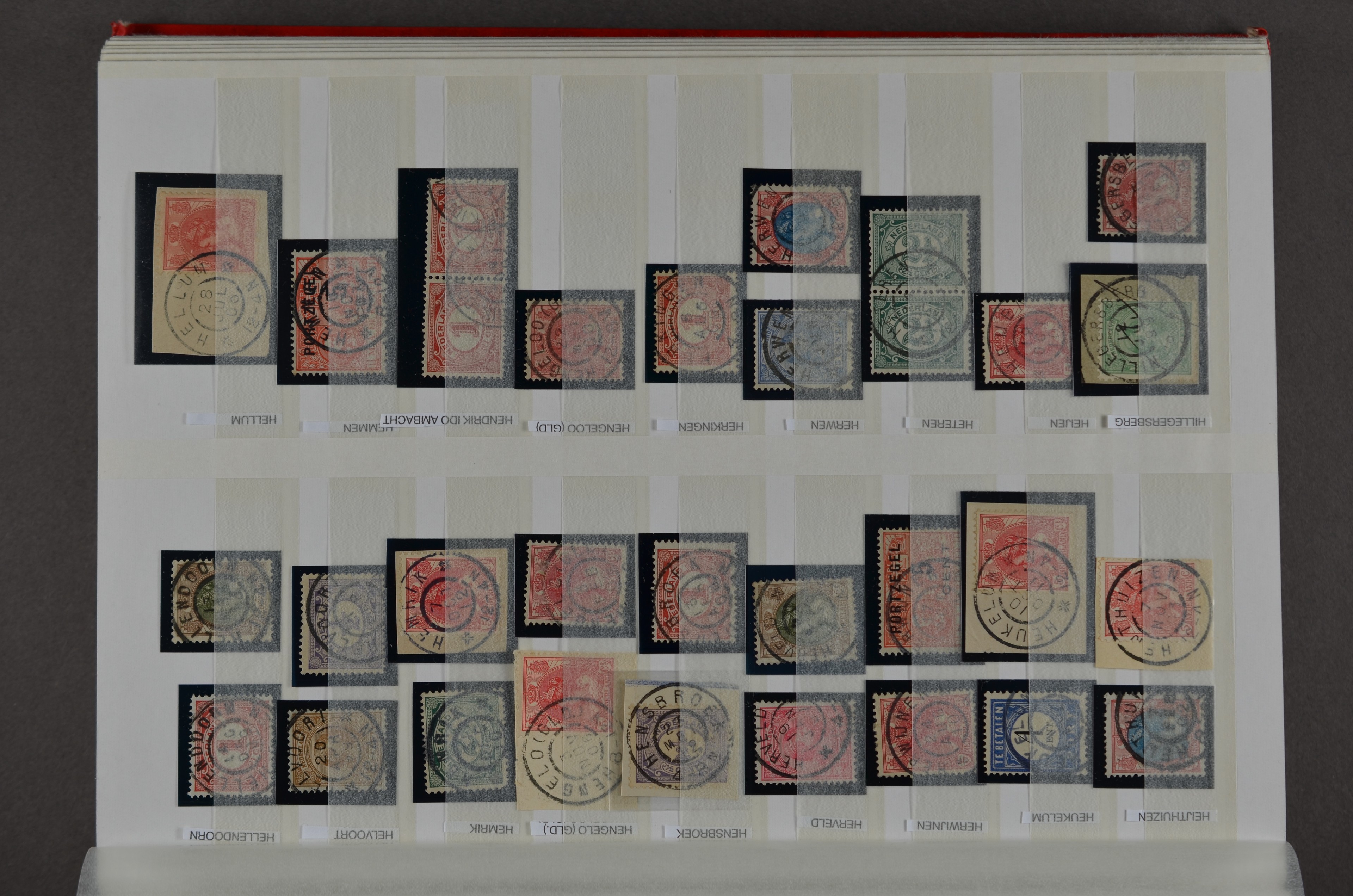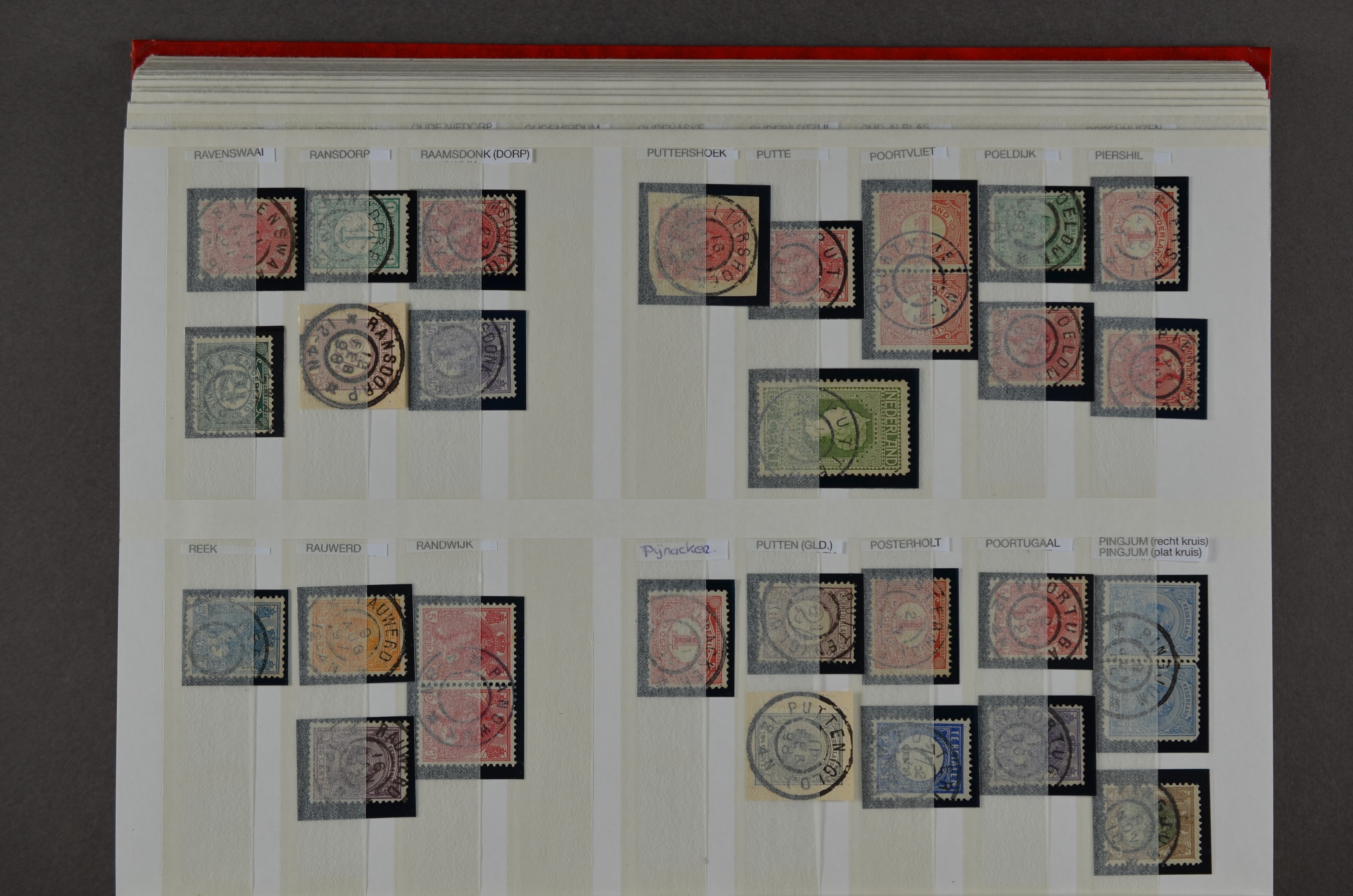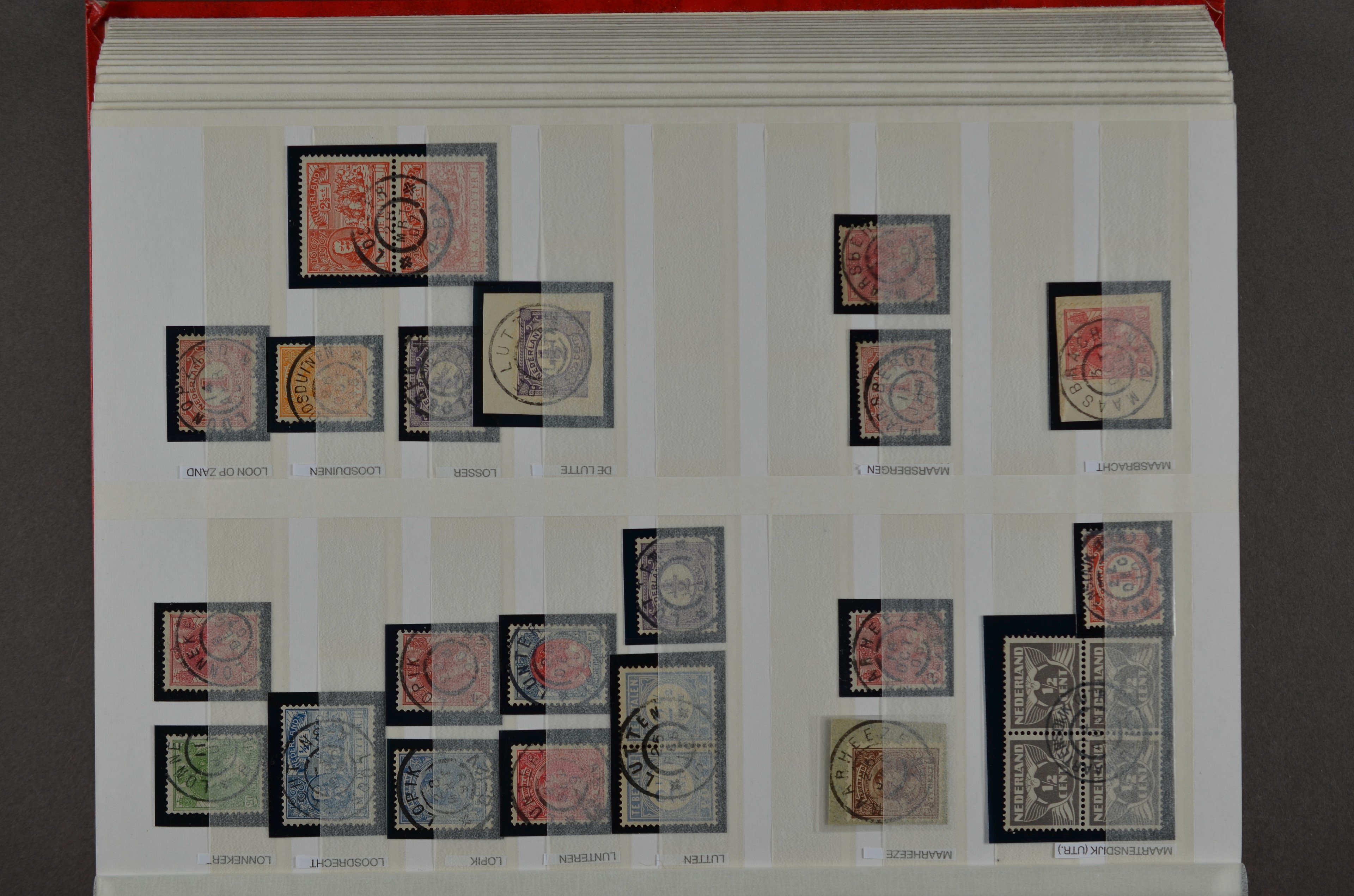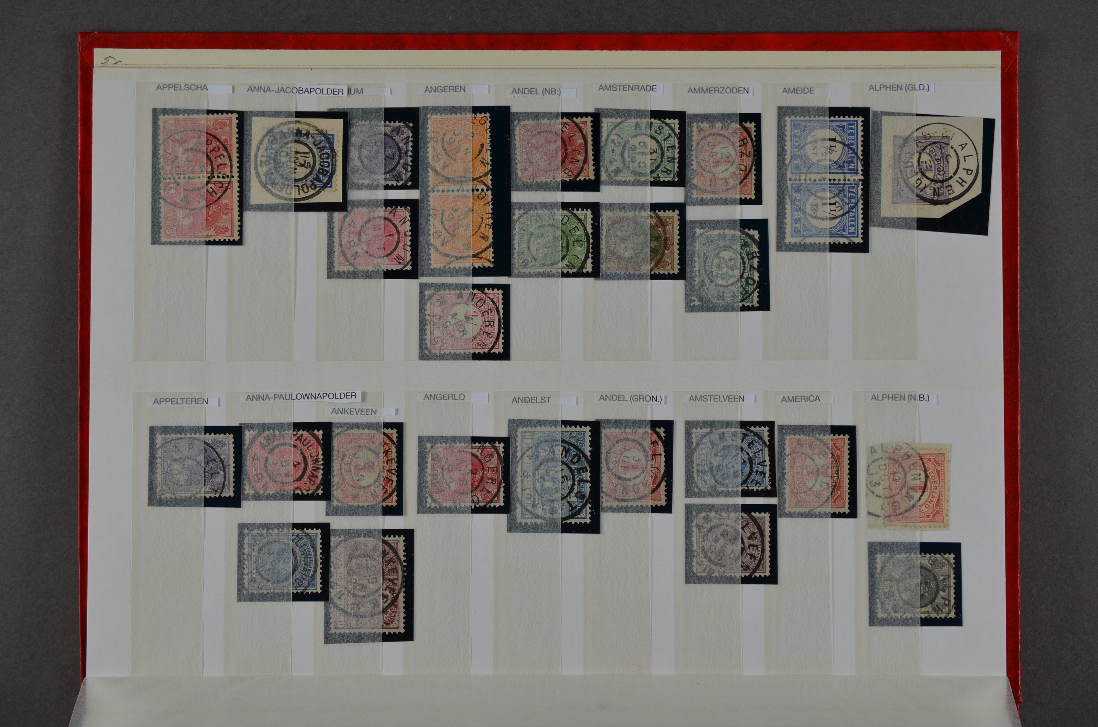 GROOTRONDSTEMPELS van hulppostkantoren, omvangrijke verzameling op losse zegels van verschillende emissies en waarden (o.a. TBC, De Ruyter, Jub. ´13, Port, etc.), w.o. op knipsels, met vele prachtige en feitelijk alleen maar luxe afstempelingen waarbij veel (zeer) schaarse kantoren, een lust voor het oog, en een geweldig mooi object om op te zetten of voor de handelaar om zijn klanten te verwennen met topkwaliteit, in dik insteekboek