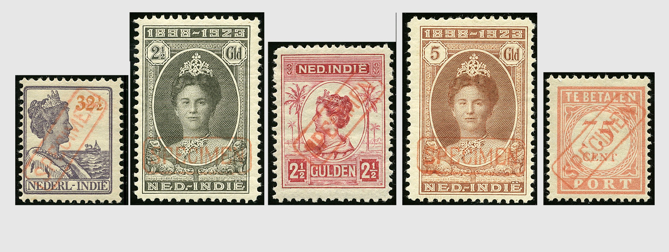 NED.- INDIË Stockholmserie uit 1924, 53 ex. w.o. enige doubletten, totaal 47 van de uitgegeven 49 verschillende zegels met rode Specimen-opdruk (nrs. 146/47 ontbreken), merendeels met plakker en met keurstempeltje