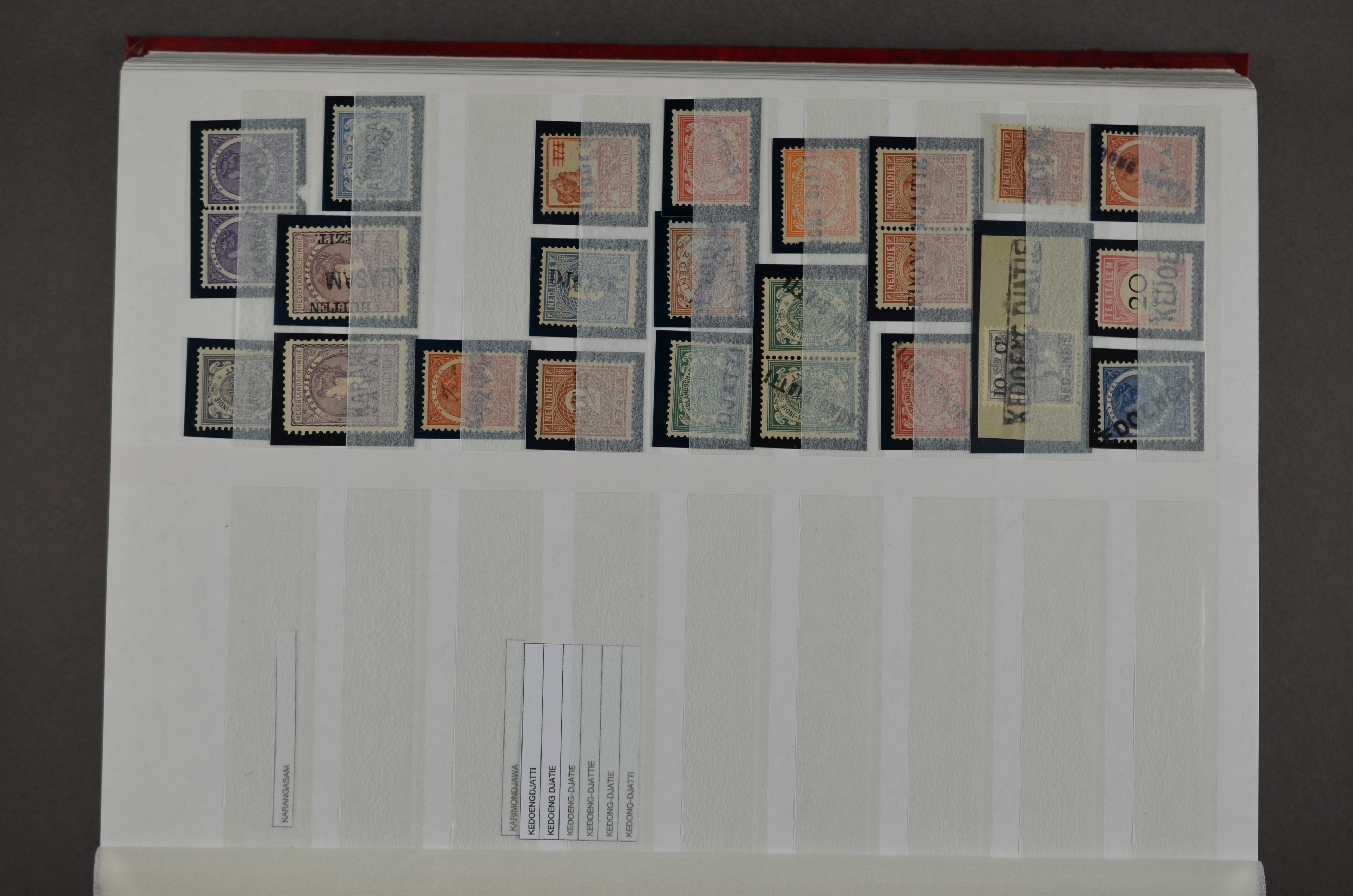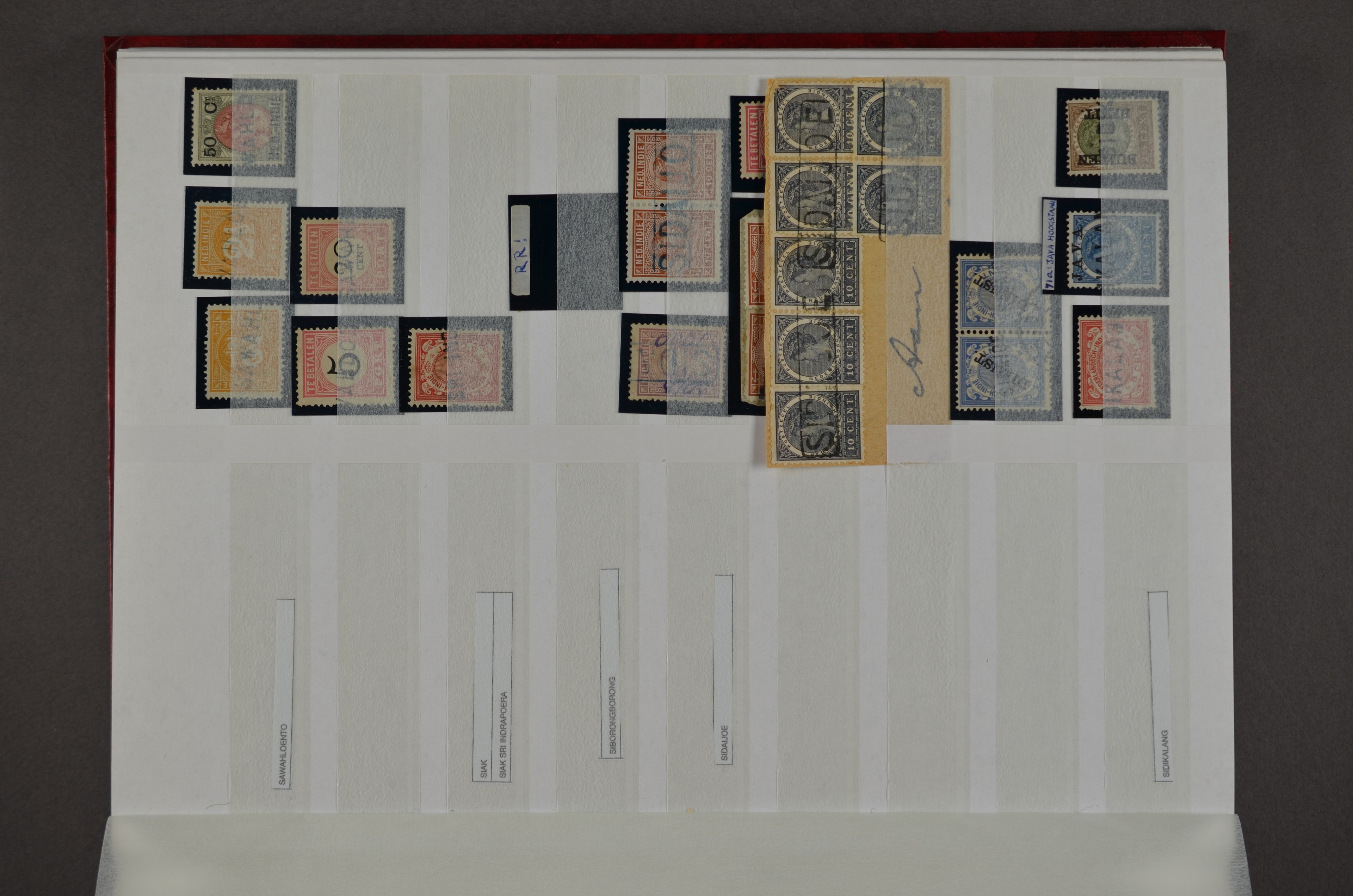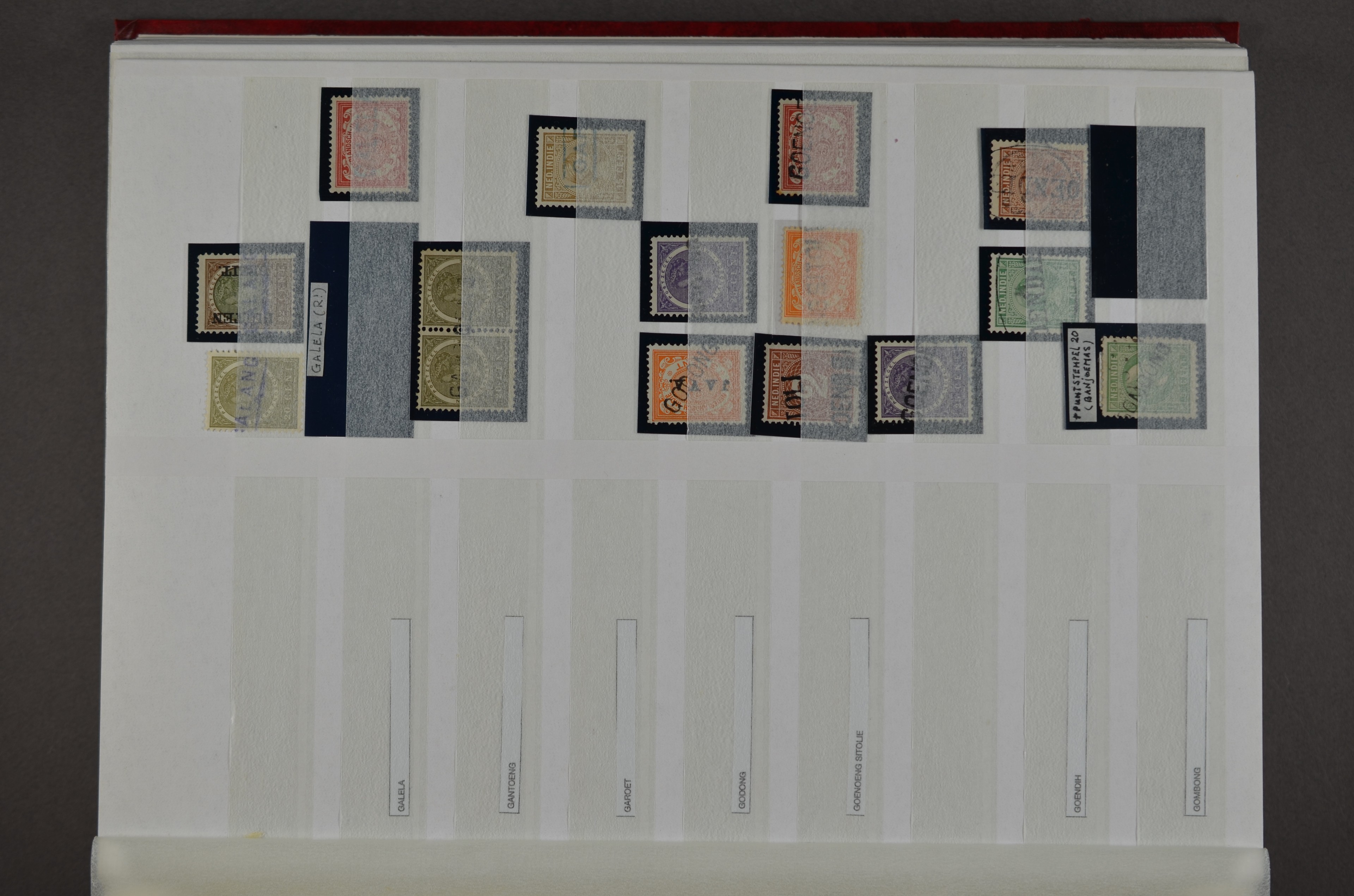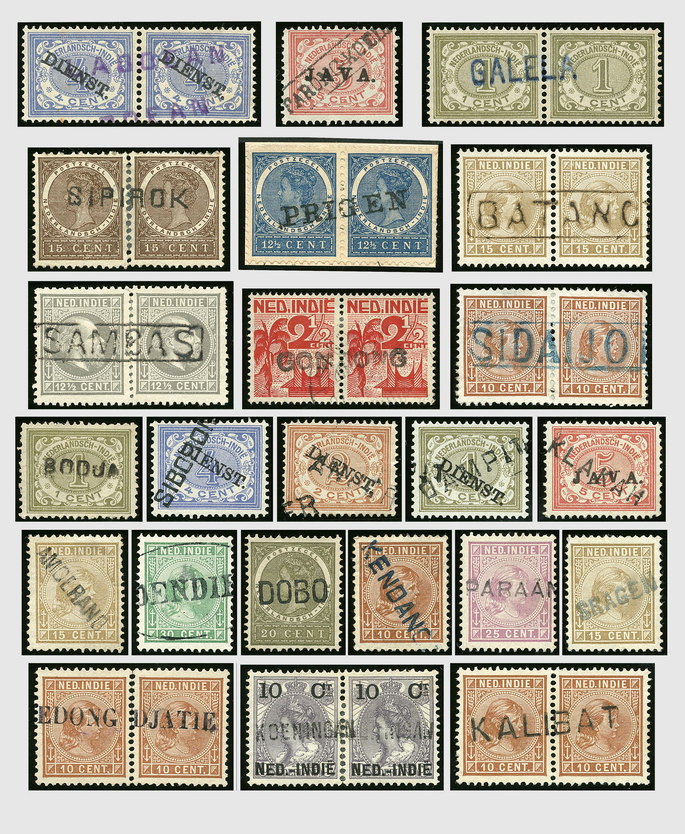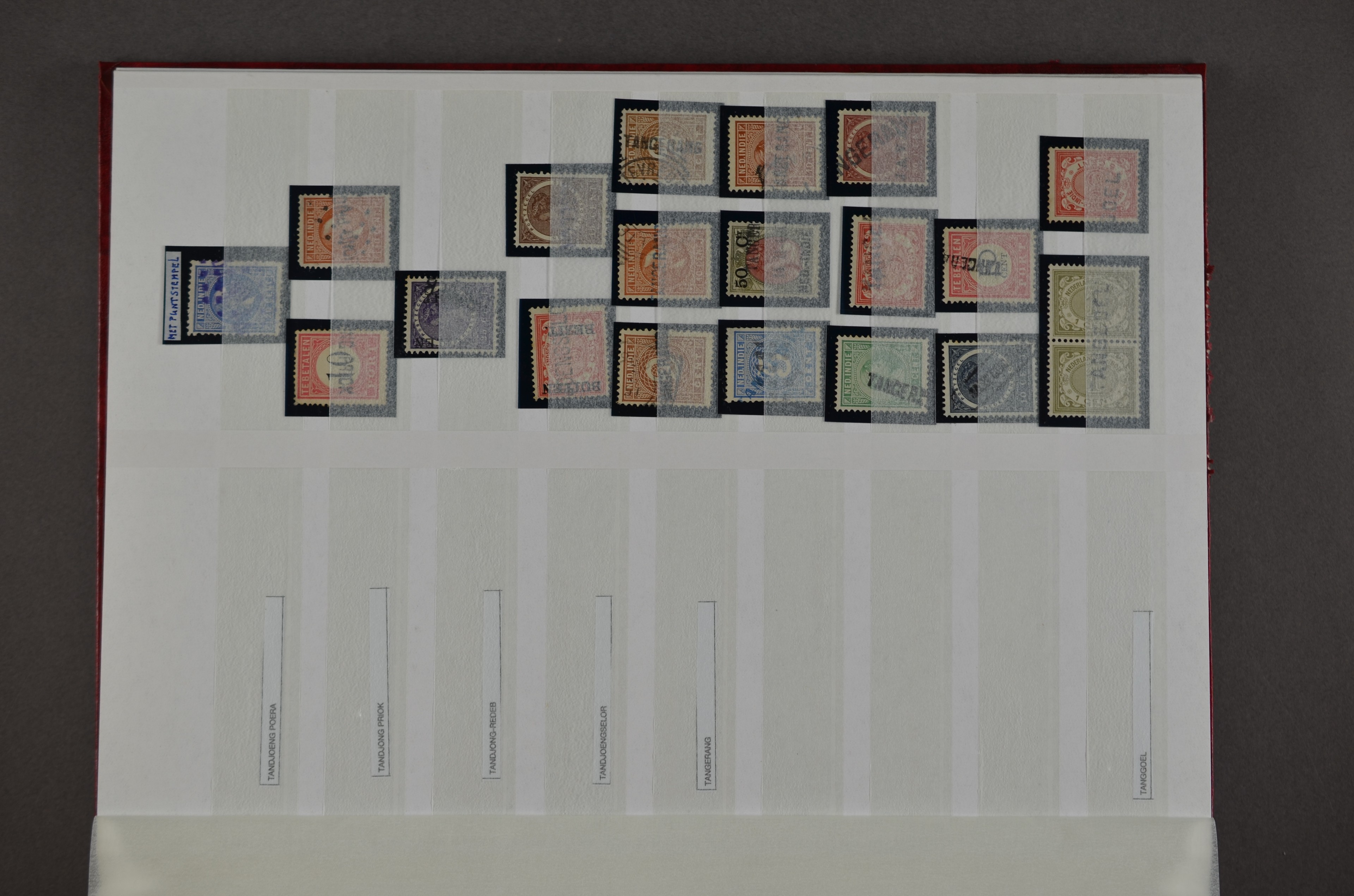 NED.- INDIË naamstempels (zgn. langstempels), uitgebreide collectie op diverse emissies en waarden, ook wat naoorlogse noodstempels, in zwart, blauw, violet en rood, van hulppostkantoren en een enkel bestelhuis en halte, diverse met de pen bijgeschreven datum, veel schaarse en zeer zeldzame stempels als Anjer, Banggai/datum (uit 1925, violet, op nr. 143), Galela, Humboldtsbaai, Laboean, Langsatoenong, Lintido, Malili, Moeara Saibi, Oeloe-Siaoe, Petta, Pladjoe, Prigen, Siak Sri Indrapoera (fragment), Siborongborong (fragment), Sipirok, Takalar, Tandjoeng Poera (met puntstempel 118!), Tjoeroep, Tobelo, Welahan, etc. Prachtig object om te detailleren of op te zetten en de moeilijke manco´s te zoeken!