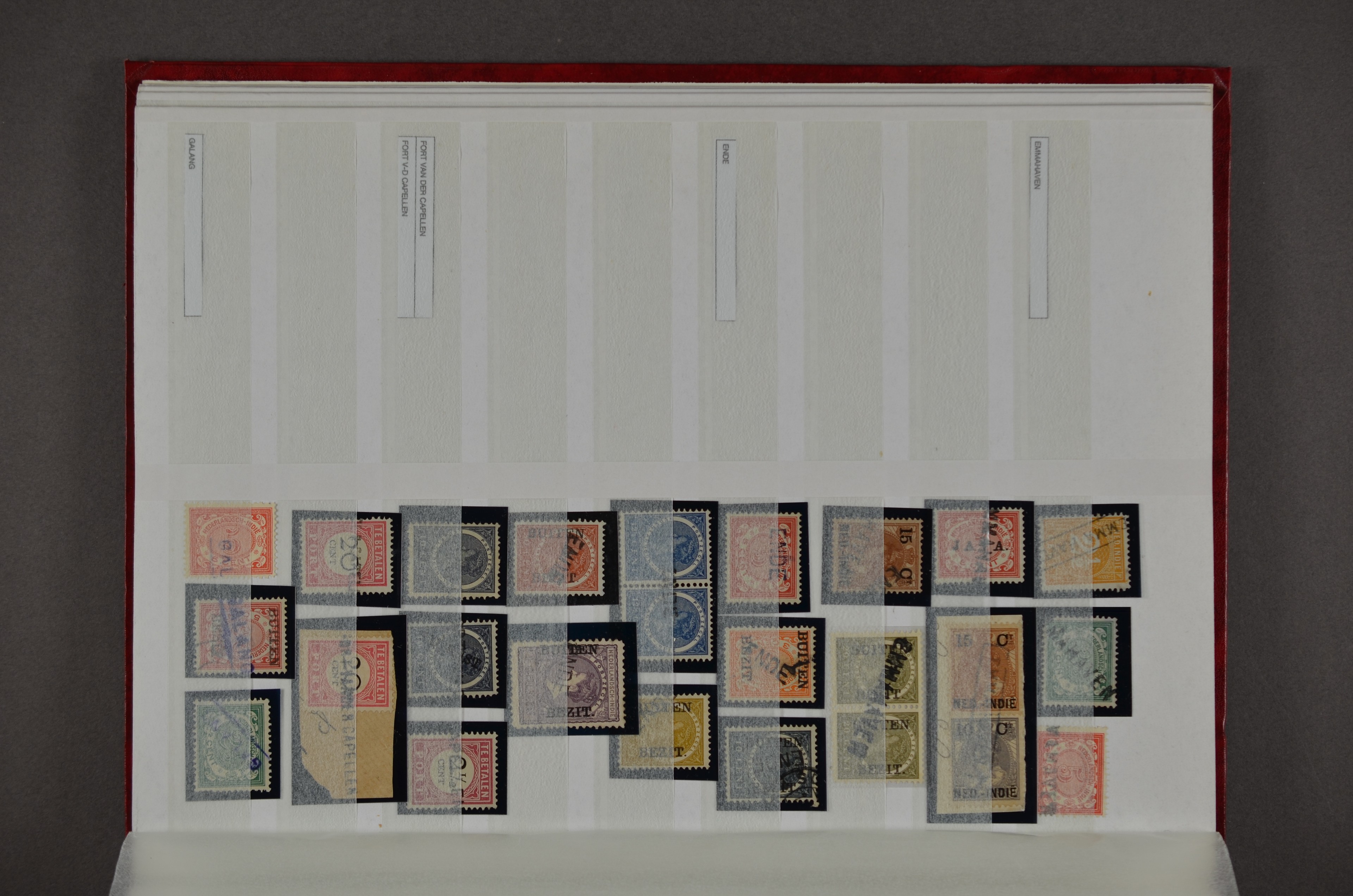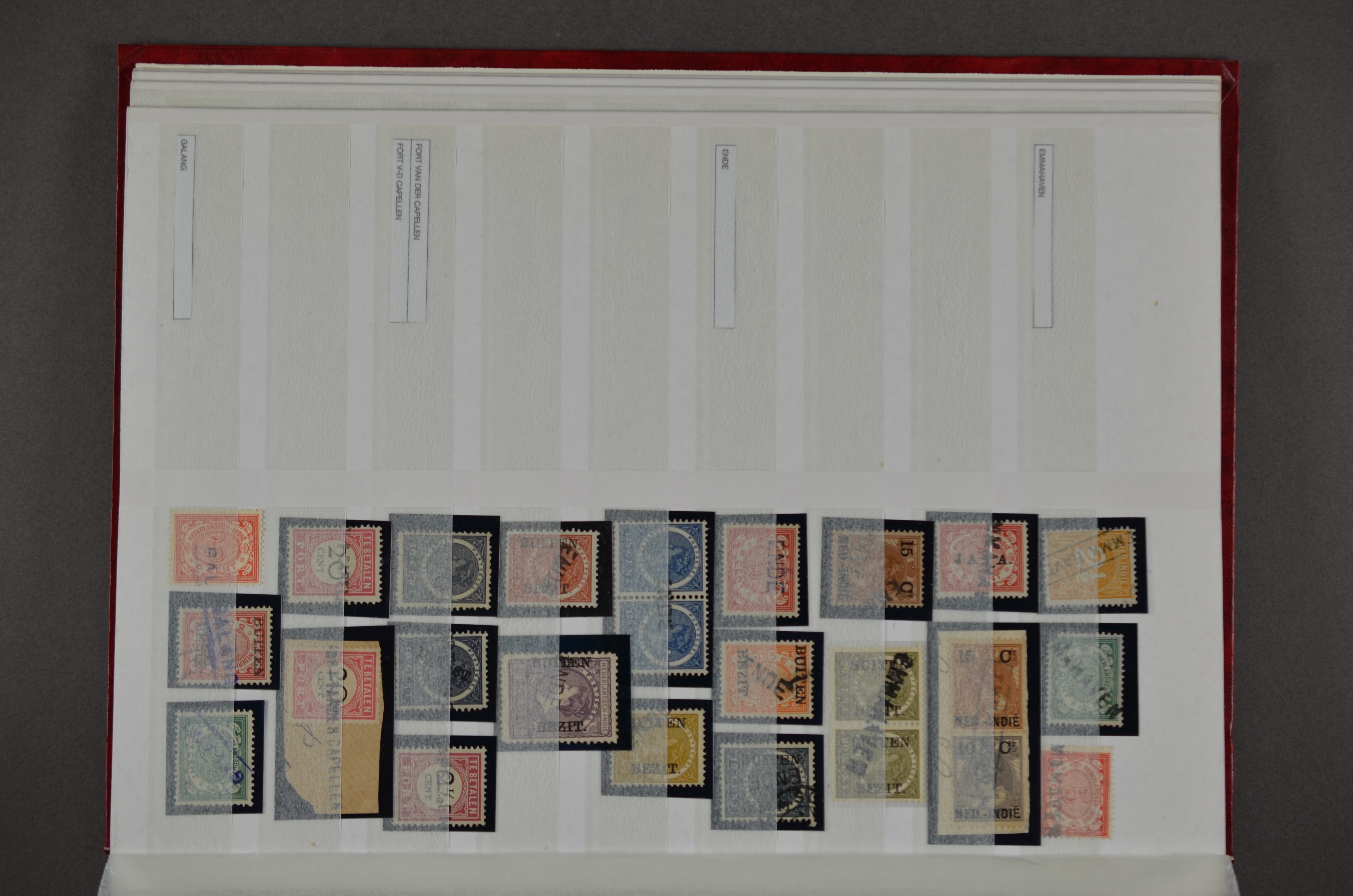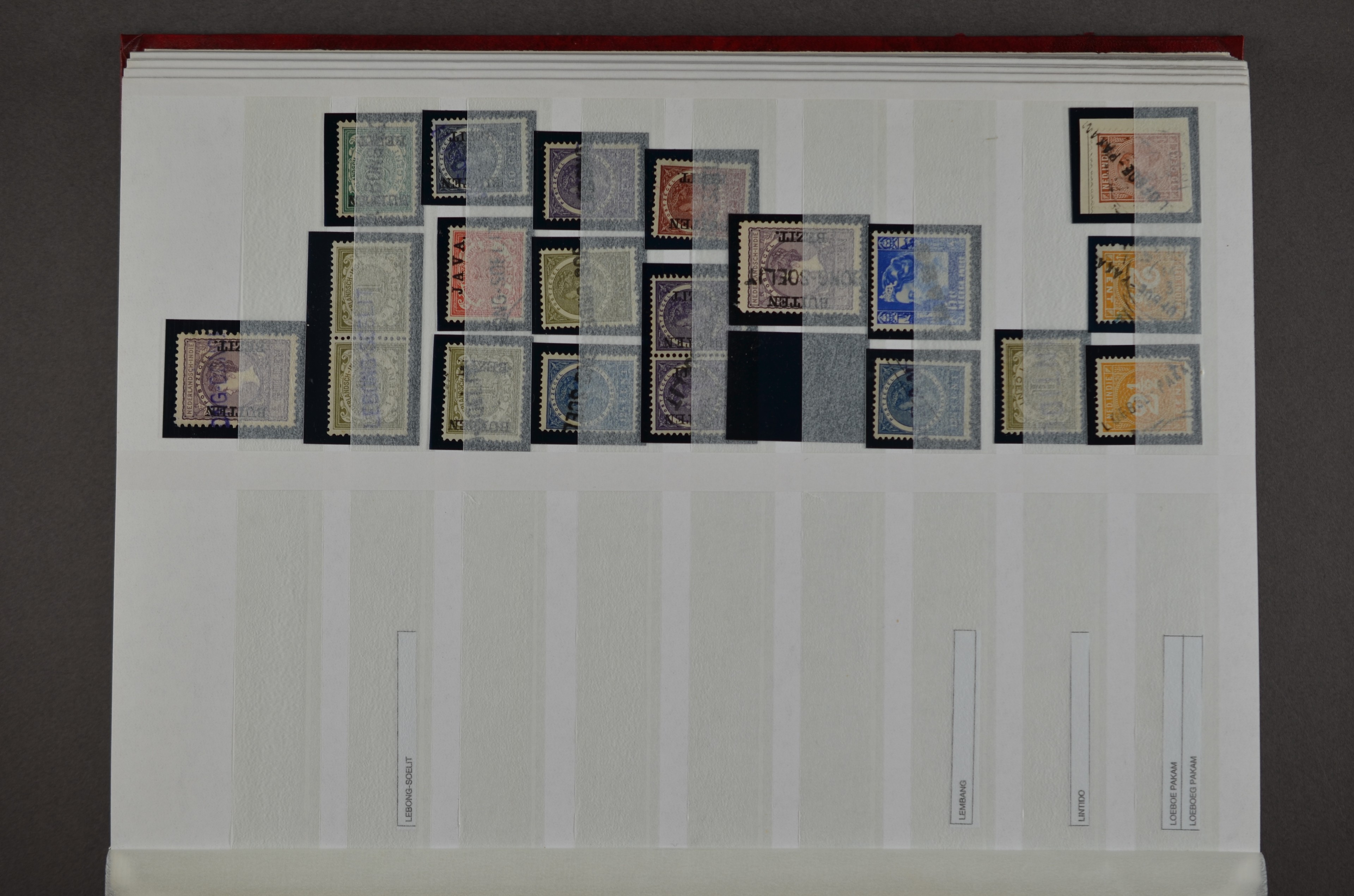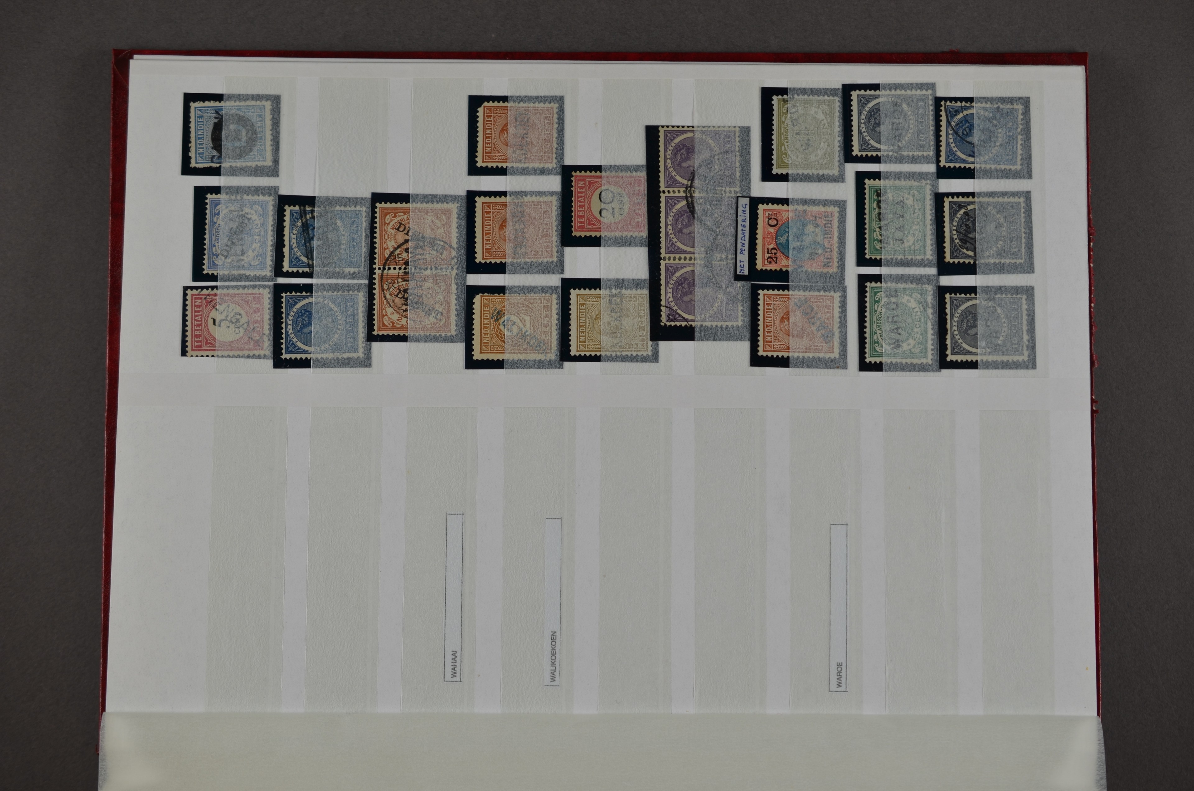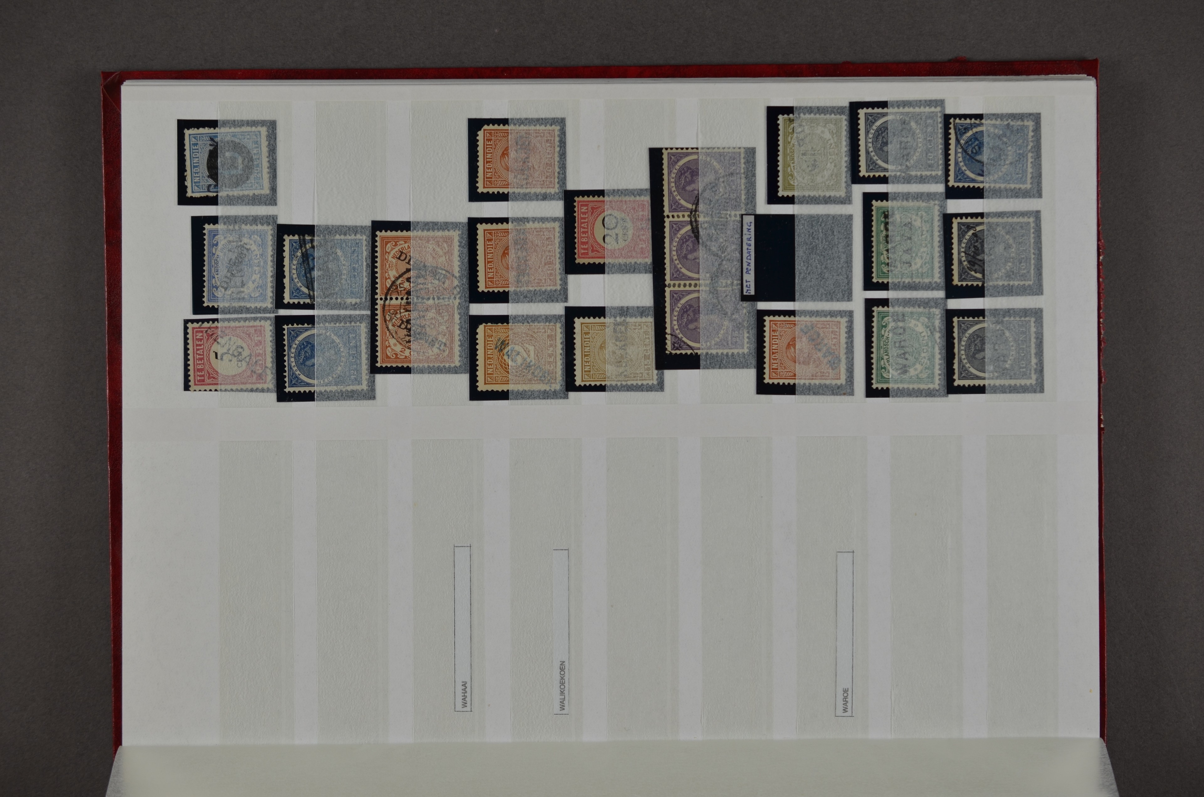 NED.- INDIË naamstempels (zgn. langstempels), uitgebreide collectie op diverse emissies en waarden, ook wat naoorlogse noodstempels, in zwart, blauw, violet en rood, van hulppostkantoren en een enkel bestelhuis en halte, diverse met de pen bijgeschreven datum, veel schaarse en zeer zeldzame stempels als Anjer, Banggai/datum (uit 1925, violet, op nr. 143), Galela, Humboldtsbaai, Laboean, Langsatoenong, Lintido, Malili, Moeara Saibi, Oeloe-Siaoe, Petta, Pladjoe, Prigen, Siak Sri Indrapoera (fragment), Siborongborong (fragment), Sipirok, Takalar, Tandjoeng Poera (met puntstempel 118!), Tjoeroep, Tobelo, Welahan, etc. Prachtig object om te detailleren of op te zetten en de moeilijke manco´s te zoeken!