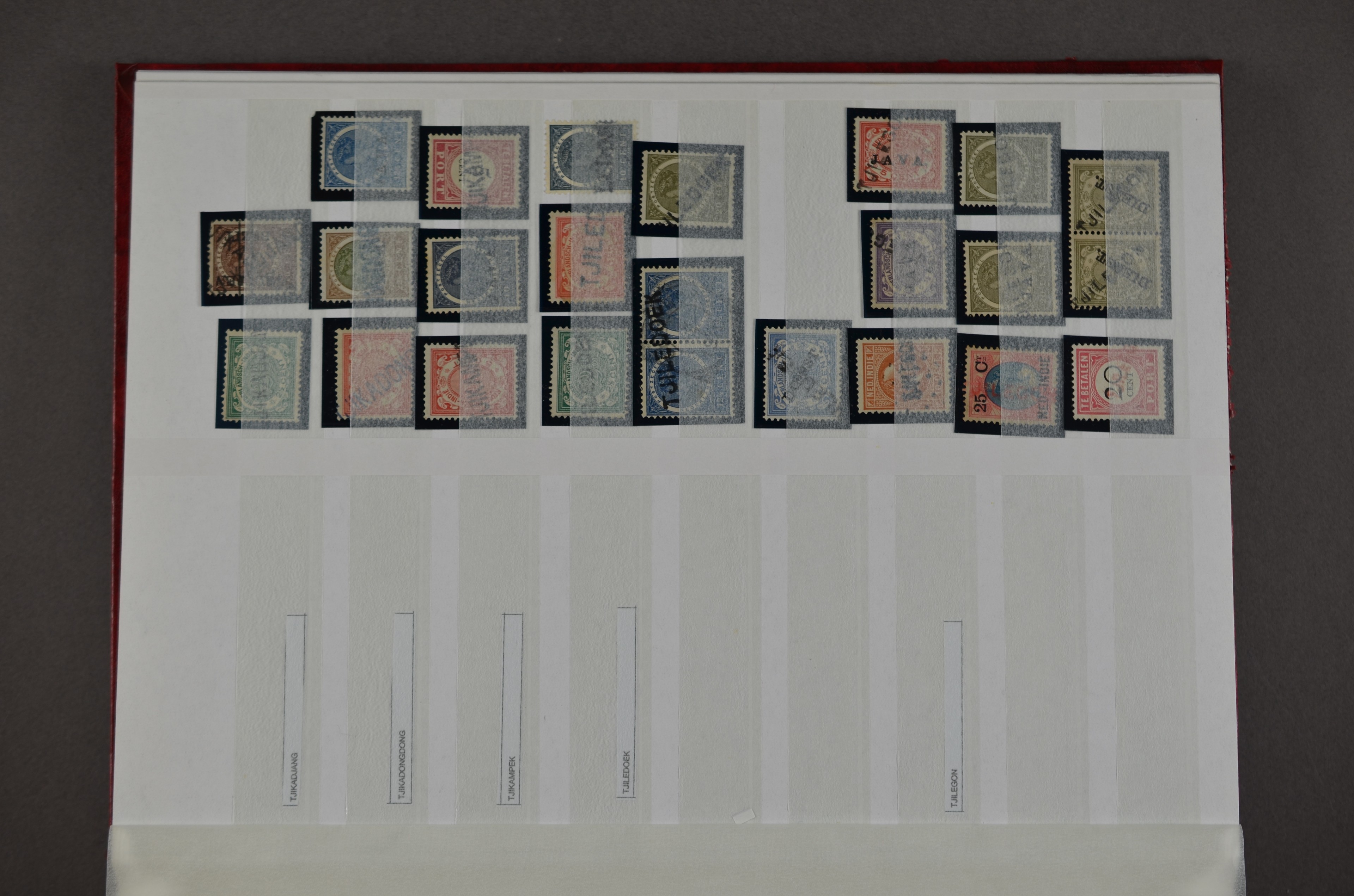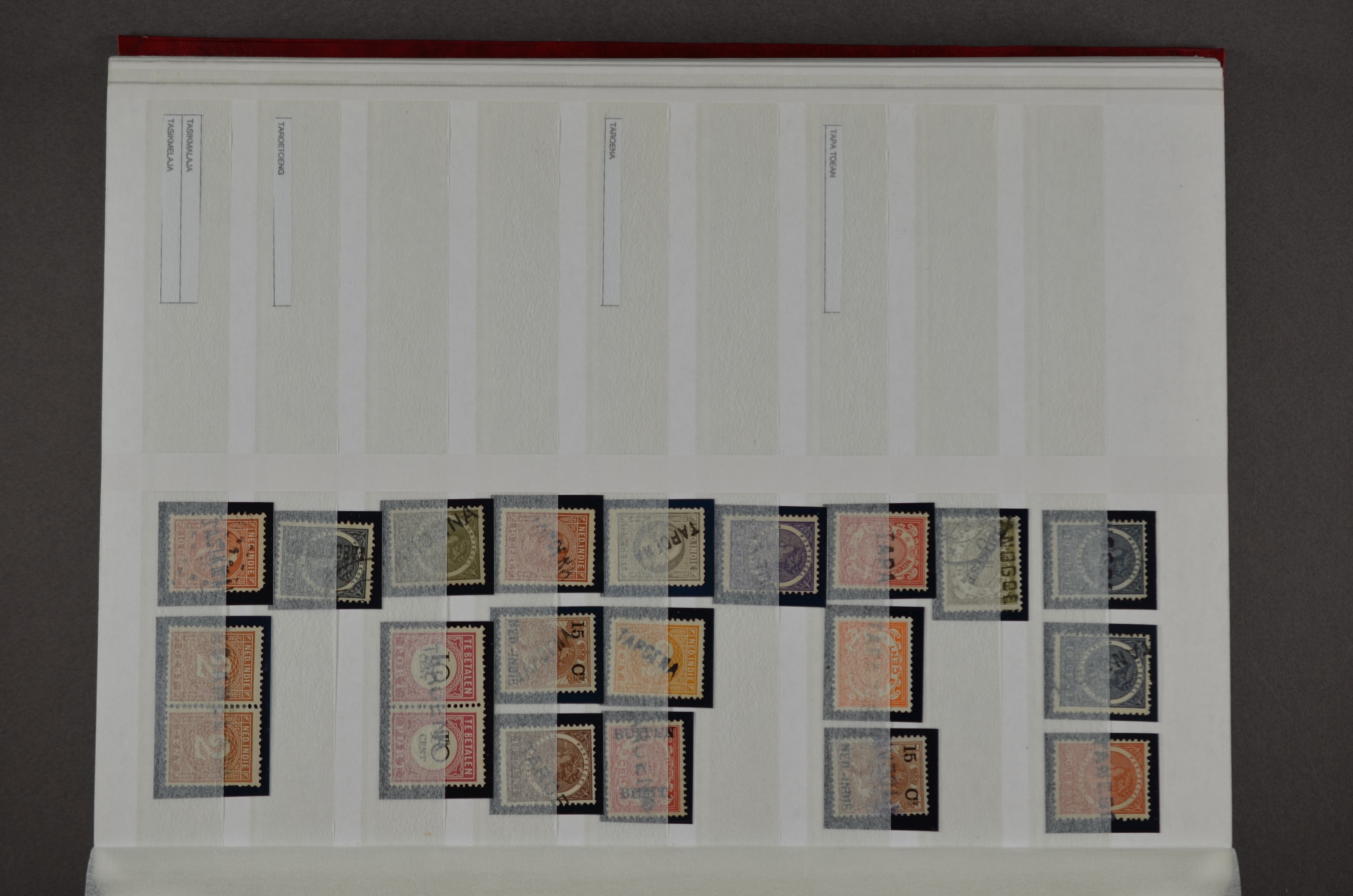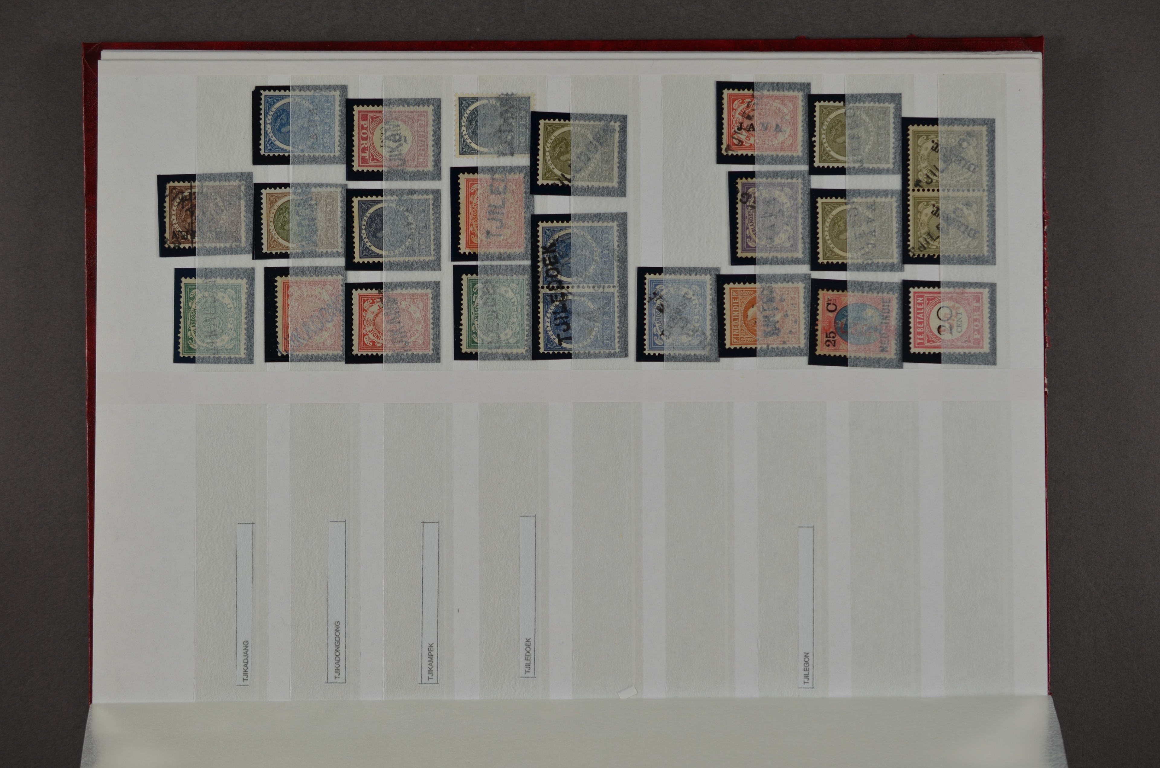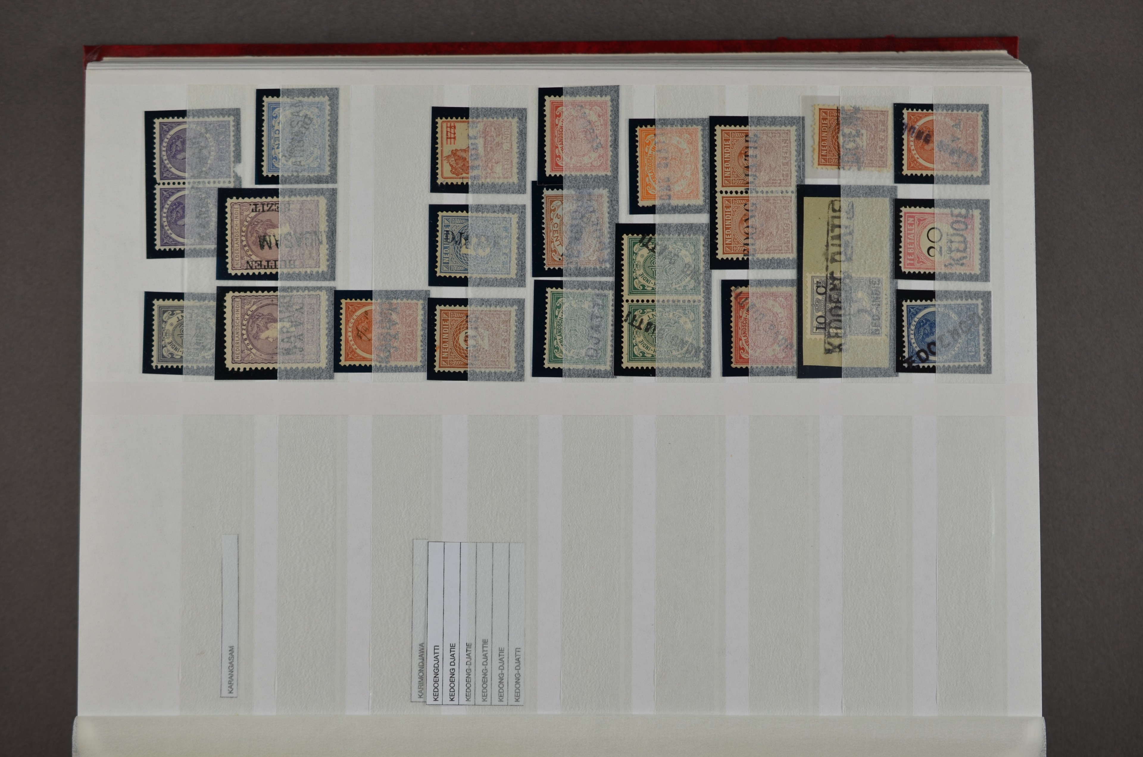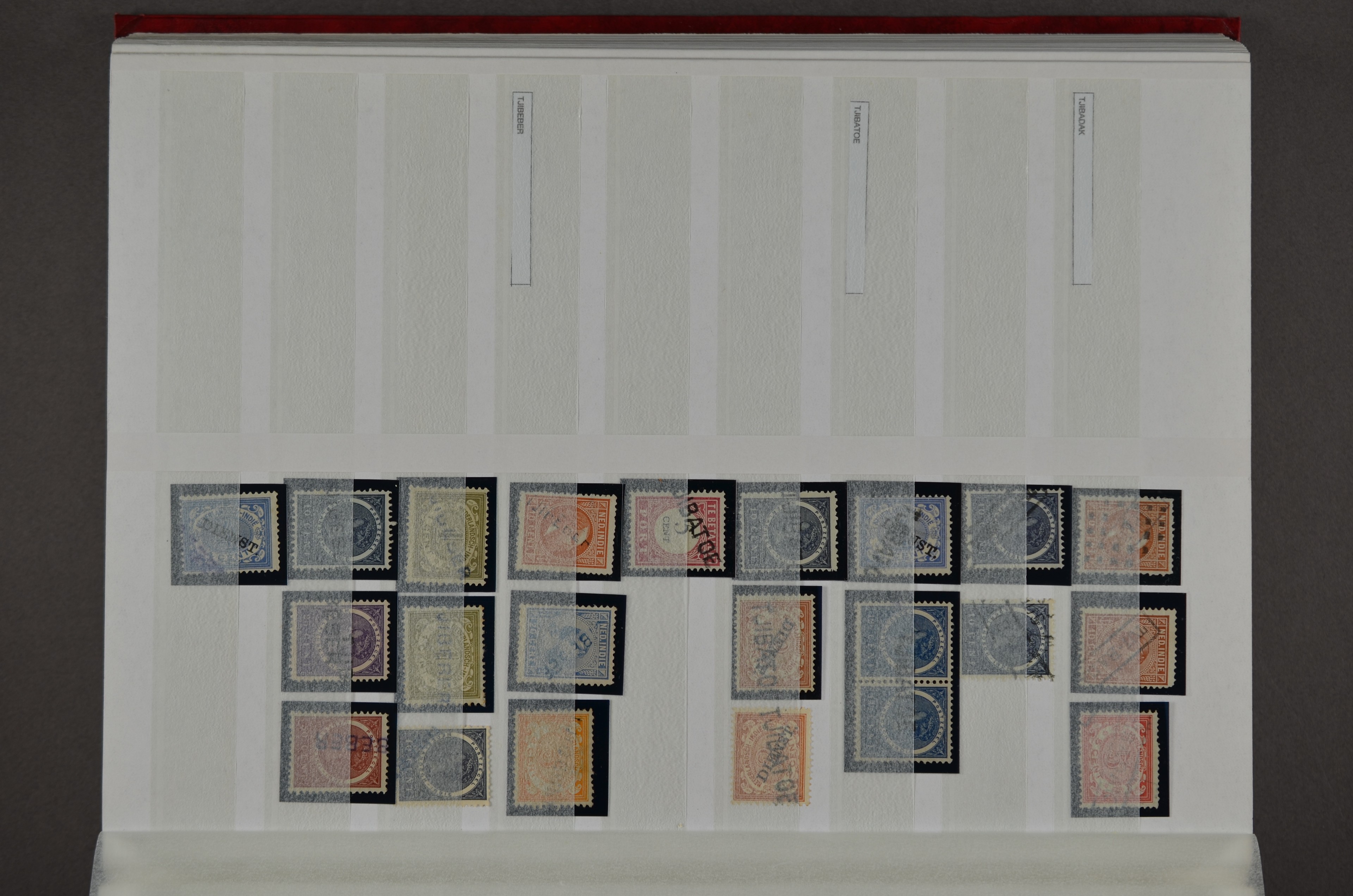 NED.- INDIË naamstempels (zgn. langstempels), uitgebreide collectie op diverse emissies en waarden, ook wat naoorlogse noodstempels, in zwart, blauw, violet en rood, van hulppostkantoren en een enkel bestelhuis en halte, diverse met de pen bijgeschreven datum, veel schaarse en zeer zeldzame stempels als Anjer, Banggai/datum (uit 1925, violet, op nr. 143), Galela, Humboldtsbaai, Laboean, Langsatoenong, Lintido, Malili, Moeara Saibi, Oeloe-Siaoe, Petta, Pladjoe, Prigen, Siak Sri Indrapoera (fragment), Siborongborong (fragment), Sipirok, Takalar, Tandjoeng Poera (met puntstempel 118!), Tjoeroep, Tobelo, Welahan, etc. Prachtig object om te detailleren of op te zetten en de moeilijke manco´s te zoeken!