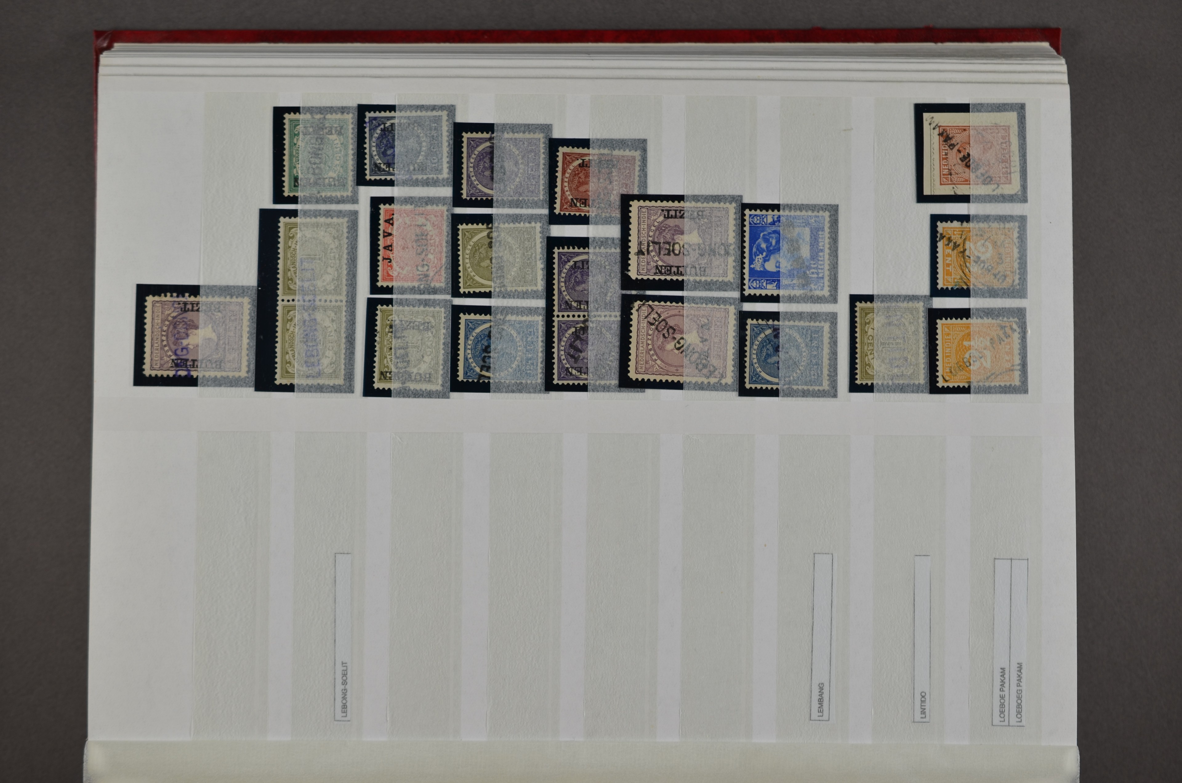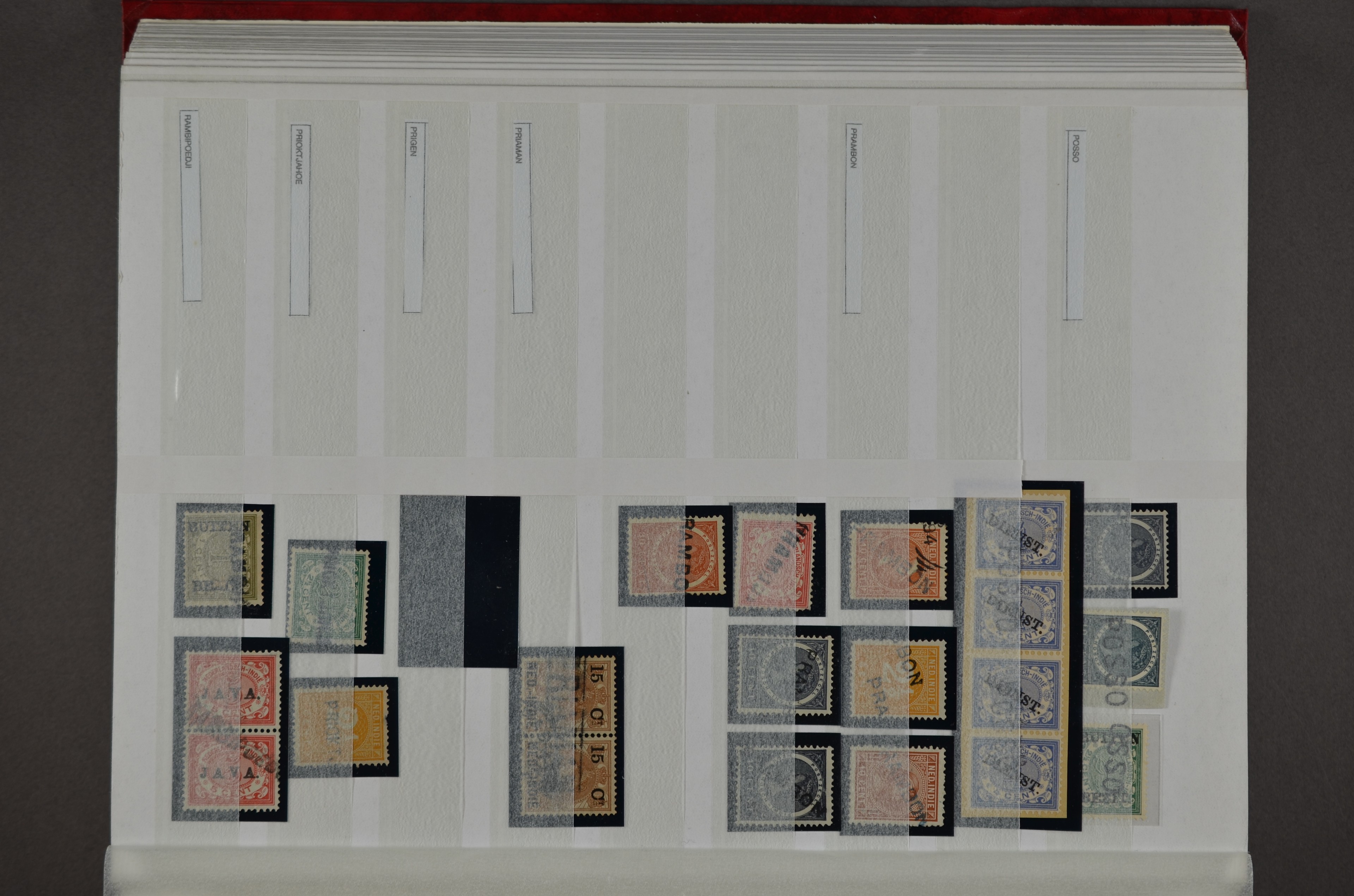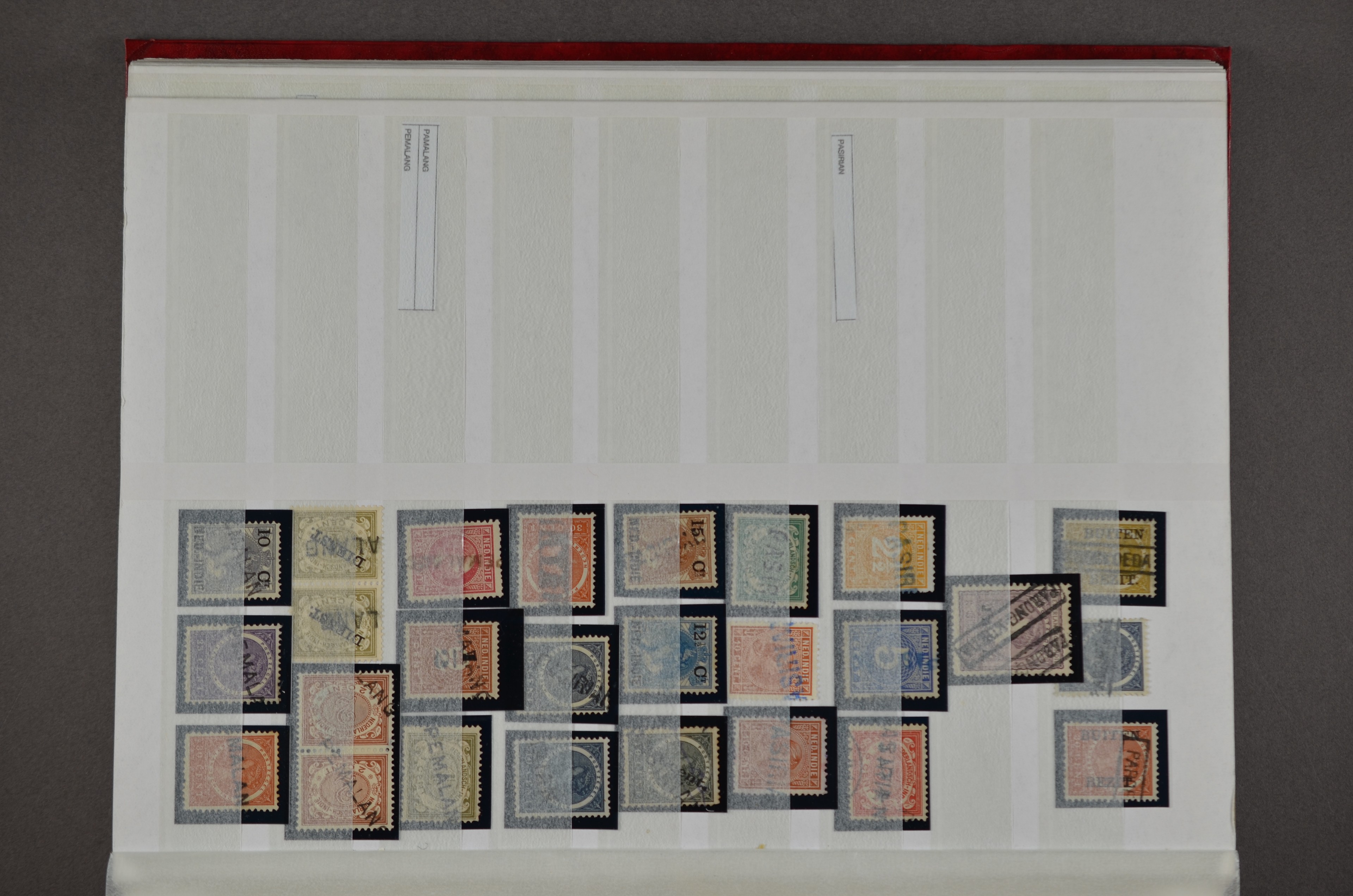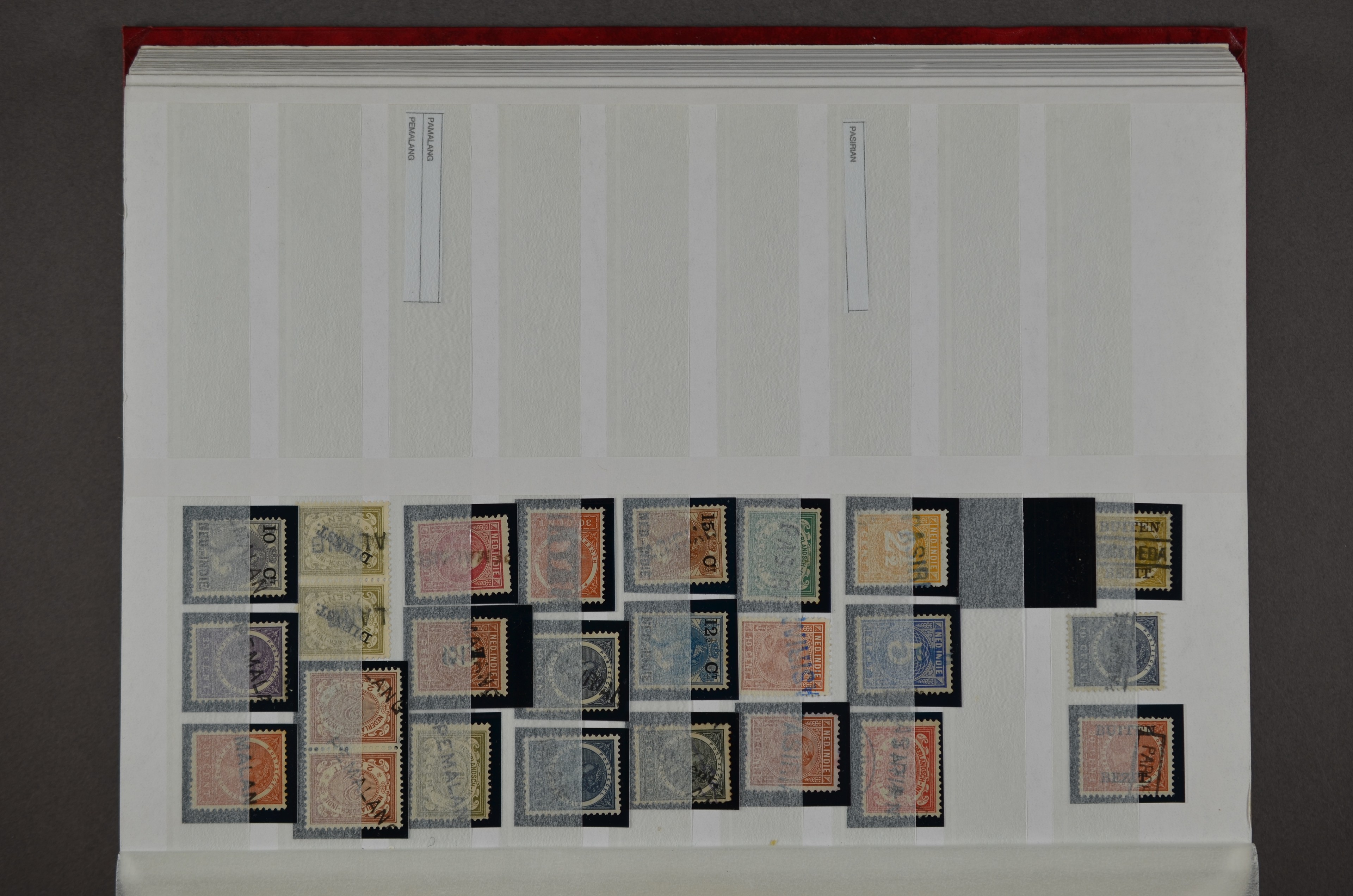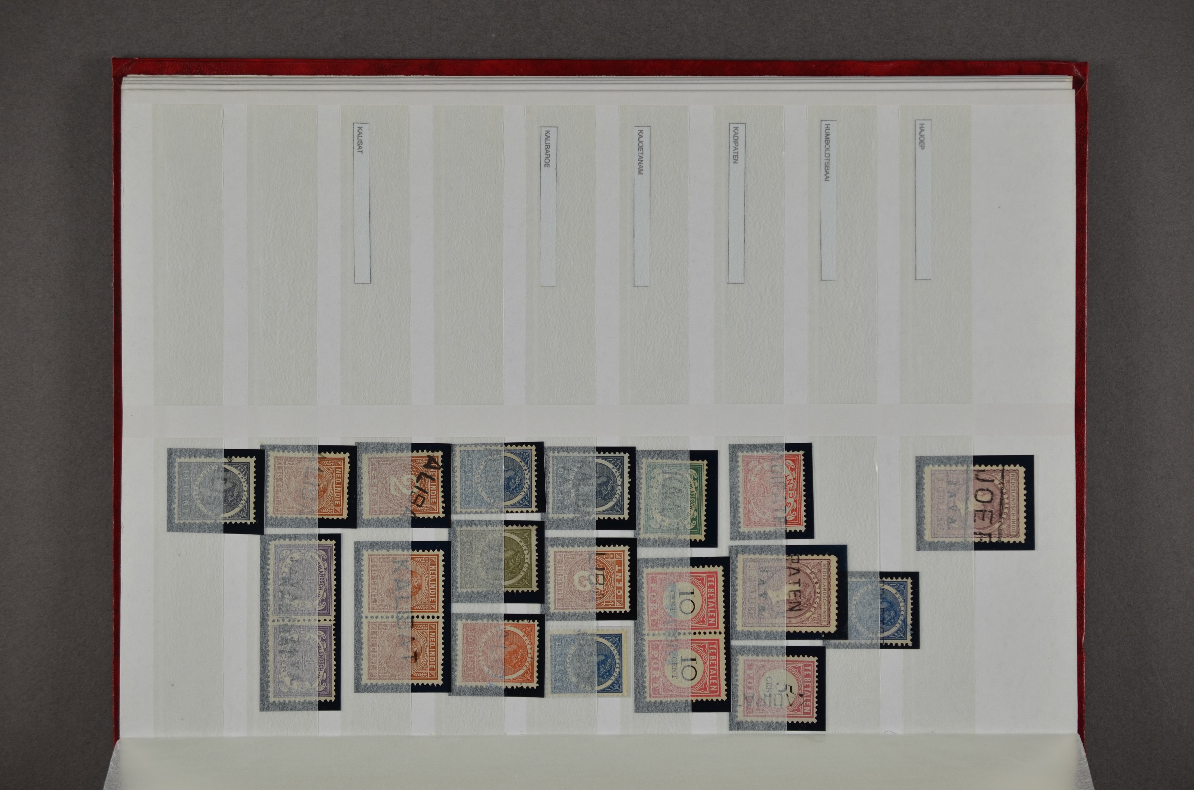 NED.- INDIË naamstempels (zgn. langstempels), uitgebreide collectie op diverse emissies en waarden, ook wat naoorlogse noodstempels, in zwart, blauw, violet en rood, van hulppostkantoren en een enkel bestelhuis en halte, diverse met de pen bijgeschreven datum, veel schaarse en zeer zeldzame stempels als Anjer, Banggai/datum (uit 1925, violet, op nr. 143), Galela, Humboldtsbaai, Laboean, Langsatoenong, Lintido, Malili, Moeara Saibi, Oeloe-Siaoe, Petta, Pladjoe, Prigen, Siak Sri Indrapoera (fragment), Siborongborong (fragment), Sipirok, Takalar, Tandjoeng Poera (met puntstempel 118!), Tjoeroep, Tobelo, Welahan, etc. Prachtig object om te detailleren of op te zetten en de moeilijke manco´s te zoeken!