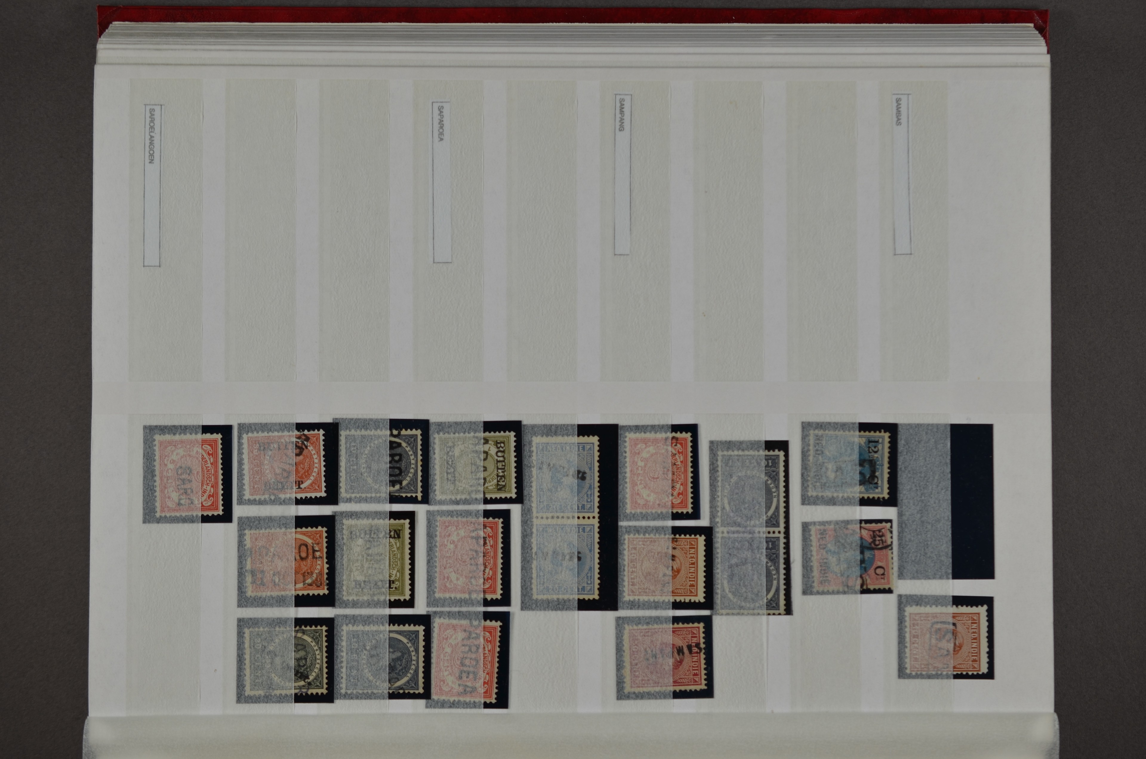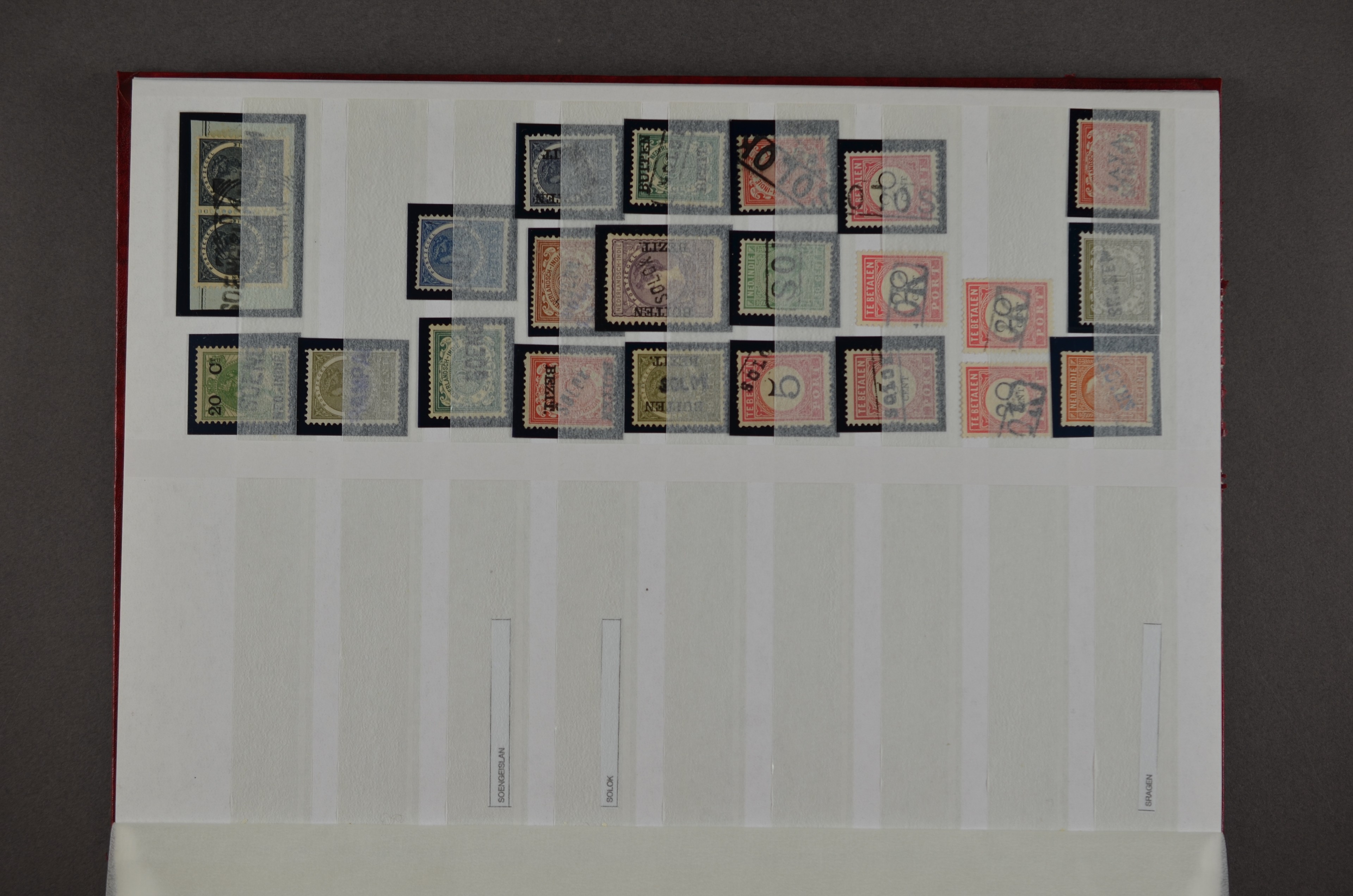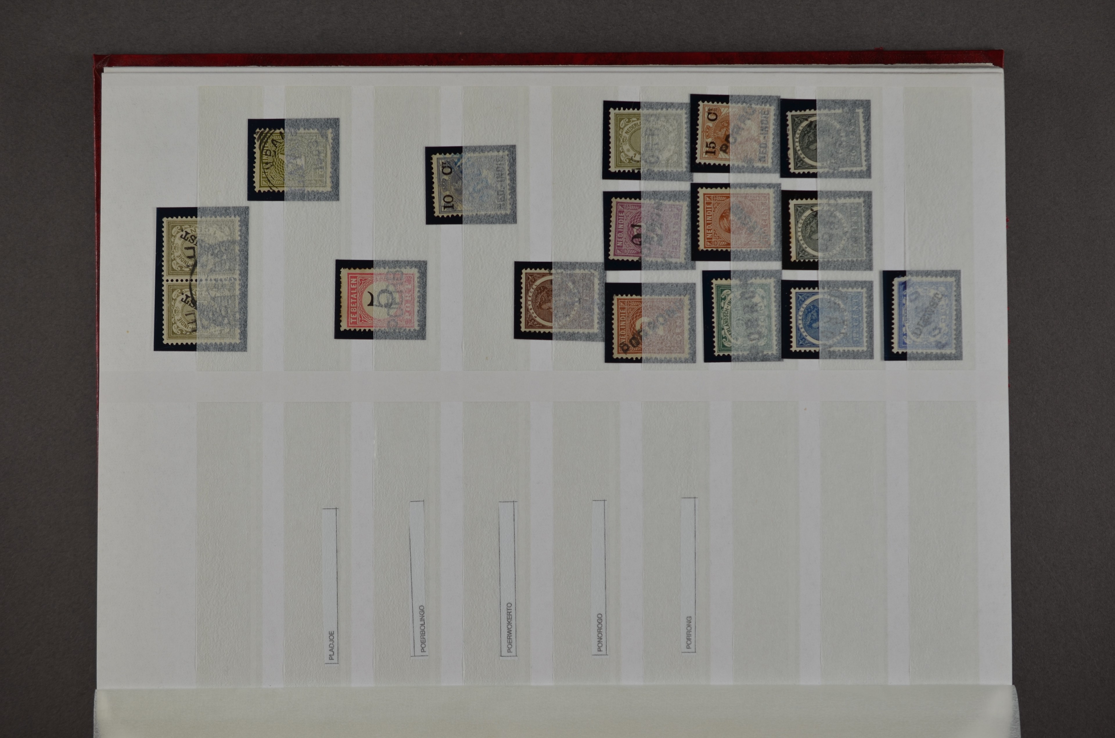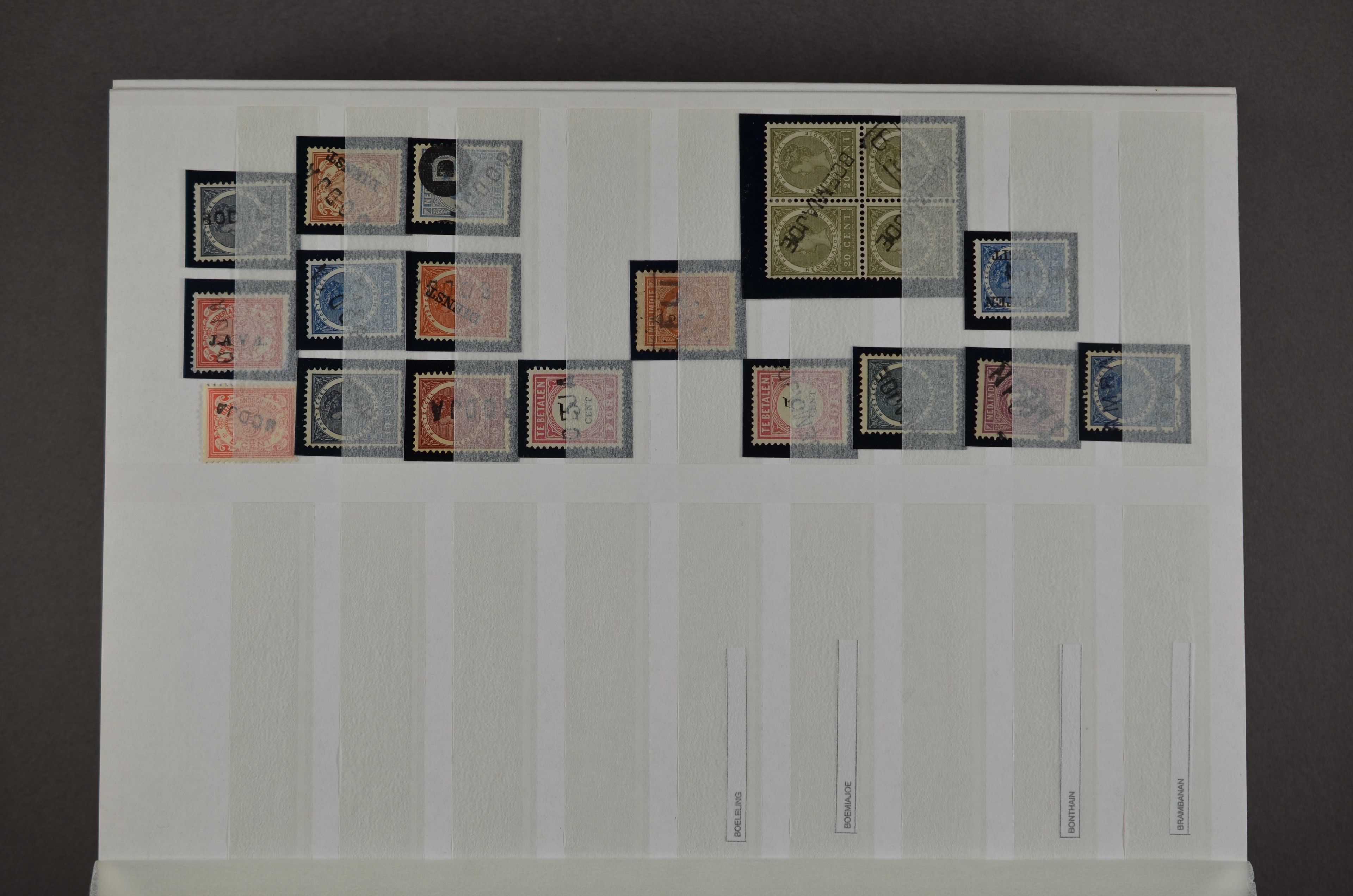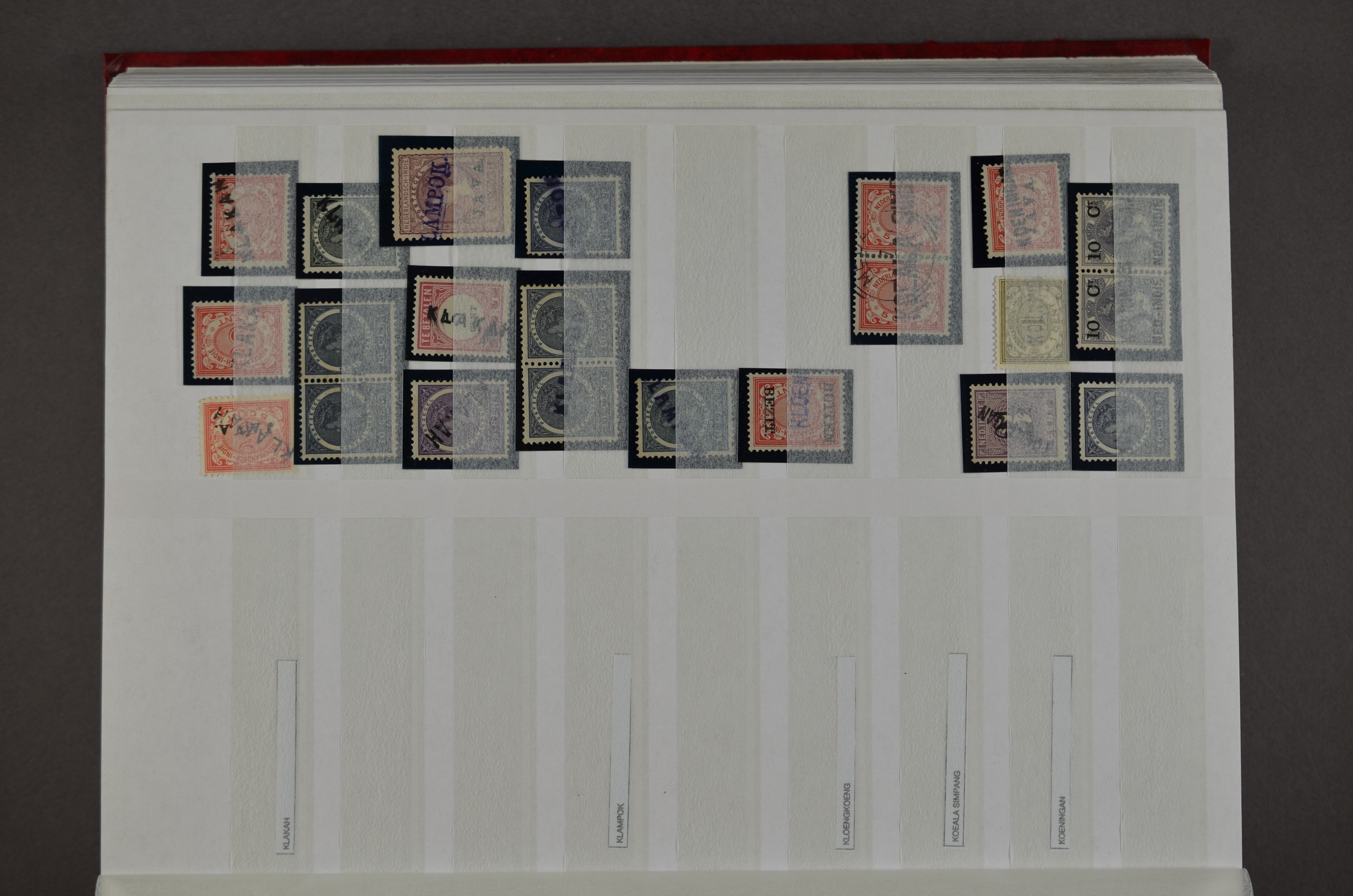 NED.- INDIË naamstempels (zgn. langstempels), uitgebreide collectie op diverse emissies en waarden, ook wat naoorlogse noodstempels, in zwart, blauw, violet en rood, van hulppostkantoren en een enkel bestelhuis en halte, diverse met de pen bijgeschreven datum, veel schaarse en zeer zeldzame stempels als Anjer, Banggai/datum (uit 1925, violet, op nr. 143), Galela, Humboldtsbaai, Laboean, Langsatoenong, Lintido, Malili, Moeara Saibi, Oeloe-Siaoe, Petta, Pladjoe, Prigen, Siak Sri Indrapoera (fragment), Siborongborong (fragment), Sipirok, Takalar, Tandjoeng Poera (met puntstempel 118!), Tjoeroep, Tobelo, Welahan, etc. Prachtig object om te detailleren of op te zetten en de moeilijke manco´s te zoeken!