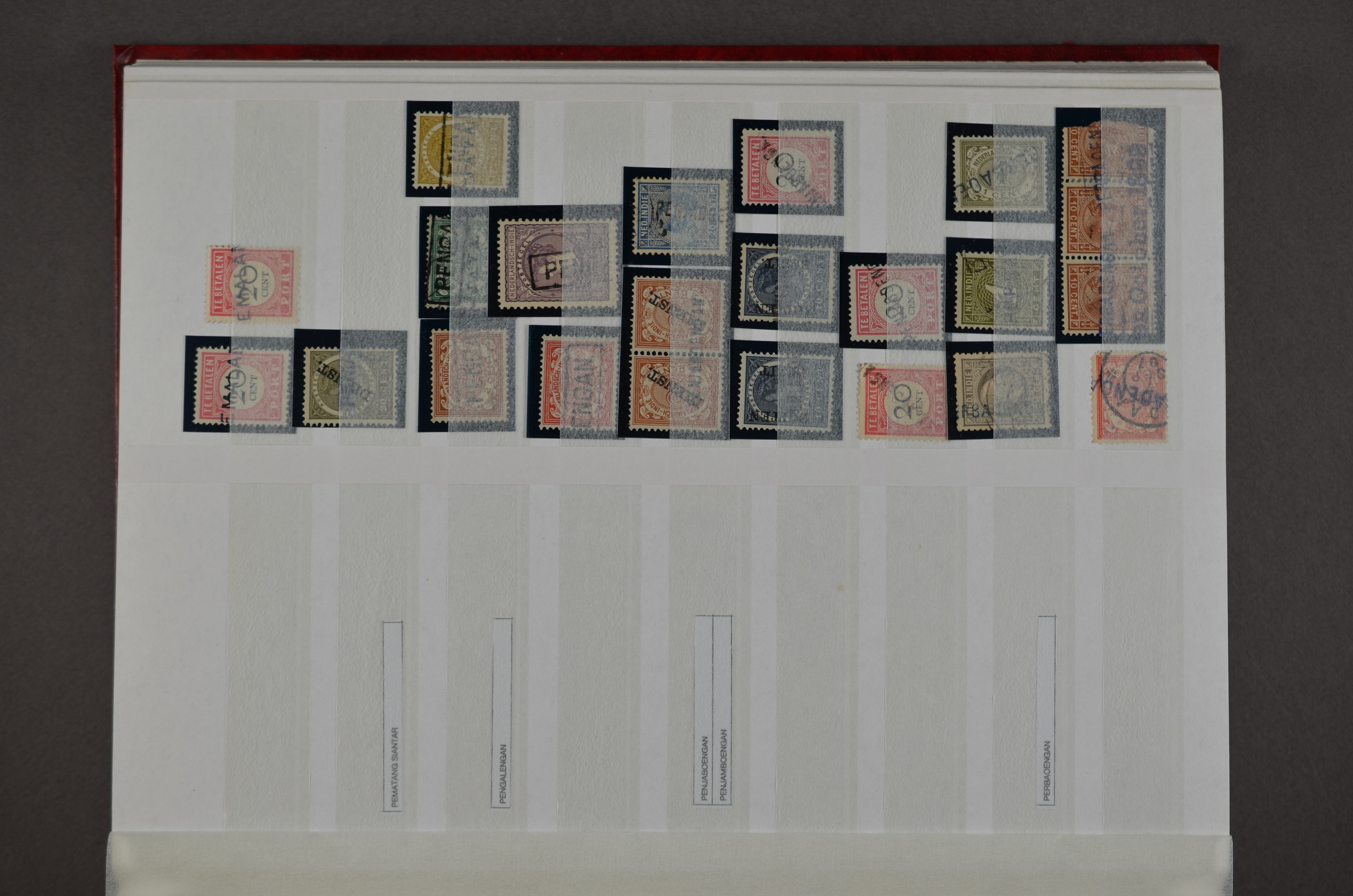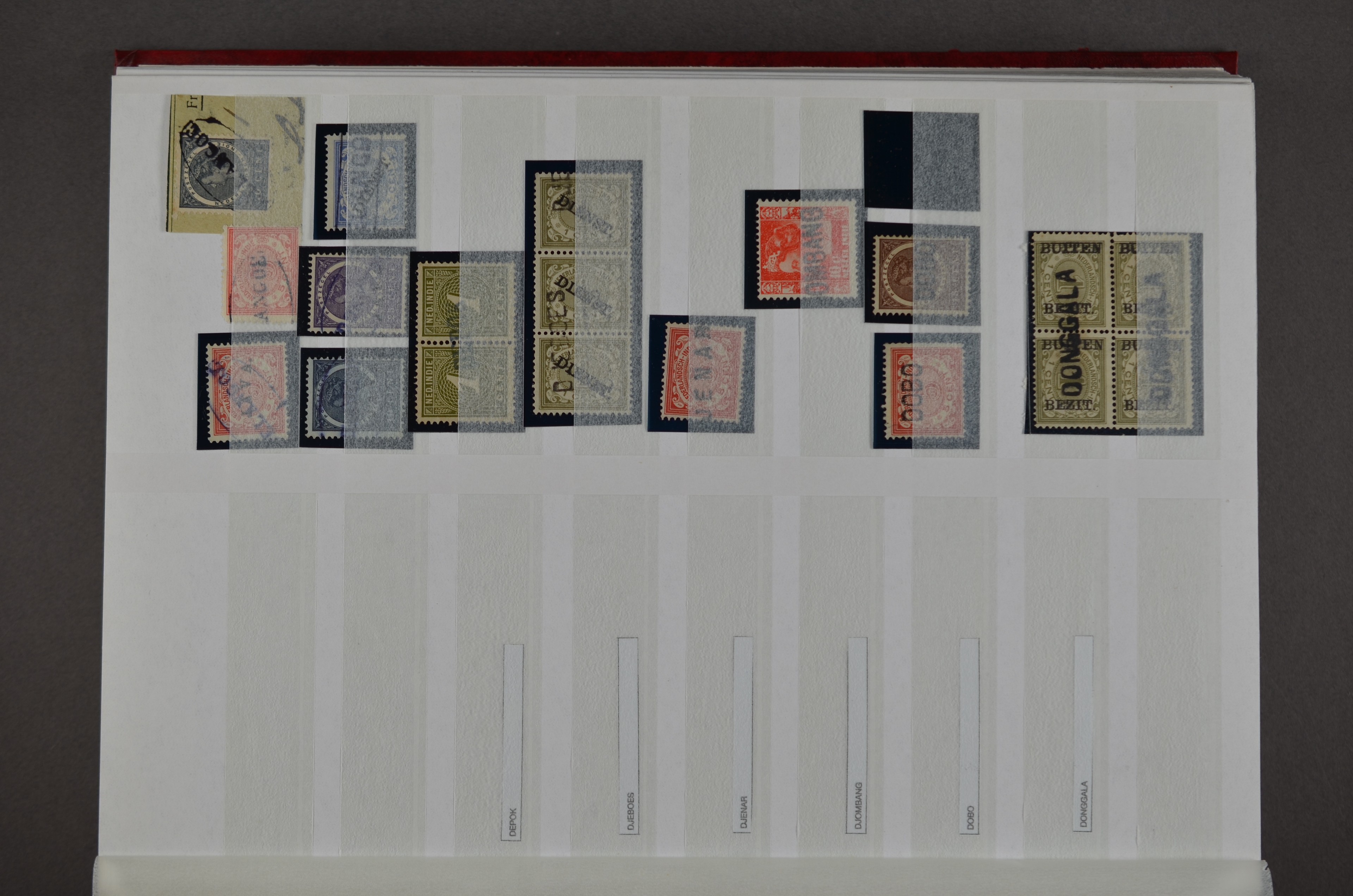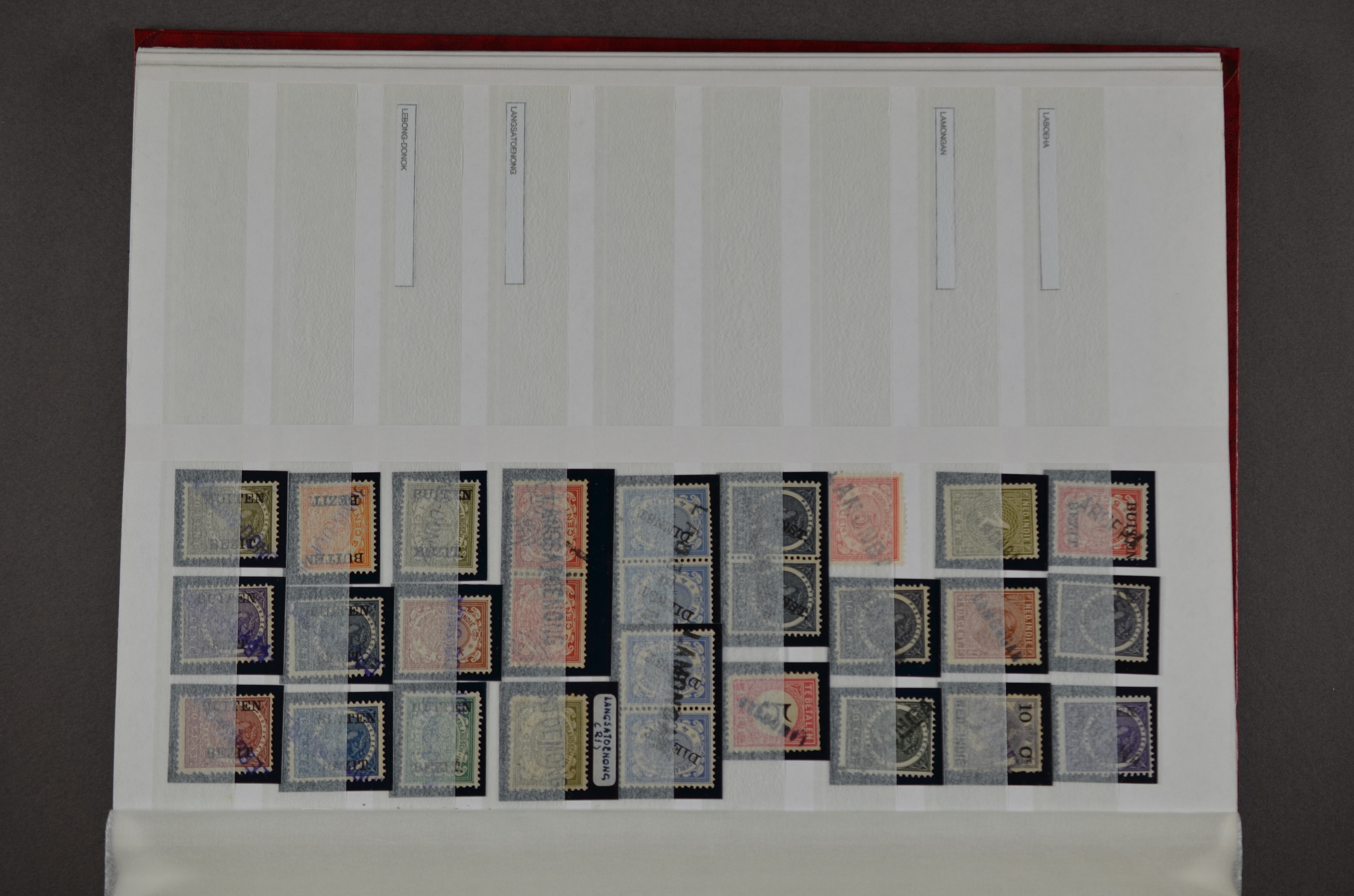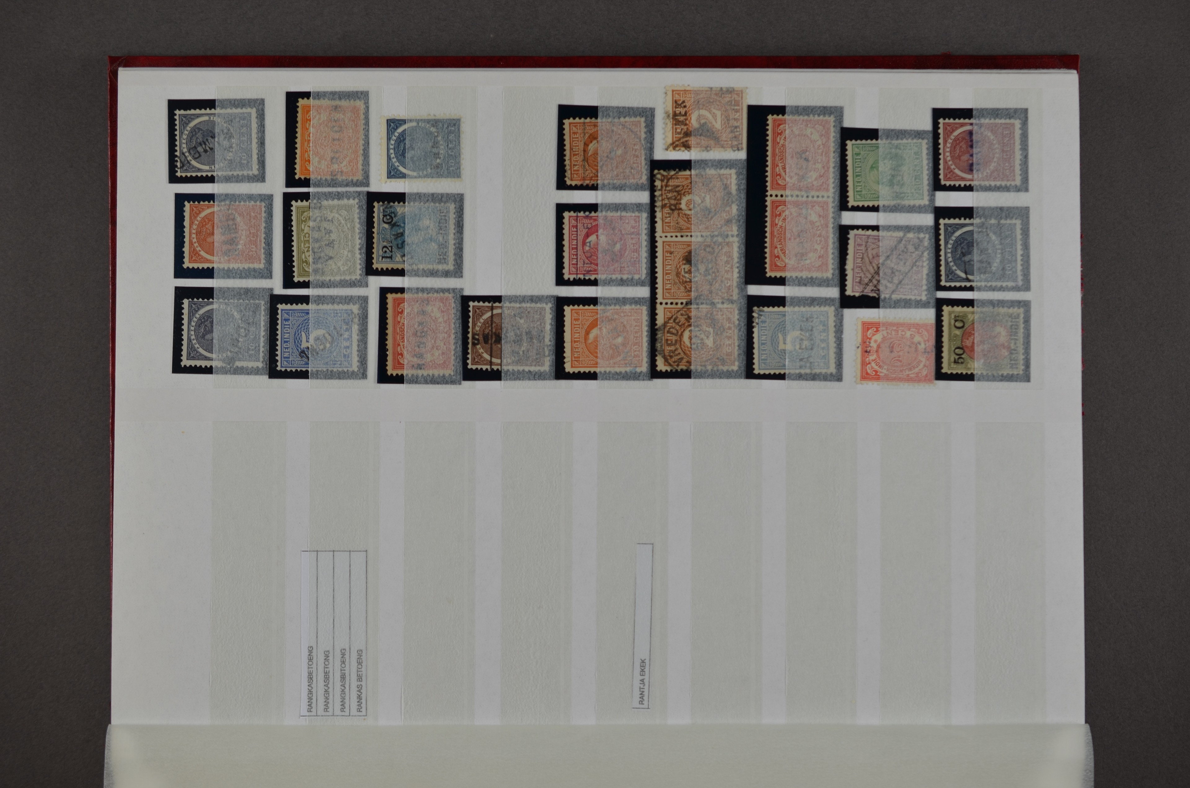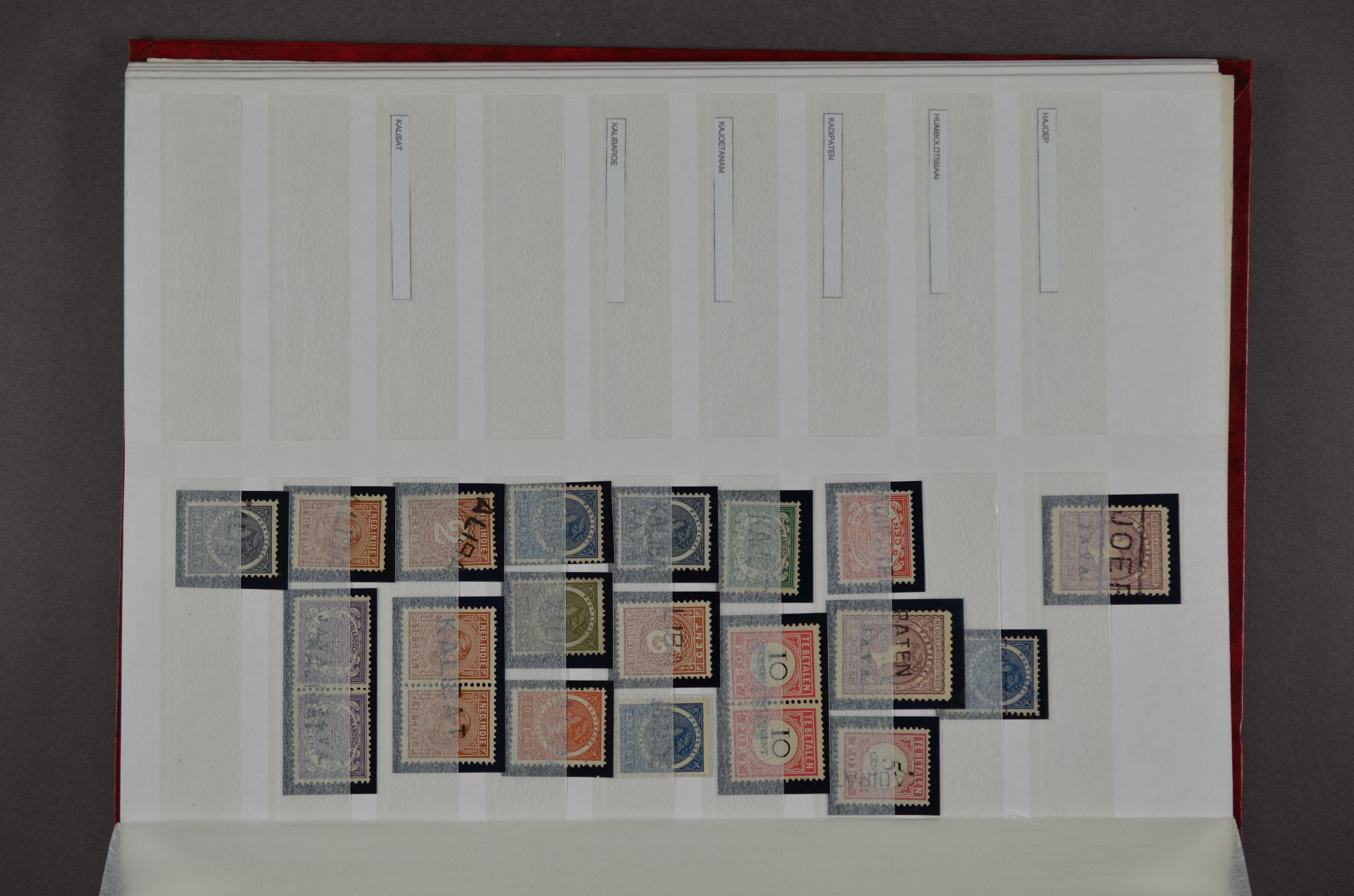 NED.- INDIË naamstempels (zgn. langstempels), uitgebreide collectie op diverse emissies en waarden, ook wat naoorlogse noodstempels, in zwart, blauw, violet en rood, van hulppostkantoren en een enkel bestelhuis en halte, diverse met de pen bijgeschreven datum, veel schaarse en zeer zeldzame stempels als Anjer, Banggai/datum (uit 1925, violet, op nr. 143), Galela, Humboldtsbaai, Laboean, Langsatoenong, Lintido, Malili, Moeara Saibi, Oeloe-Siaoe, Petta, Pladjoe, Prigen, Siak Sri Indrapoera (fragment), Siborongborong (fragment), Sipirok, Takalar, Tandjoeng Poera (met puntstempel 118!), Tjoeroep, Tobelo, Welahan, etc. Prachtig object om te detailleren of op te zetten en de moeilijke manco´s te zoeken!