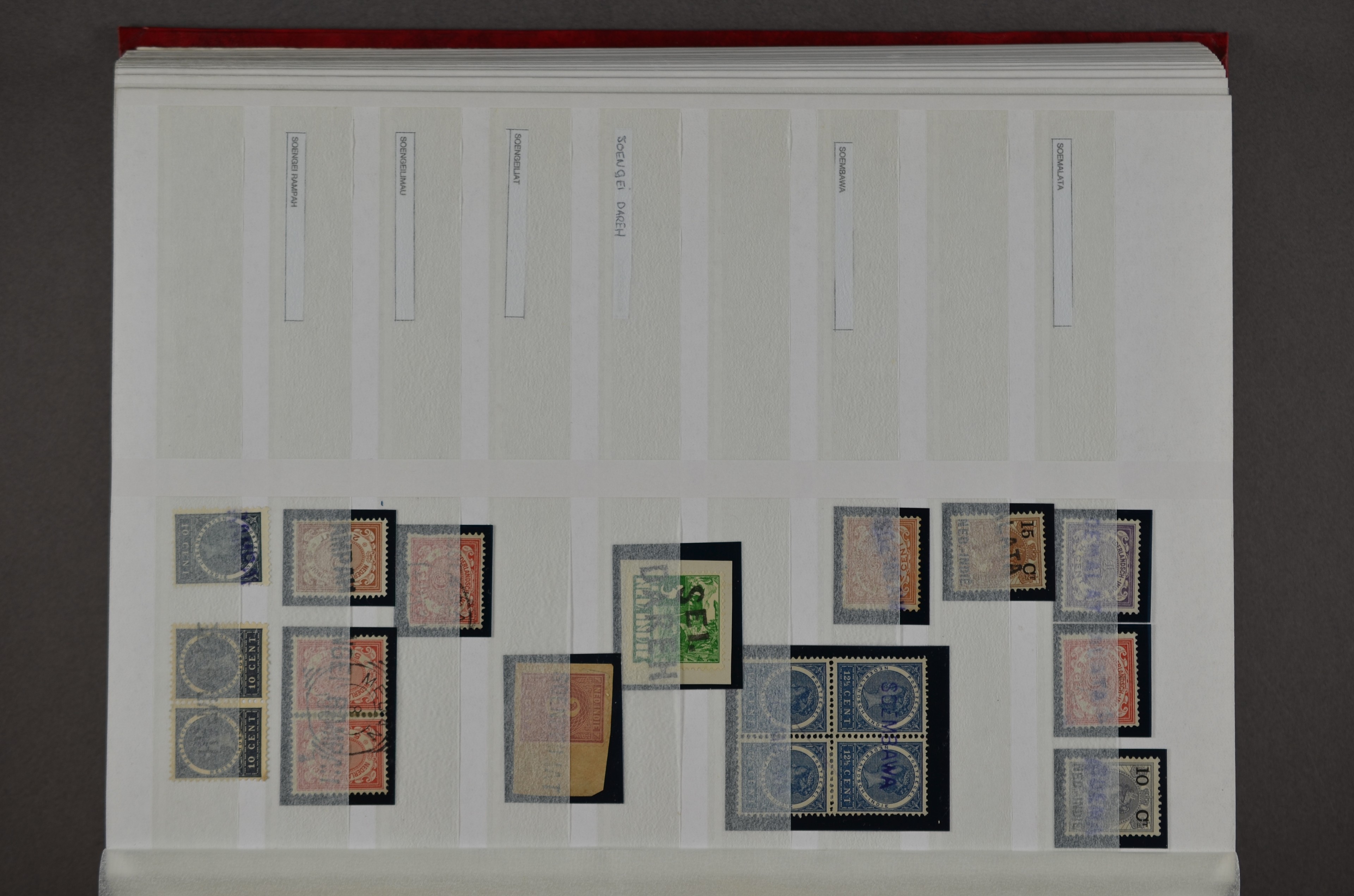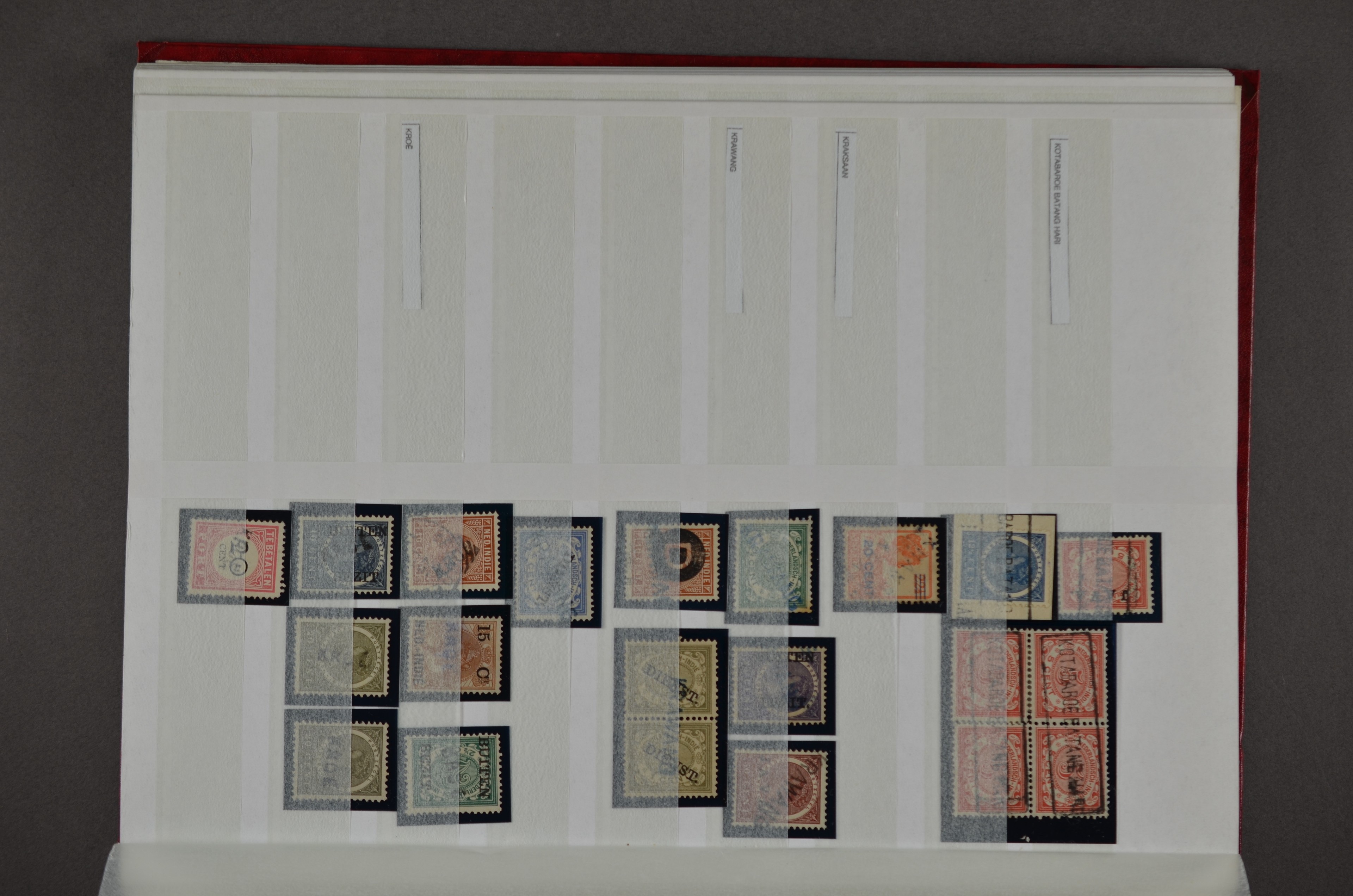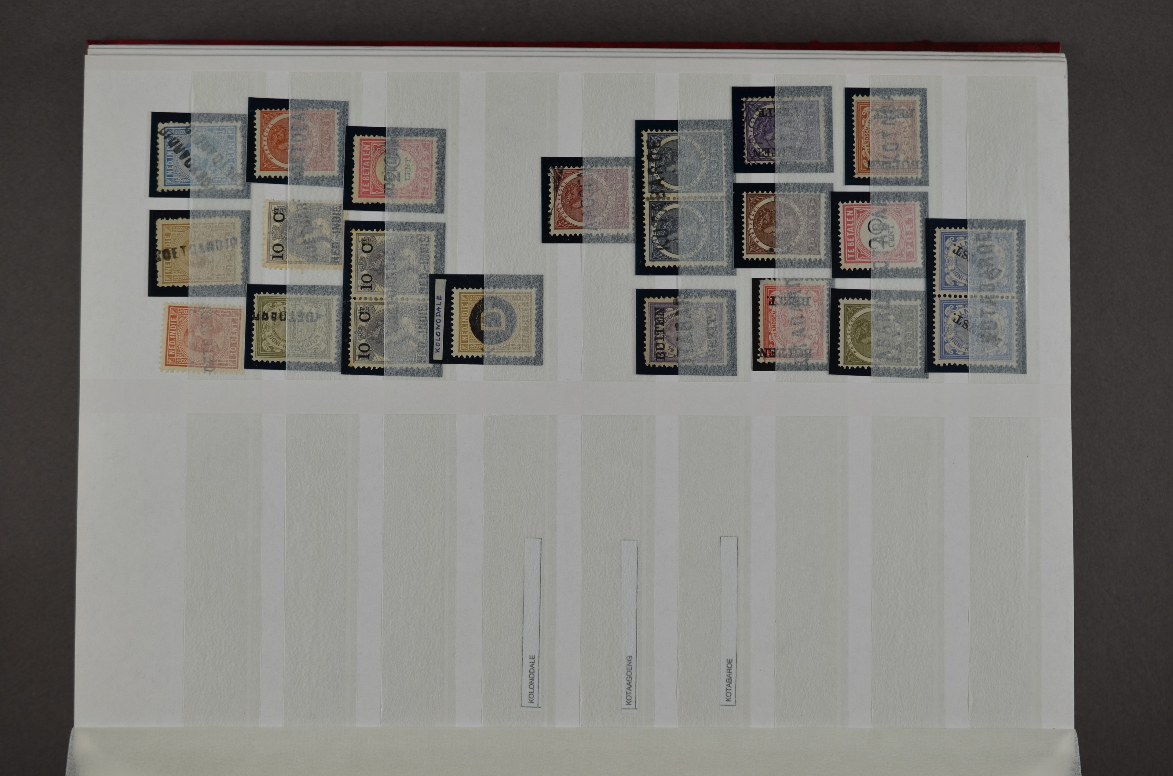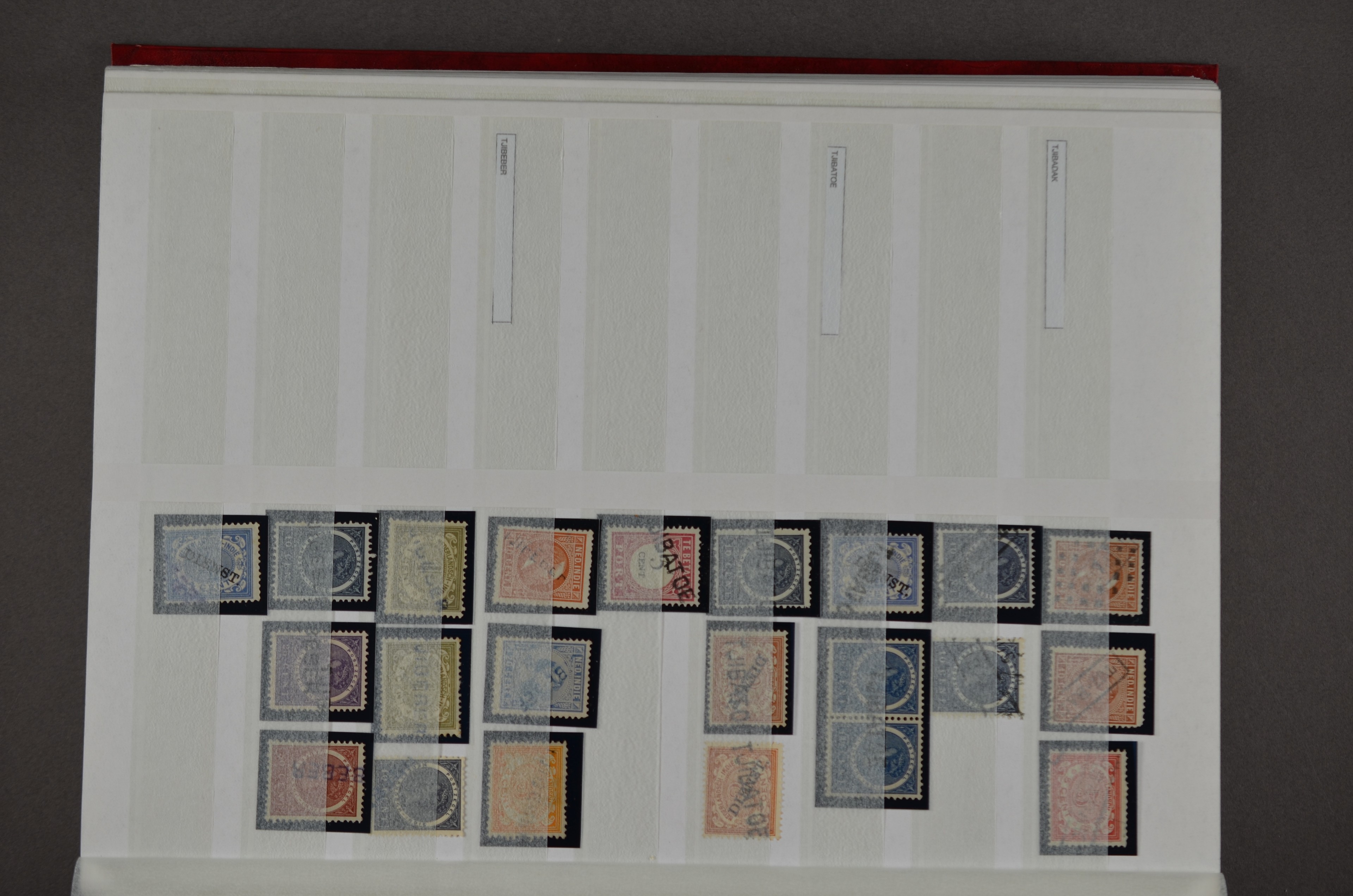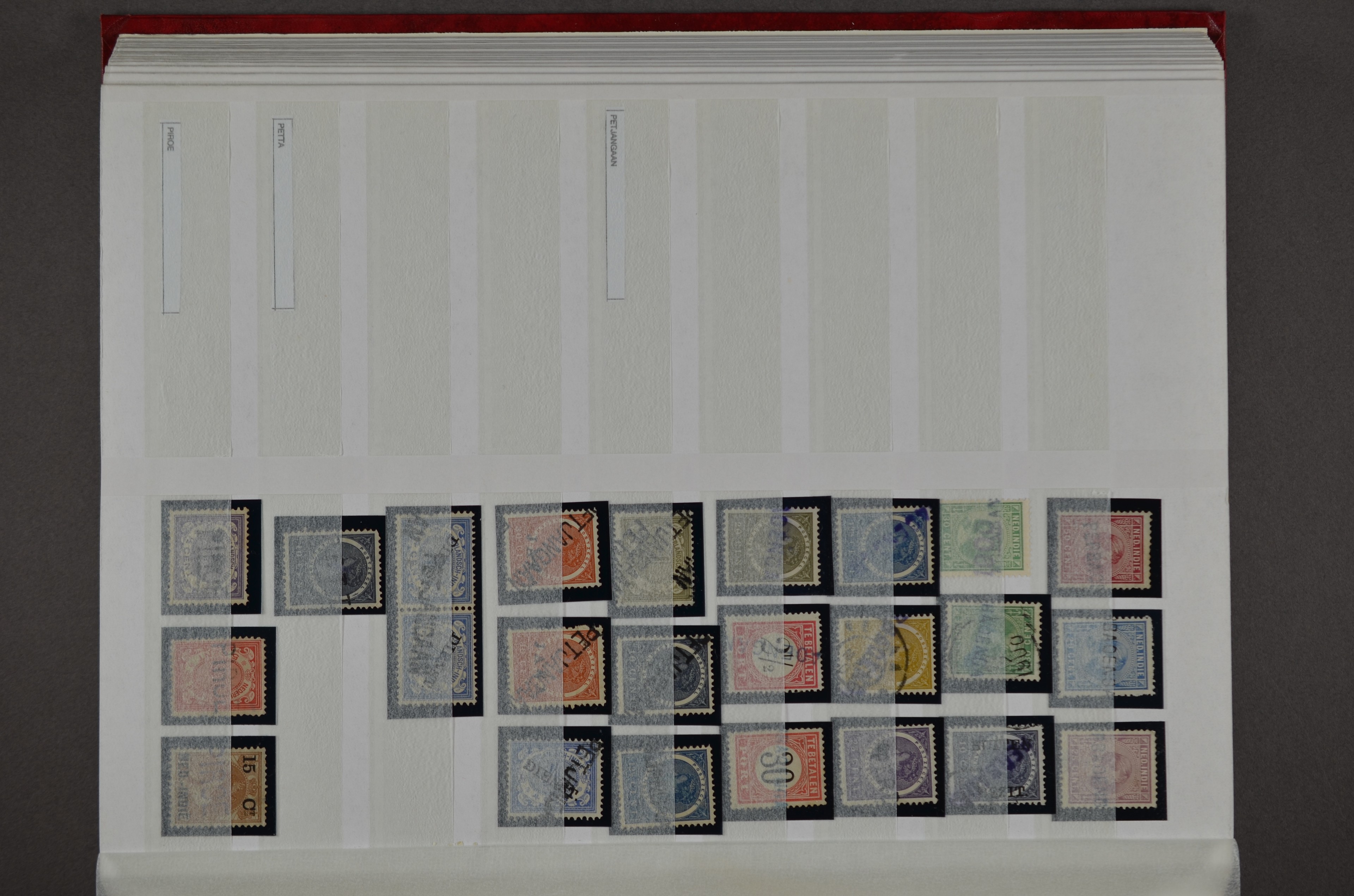 NED.- INDIË naamstempels (zgn. langstempels), uitgebreide collectie op diverse emissies en waarden, ook wat naoorlogse noodstempels, in zwart, blauw, violet en rood, van hulppostkantoren en een enkel bestelhuis en halte, diverse met de pen bijgeschreven datum, veel schaarse en zeer zeldzame stempels als Anjer, Banggai/datum (uit 1925, violet, op nr. 143), Galela, Humboldtsbaai, Laboean, Langsatoenong, Lintido, Malili, Moeara Saibi, Oeloe-Siaoe, Petta, Pladjoe, Prigen, Siak Sri Indrapoera (fragment), Siborongborong (fragment), Sipirok, Takalar, Tandjoeng Poera (met puntstempel 118!), Tjoeroep, Tobelo, Welahan, etc. Prachtig object om te detailleren of op te zetten en de moeilijke manco´s te zoeken!