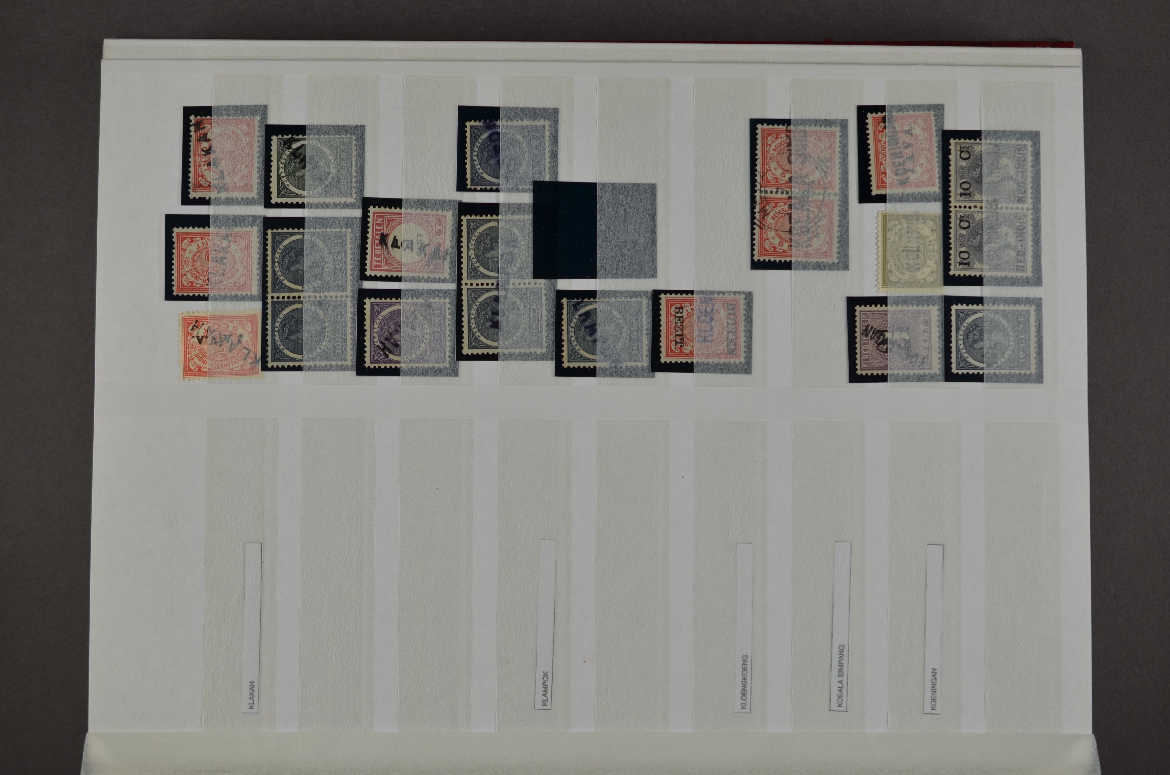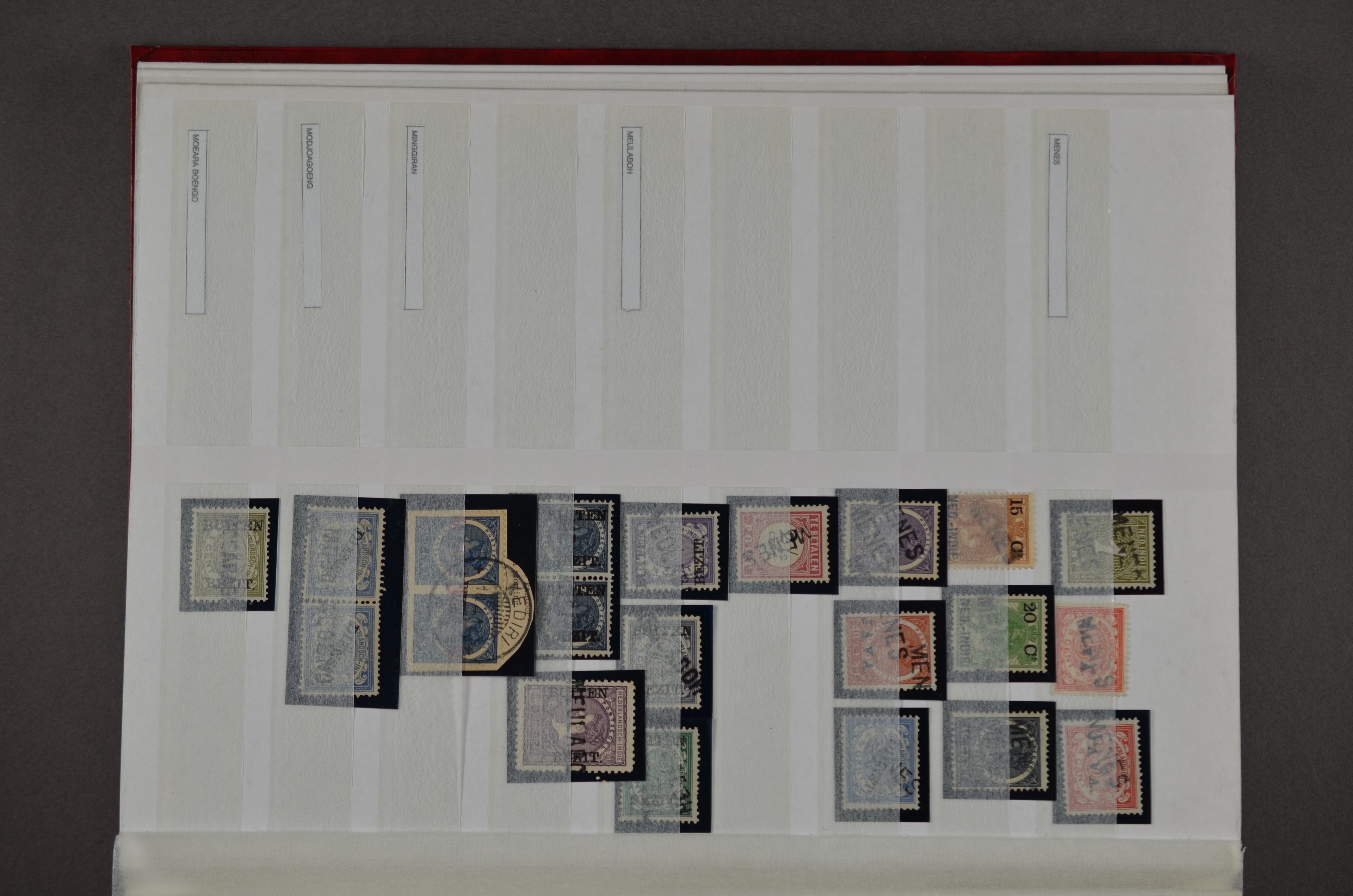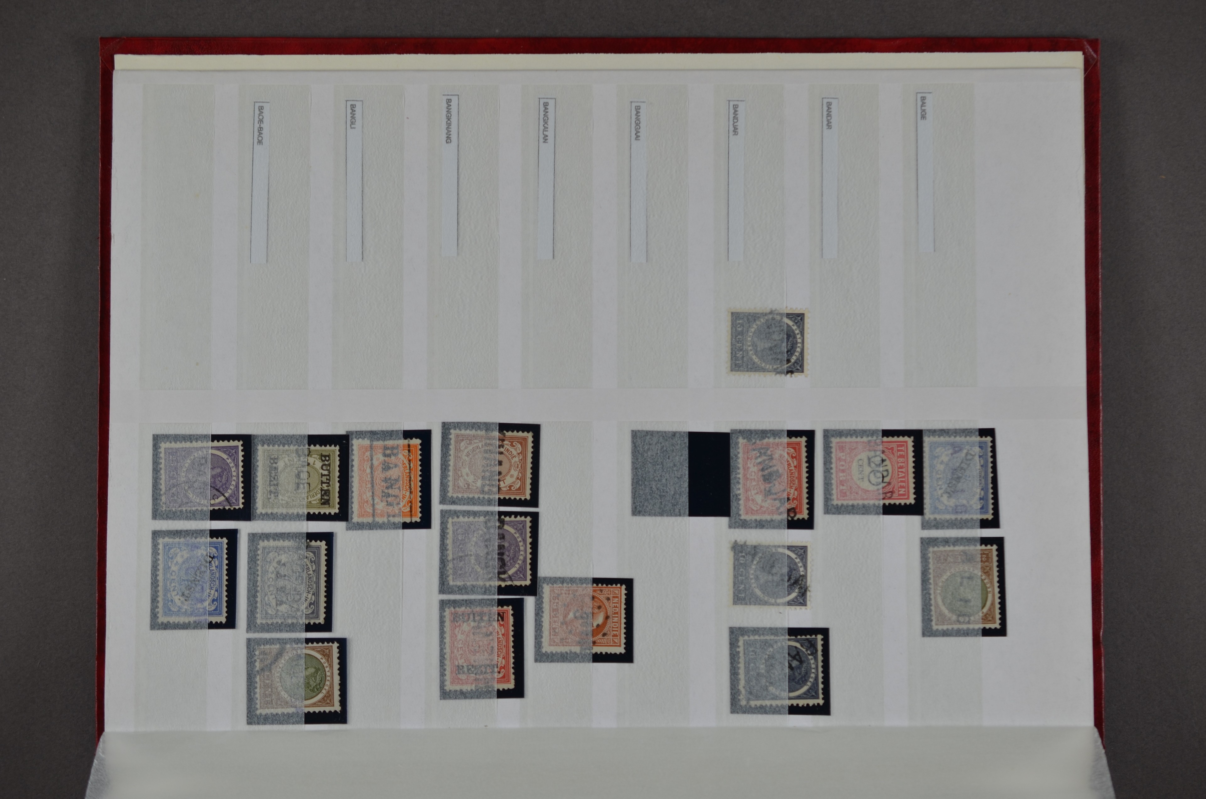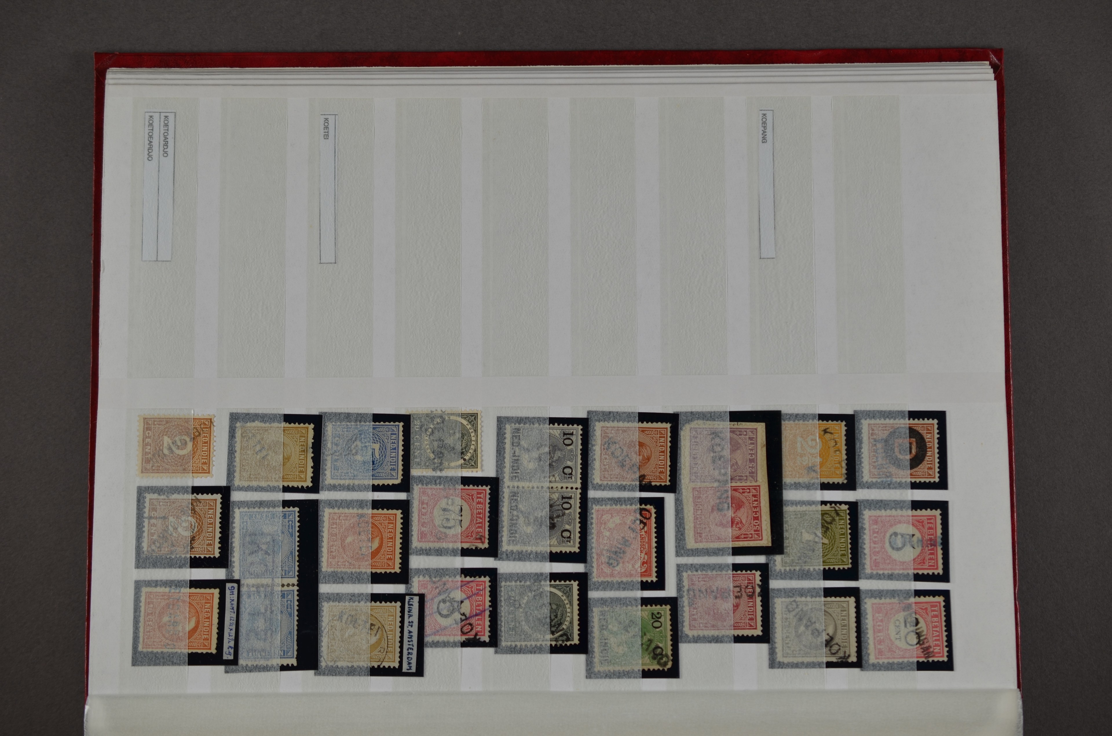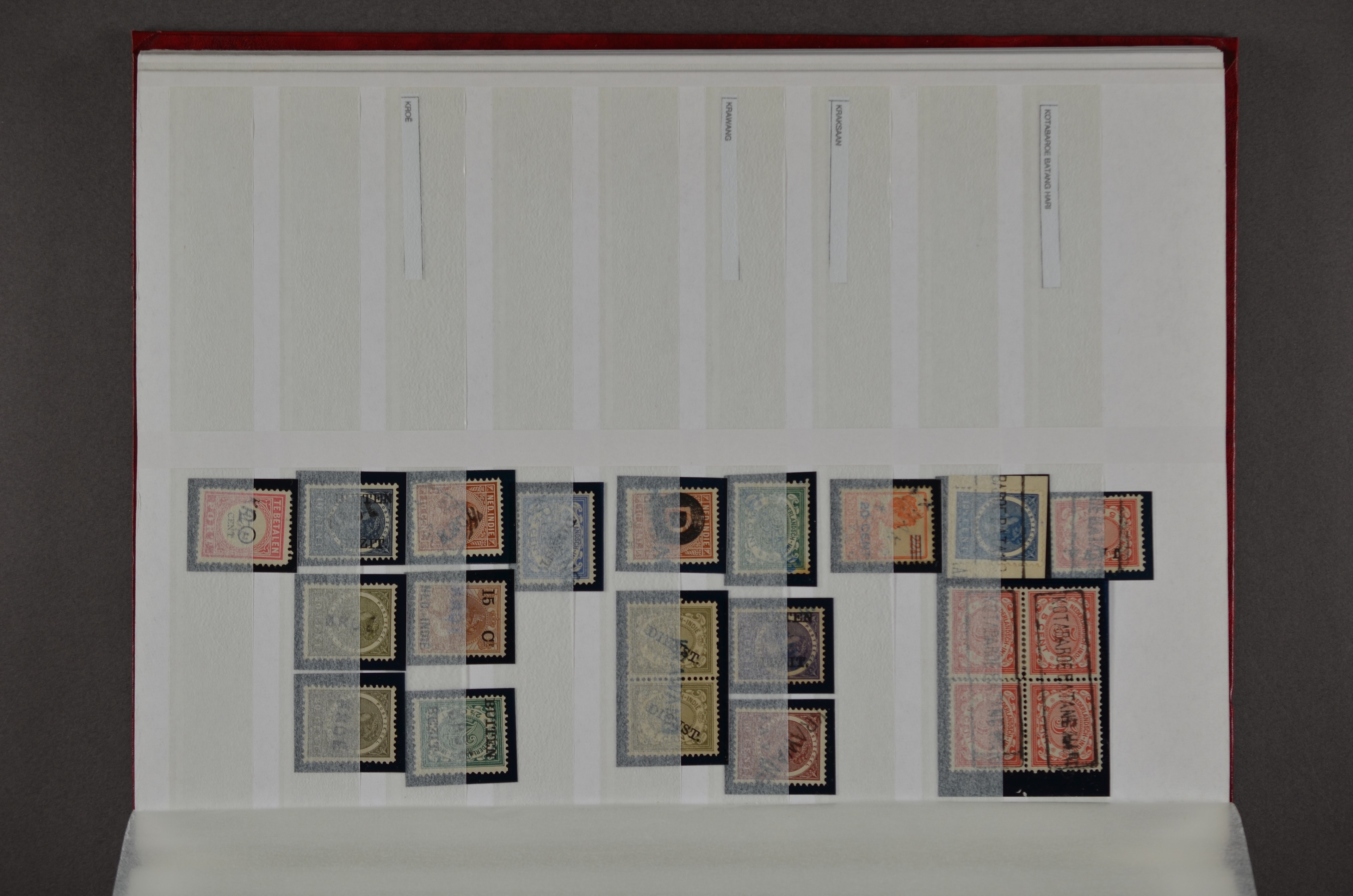NED.- INDIË naamstempels (zgn. langstempels), uitgebreide collectie op diverse emissies en waarden, ook wat naoorlogse noodstempels, in zwart, blauw, violet en rood, van hulppostkantoren en een enkel bestelhuis en halte, diverse met de pen bijgeschreven datum, veel schaarse en zeer zeldzame stempels als Anjer, Banggai/datum (uit 1925, violet, op nr. 143), Galela, Humboldtsbaai, Laboean, Langsatoenong, Lintido, Malili, Moeara Saibi, Oeloe-Siaoe, Petta, Pladjoe, Prigen, Siak Sri Indrapoera (fragment), Siborongborong (fragment), Sipirok, Takalar, Tandjoeng Poera (met puntstempel 118!), Tjoeroep, Tobelo, Welahan, etc. Prachtig object om te detailleren of op te zetten en de moeilijke manco´s te zoeken!