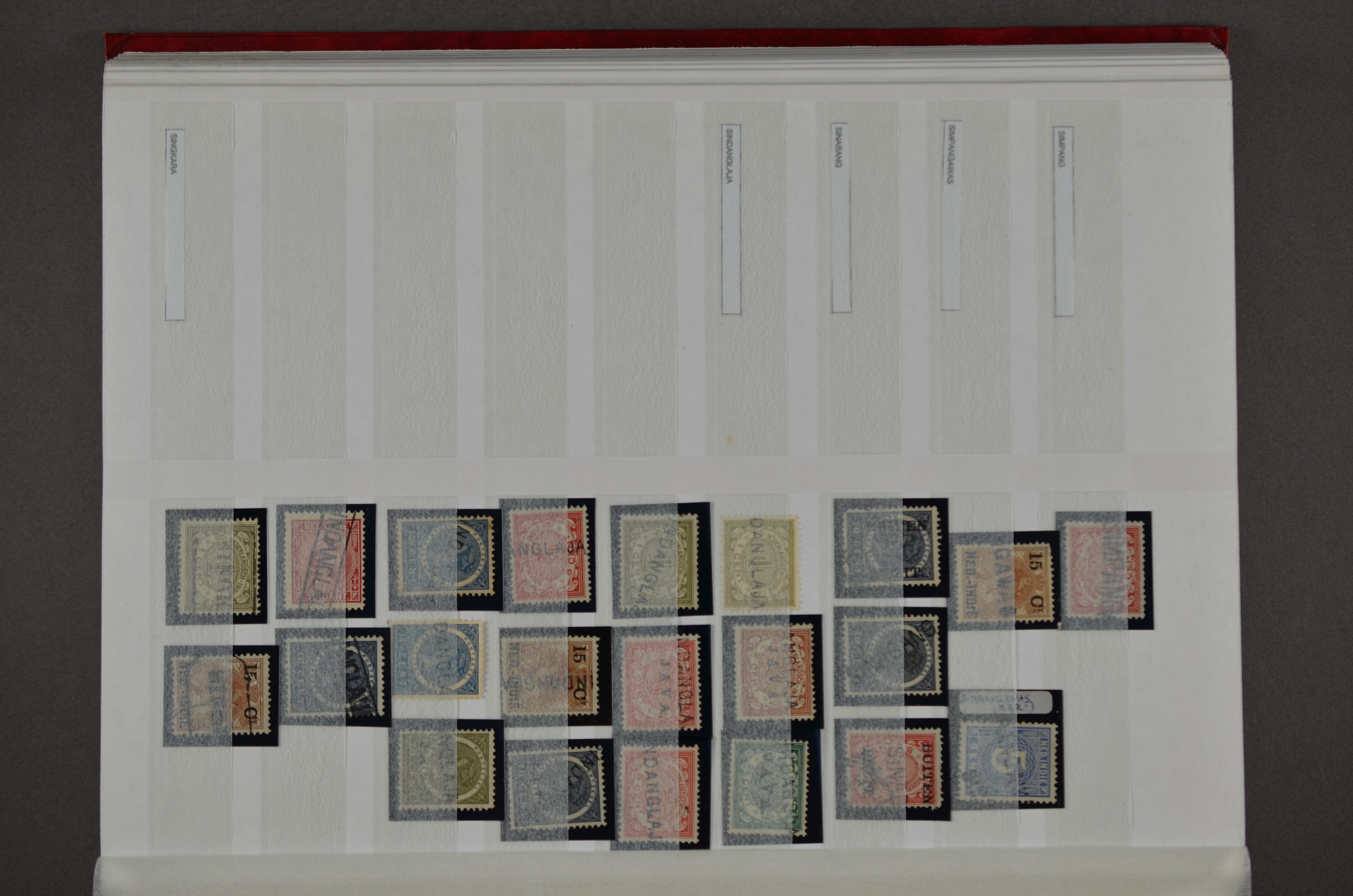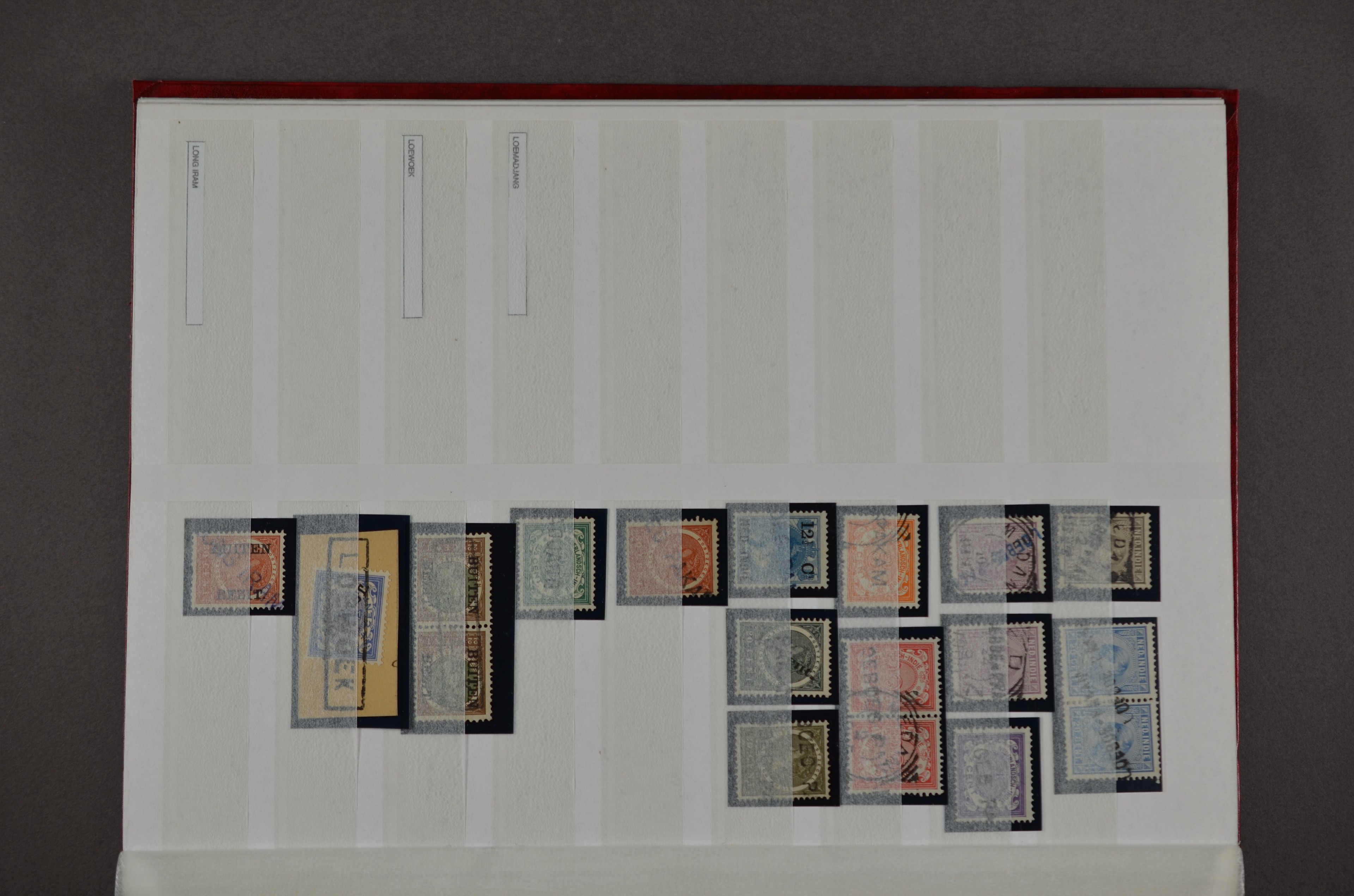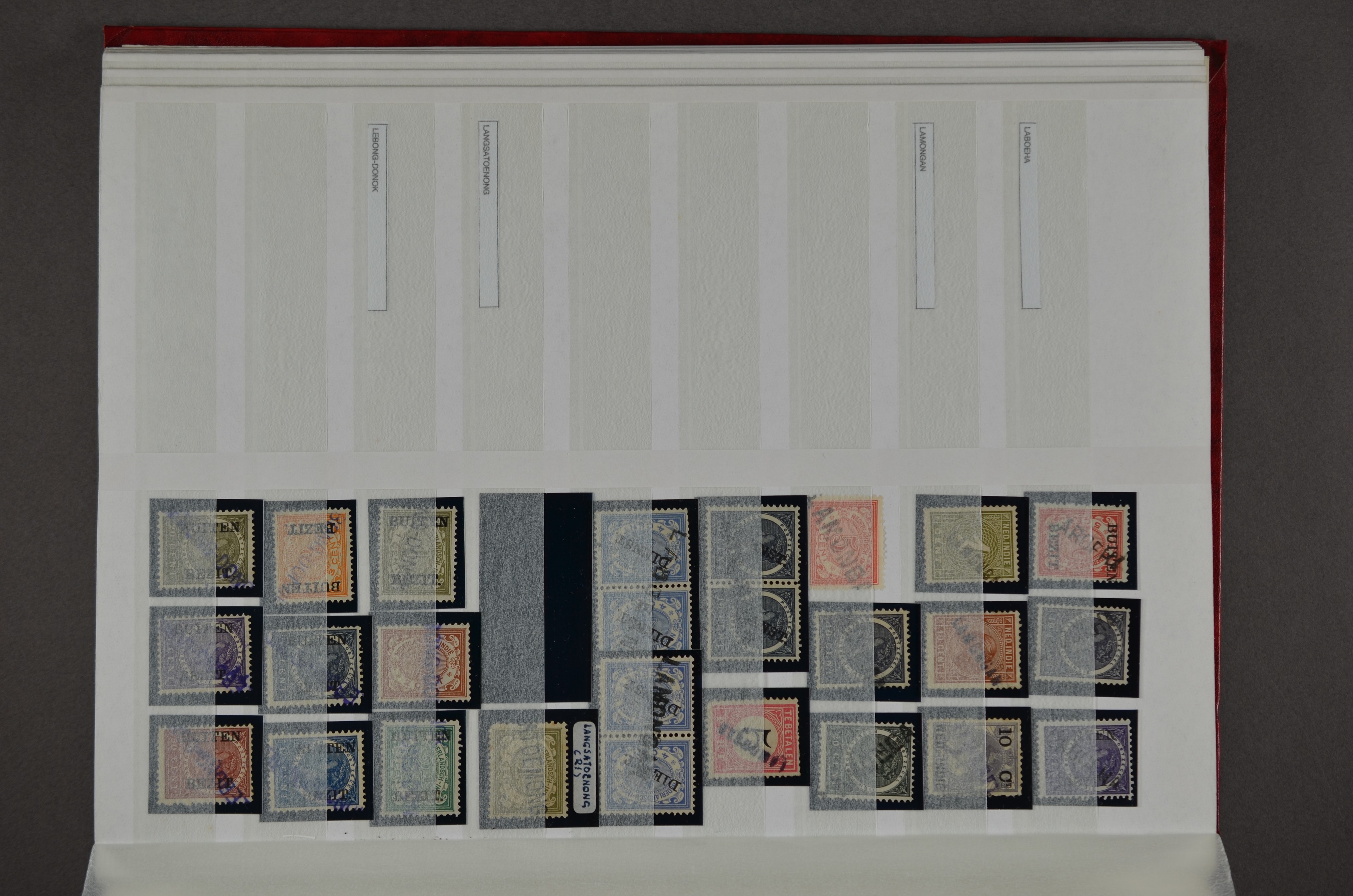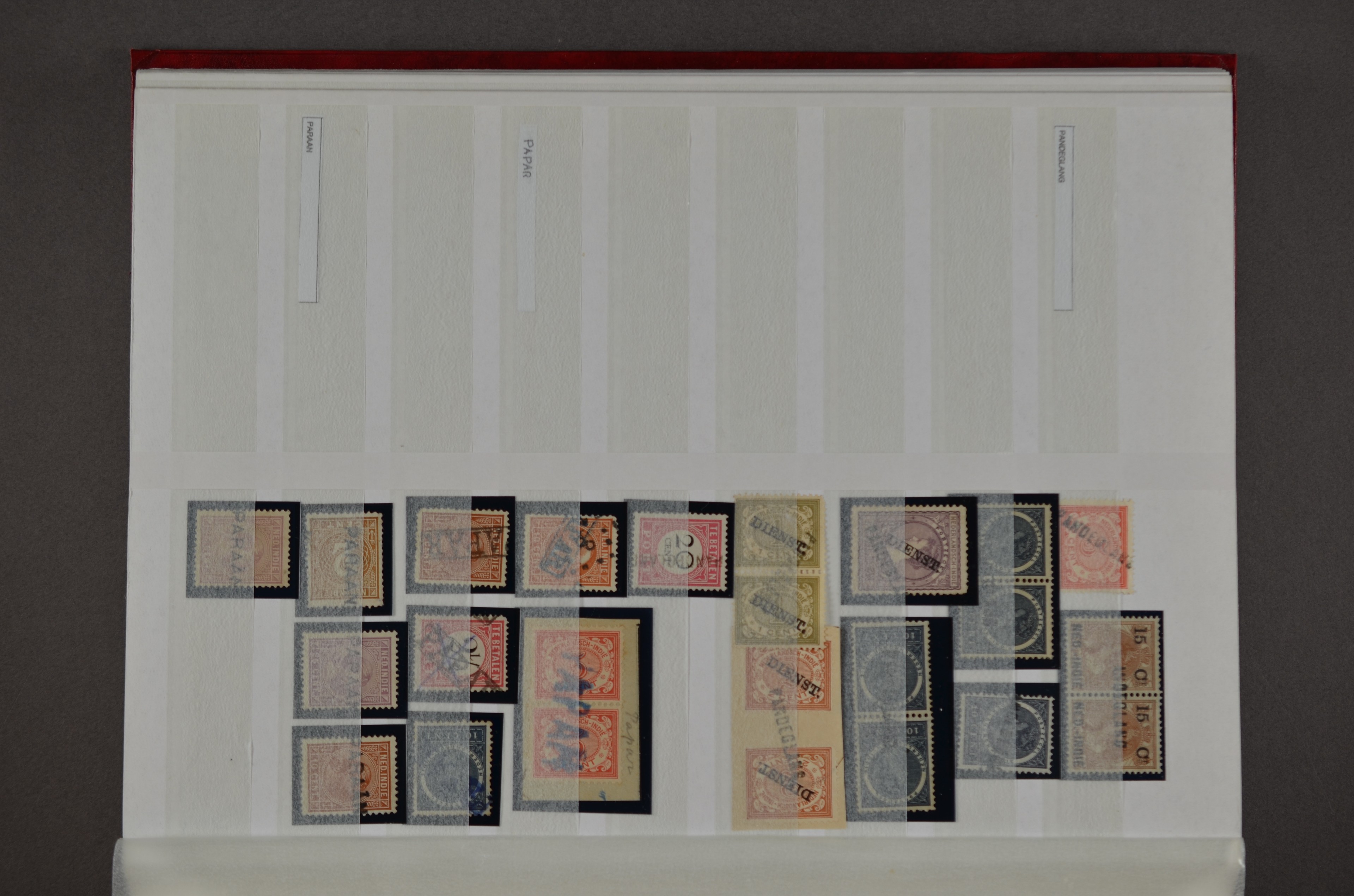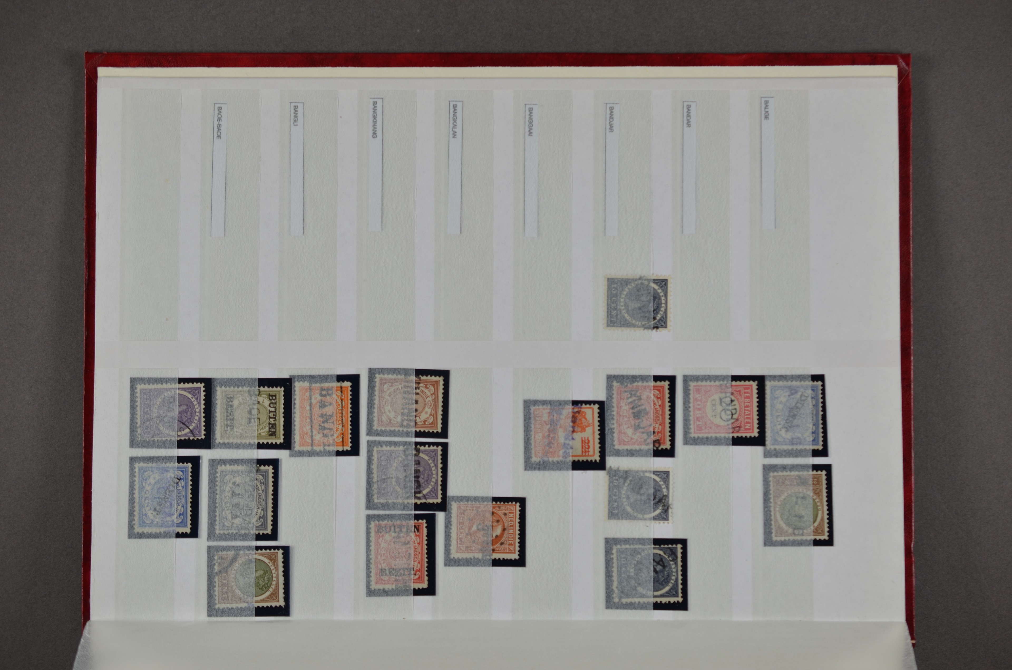 NED.- INDIË naamstempels (zgn. langstempels), uitgebreide collectie op diverse emissies en waarden, ook wat naoorlogse noodstempels, in zwart, blauw, violet en rood, van hulppostkantoren en een enkel bestelhuis en halte, diverse met de pen bijgeschreven datum, veel schaarse en zeer zeldzame stempels als Anjer, Banggai/datum (uit 1925, violet, op nr. 143), Galela, Humboldtsbaai, Laboean, Langsatoenong, Lintido, Malili, Moeara Saibi, Oeloe-Siaoe, Petta, Pladjoe, Prigen, Siak Sri Indrapoera (fragment), Siborongborong (fragment), Sipirok, Takalar, Tandjoeng Poera (met puntstempel 118!), Tjoeroep, Tobelo, Welahan, etc. Prachtig object om te detailleren of op te zetten en de moeilijke manco´s te zoeken!