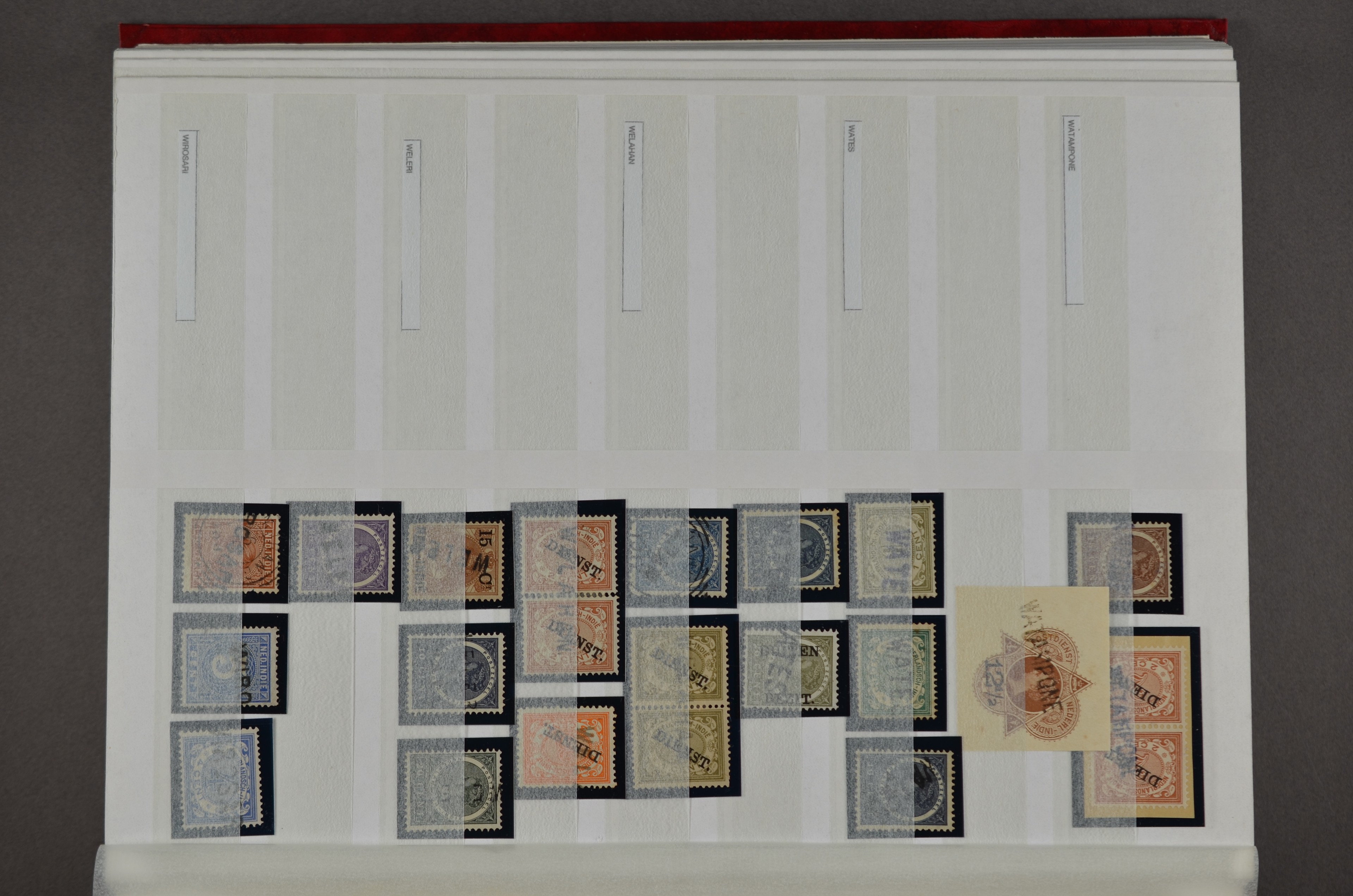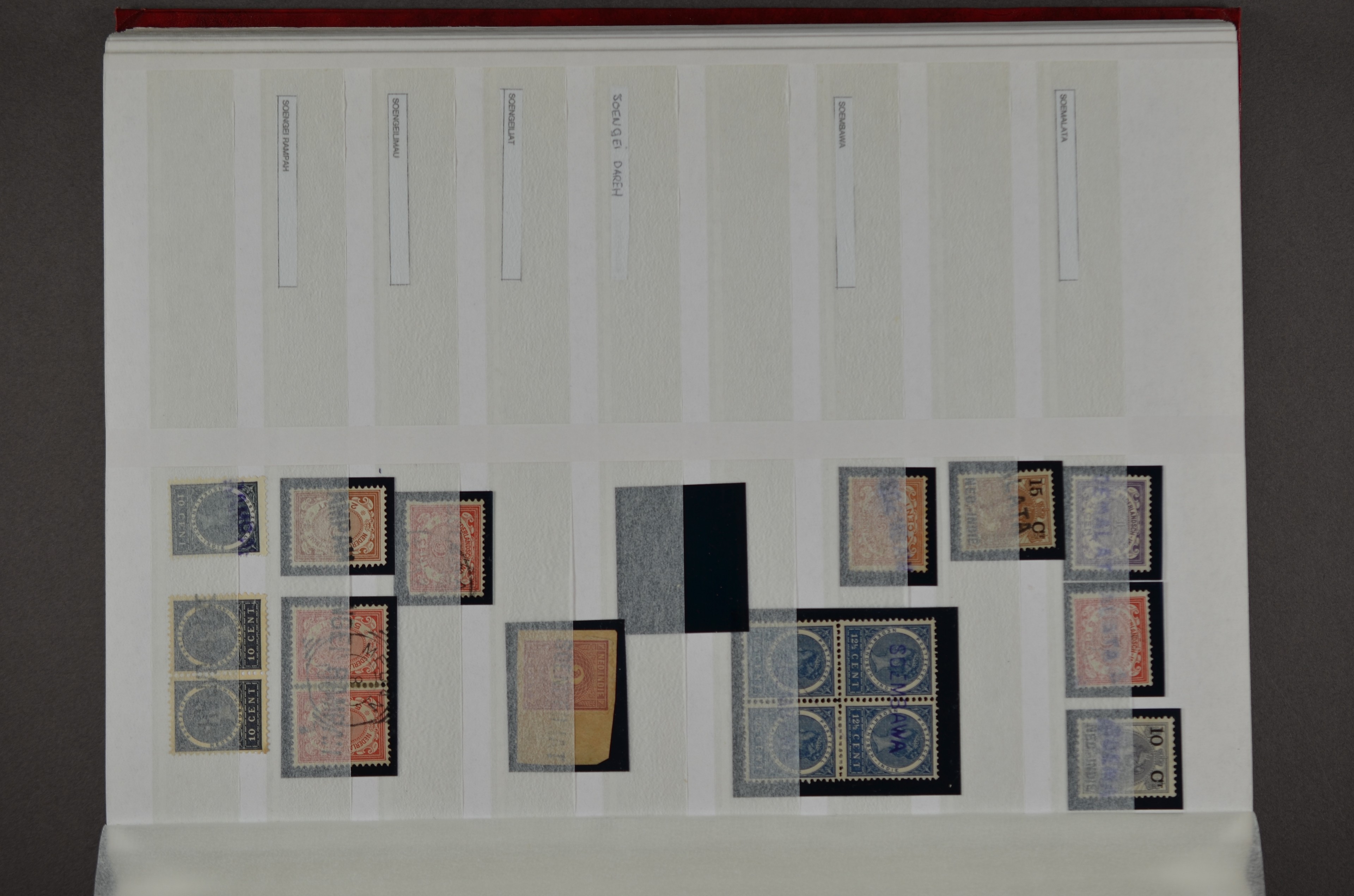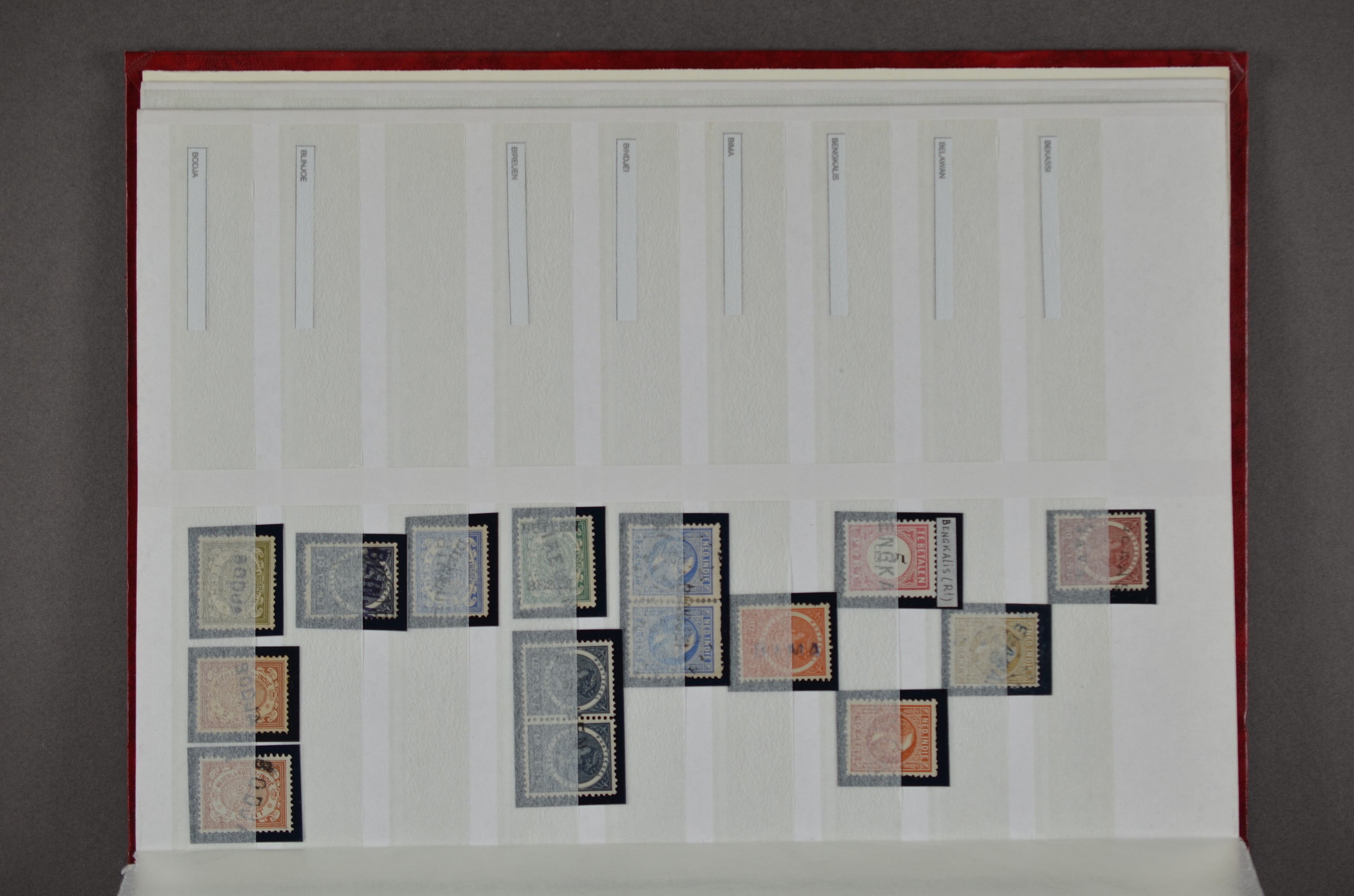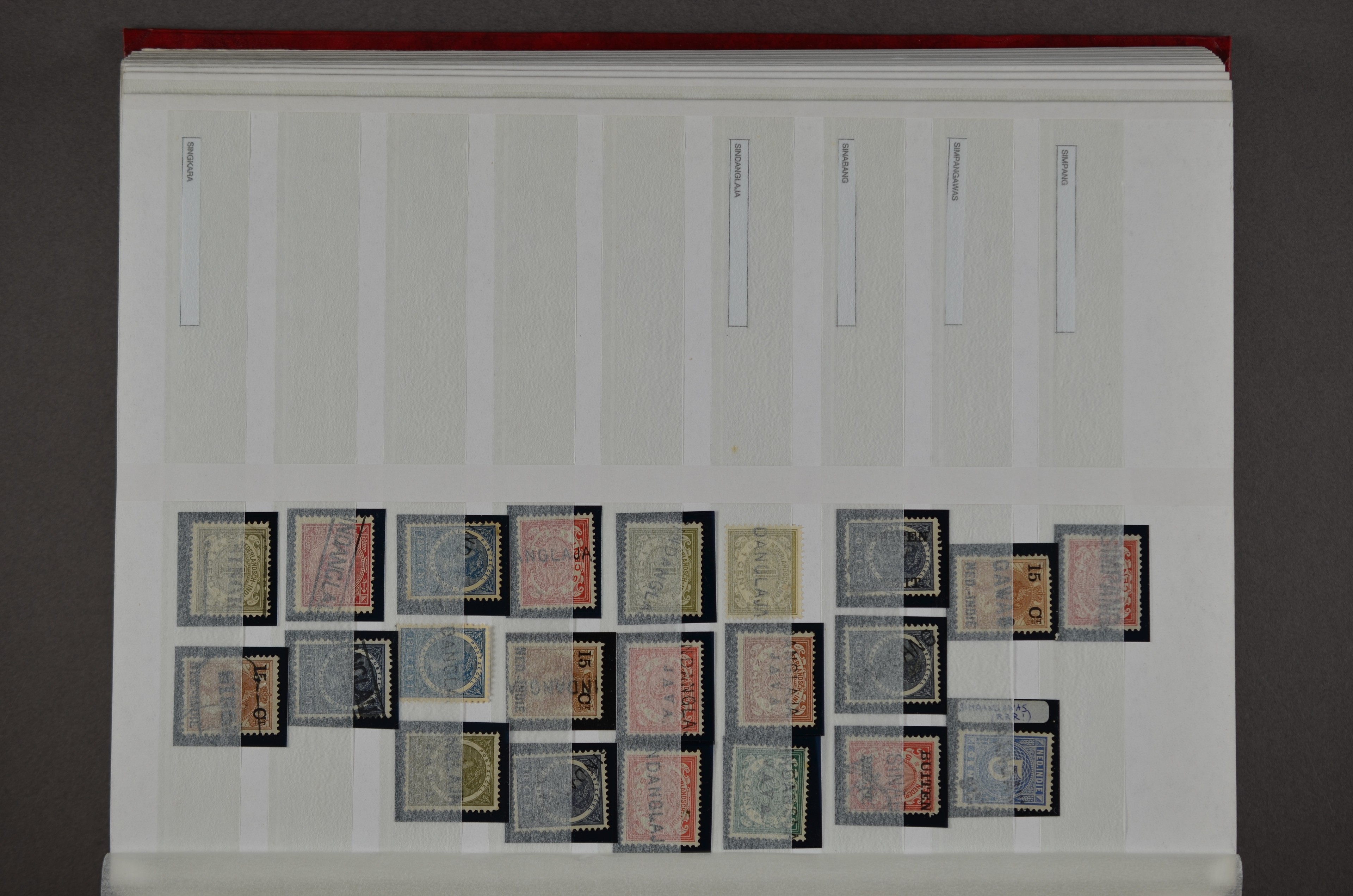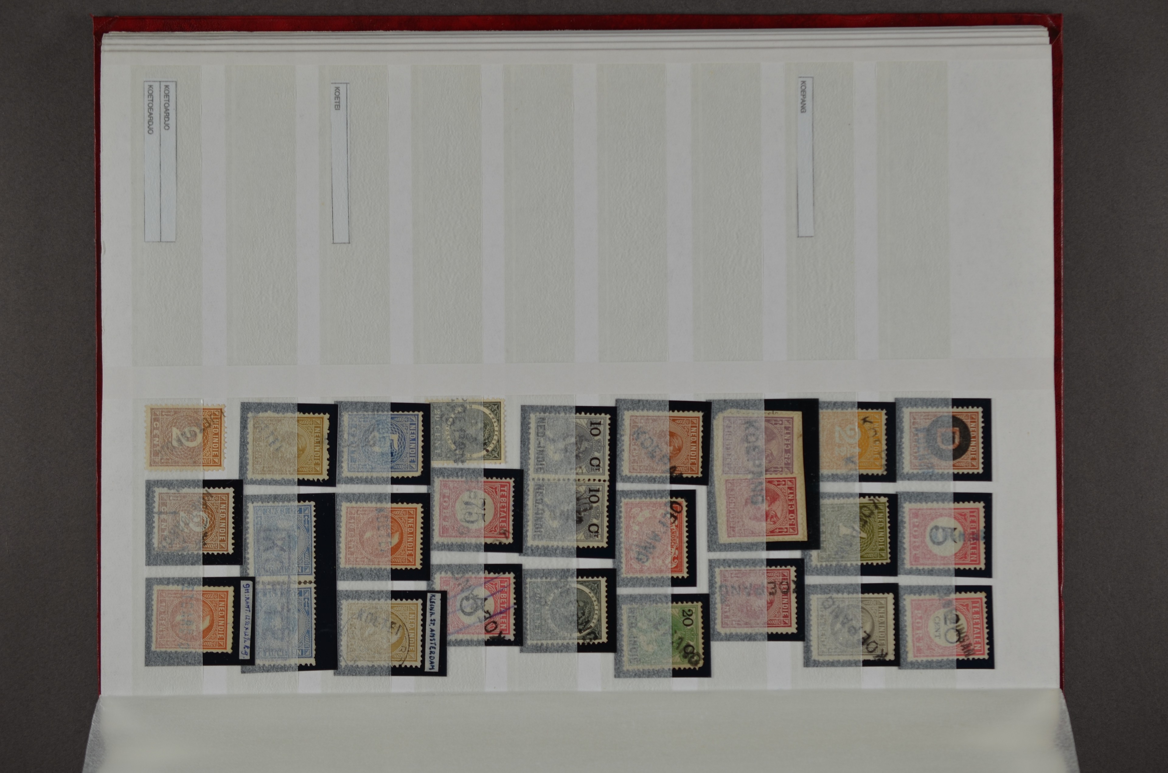 NED.- INDIË naamstempels (zgn. langstempels), uitgebreide collectie op diverse emissies en waarden, ook wat naoorlogse noodstempels, in zwart, blauw, violet en rood, van hulppostkantoren en een enkel bestelhuis en halte, diverse met de pen bijgeschreven datum, veel schaarse en zeer zeldzame stempels als Anjer, Banggai/datum (uit 1925, violet, op nr. 143), Galela, Humboldtsbaai, Laboean, Langsatoenong, Lintido, Malili, Moeara Saibi, Oeloe-Siaoe, Petta, Pladjoe, Prigen, Siak Sri Indrapoera (fragment), Siborongborong (fragment), Sipirok, Takalar, Tandjoeng Poera (met puntstempel 118!), Tjoeroep, Tobelo, Welahan, etc. Prachtig object om te detailleren of op te zetten en de moeilijke manco´s te zoeken!