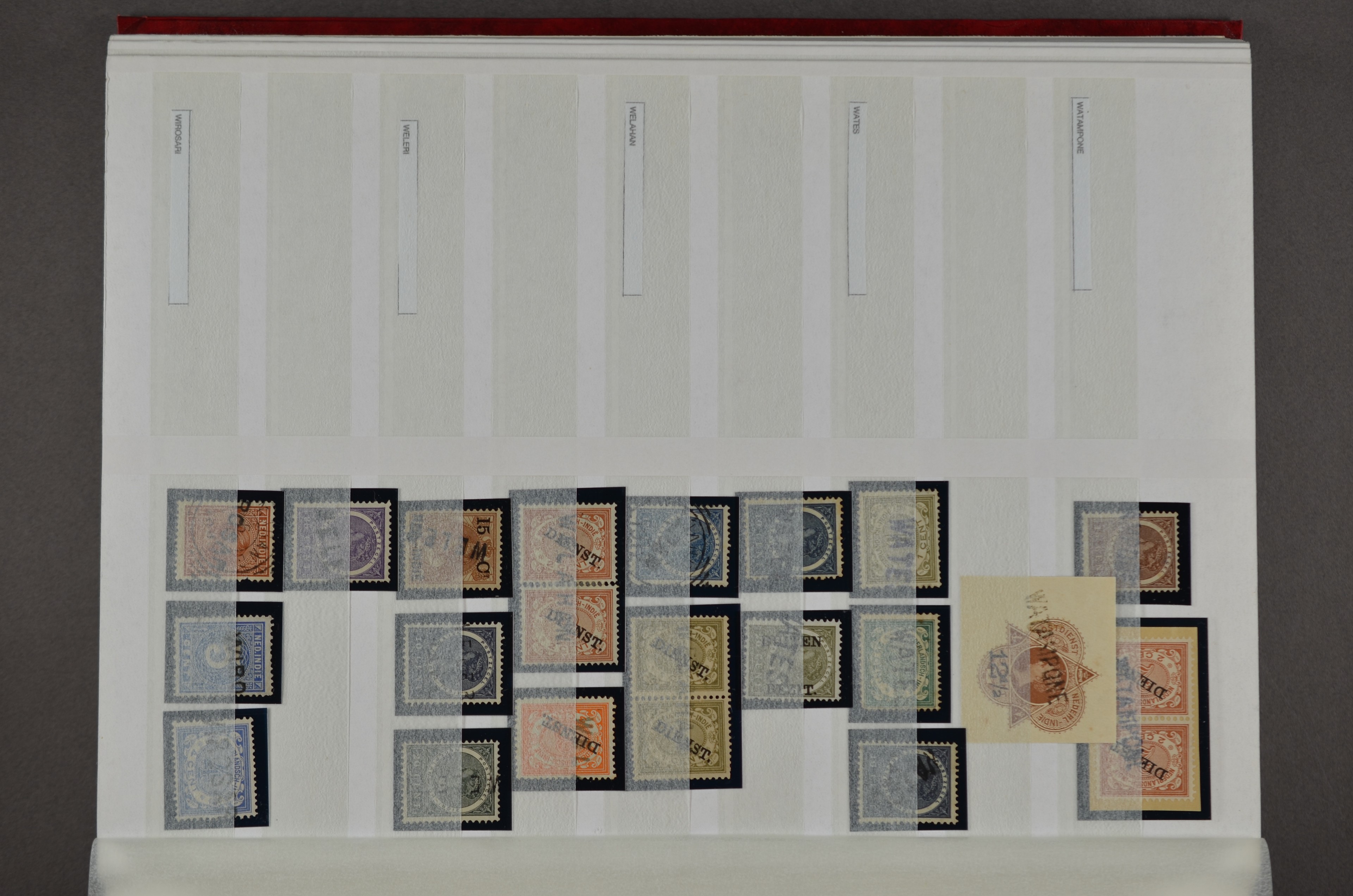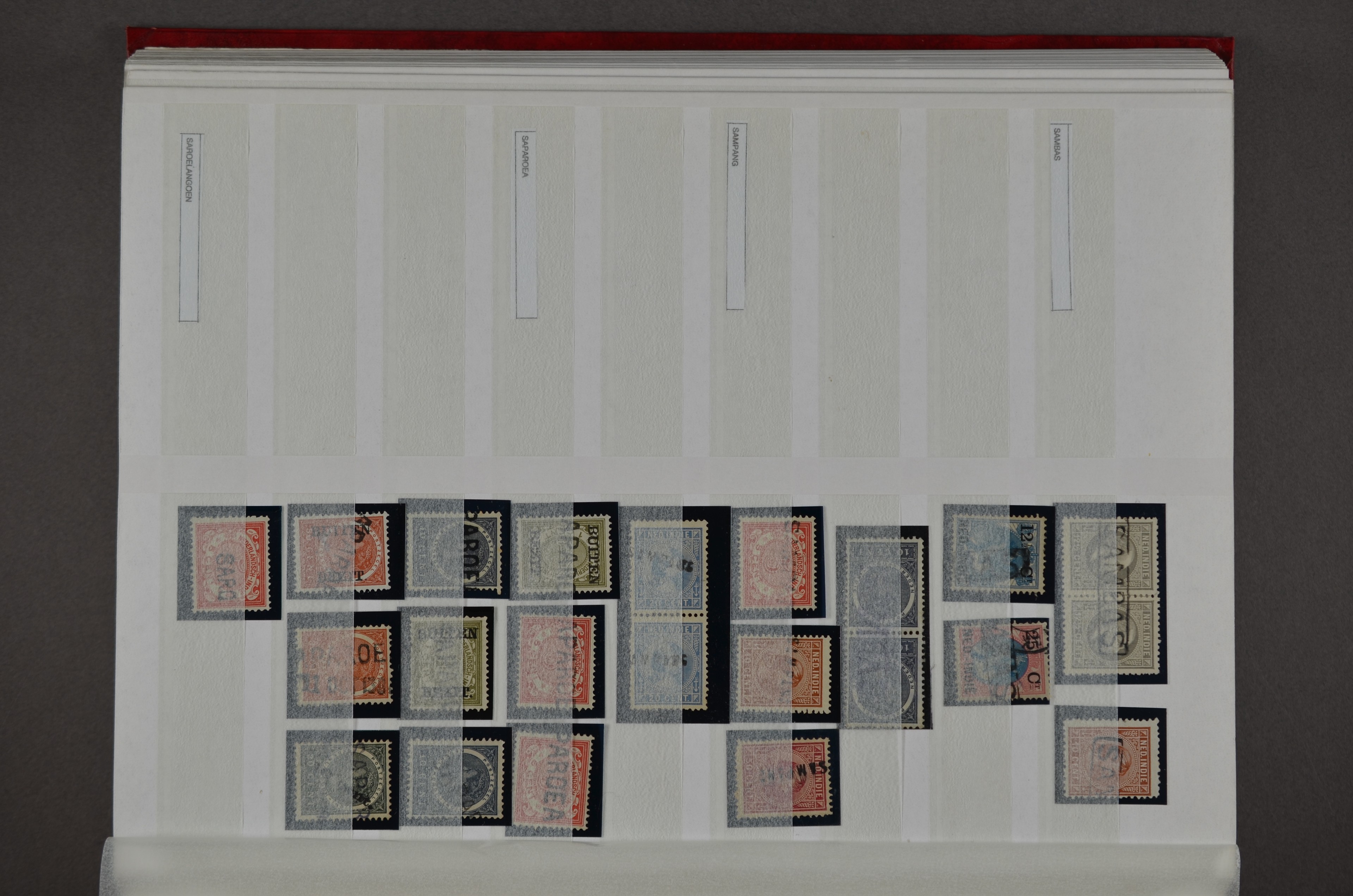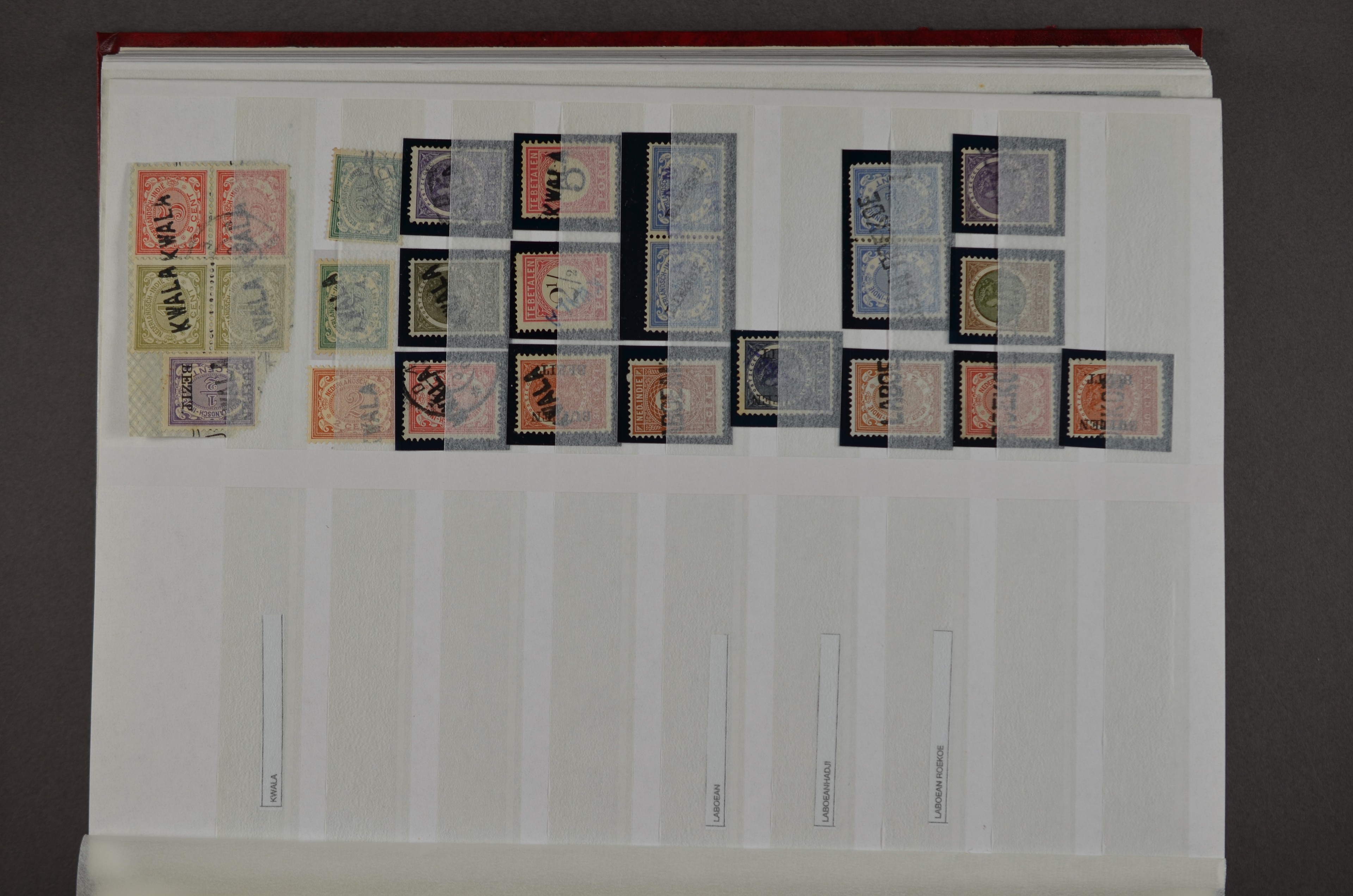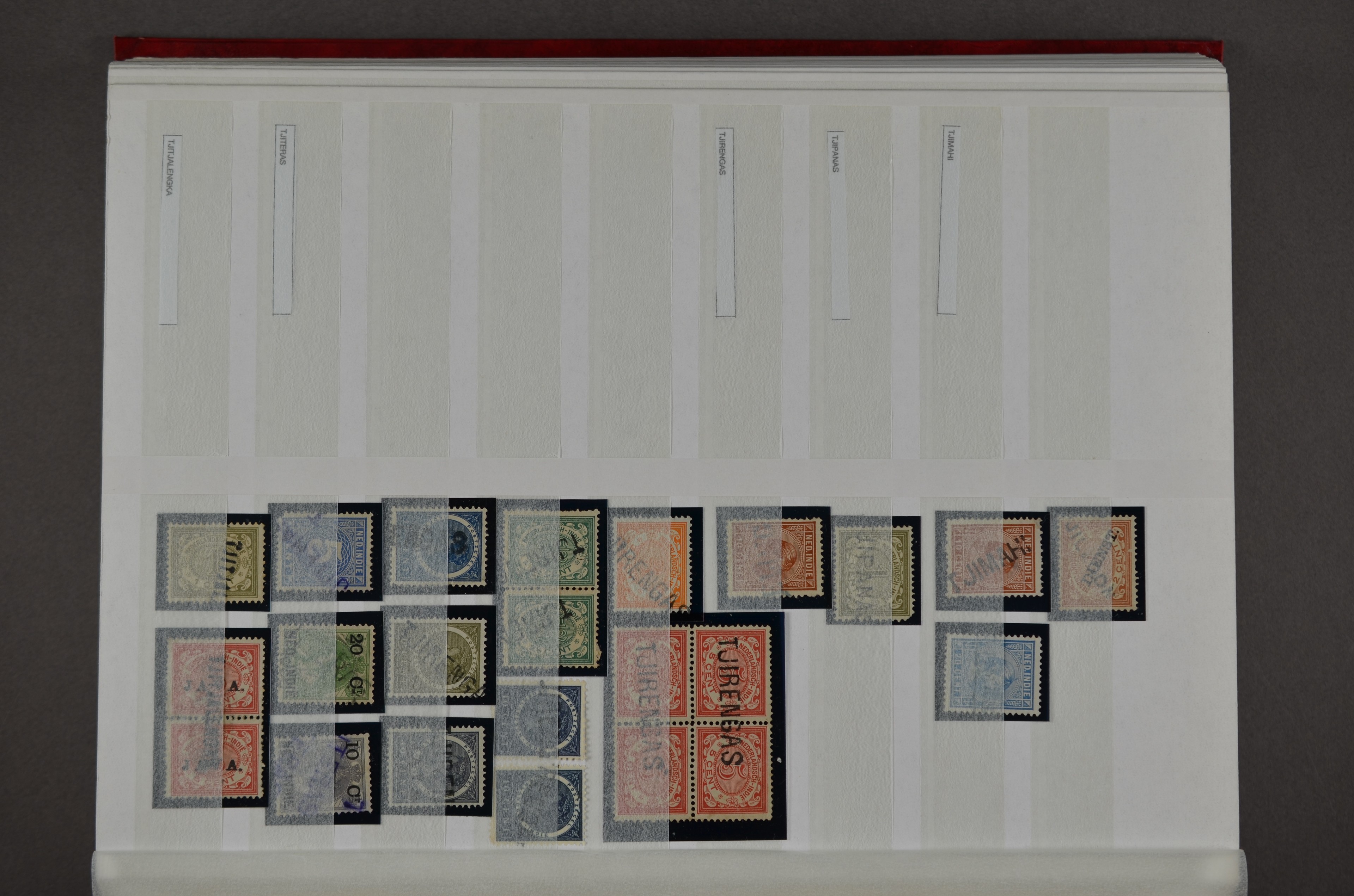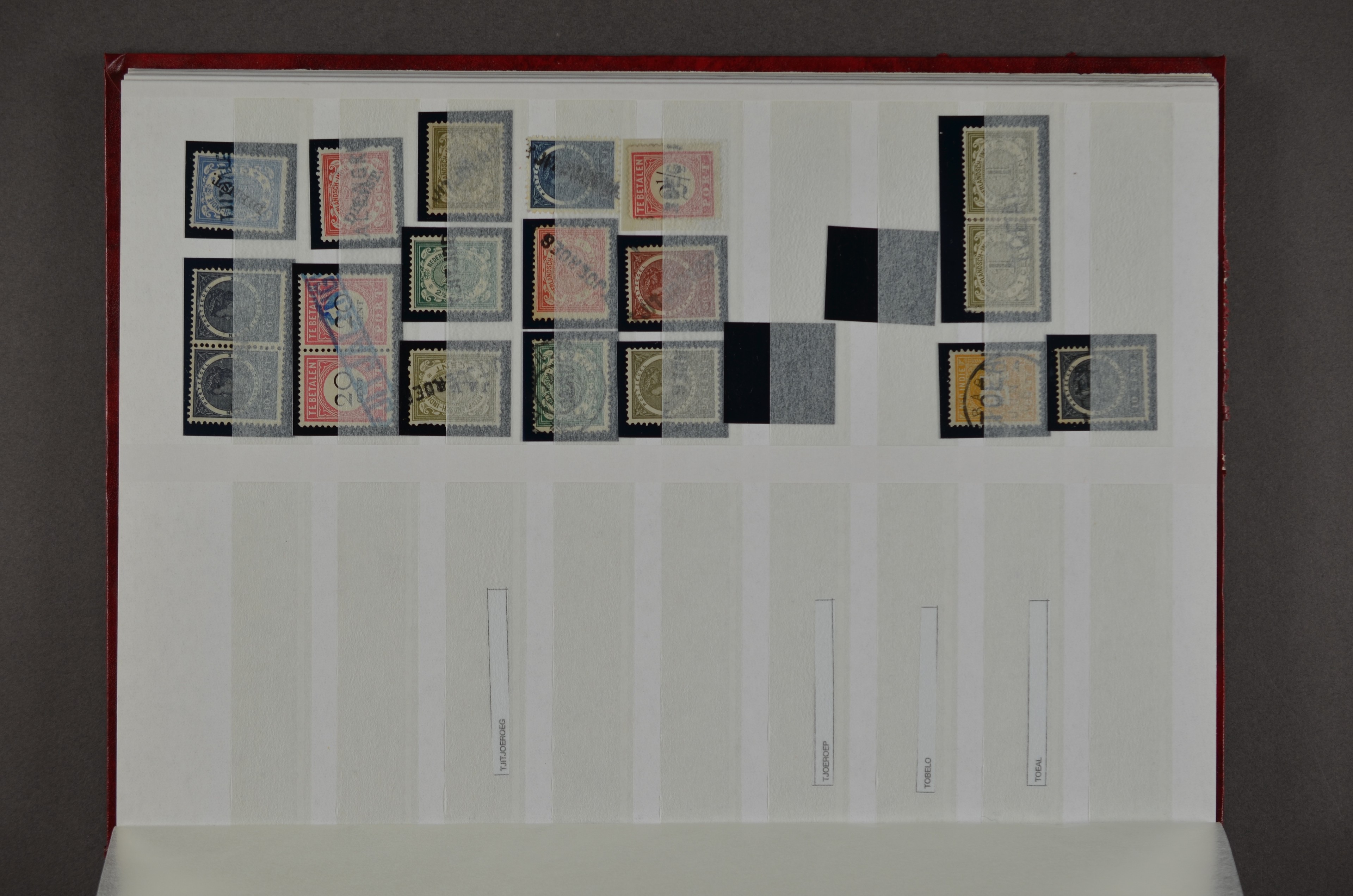 NED.- INDIË naamstempels (zgn. langstempels), uitgebreide collectie op diverse emissies en waarden, ook wat naoorlogse noodstempels, in zwart, blauw, violet en rood, van hulppostkantoren en een enkel bestelhuis en halte, diverse met de pen bijgeschreven datum, veel schaarse en zeer zeldzame stempels als Anjer, Banggai/datum (uit 1925, violet, op nr. 143), Galela, Humboldtsbaai, Laboean, Langsatoenong, Lintido, Malili, Moeara Saibi, Oeloe-Siaoe, Petta, Pladjoe, Prigen, Siak Sri Indrapoera (fragment), Siborongborong (fragment), Sipirok, Takalar, Tandjoeng Poera (met puntstempel 118!), Tjoeroep, Tobelo, Welahan, etc. Prachtig object om te detailleren of op te zetten en de moeilijke manco´s te zoeken!