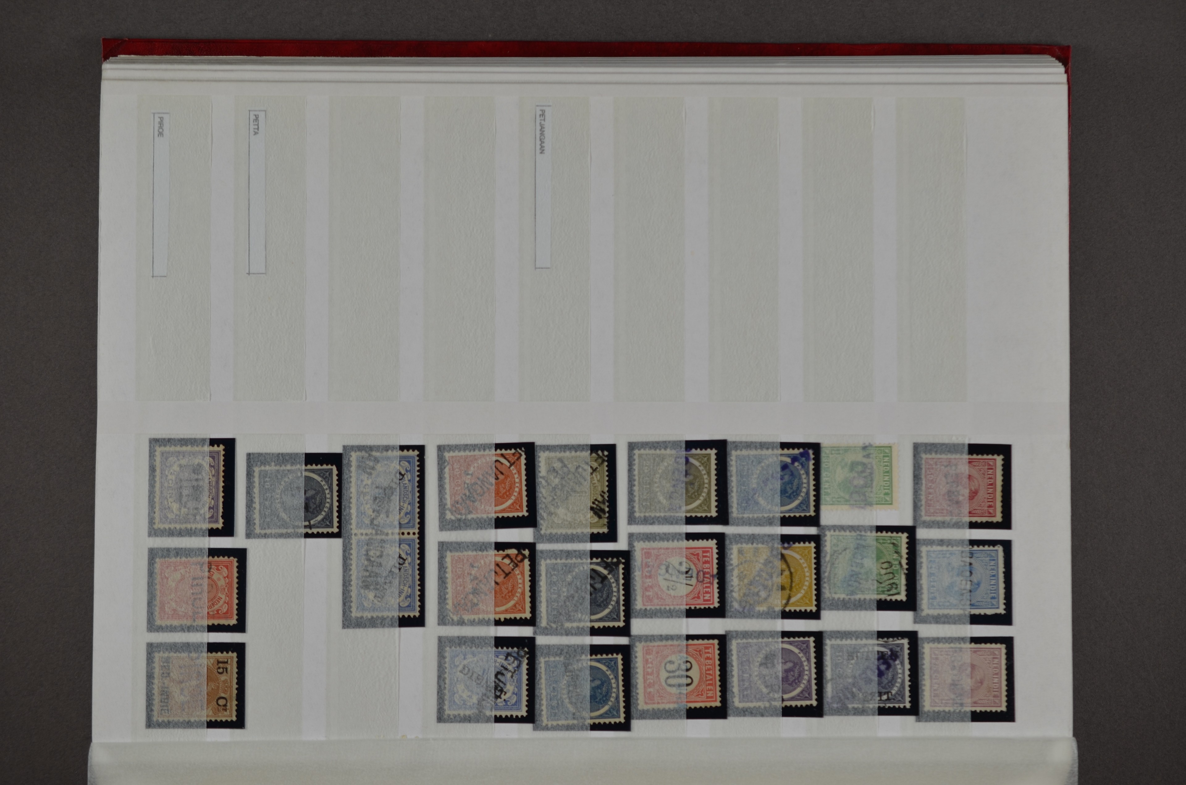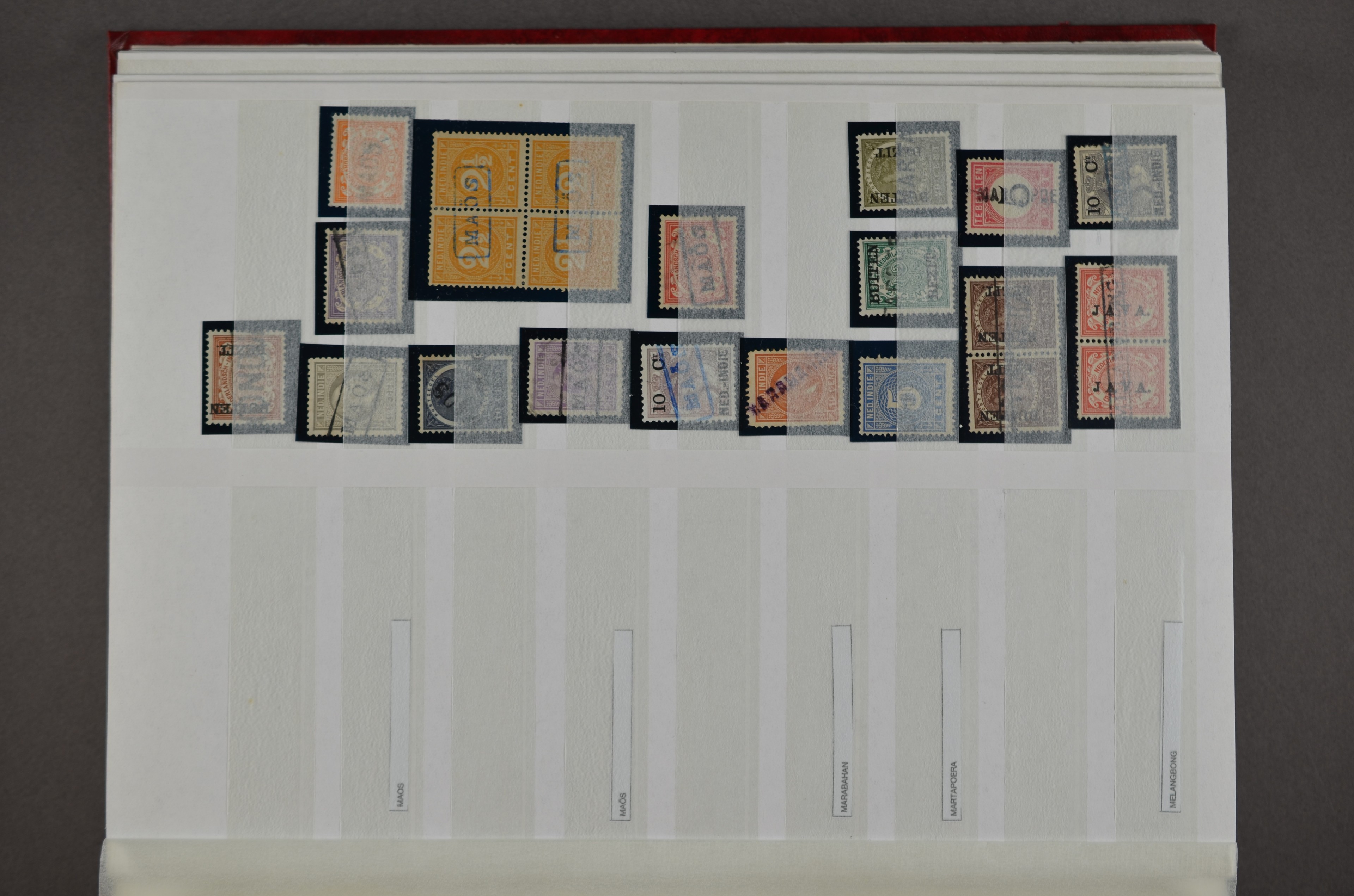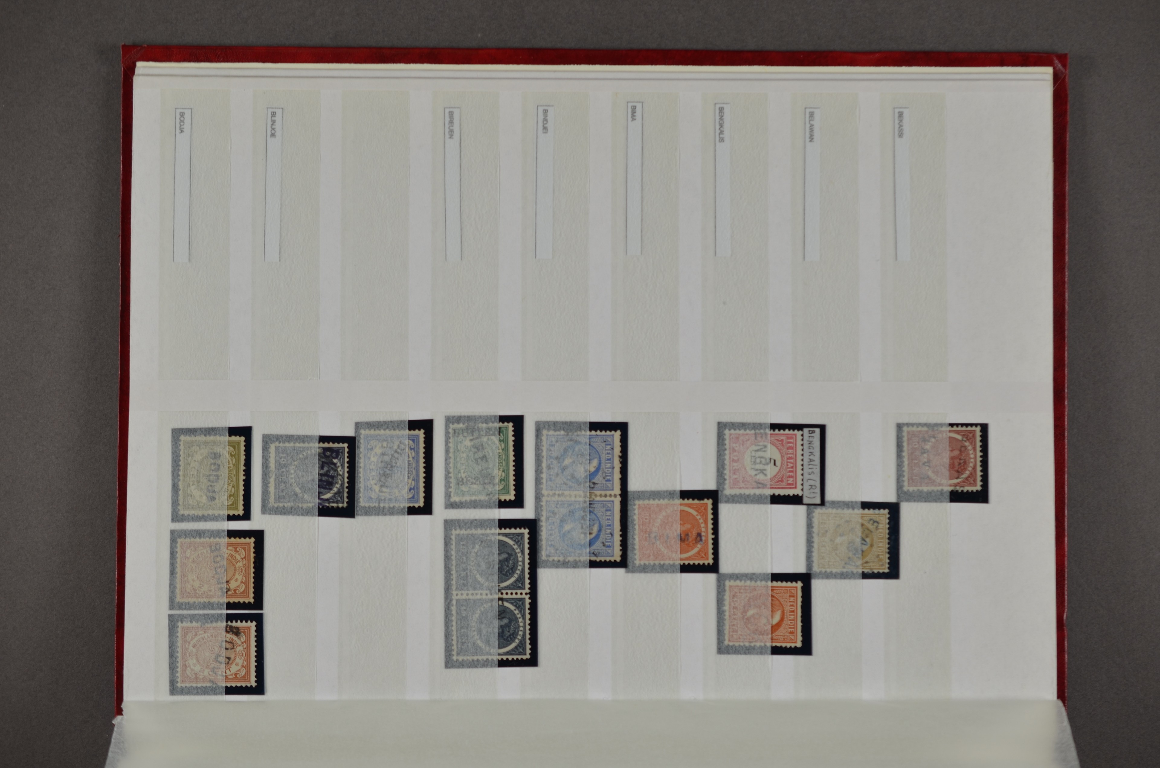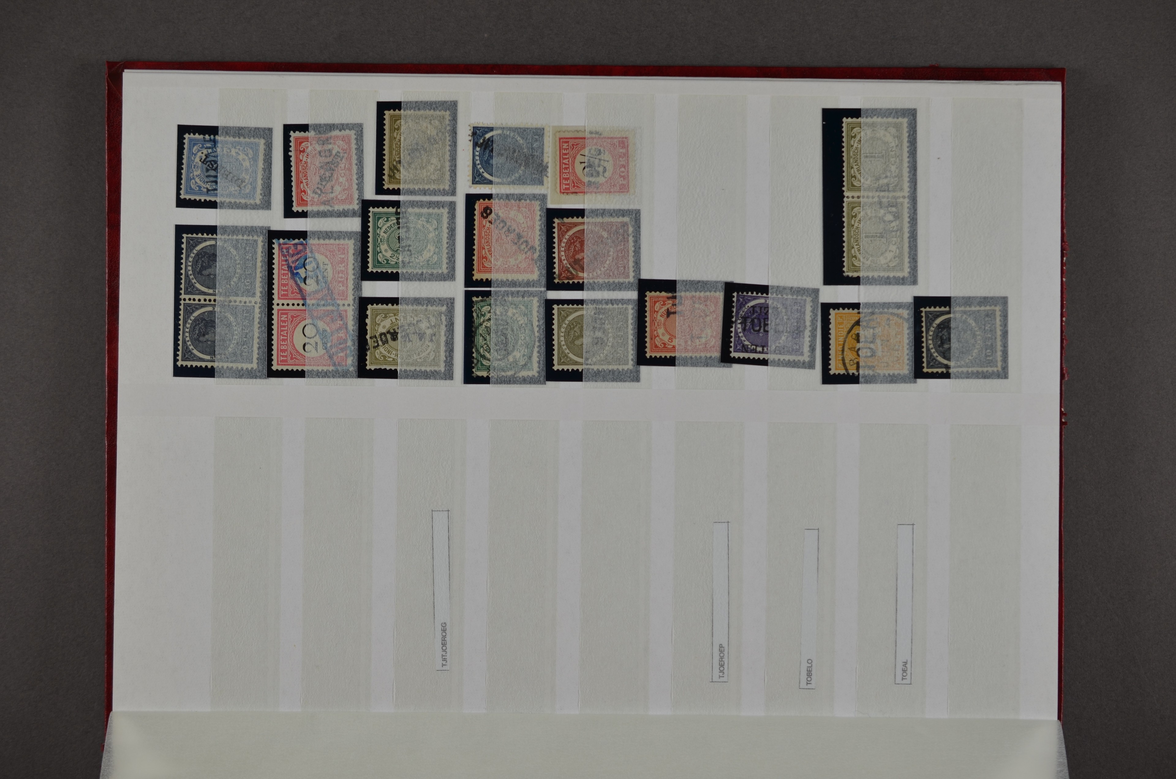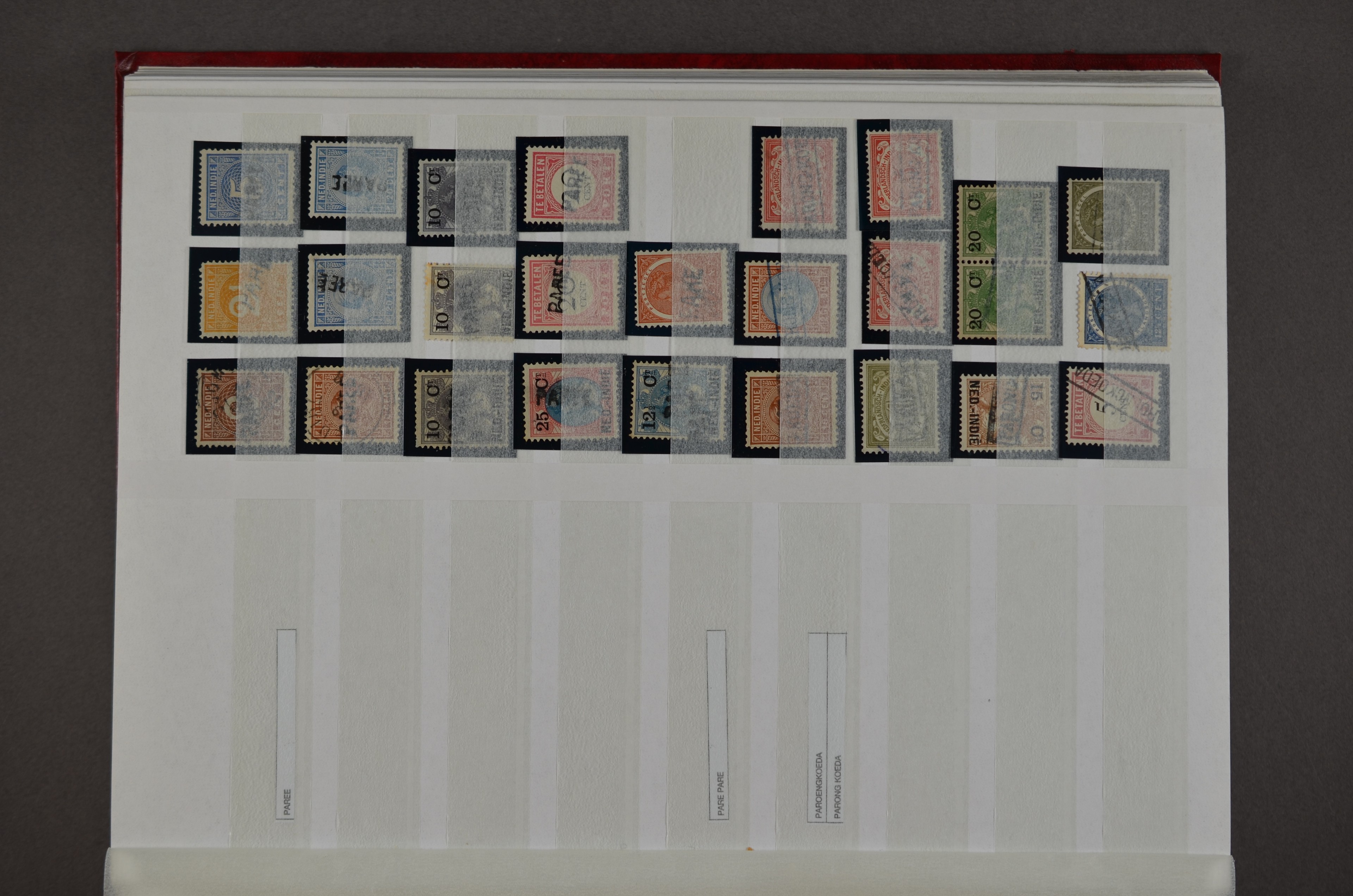 NED.- INDIË naamstempels (zgn. langstempels), uitgebreide collectie op diverse emissies en waarden, ook wat naoorlogse noodstempels, in zwart, blauw, violet en rood, van hulppostkantoren en een enkel bestelhuis en halte, diverse met de pen bijgeschreven datum, veel schaarse en zeer zeldzame stempels als Anjer, Banggai/datum (uit 1925, violet, op nr. 143), Galela, Humboldtsbaai, Laboean, Langsatoenong, Lintido, Malili, Moeara Saibi, Oeloe-Siaoe, Petta, Pladjoe, Prigen, Siak Sri Indrapoera (fragment), Siborongborong (fragment), Sipirok, Takalar, Tandjoeng Poera (met puntstempel 118!), Tjoeroep, Tobelo, Welahan, etc. Prachtig object om te detailleren of op te zetten en de moeilijke manco´s te zoeken!