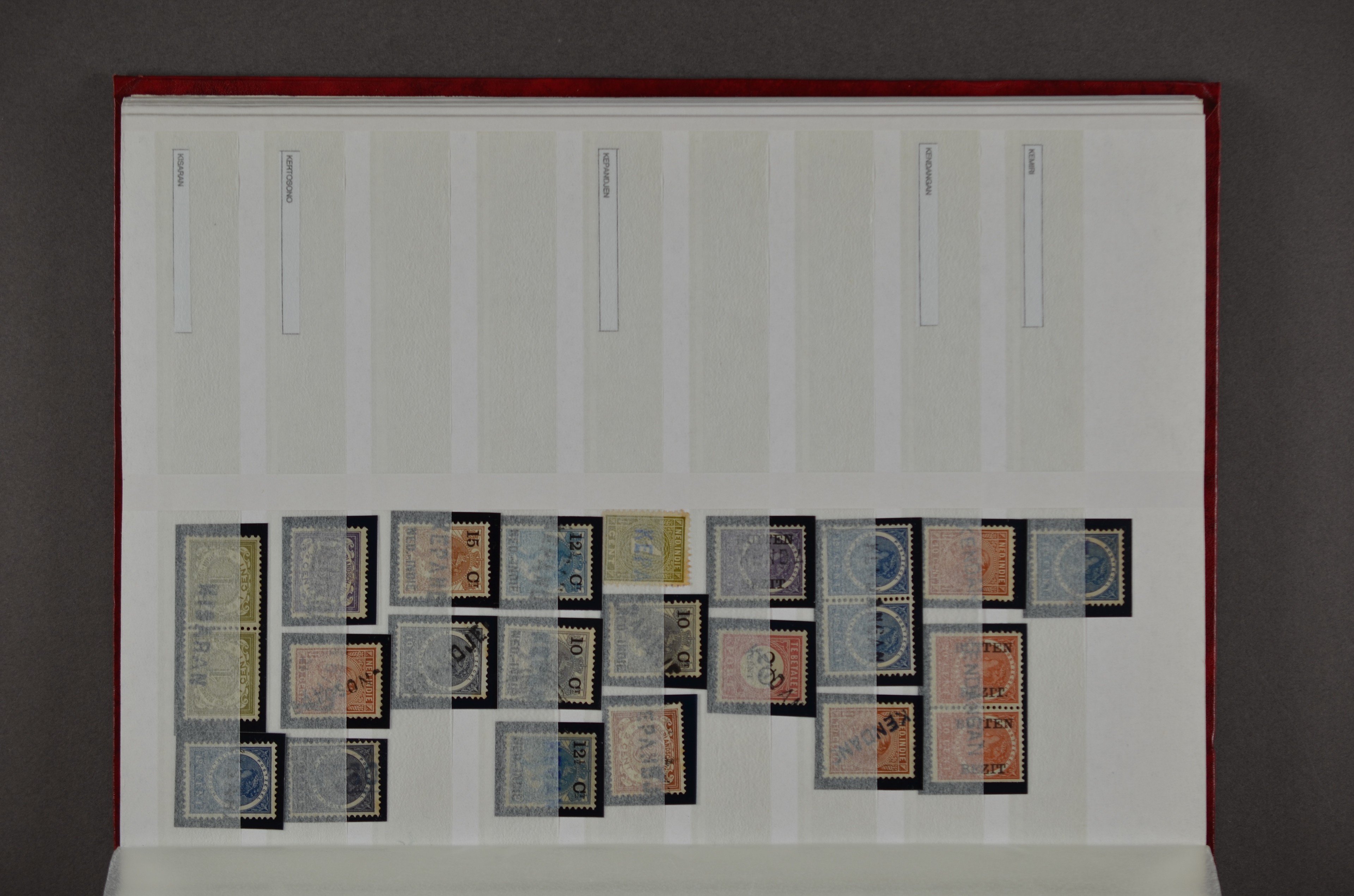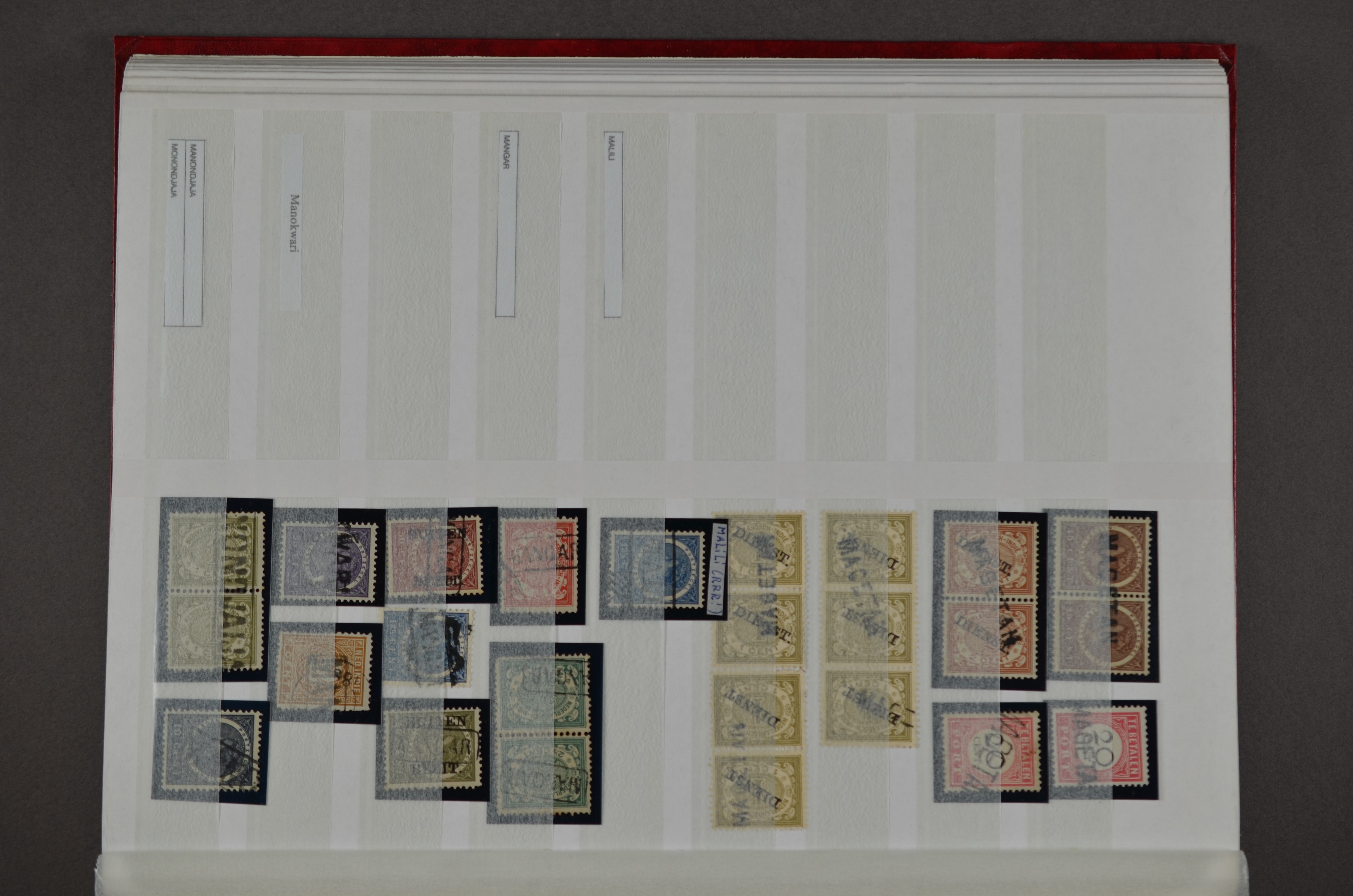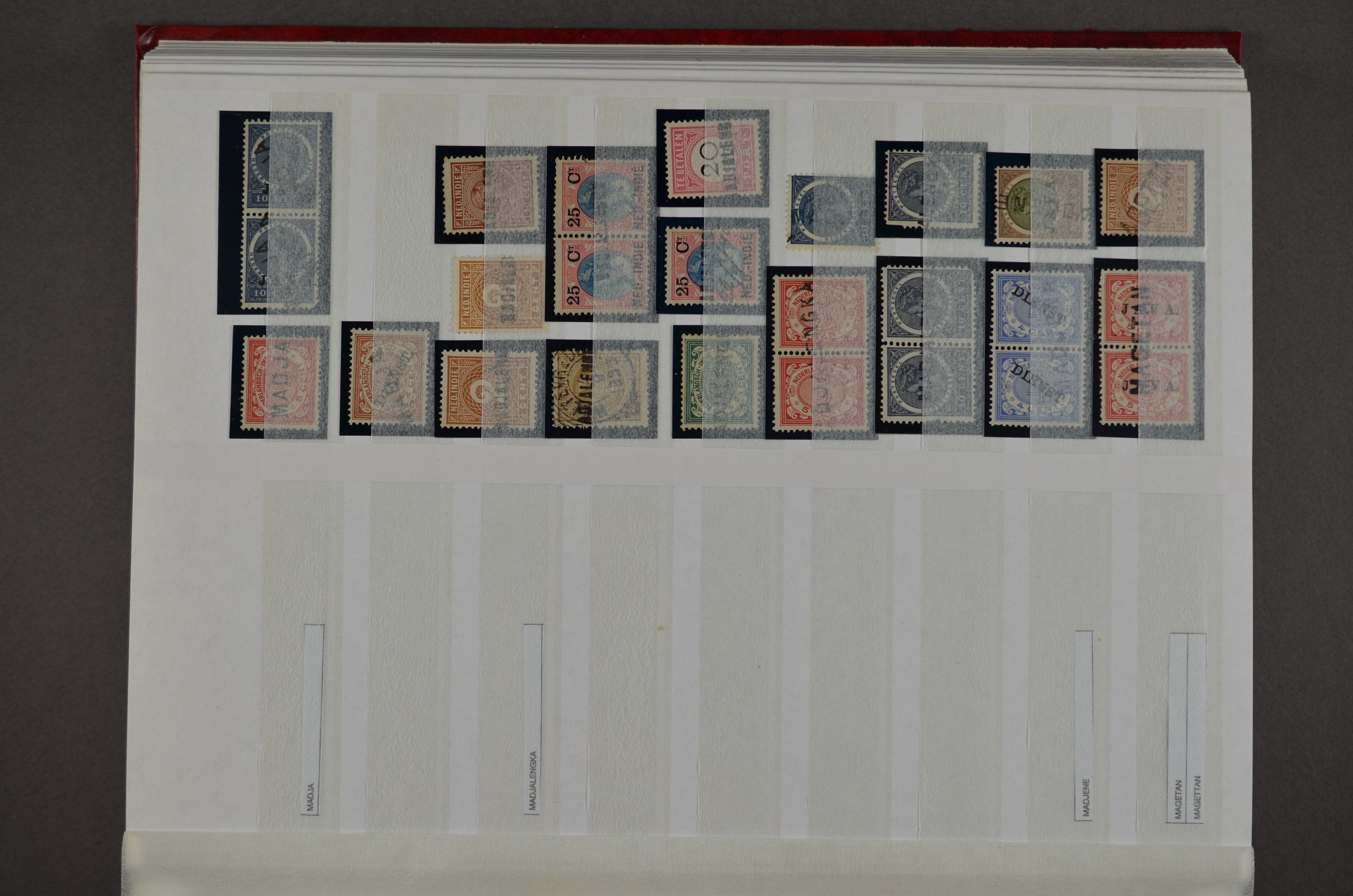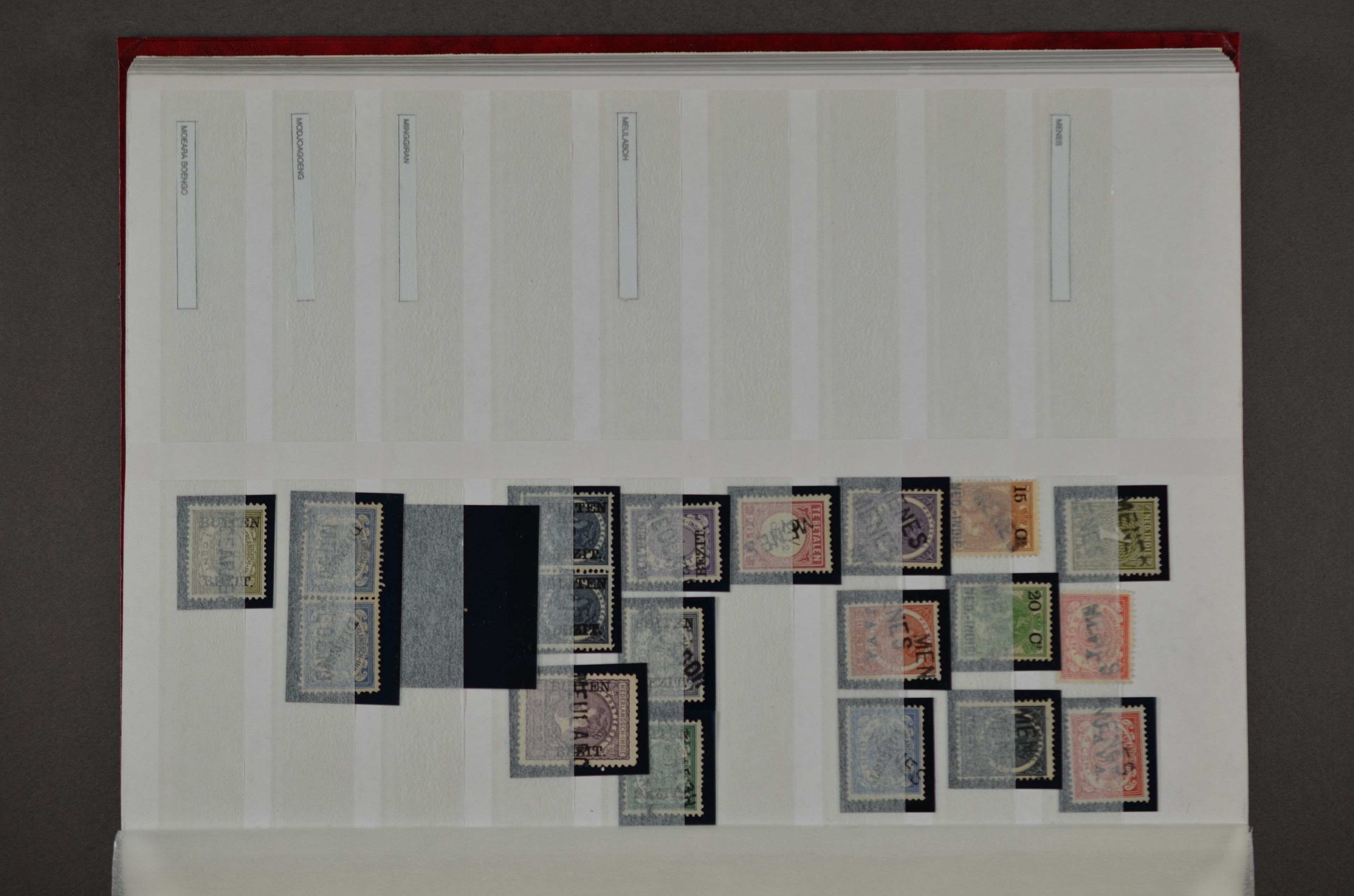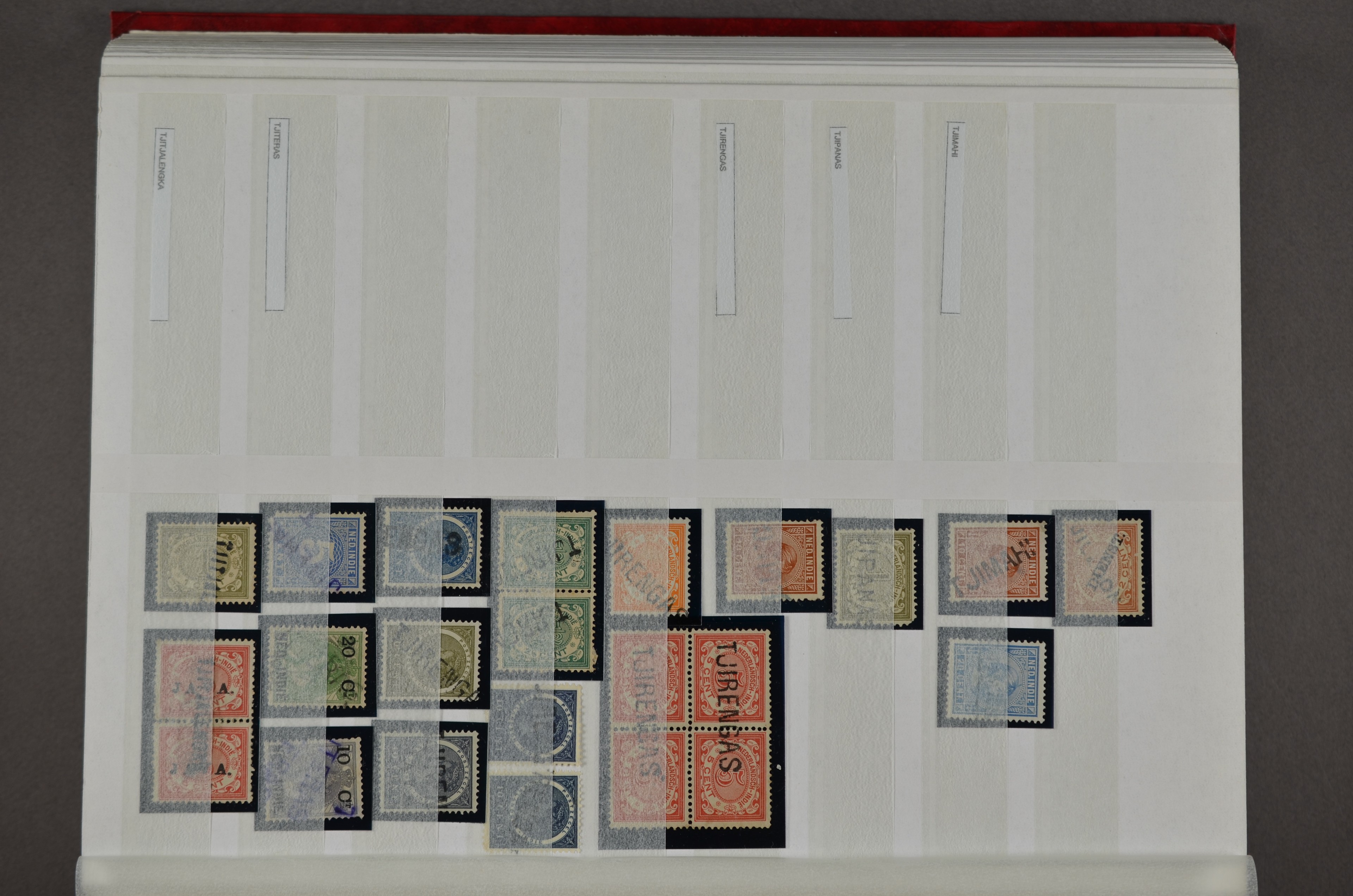 NED.- INDIË naamstempels (zgn. langstempels), uitgebreide collectie op diverse emissies en waarden, ook wat naoorlogse noodstempels, in zwart, blauw, violet en rood, van hulppostkantoren en een enkel bestelhuis en halte, diverse met de pen bijgeschreven datum, veel schaarse en zeer zeldzame stempels als Anjer, Banggai/datum (uit 1925, violet, op nr. 143), Galela, Humboldtsbaai, Laboean, Langsatoenong, Lintido, Malili, Moeara Saibi, Oeloe-Siaoe, Petta, Pladjoe, Prigen, Siak Sri Indrapoera (fragment), Siborongborong (fragment), Sipirok, Takalar, Tandjoeng Poera (met puntstempel 118!), Tjoeroep, Tobelo, Welahan, etc. Prachtig object om te detailleren of op te zetten en de moeilijke manco´s te zoeken!