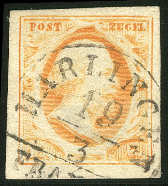 HARLINGEN A (EY.250), op 15 cent oranje nr.3c pos.31, breedgerand prachtex. met vrijwel volledige afst. met keur en cert. Dr. Louis