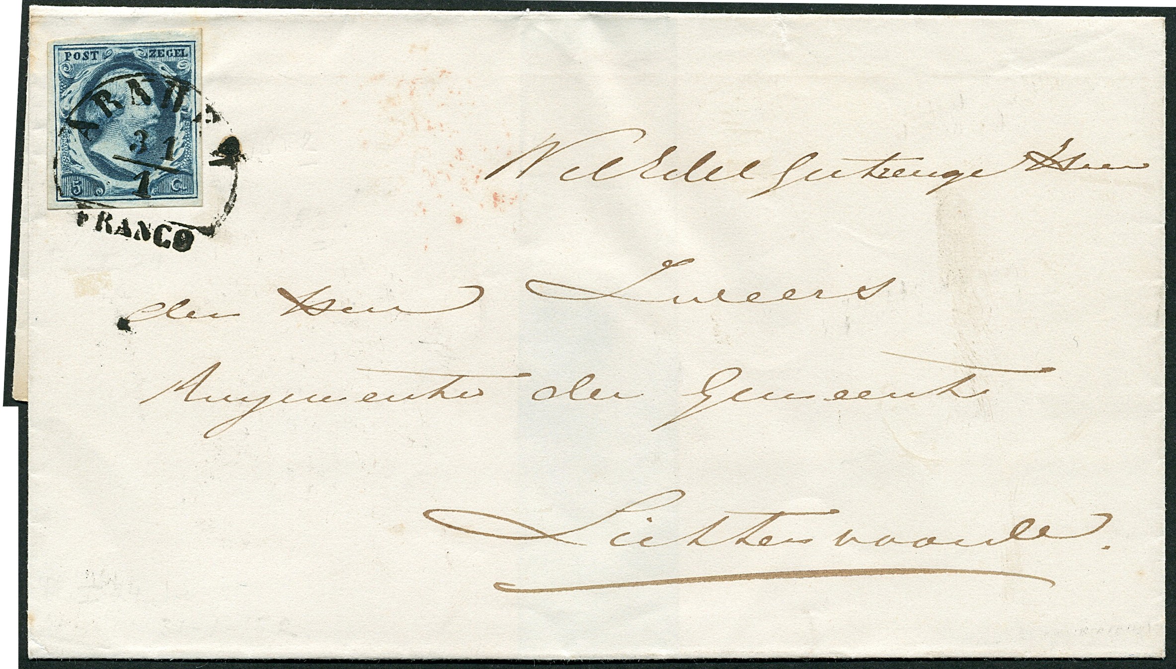 ARNHEM A (EY.250) op 5 cent nr. 1a-P.I-24. Prachtex., zeer mooi van kleur, op ongedateerde, dichtgeplakte, frisse briefomslag van 31-1(-1852?) via Zutphen 31-1 naar de burgemeester van Lichtenvoorde