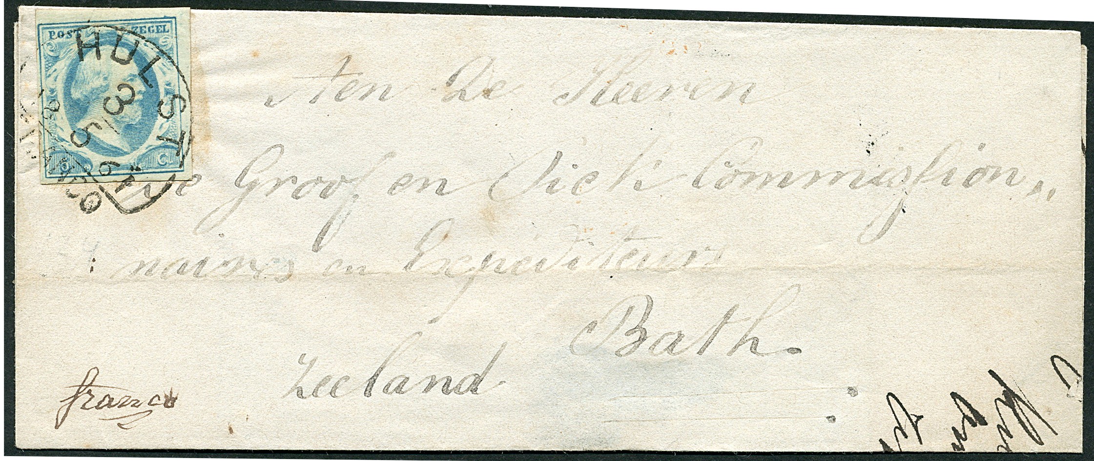 HULST C (EY.250) op 5 cent nr. 1n-Pl.IV-32. Linksboven wat smal, overigens vol tot breed gerand prachtex. met bijzonder mooie afst. op briefomslag van 3-5-1861 via Goes 5-5-1861 naar commissionairs & expediteurs te Bath, ter verduidelijking: Zeeland. Interessante bestemming en laat gebruik van het halfrond-francostempel!