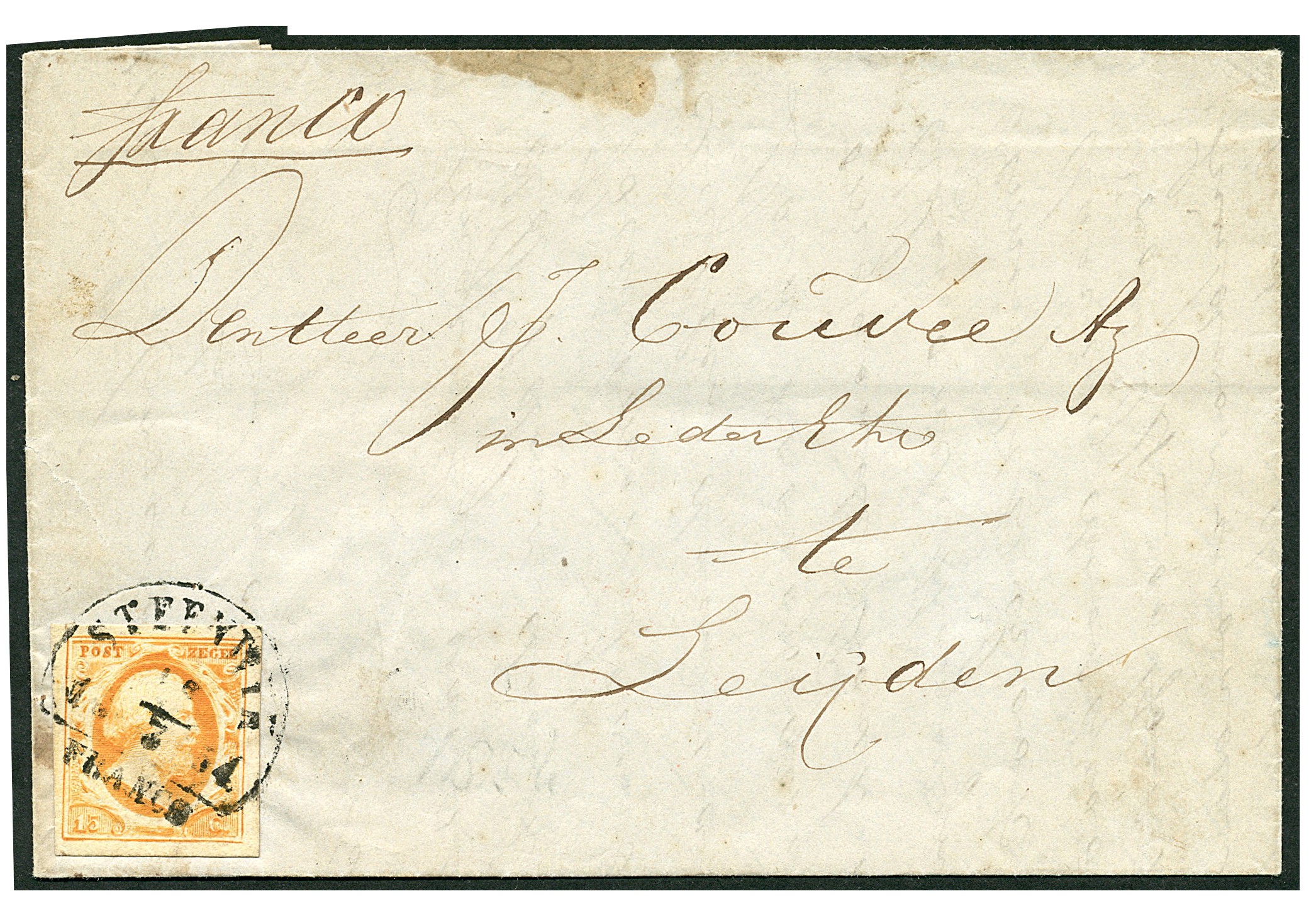 STEENWYK B (EY.400) op 15 cent nr. 3b, pos. 96. Zeer breed gerand prachtex. met voor dit stempel een bijzonder mooie afdruk op, behoudens vlekje en miniem scheurtje links, vrij frisse brief van 10-3-1854 naar Leiden 11-3-1854. Cert. Vleeming (2016)