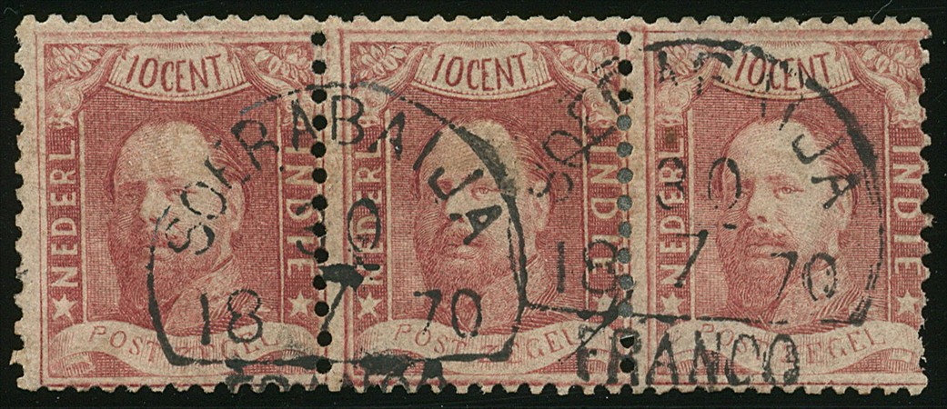 2, strip van 3 met halfrondstempel Soerabaja 10-7-1870, vrijwel prachtex. (iets onregelmatige tanding) € 1000