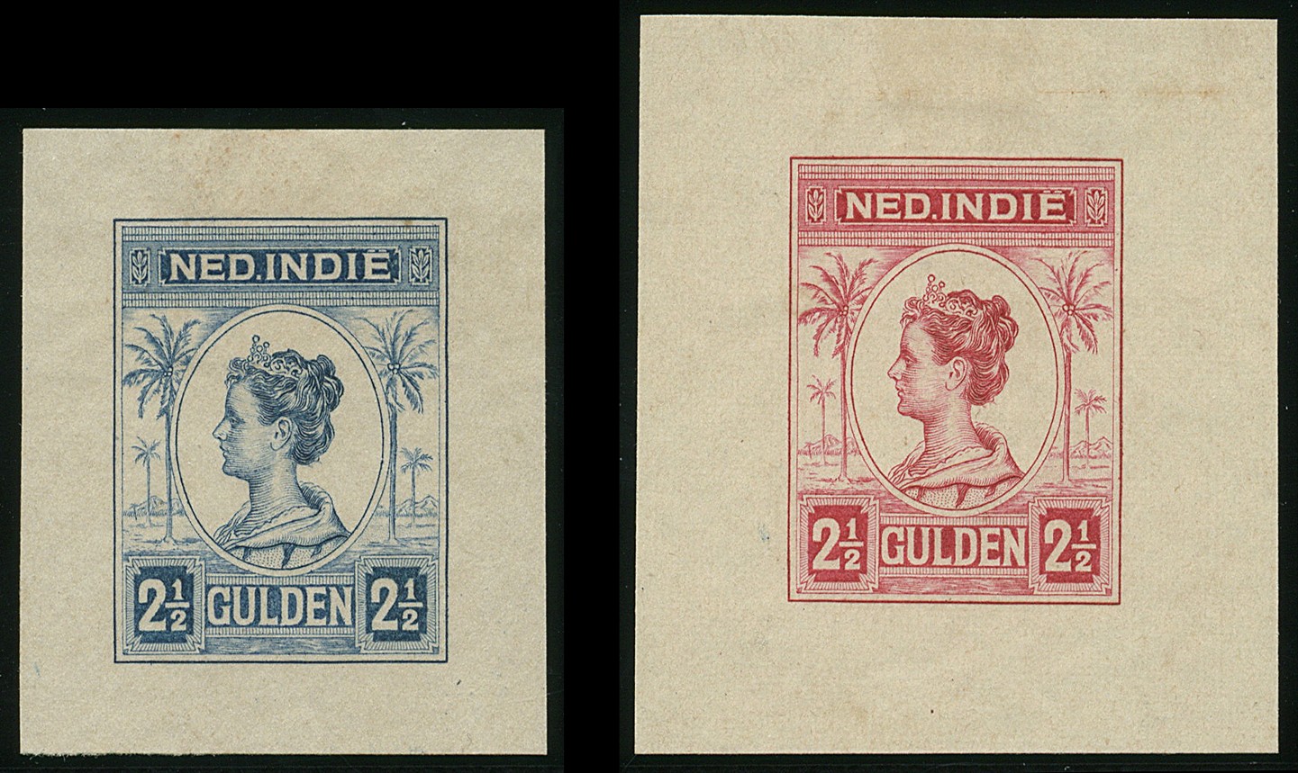 Emissie Koningin Wilhelmina met palmbomen 1913. PC.106a/l, 12 stempelafdrukken van de 2½ gulden in de kleuren groen, donkergroen, roodbruin, bruin, blauw, donkerblauw, karmijnrood (gekozen kleur), bruinrood, donkerlila, olijfgeel, oranje en grijszwart. Ongetand en ongegomd op klein velletje