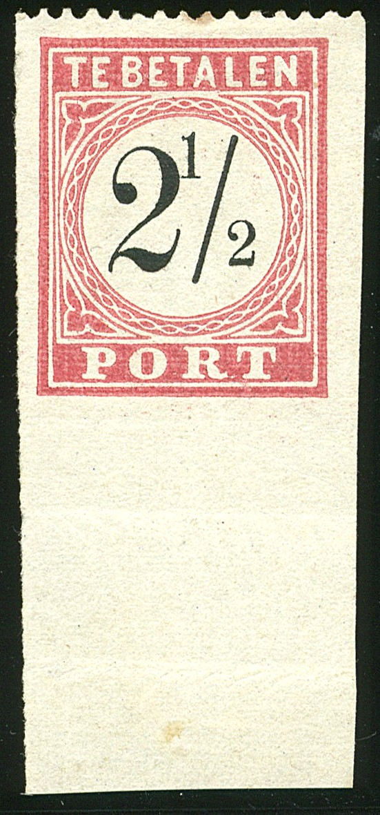 P5III-A, 2½ cent met variëteit ´Alleen aan de bovenzijde geperforeerd´, vrijwel prachtex. (1 roesttandje, in velrand 2 vouwen en schaafplekje) zonder gom met ondervelrand. Zeer zeldzaam. Attest Vleeming (2017): ´ca. 10 ex. bekend´. € 2000