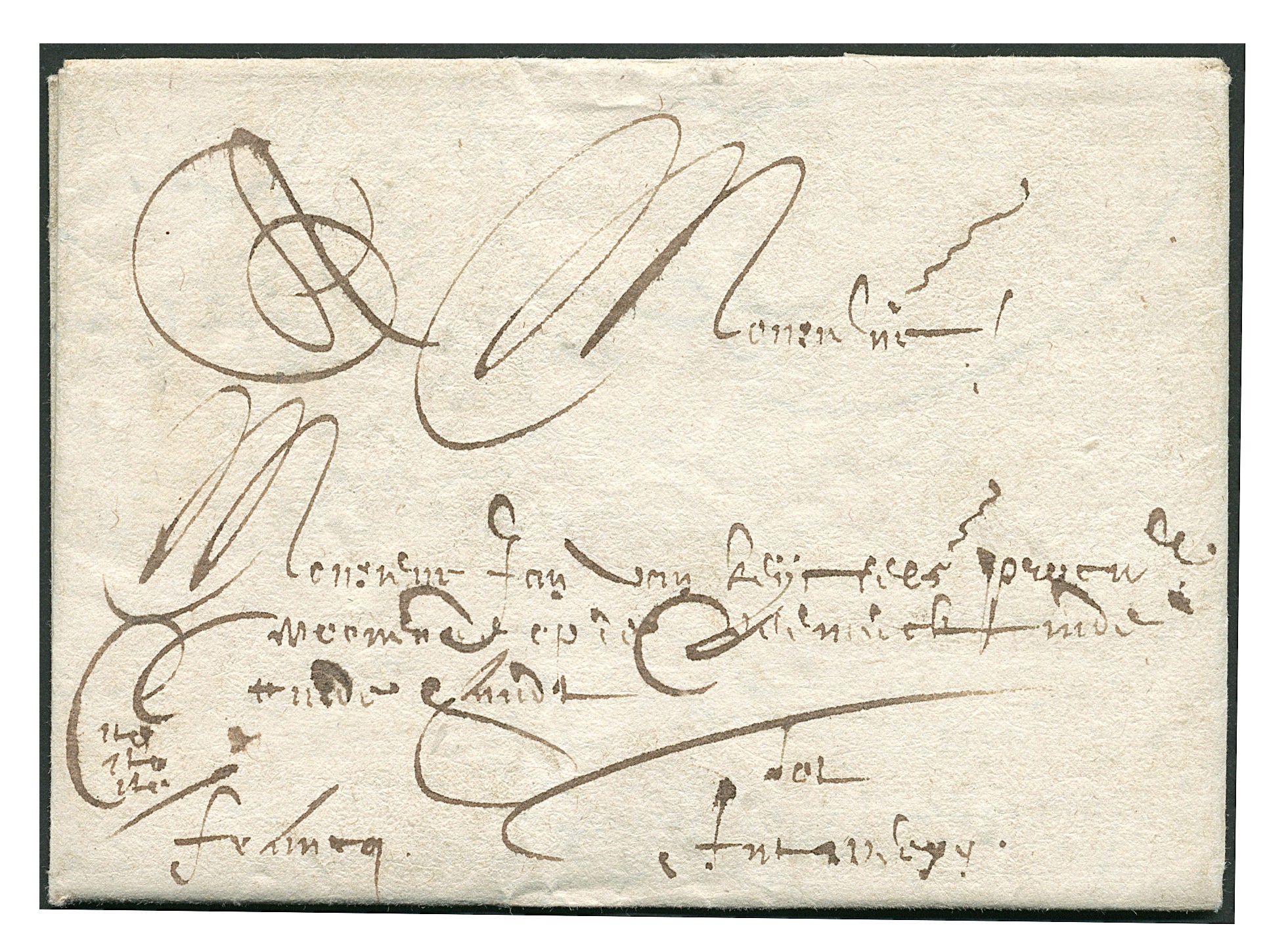 Expresse. Complete, zeer frisse brief van Halsteren 5-11-1627 per expresse verstuurd naar Antwerpen met linksonder geschreven 'Cito/Cito/Cito/francq', op dezelfde dag ontvangen blijkens een notitie op de az. Het gehele port inclusief expresserecht is bij vooruitbetaling voldaan (francq). Informatie bijgesloten