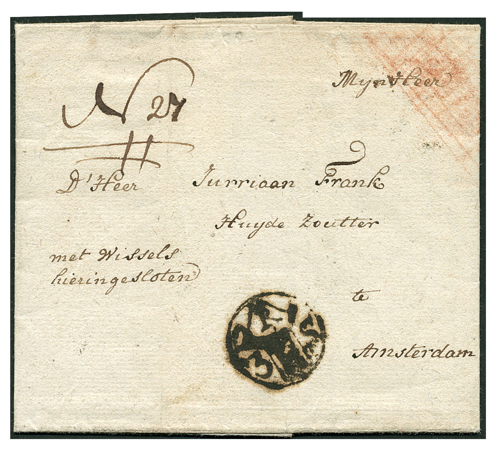 Aangetekend. Complete brief, zeer goed leesbaar geschreven te Delft op 10-12-1788 (az. vage afdruk posthoornstempel PEP1.10100-04) geschreven 'met wissels hieringesloten', aangetekend (registernummer 'N 27', krijtstrepen in rood) naar Amsterdam, daar afgestempeld met het 3-stuiverstempel (Adema R9, RR)