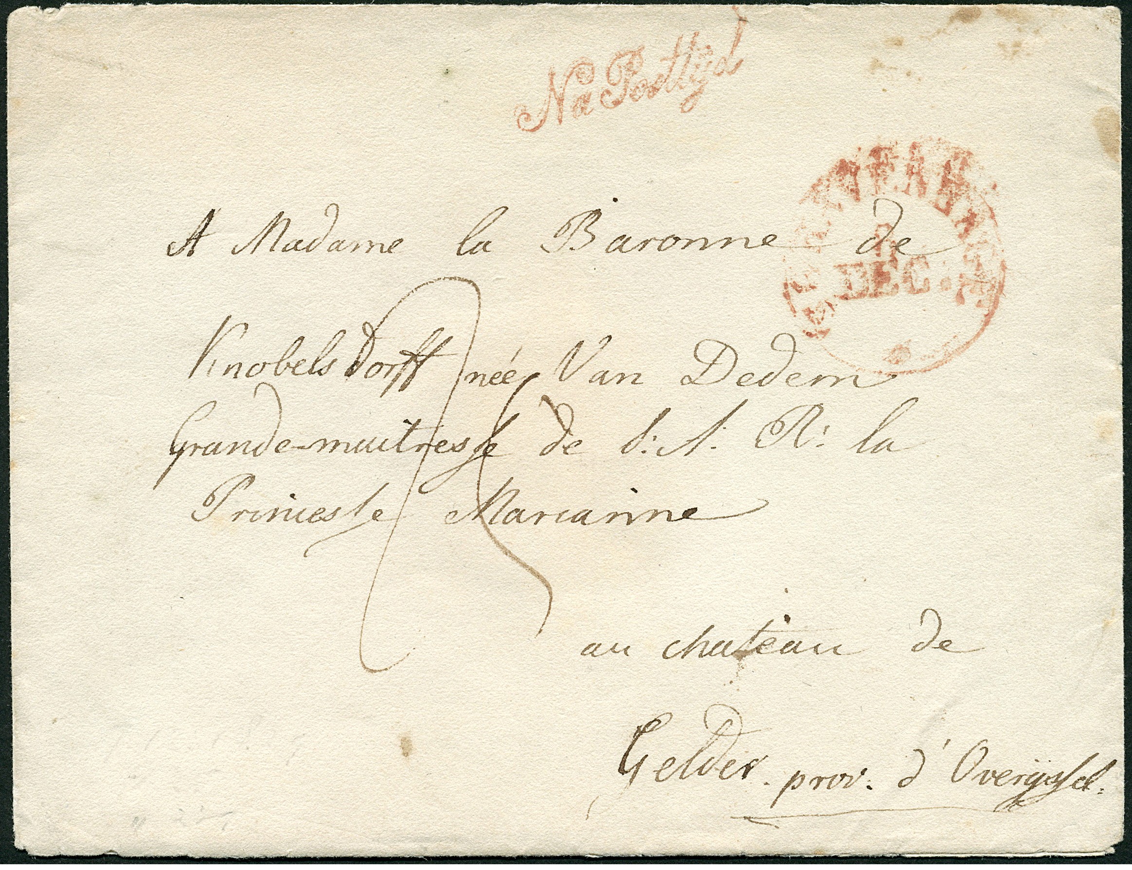 Koninklijk Huis. Envelop inclusief ingesloten complete, zeer mooi bewaard gebleven brief geschreven op 7-12-1829 door Marianne, verzonden naar barones Knobelsdorff geboren Van Dedem in het kasteel De Gelder (in Wijhe, Overijssel). Wilhelmina Frederica Louise Charlotte Marianne (1810-1883) was de dochter van koning Willem I en zijn volle nicht prinses Wilhelmina van Pruisen, en was prinses der Nederlanden en prinses van Oranje-Nassau. De in het Frans geschreven brief is het originele handschrift van de prinses